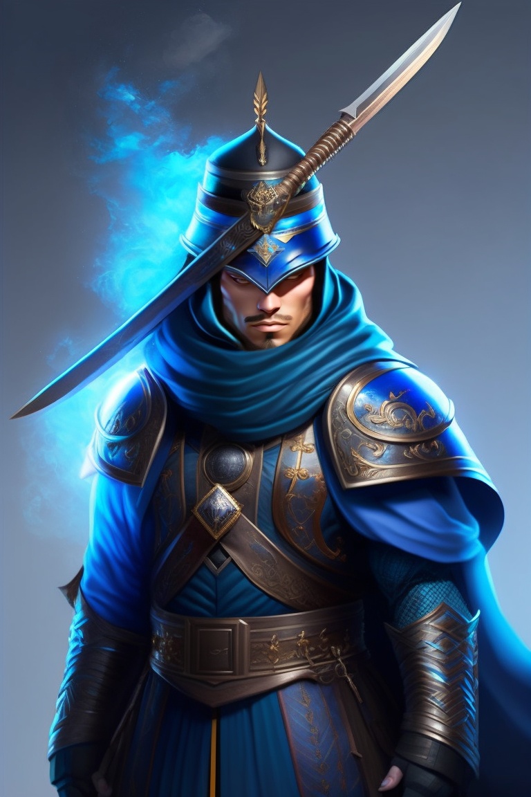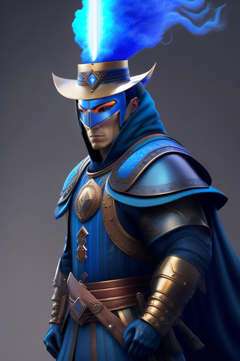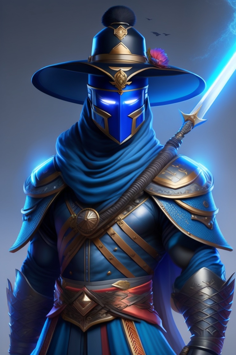 A superhuman, with sword and a samurai hat flowing with blue energy and has a mask, blue and black in color