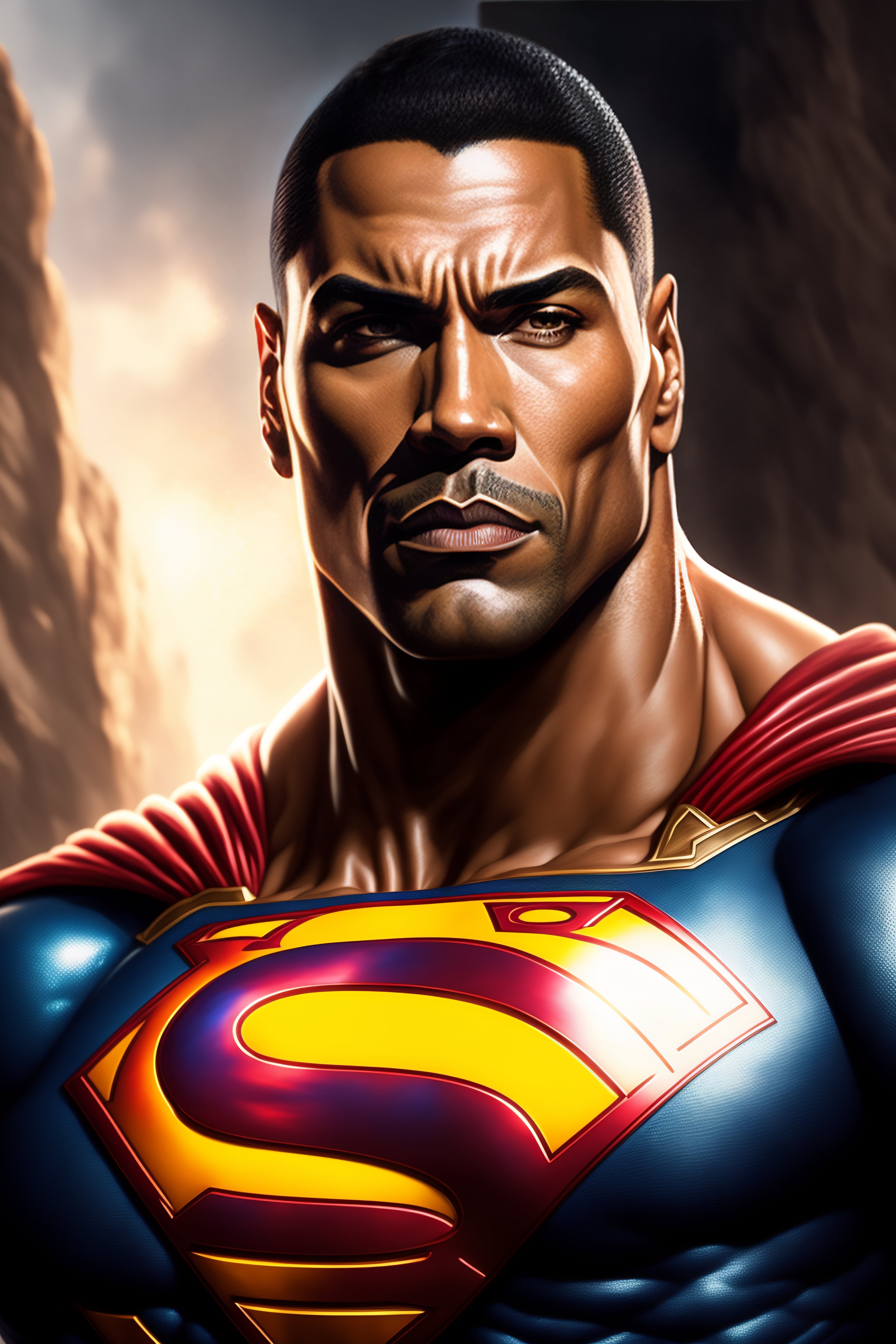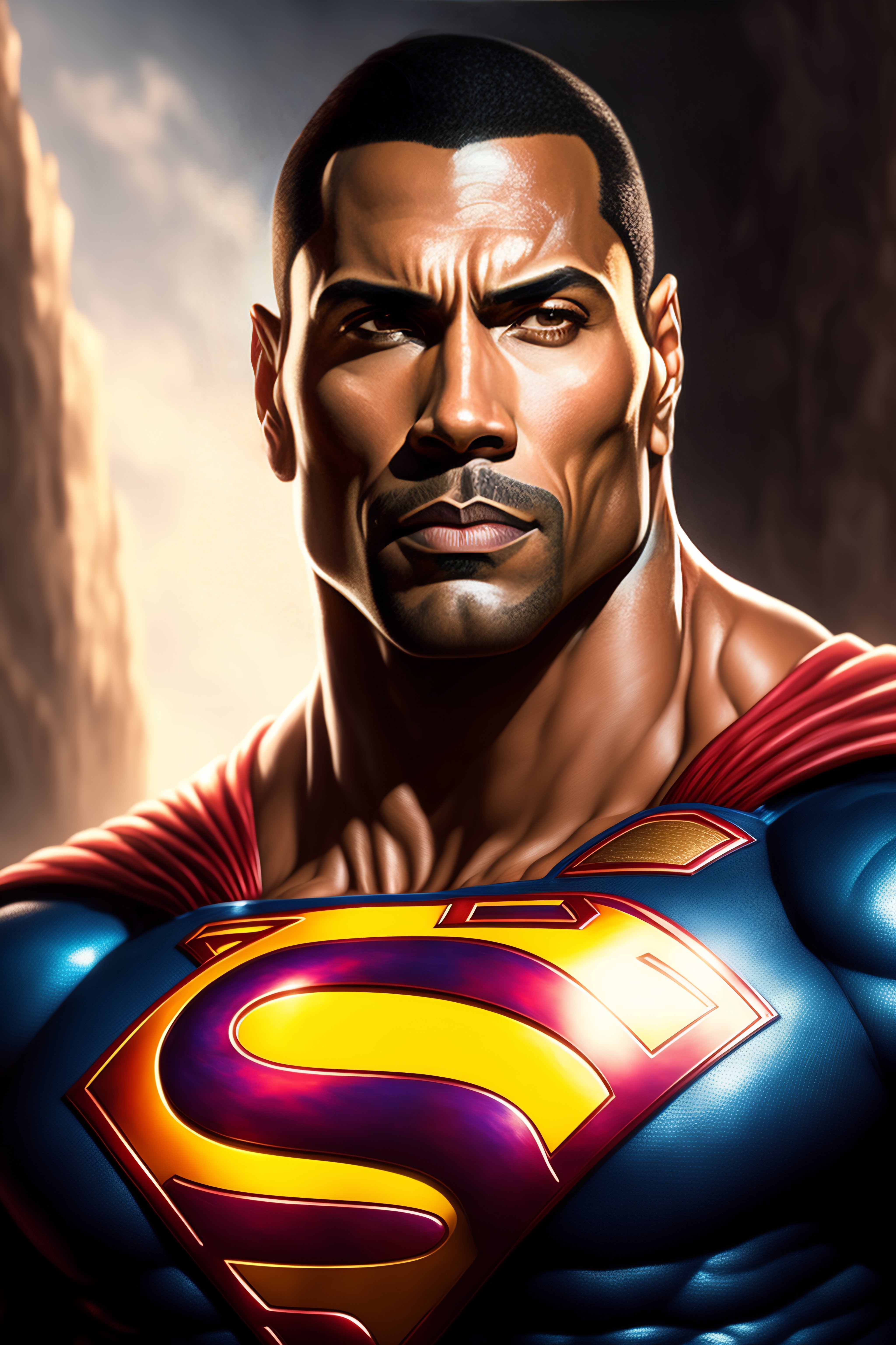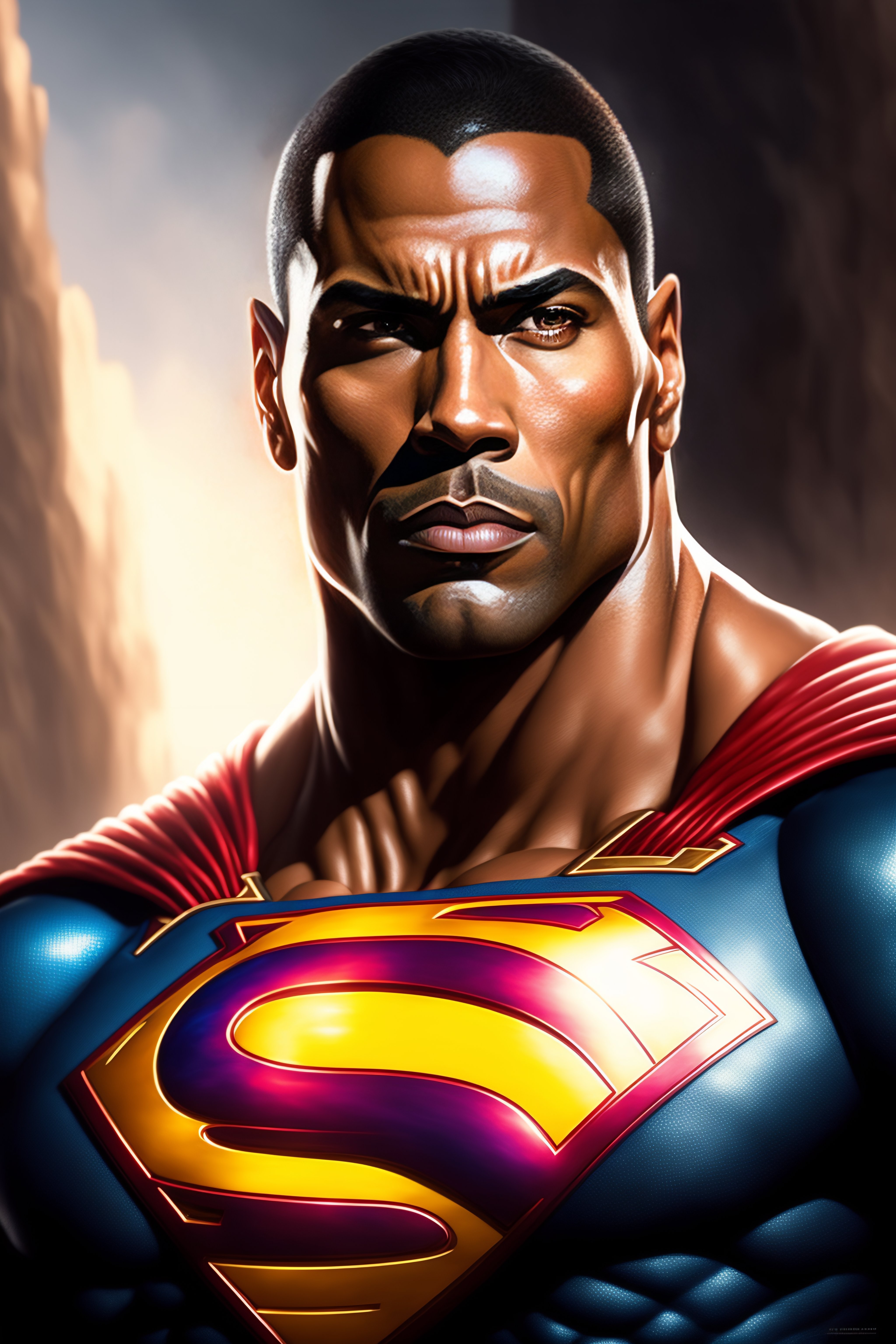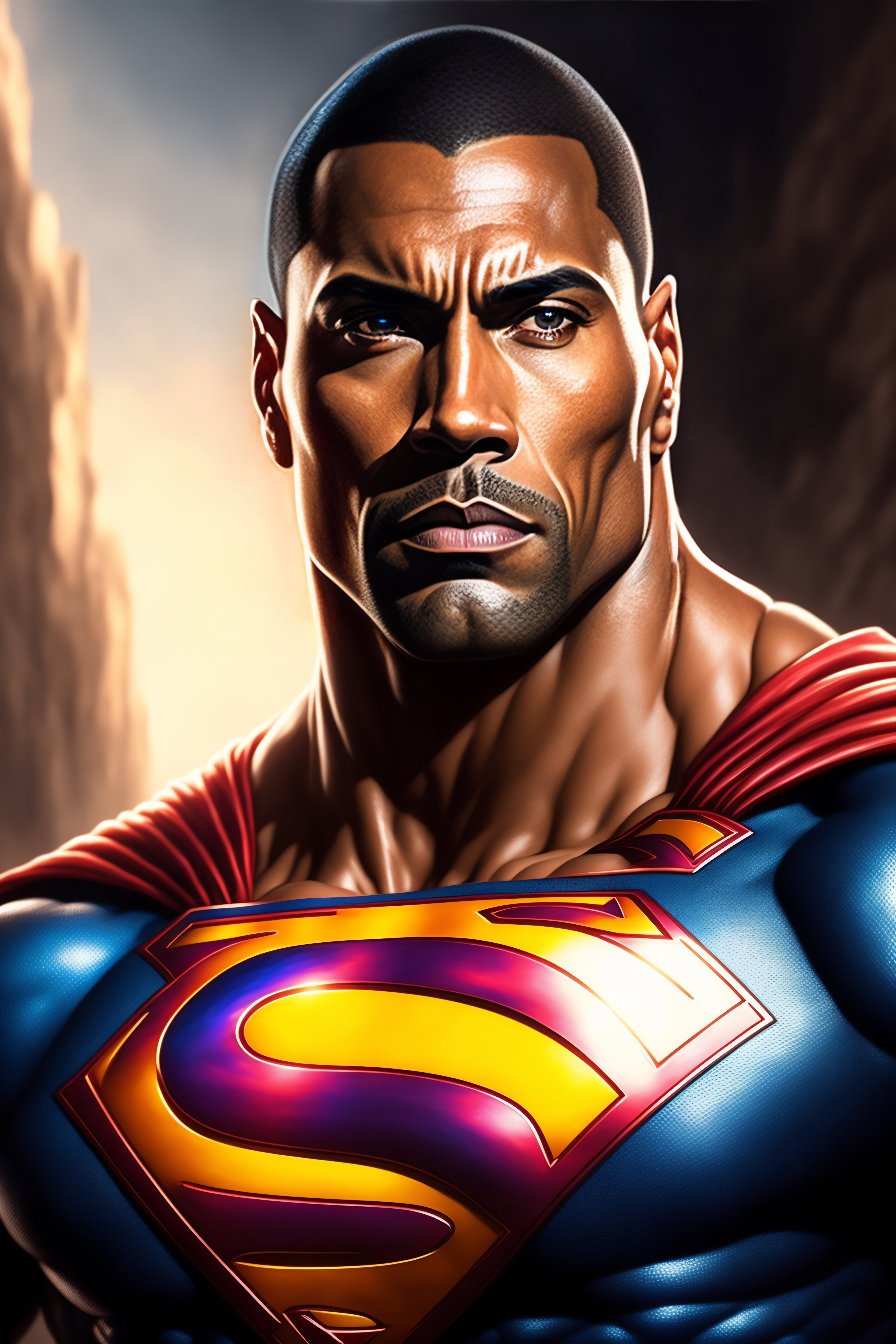 The rock as superman, realistic portrait, symmetrical, highly detailed, digital painting, artstation, concept art, smooth, sharp focus, illustration, cinematic lighting, art by artgerm and greg rutkowski and alphonse mucha
