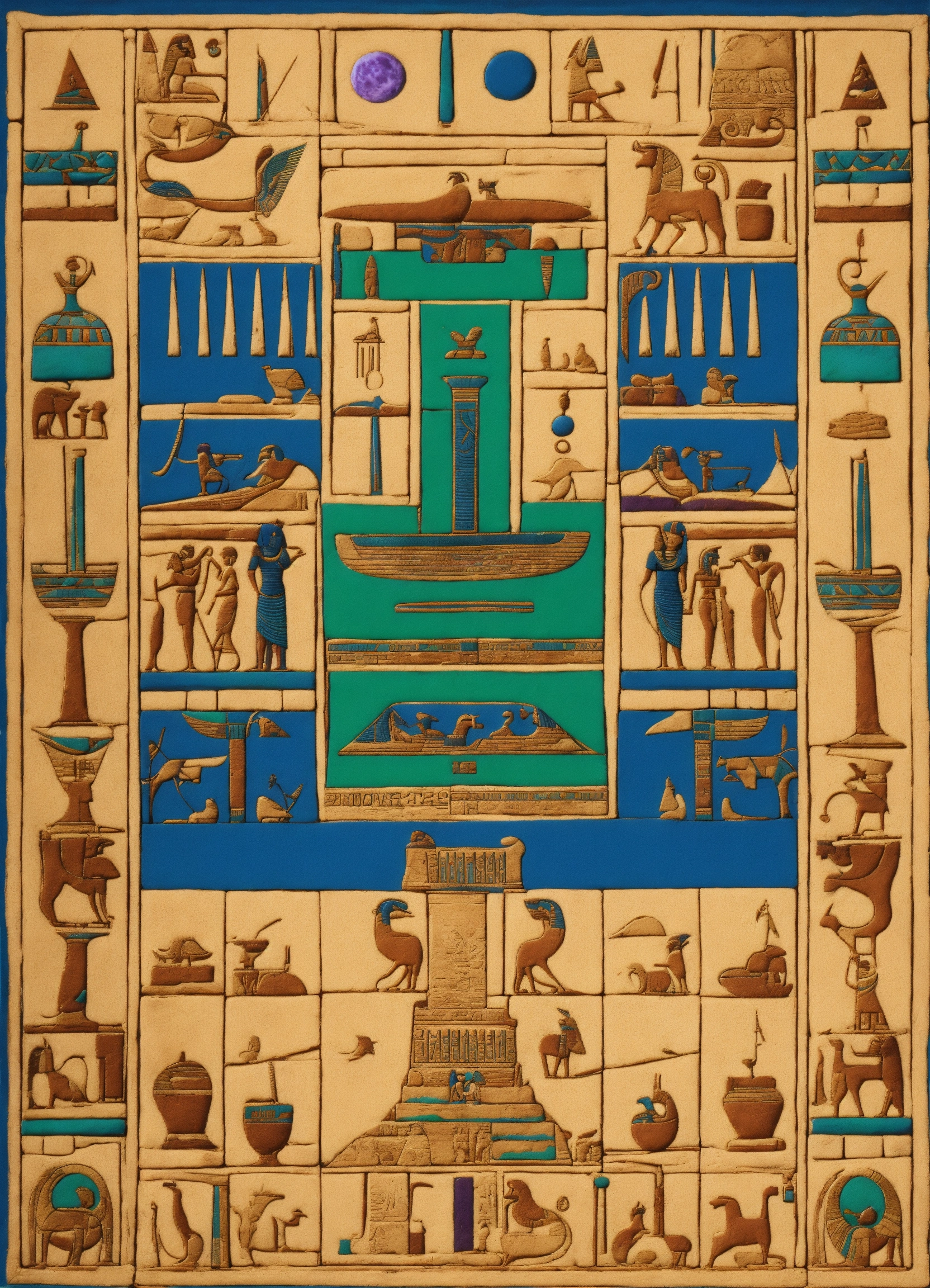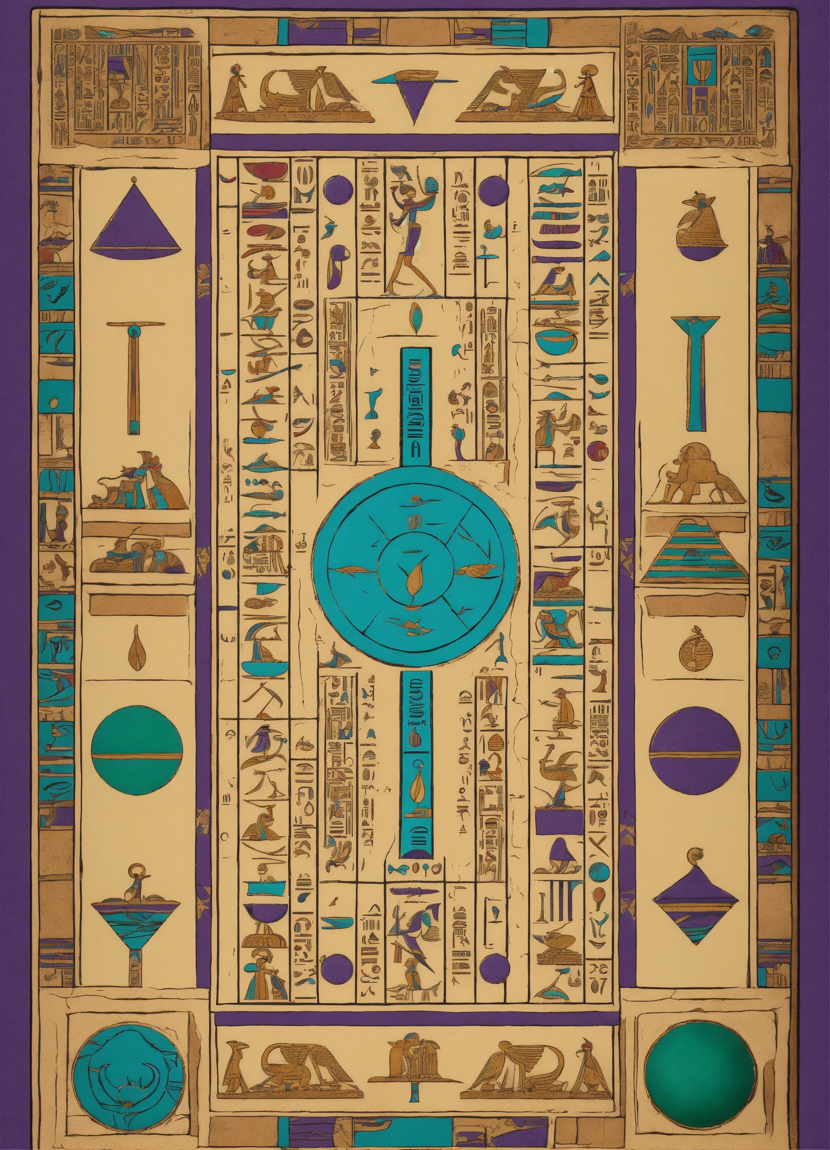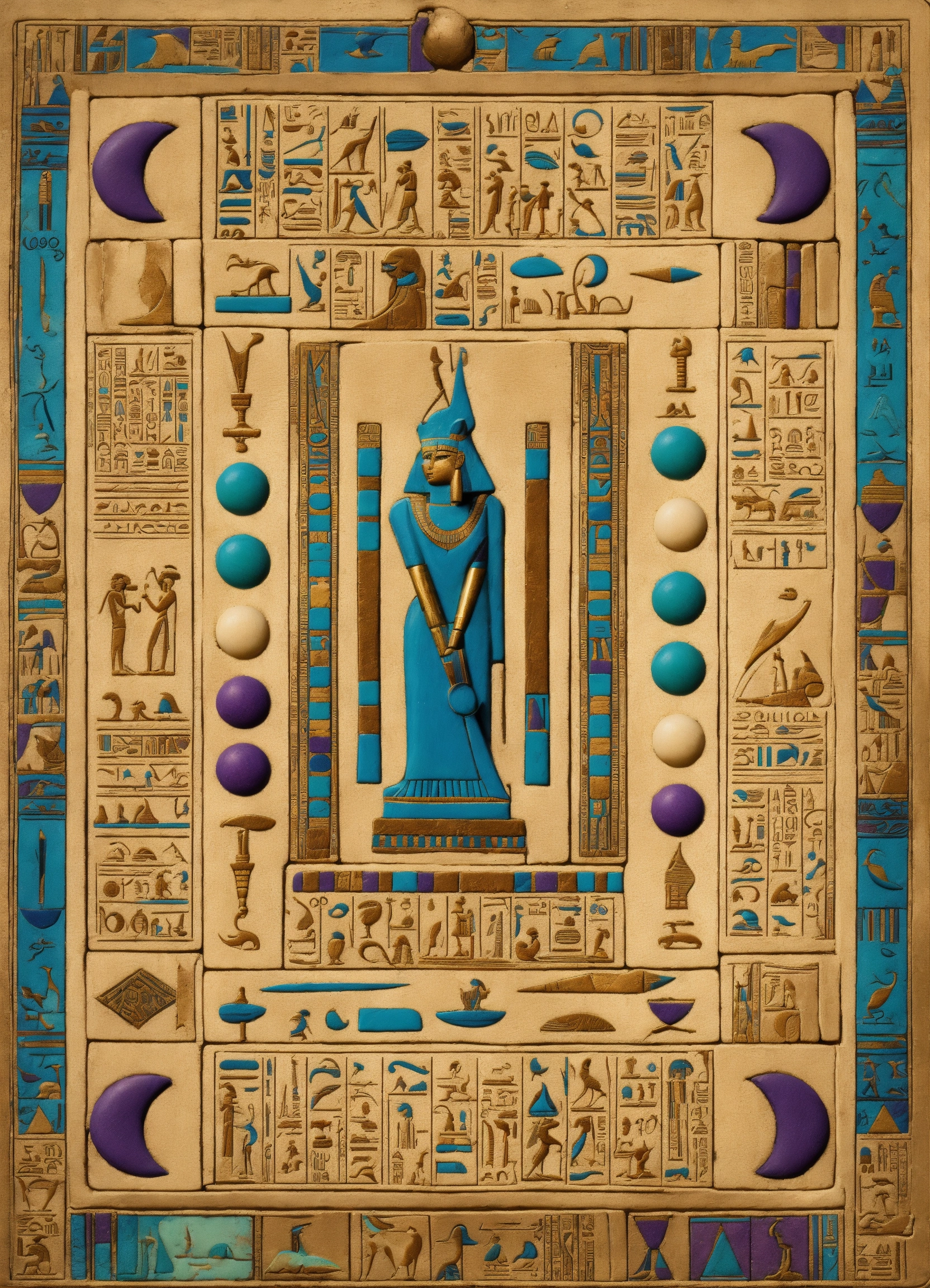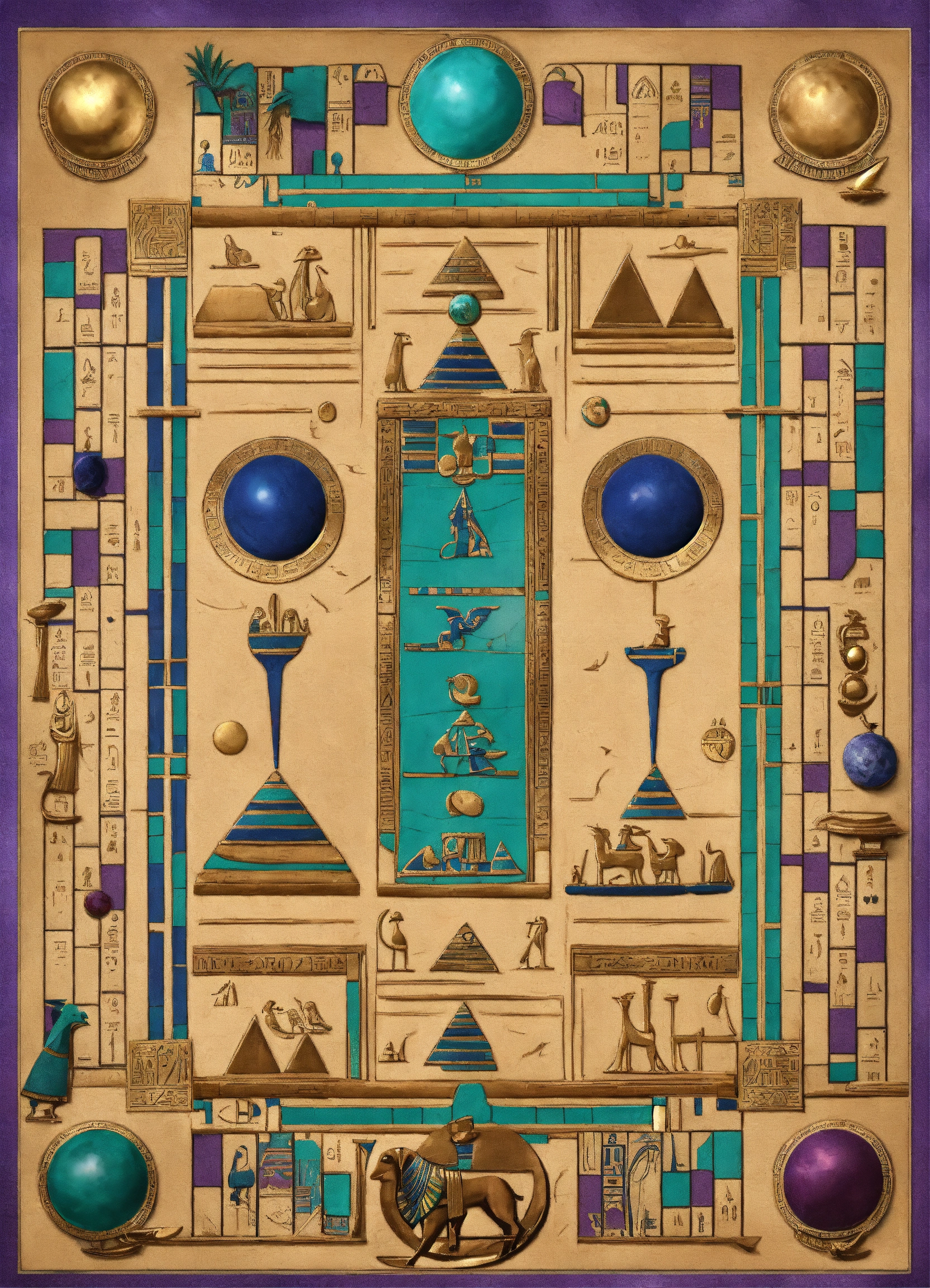 All superrealism style egyptian card style egyptian board game senet in the center hieroglyphs all around outdoor big blue moon cream beige purple turquoise emerald green royal blue glow