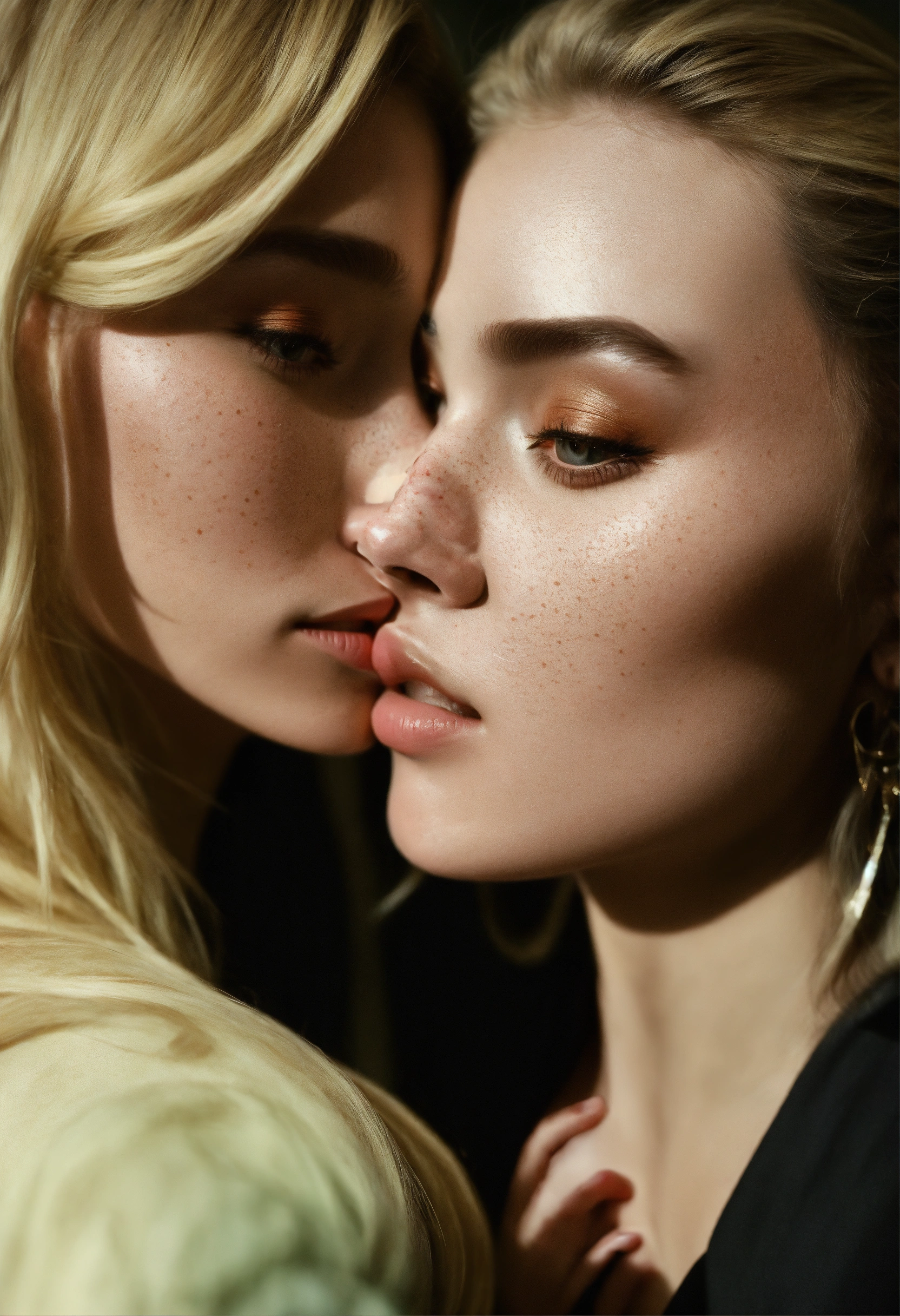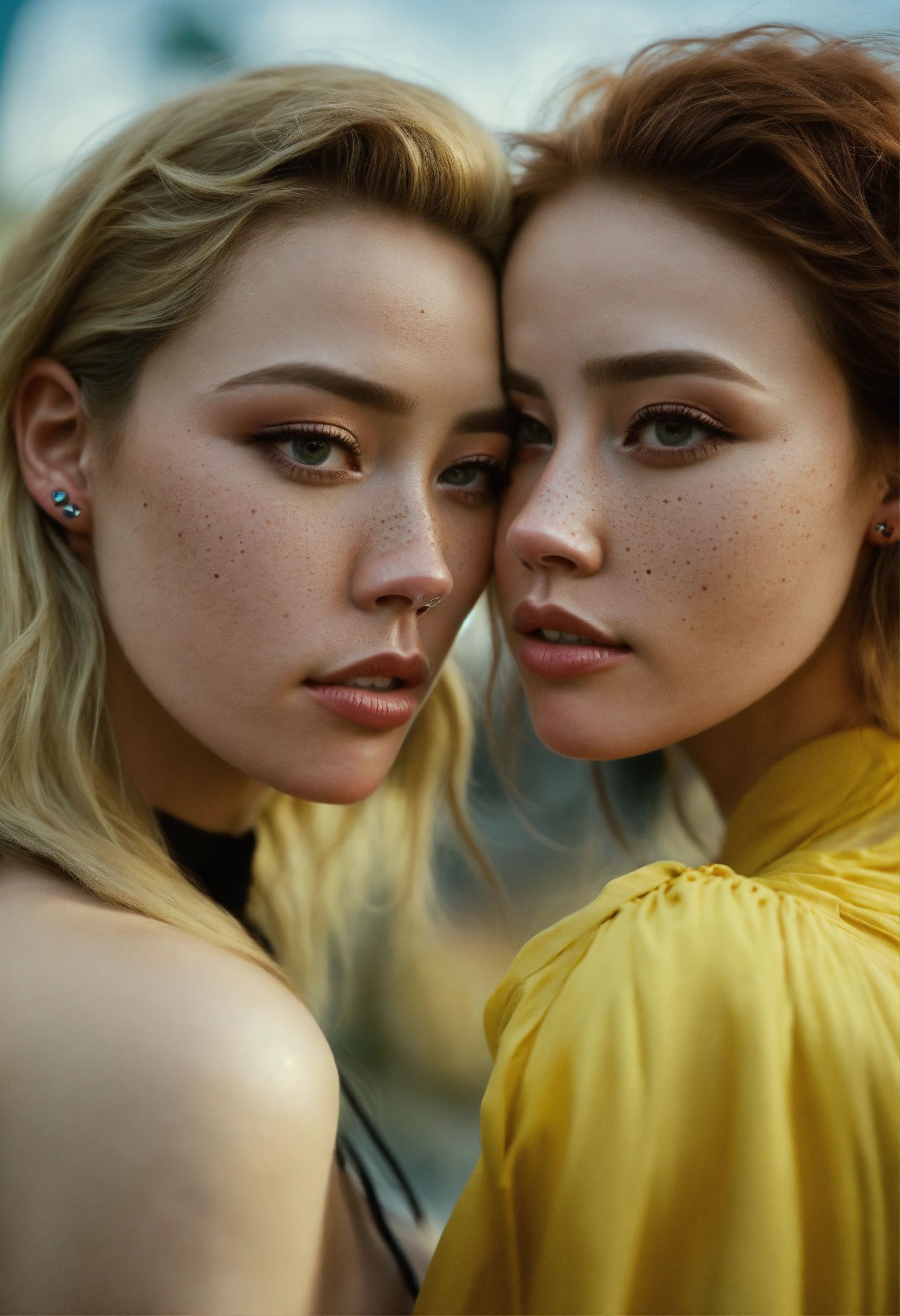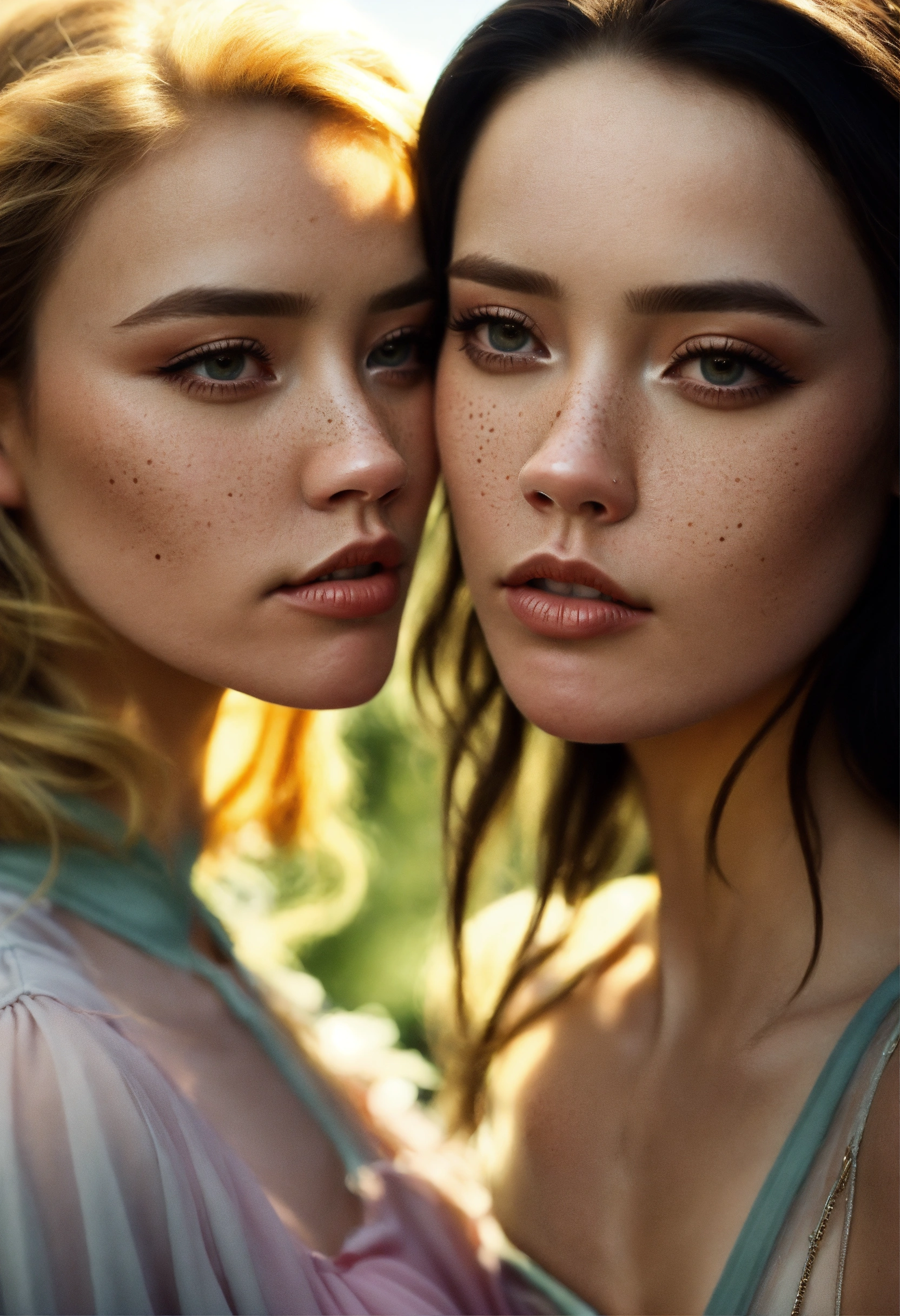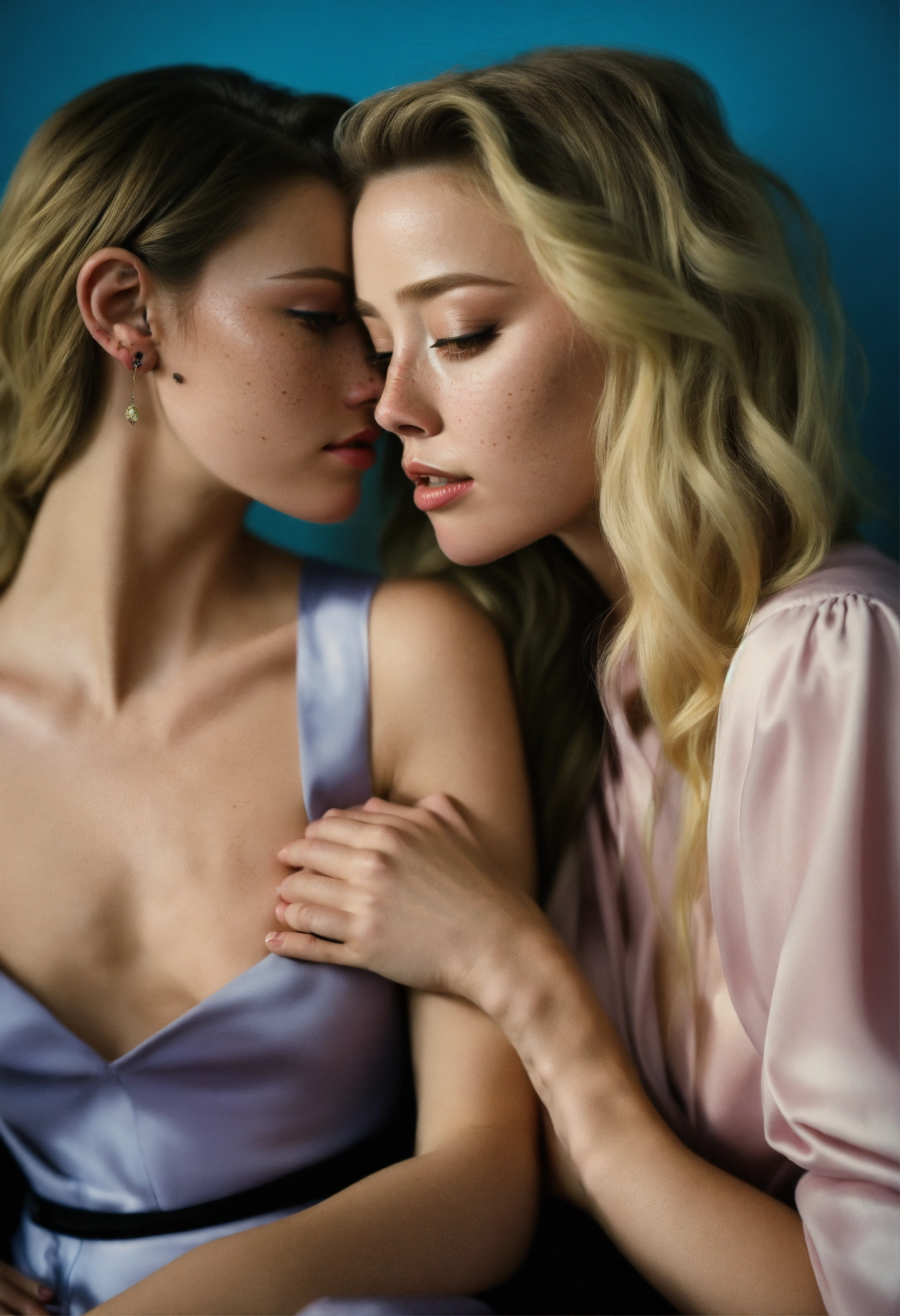 Kodachrome two models 1st-model=<blonde-amber-heard><wearing-formal-makeup> hugging 2nd-model=<brunette-effy-stonem><wearing-formal-makeup> kissing love pastel-goth high-depth cinematic symmetry central point of composition soft realistic skin, freckles