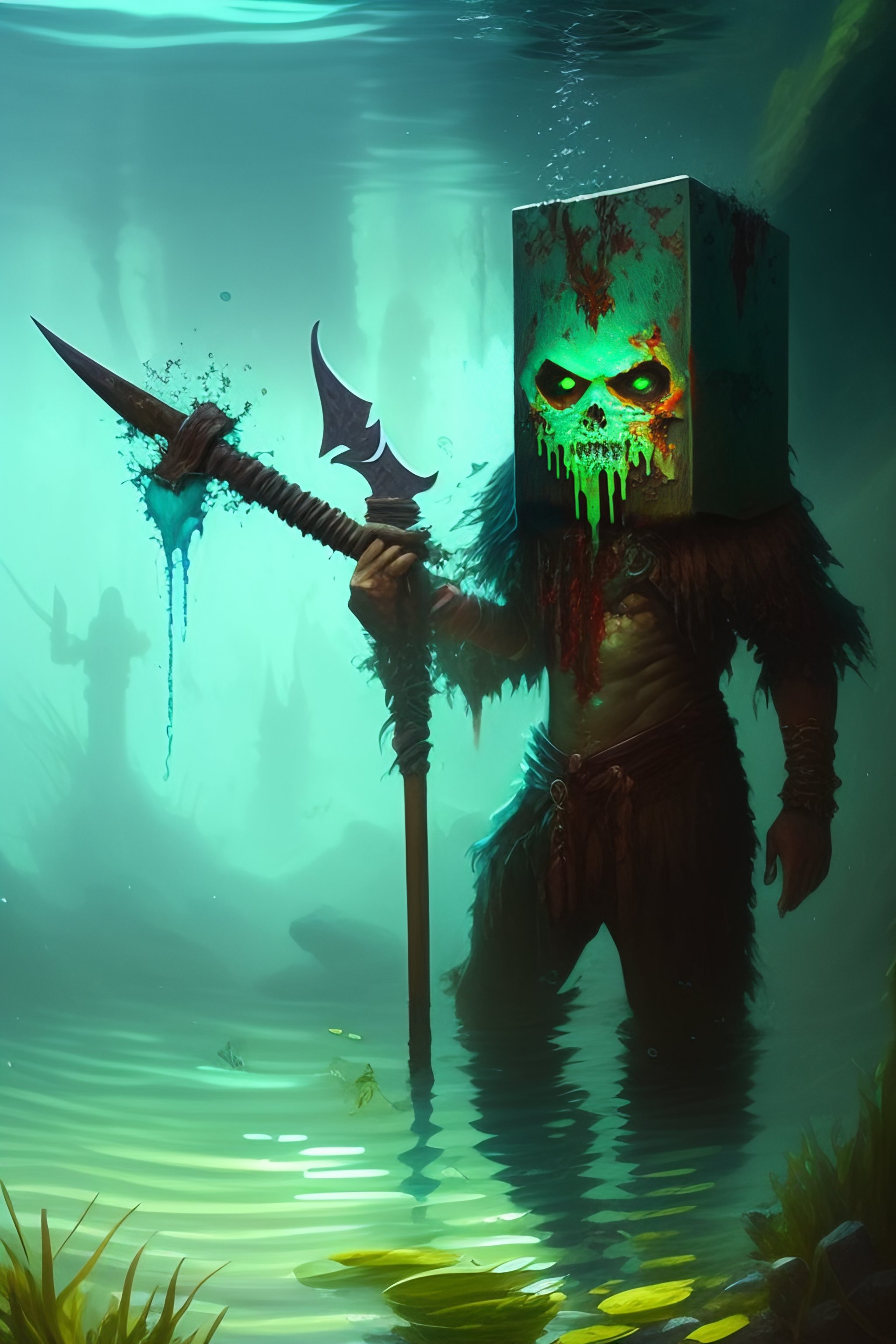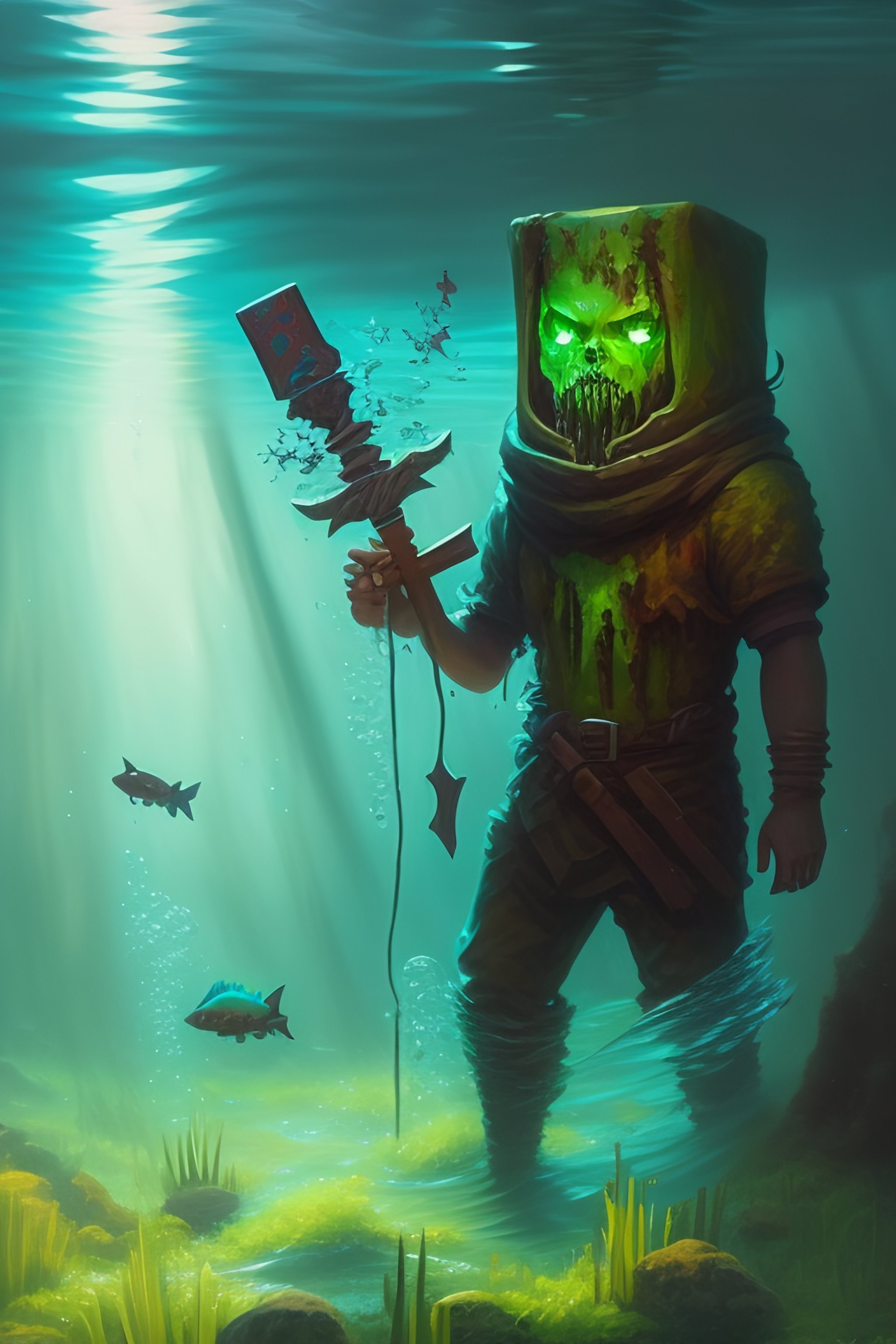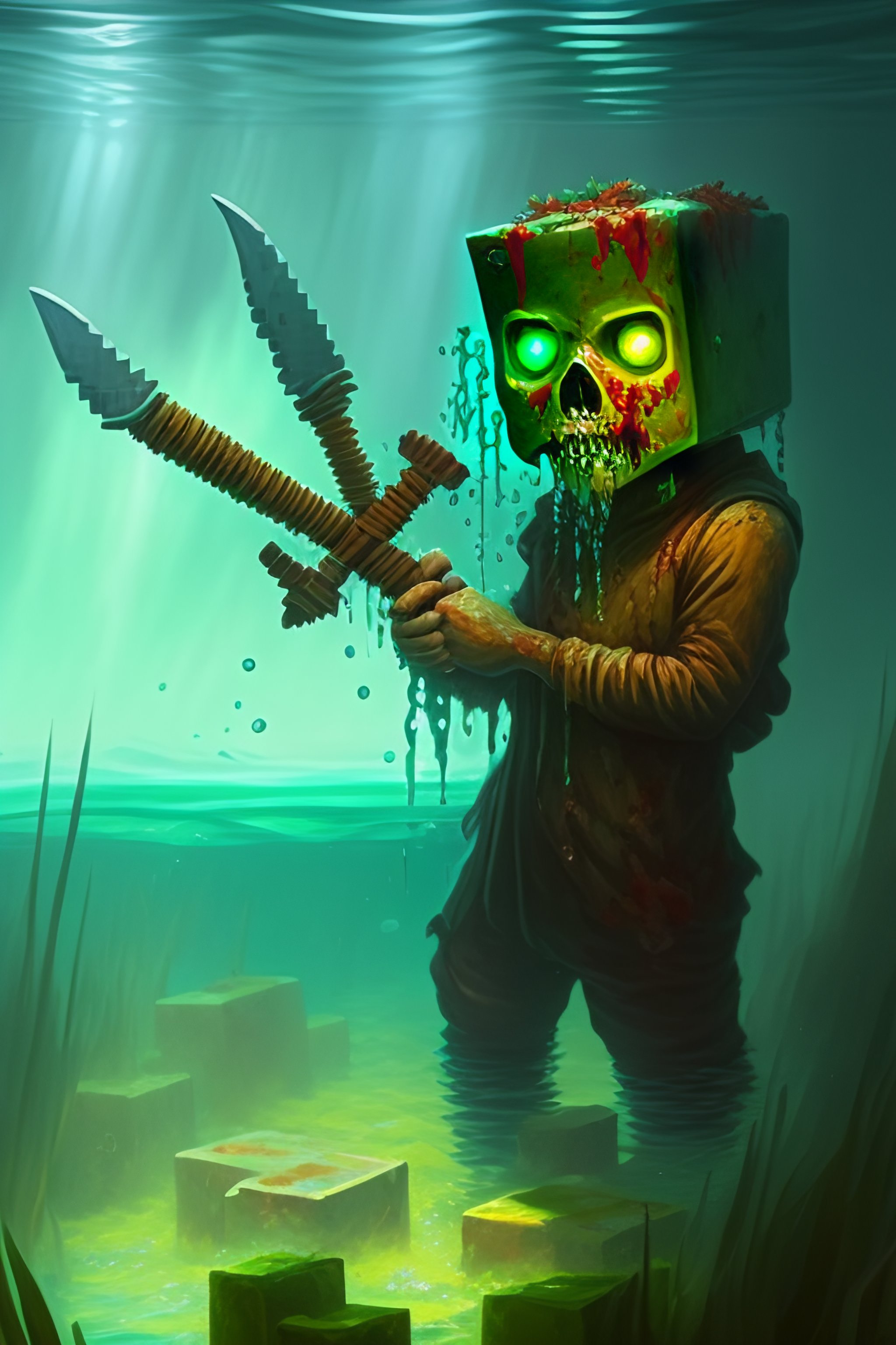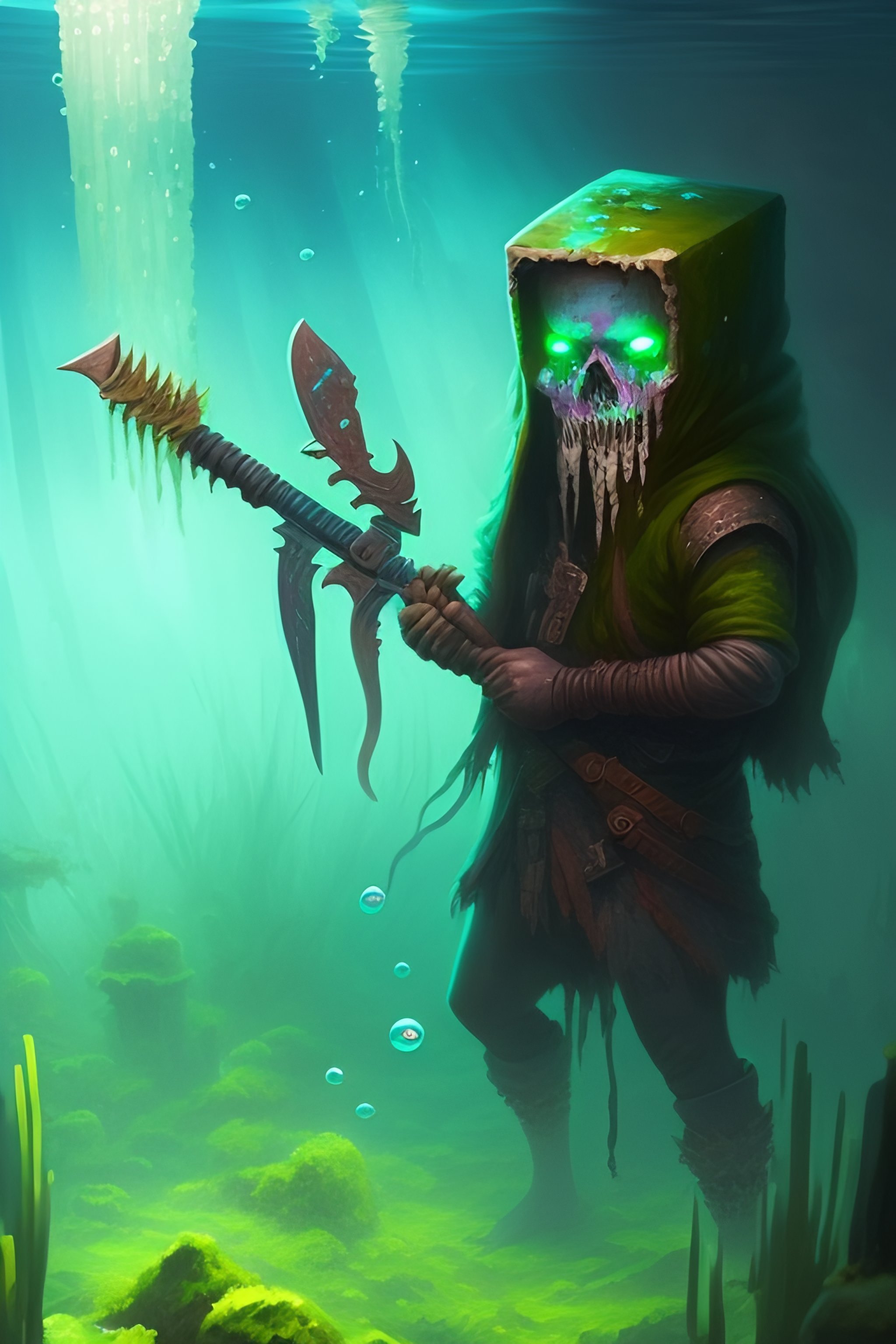 Painting by greg rutkowski of a minecraft drowned zombie with glowing cyan eyes, wearing ragged clothing and and algae growing on it, holding a trident, underwater