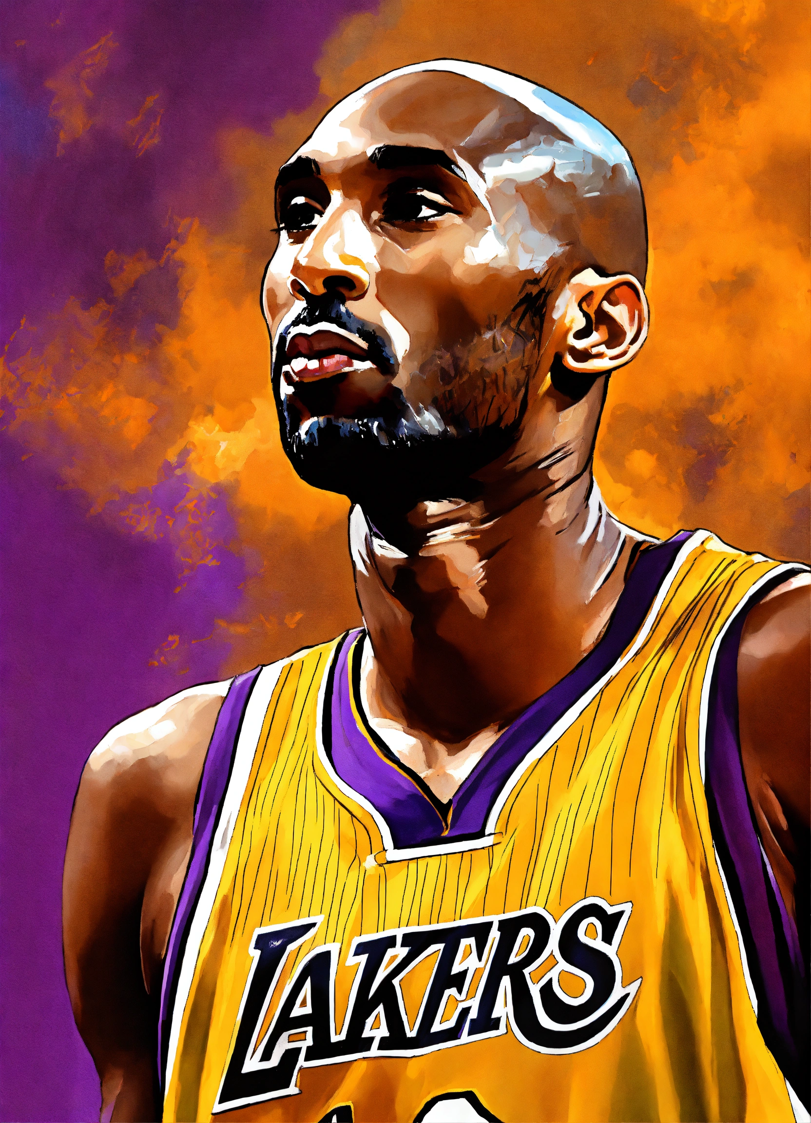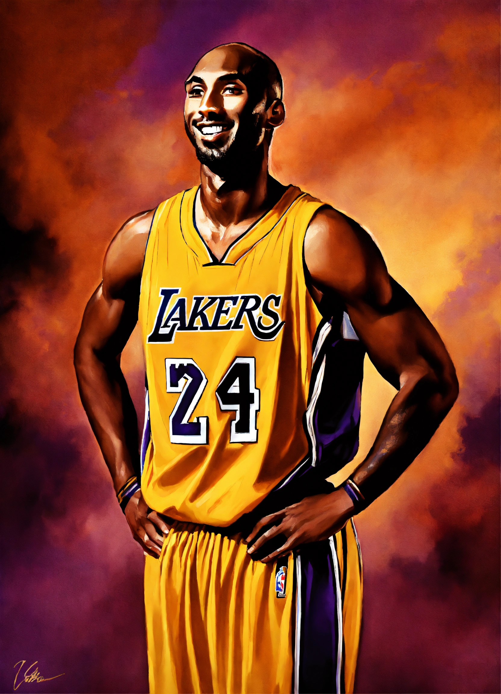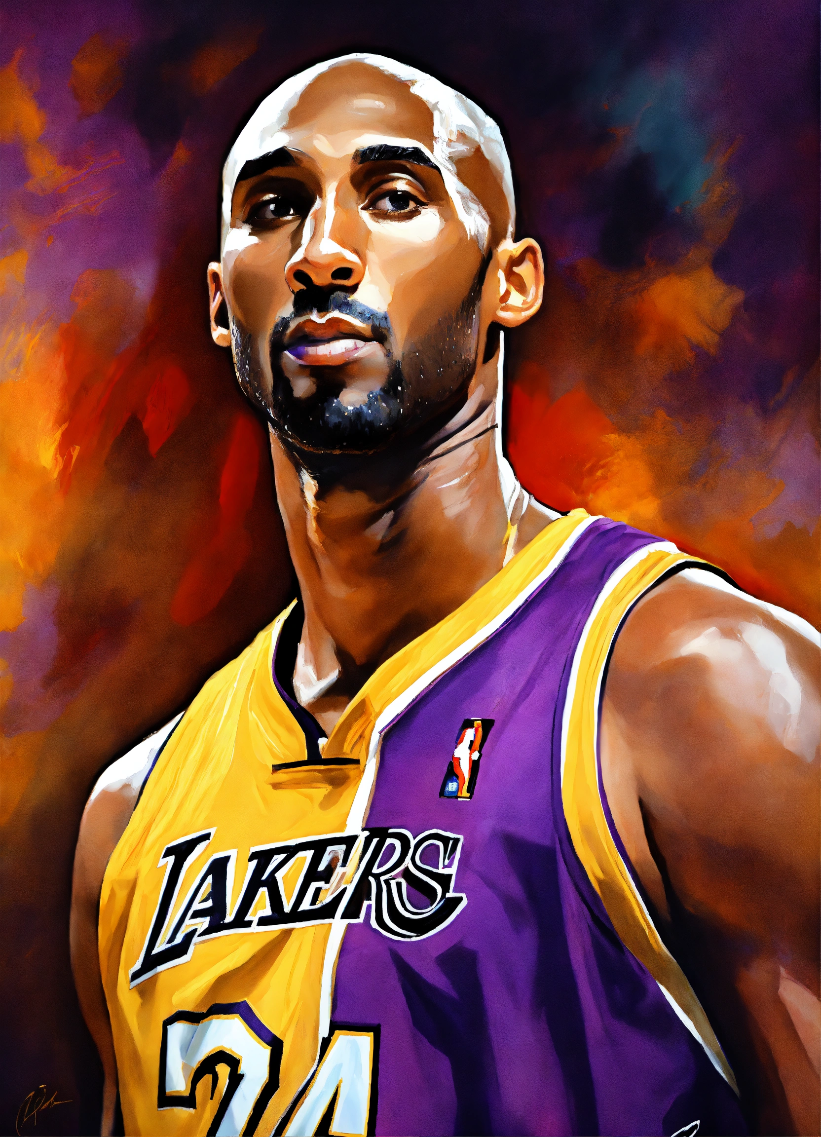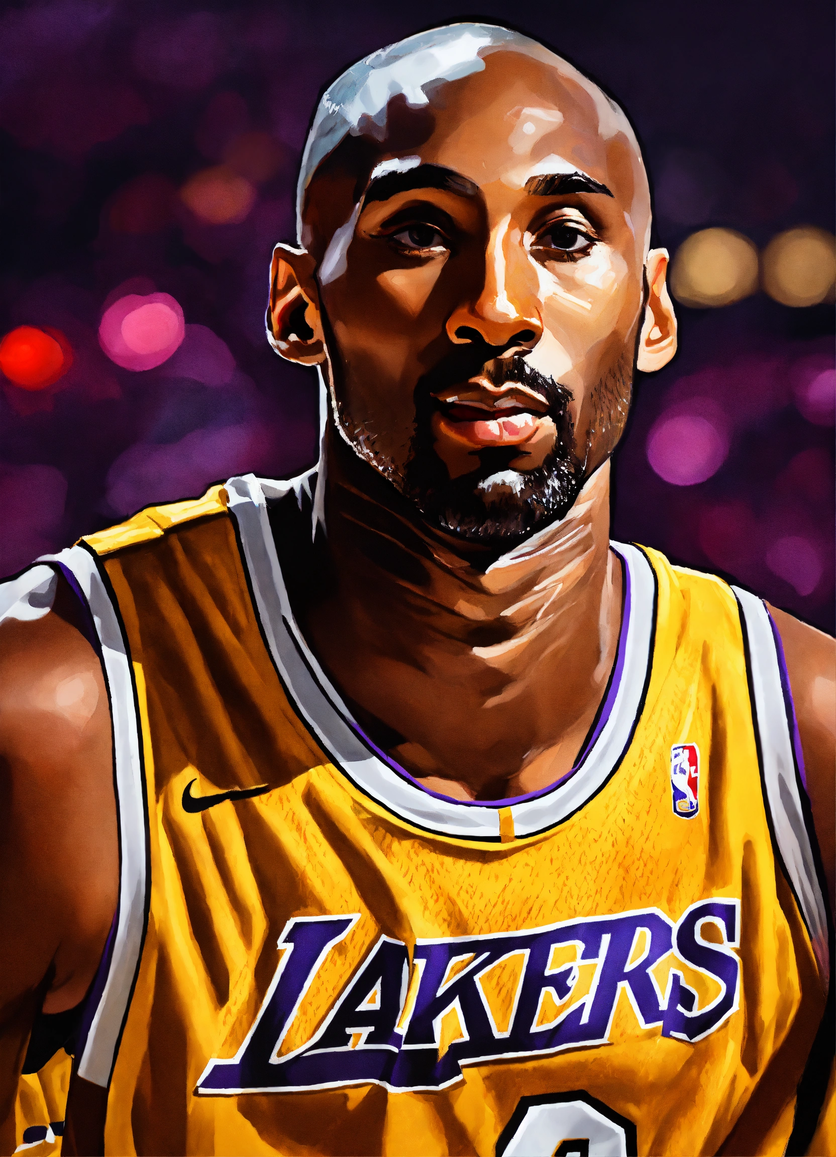 Kobe bryant wearing a jersey of los angeles lakers, brown skin, classical painting, digital painting, romantic, vivid color, oil painting third-eye