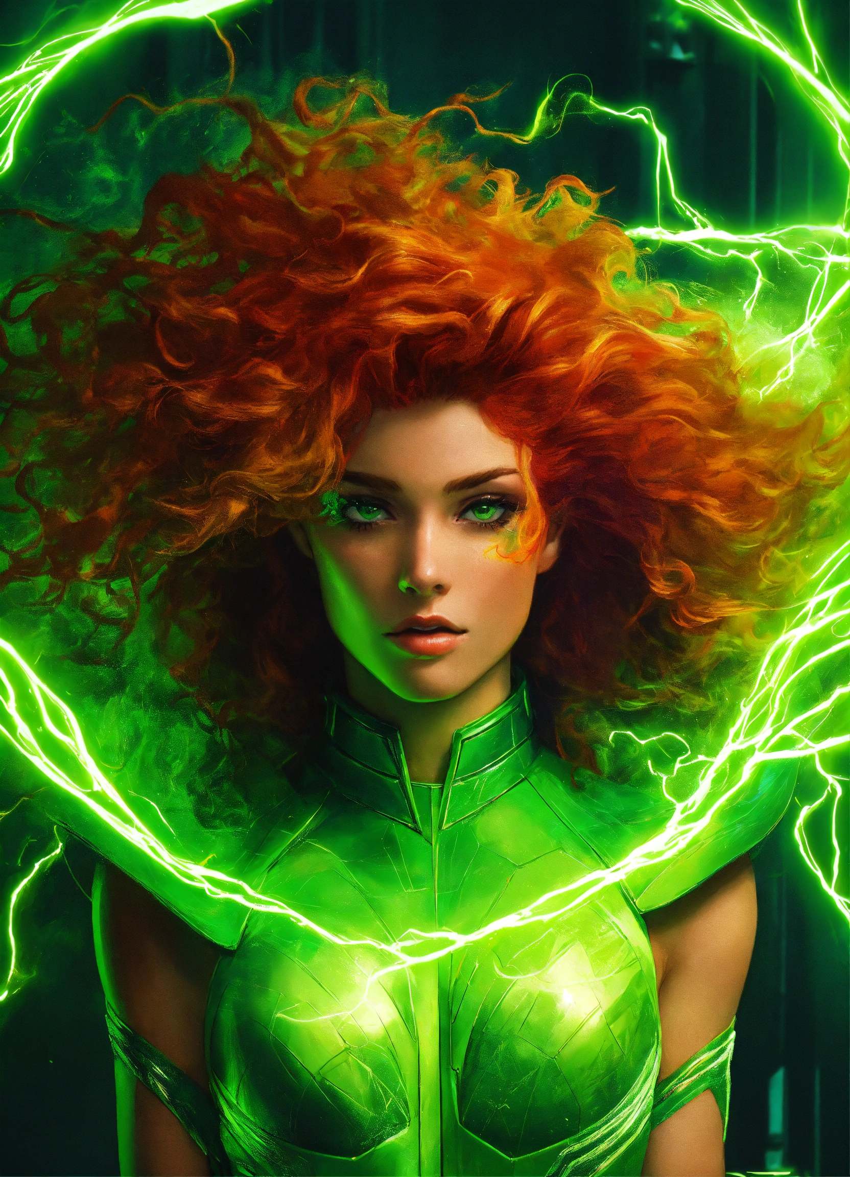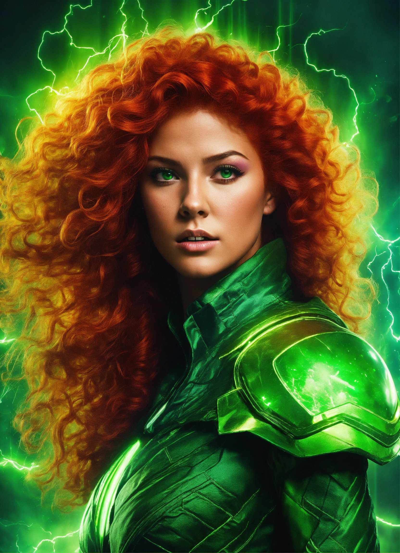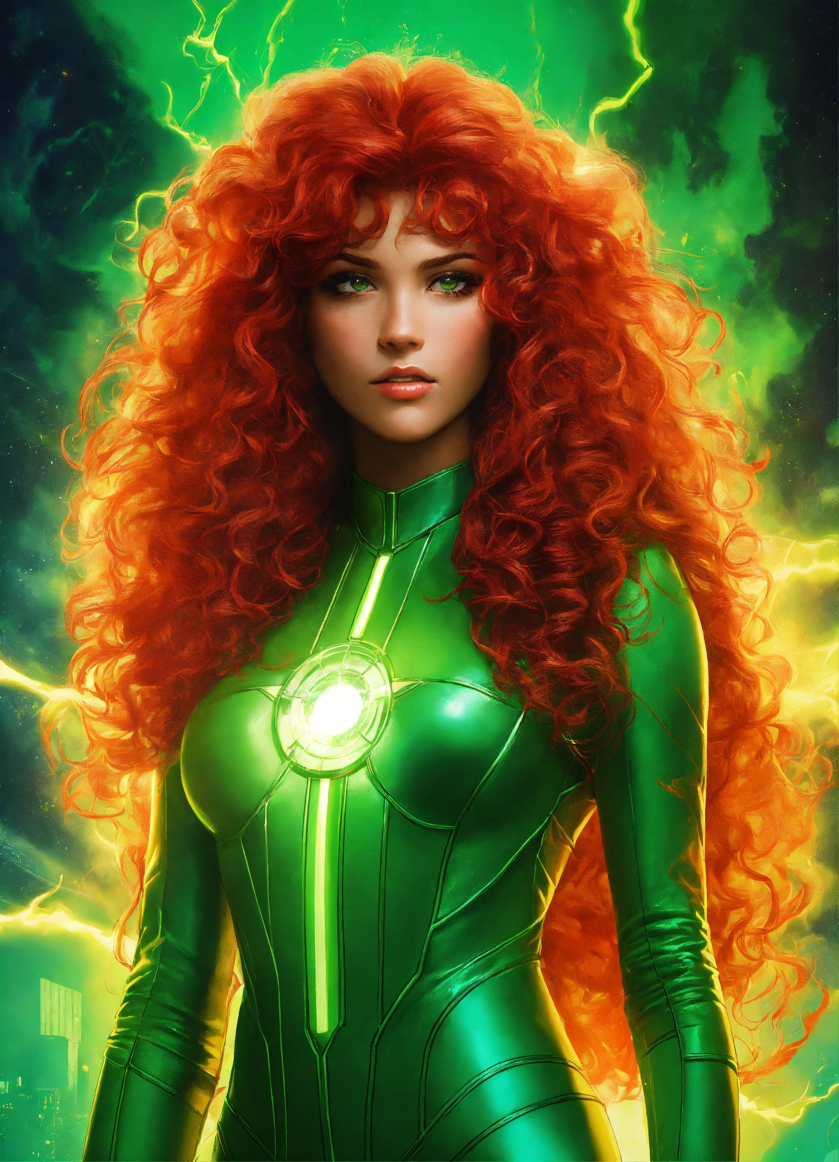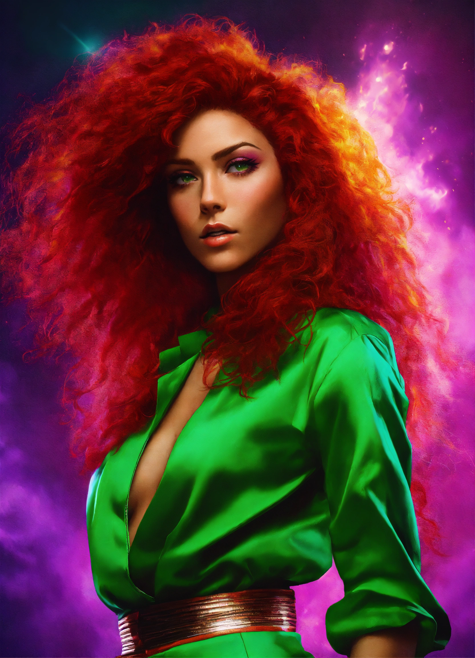 "80s dc starfire covered in green energy", superpowers, dramatic, head and shoulders portrait, massive flaming curly red 80s hair