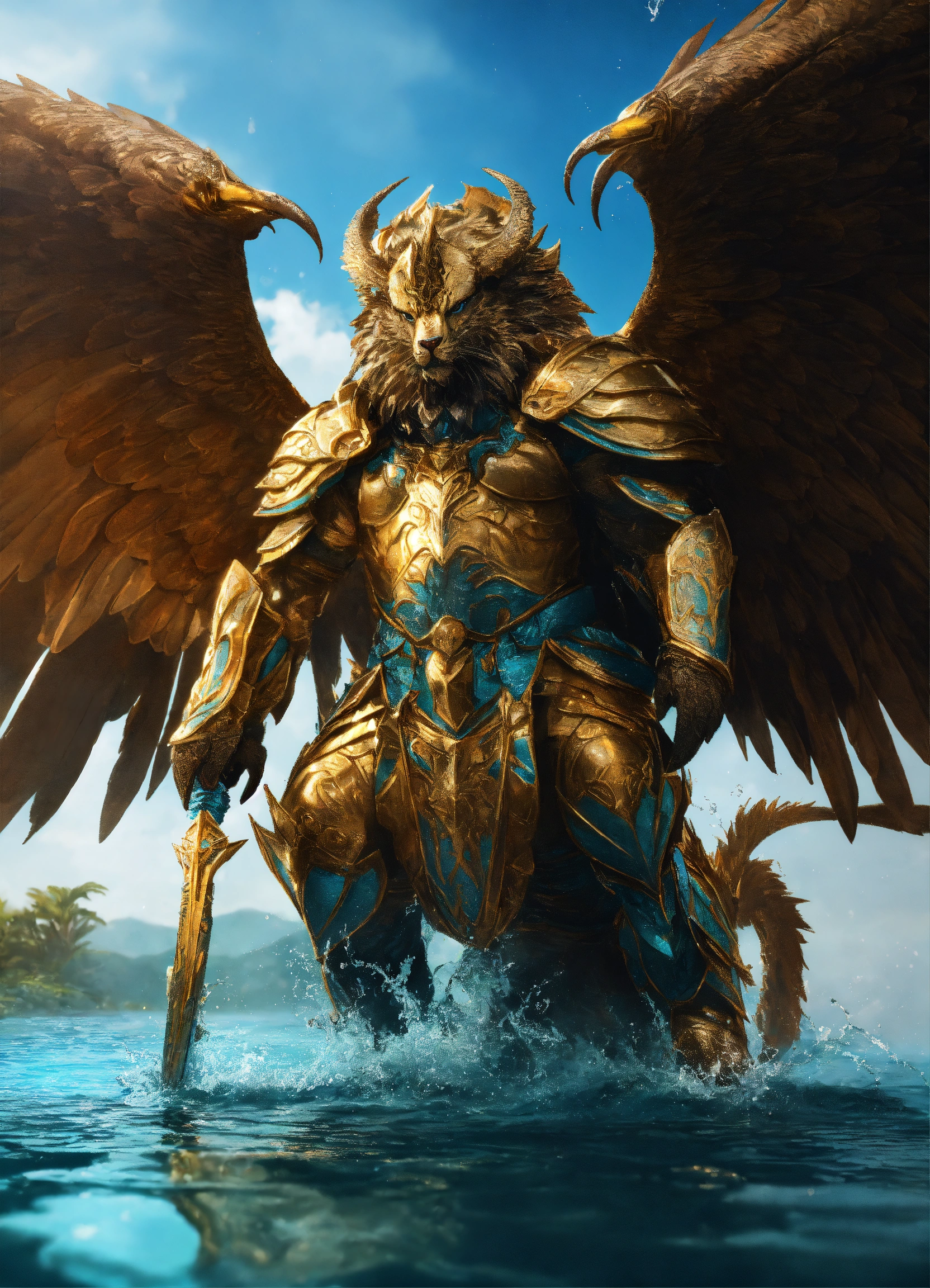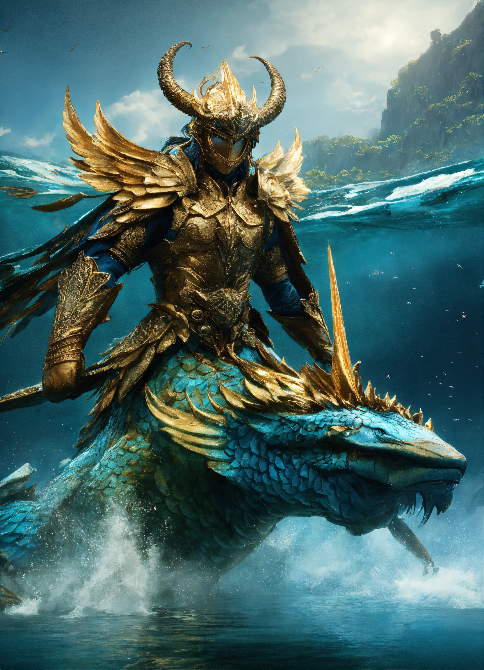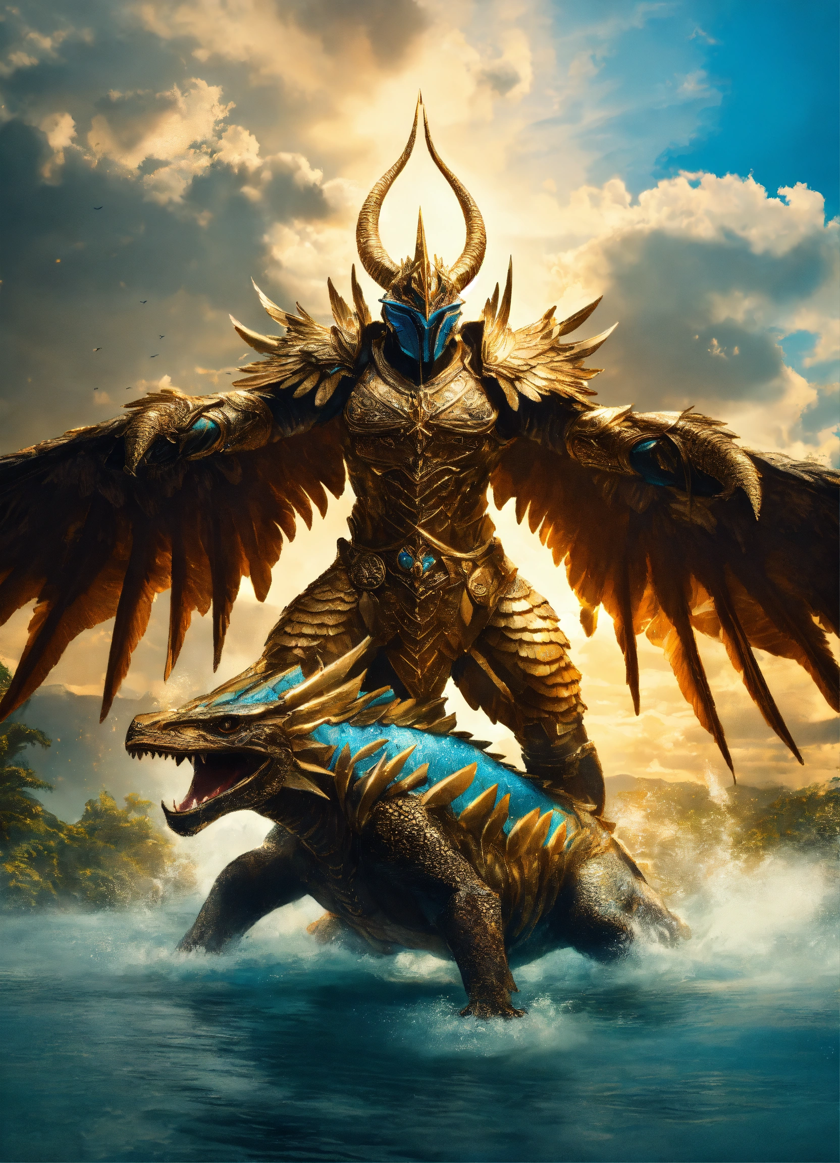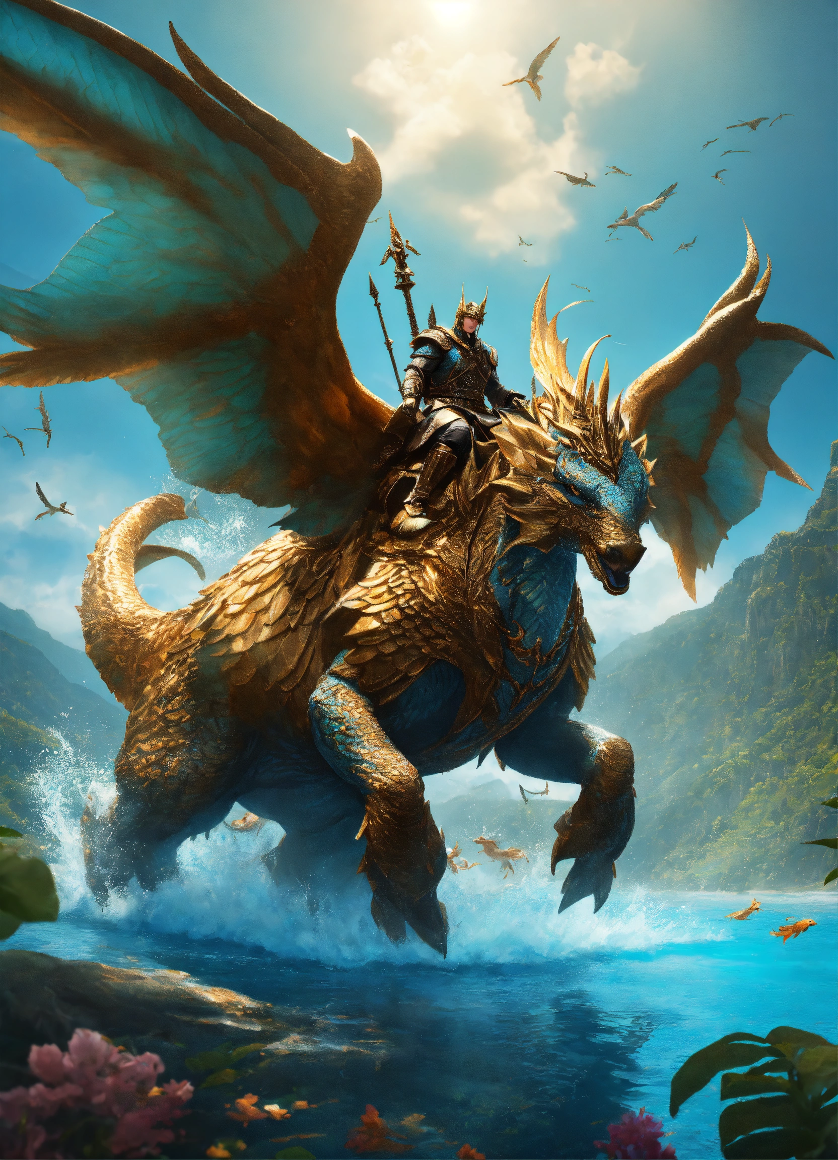 A warrior sitting on a giant creature and riding it in the water, with wings spread wide in the water, camera positioned just above the water to capture this beautiful scene, surface showing intricate details of the creature’s scales, fins, and wings, majesty, hero rides on the creature in the water, digitally enhanced, enhanced graphics, straight, sharp focus, bright lighting, closeup, cinematic, bronze, azure, blue, ultra highly detailed, 18k, sharp focus, bright photo with rich colors, full coverage of a scene, straight view shot –ar 169 –v5