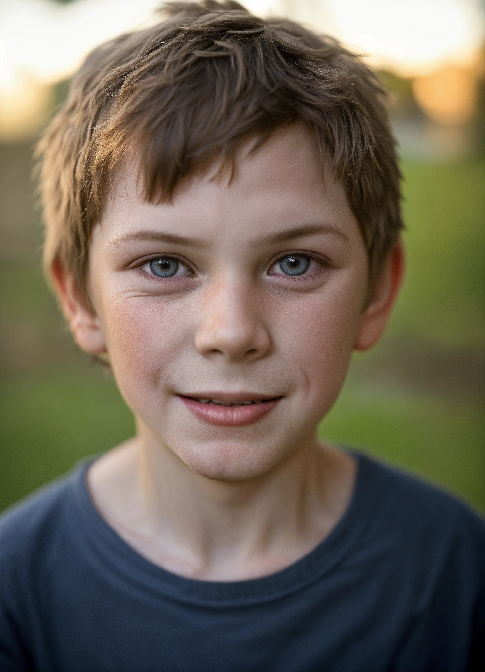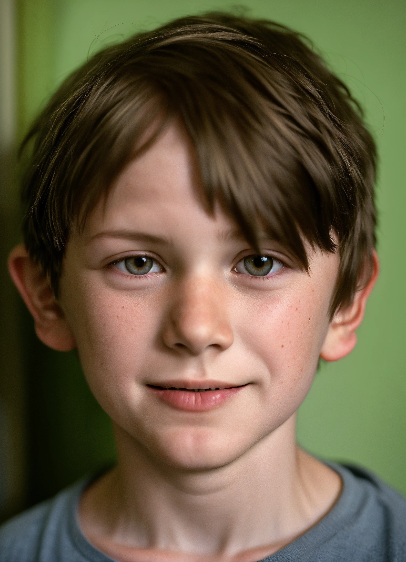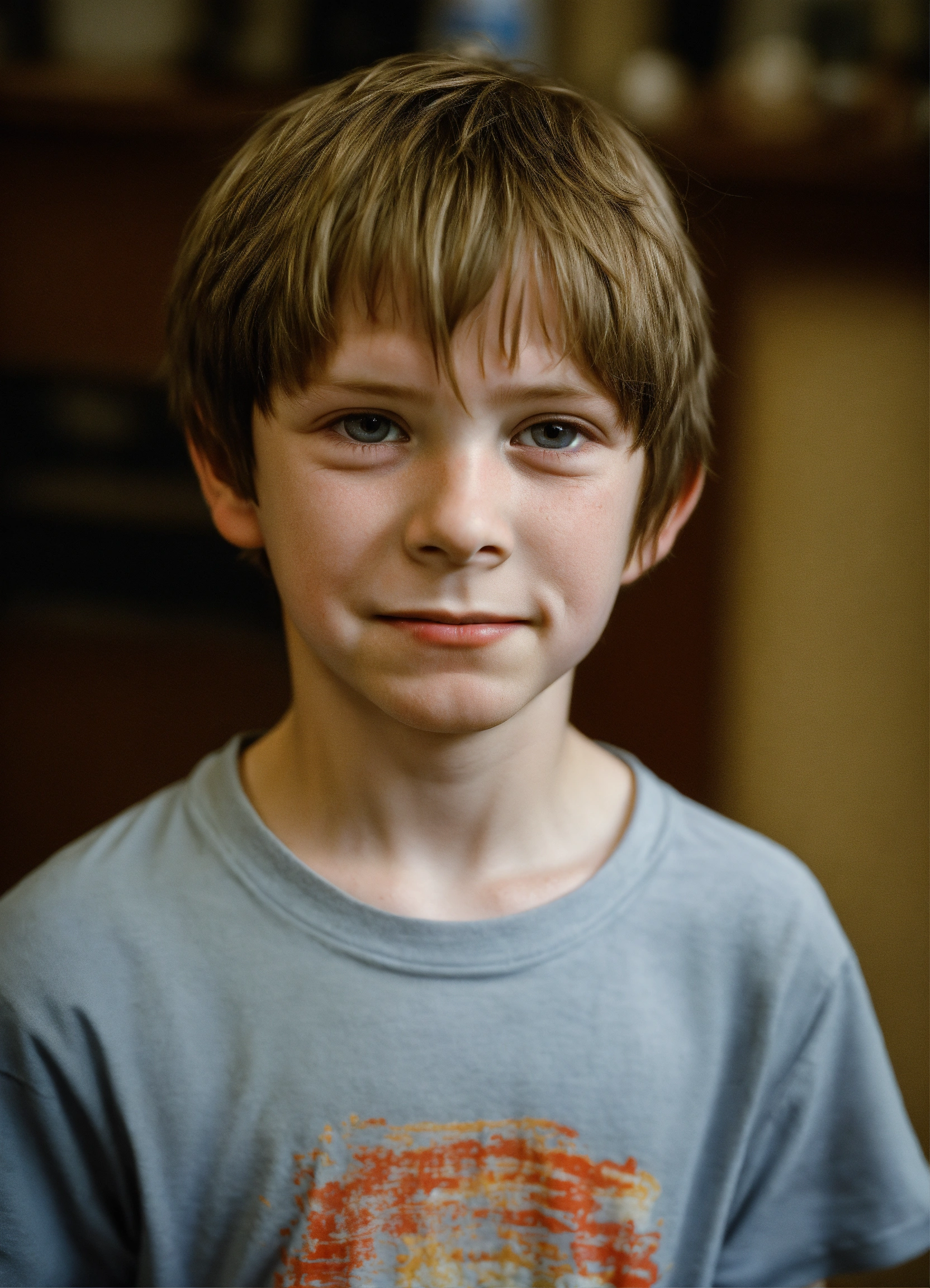 Photo of a 9-year-old boy, creepy, pale skin, sickly, thin, dark circles under eyes, sneer, greasy hair, smirk, scary