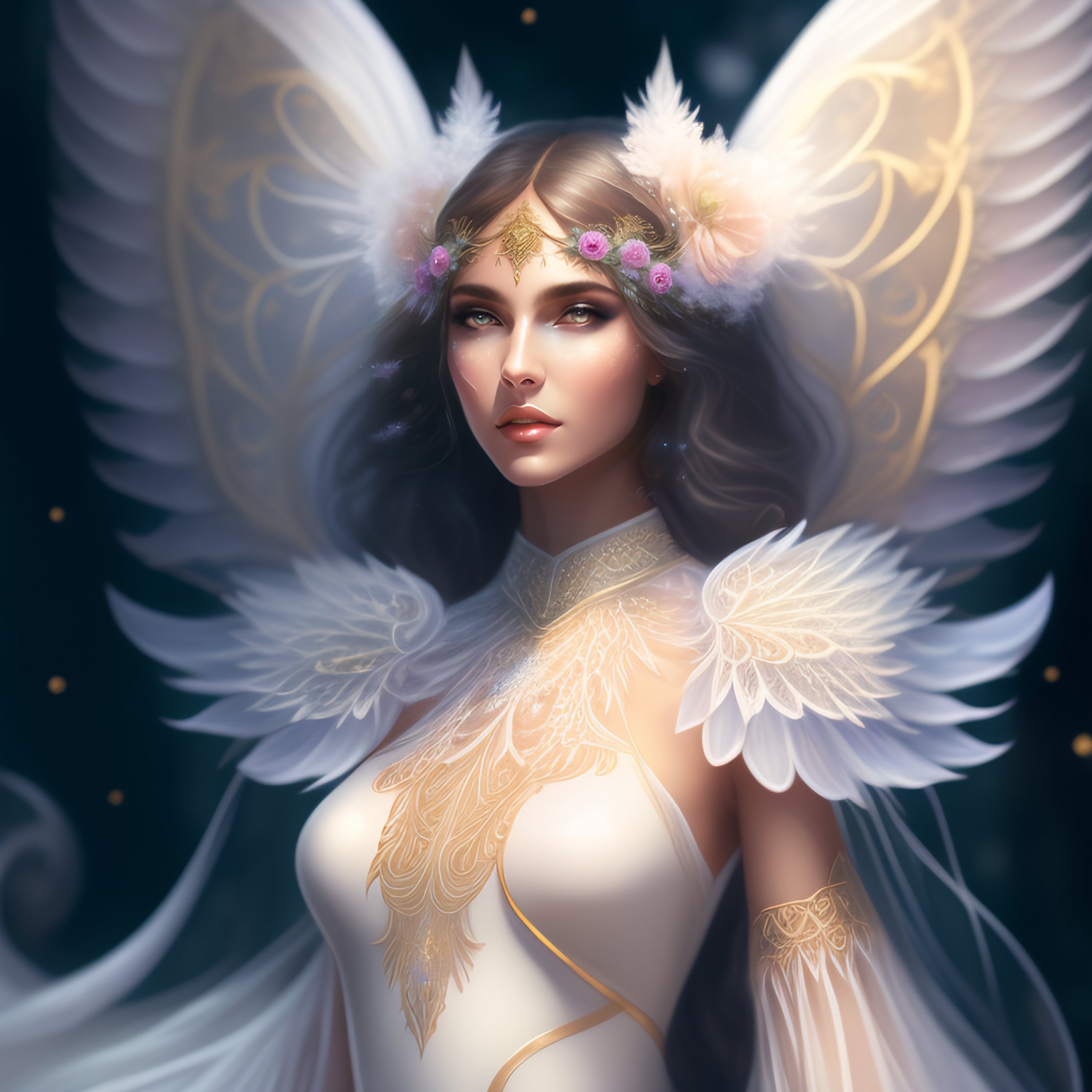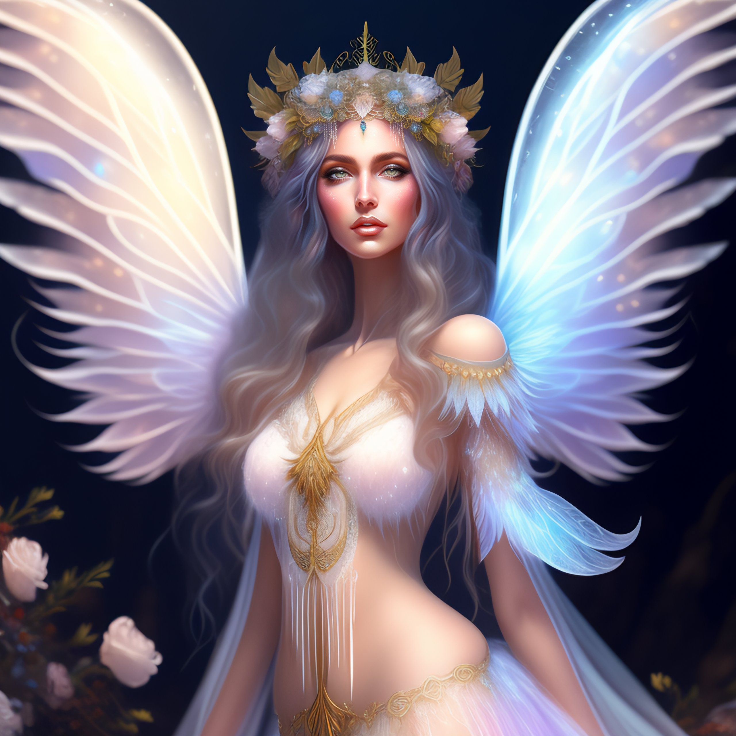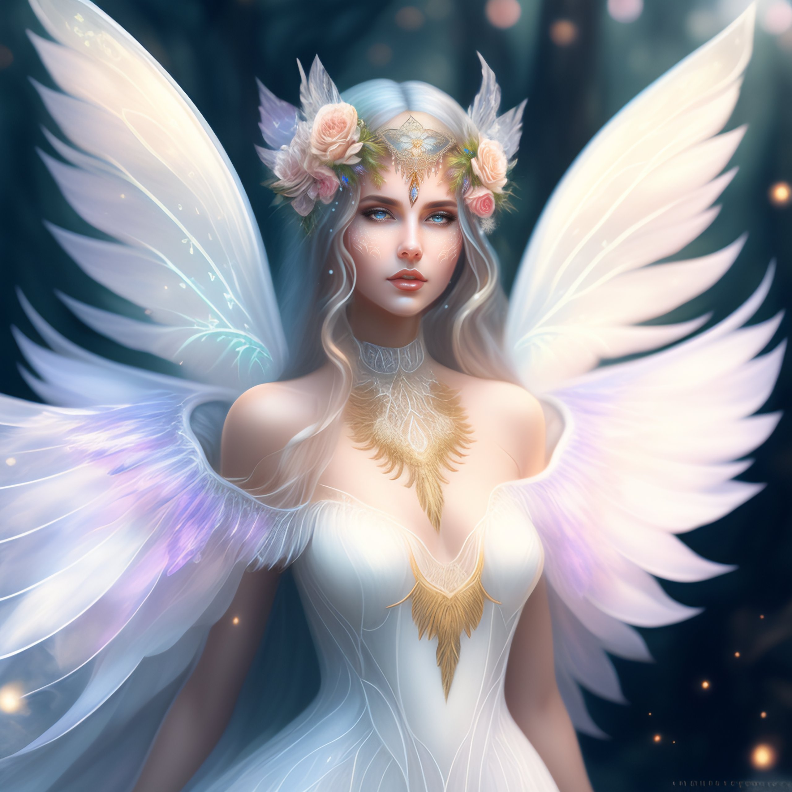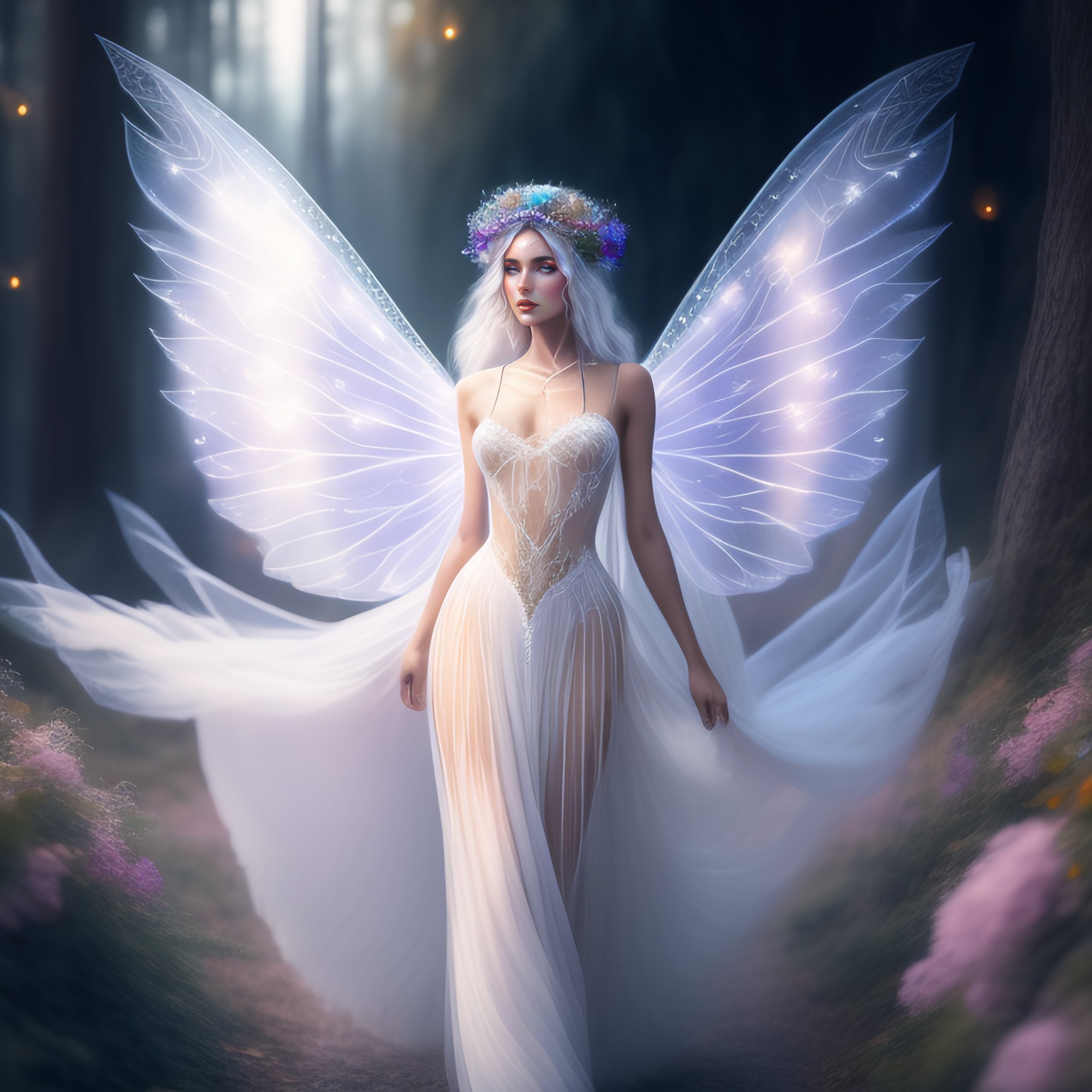 Extreme full shot of a beautiful mysterious transparent woman ghost with fairy like wings inspired by the balkan folklore, wearing a transparent white dress and wreath of flowers on the head with balkan style patterns, dancing in a forest at night, snow storm, digital painting, artstation, concept art, smooth, sharp focus, illustration, art by artgerm and greg rutkowski, 8k