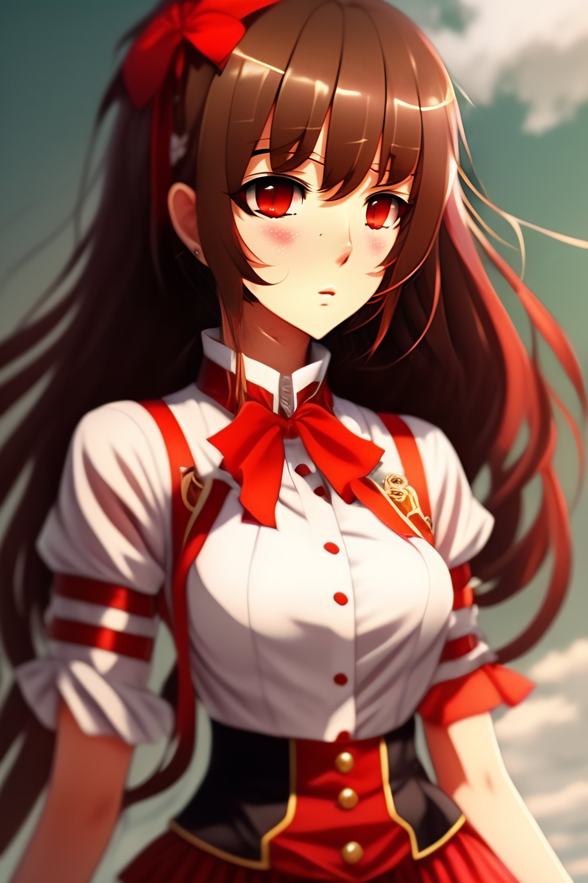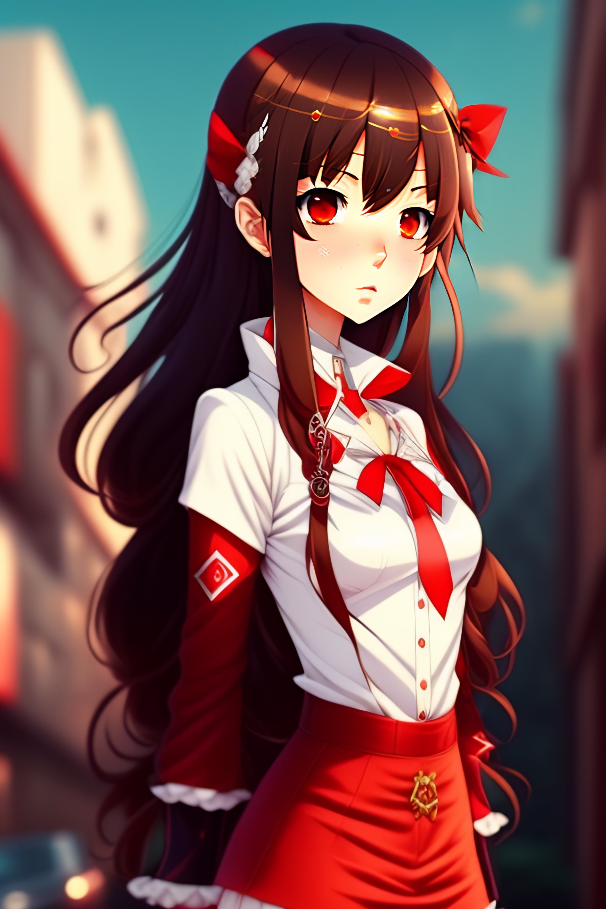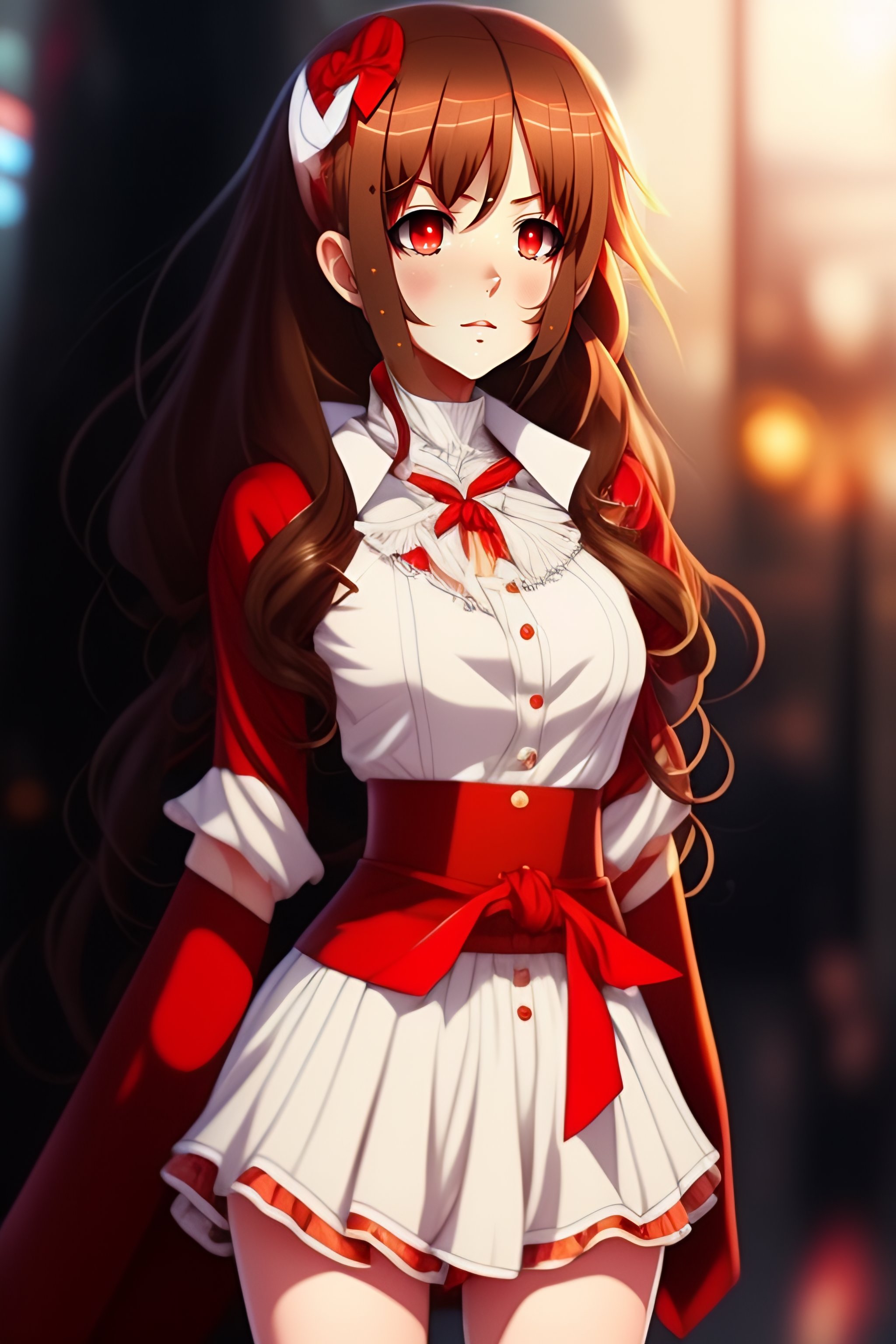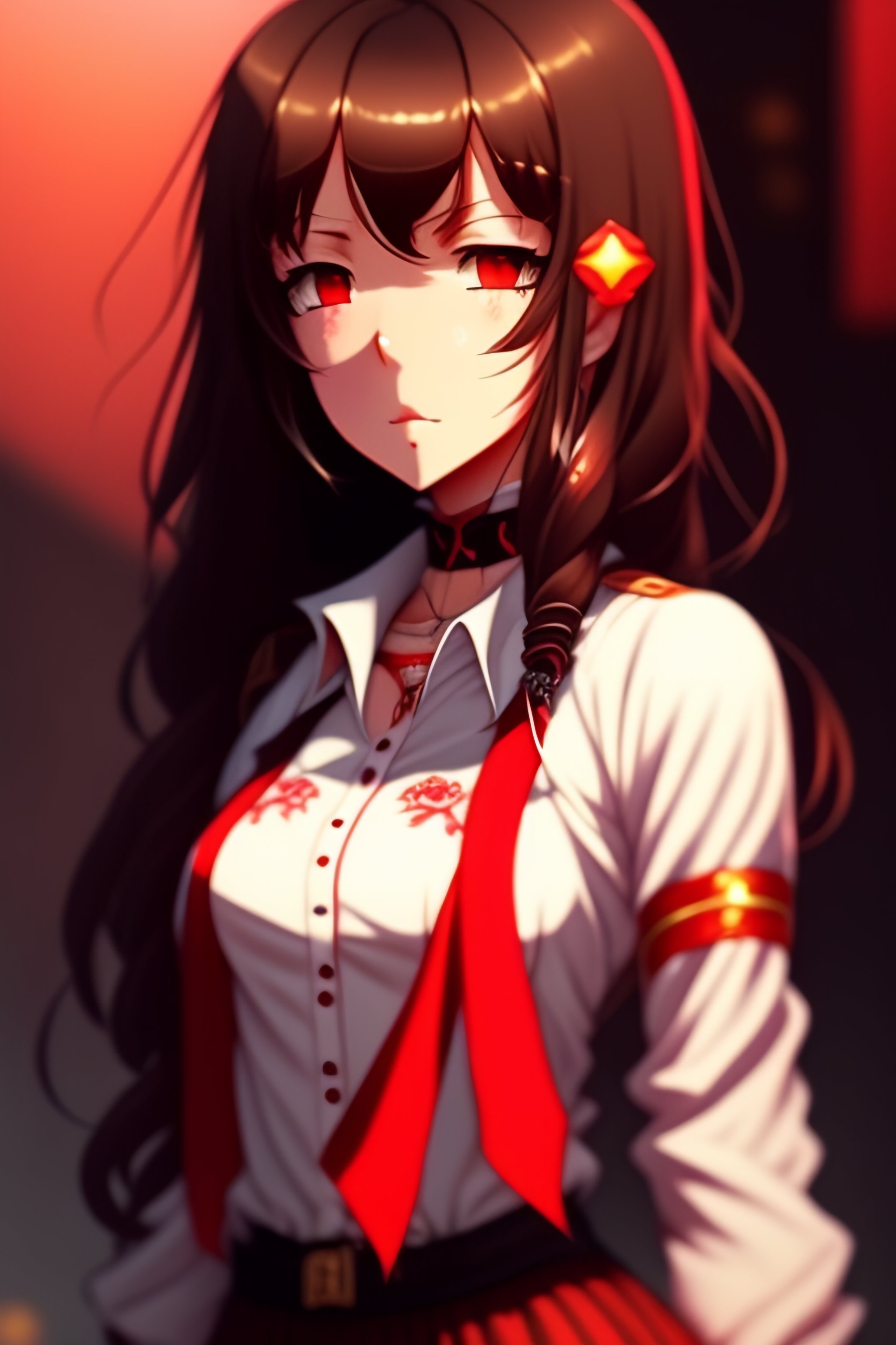 Antagonistic, demonic, anime girl, brown hair, red ribbon, loose white shirt with red accents, short red pants