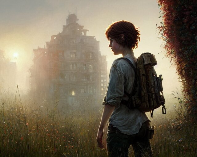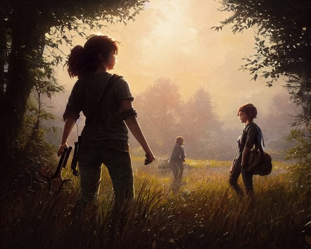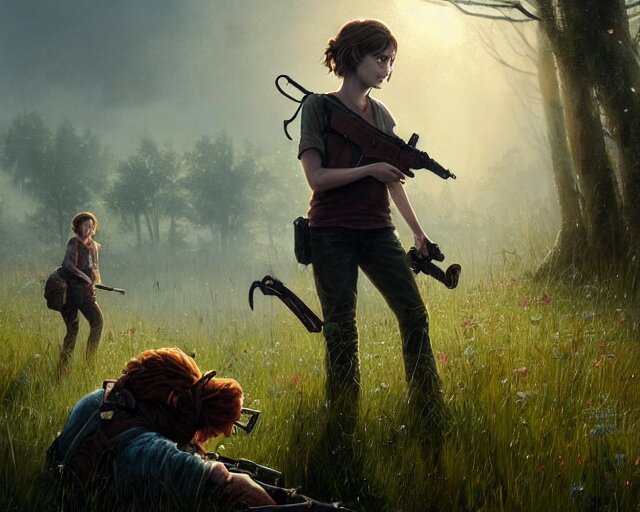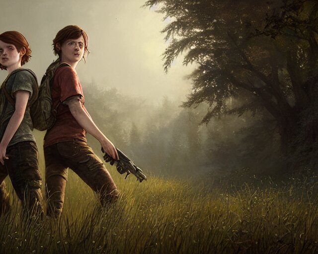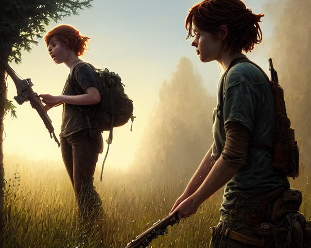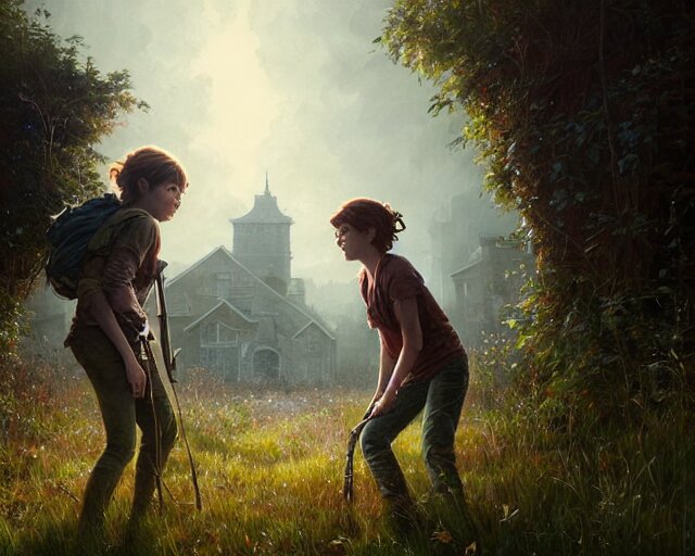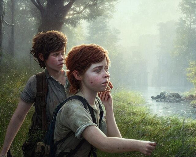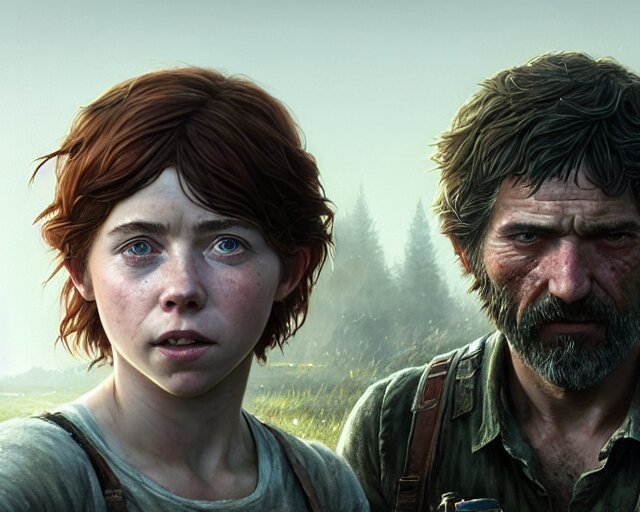 Highly detailed portrait of sophia lillis and jessie buckley, in the last of us, stephen bliss, unreal engine, fantasy art by greg rutkowski, loish, rhads, ferdinand knab, makoto shinkai and lois van baarle, ilya kuvshinov, rossdraws, tom bagshaw, global illumination, radiant light, detailed and intricate environment