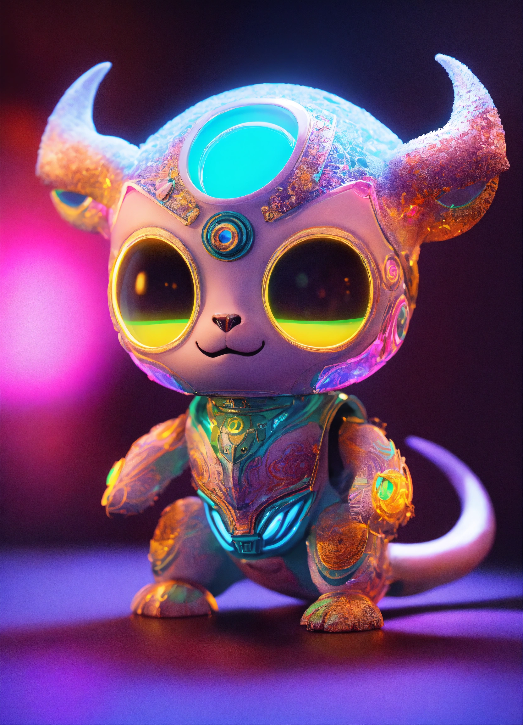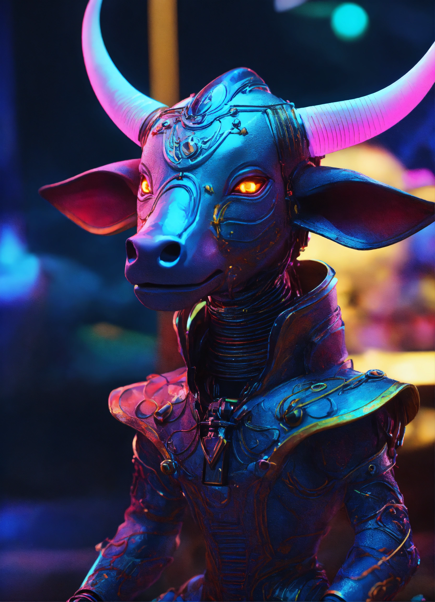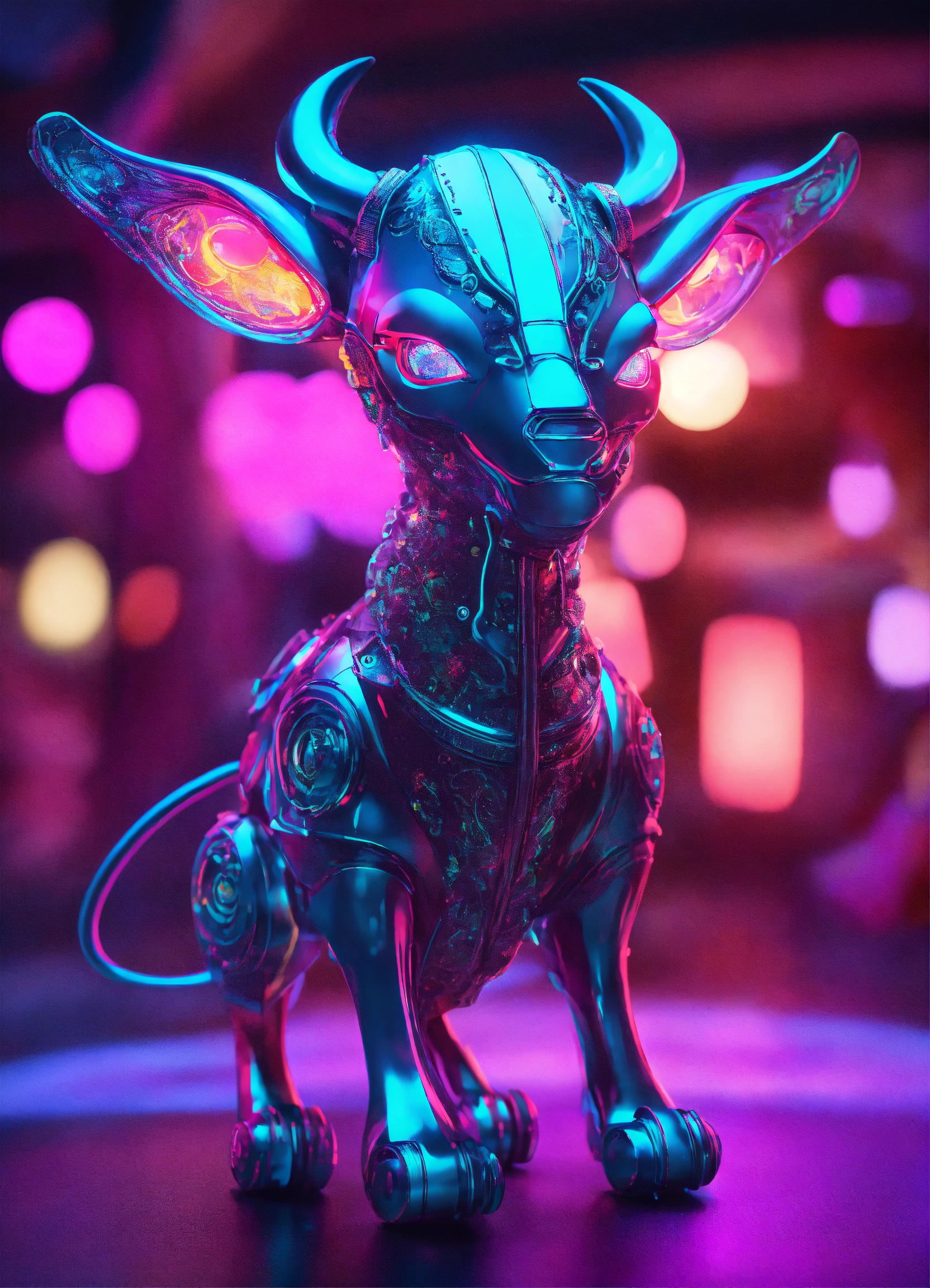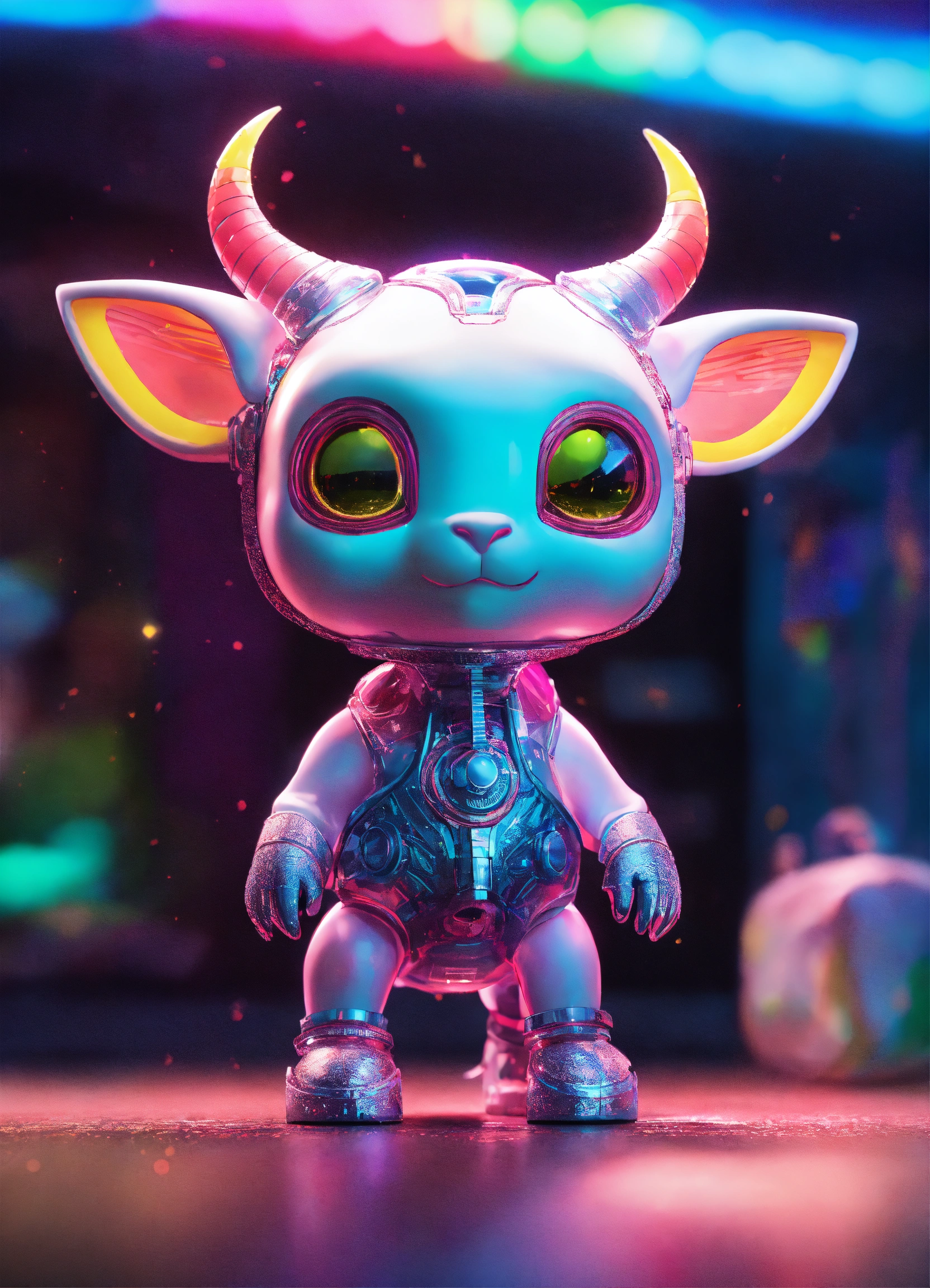 Gelly cute adorable alien bull with moon, full-body, neon glow colours, highly intricate details, 3d, cgi, realistic light, trending on cgsociety, glowing eyes, facing camera, neon details, ultra realistic details, portrait, sci fi atmosphere, global illumination, shadows, octane render, 8 k, ultra sharp, cat attributes, friendly, glass like, white, symmetric, kind, bring some beatiful colours