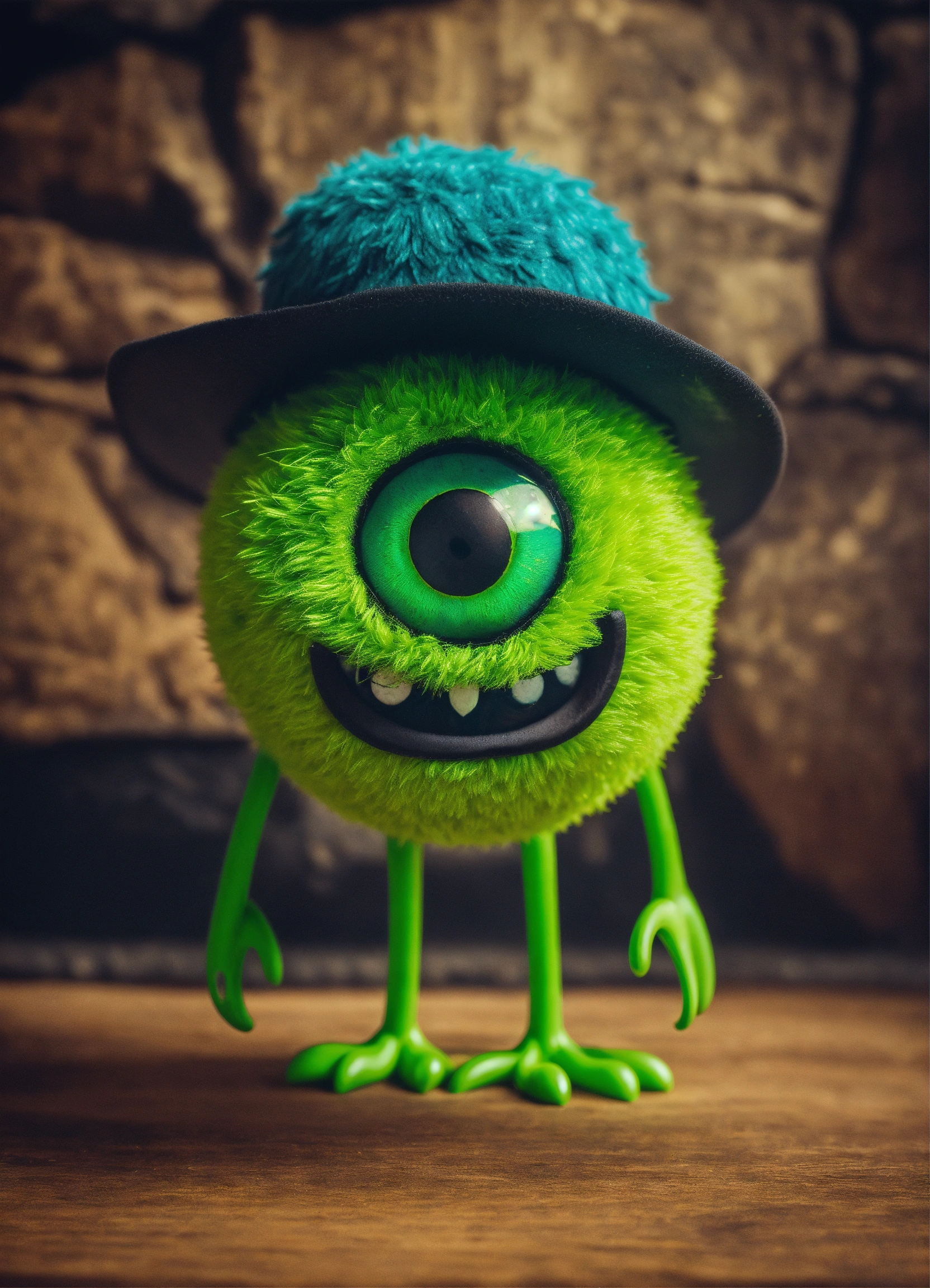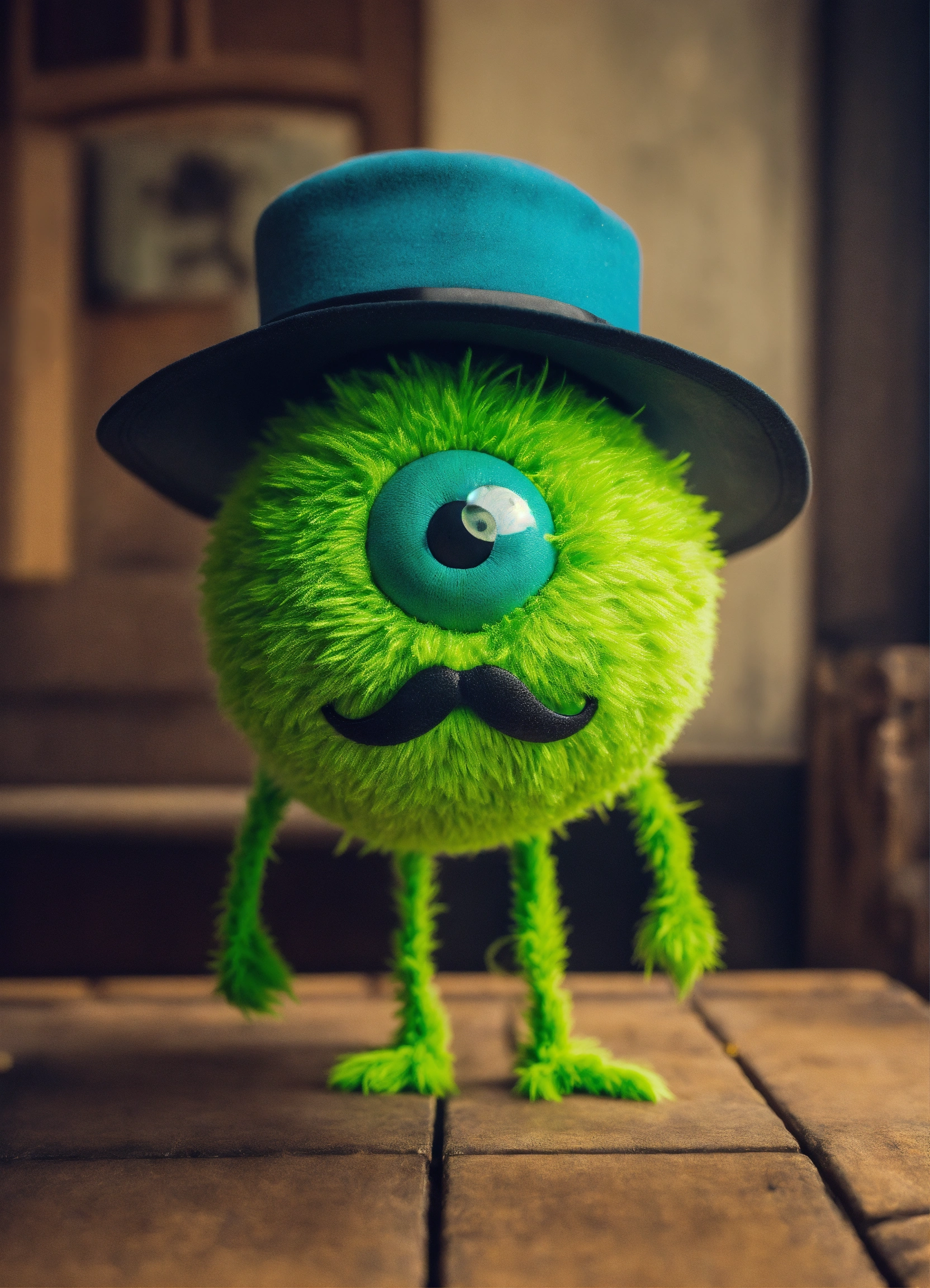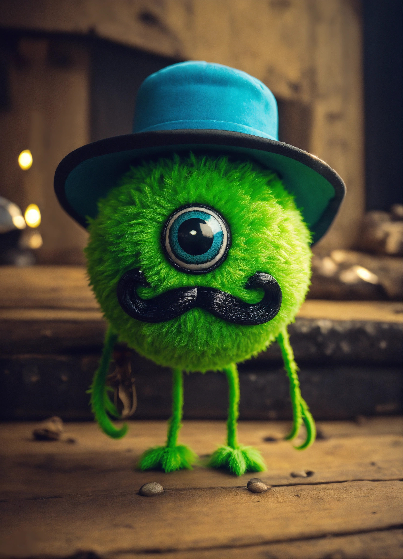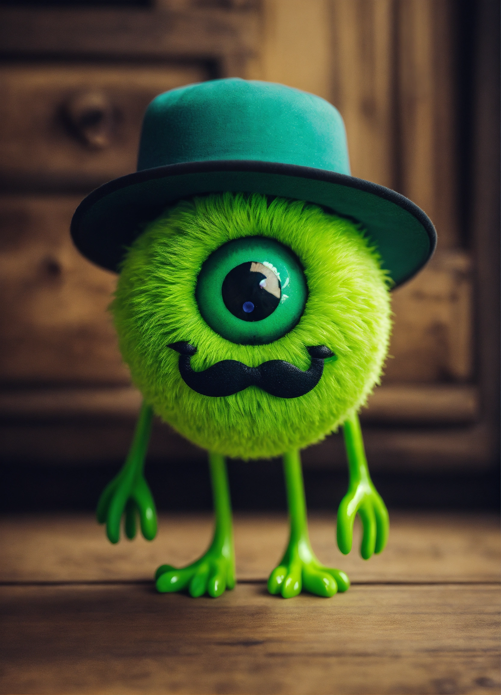A cute green ball monster with one eye, a black mustache and a black hat and only one eye. it has only one blue eye.