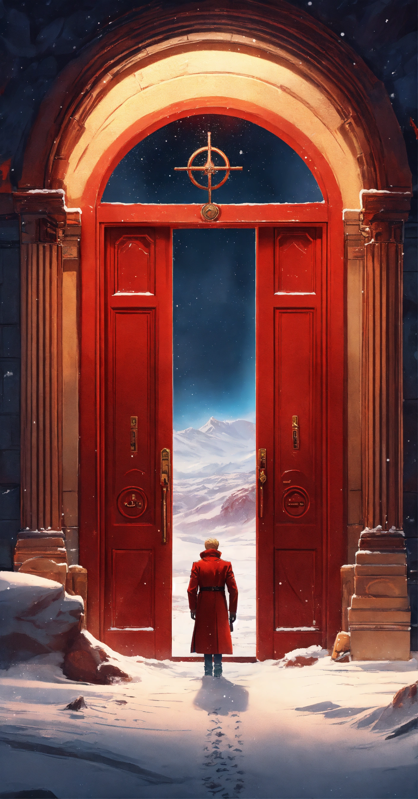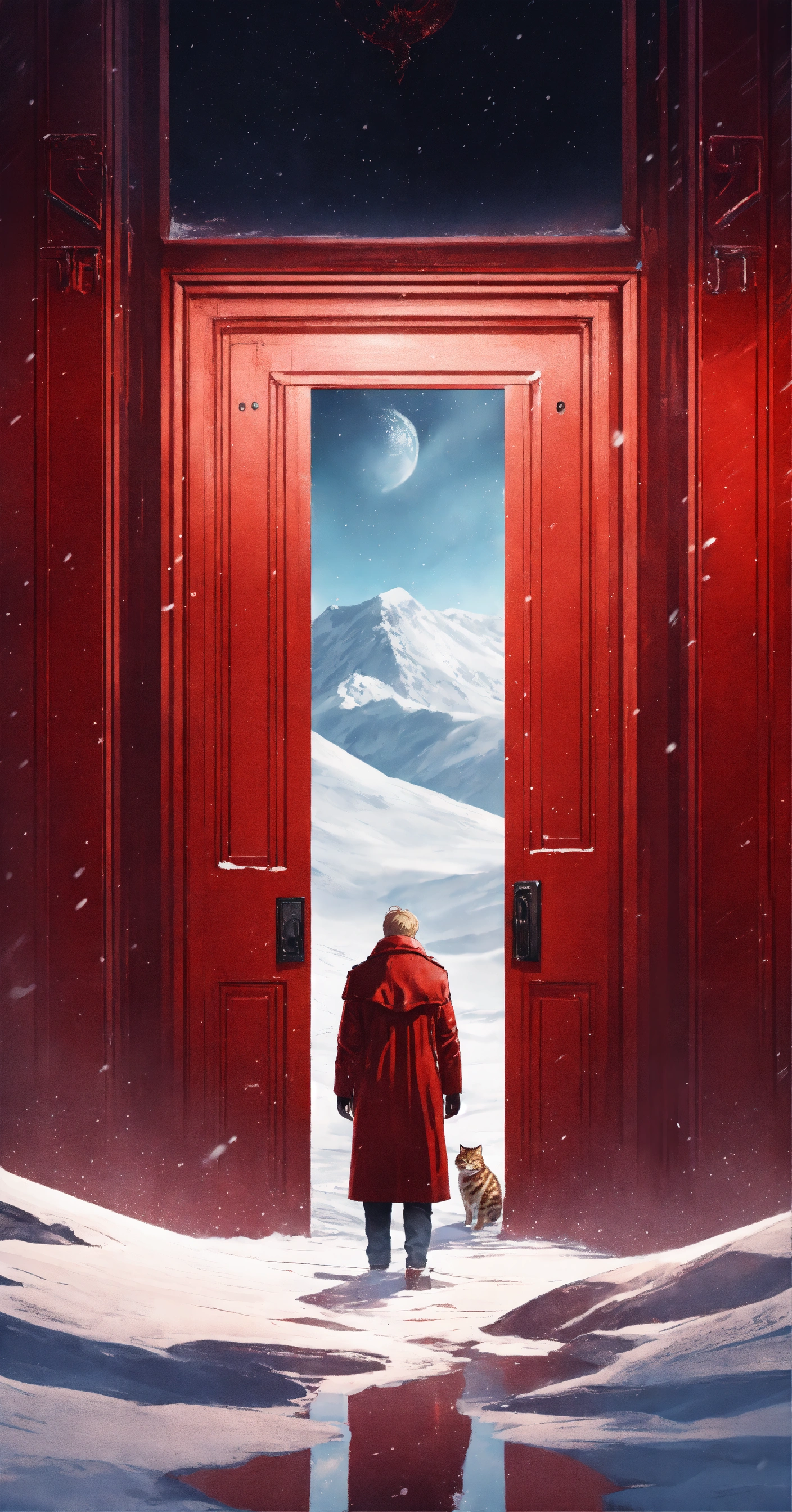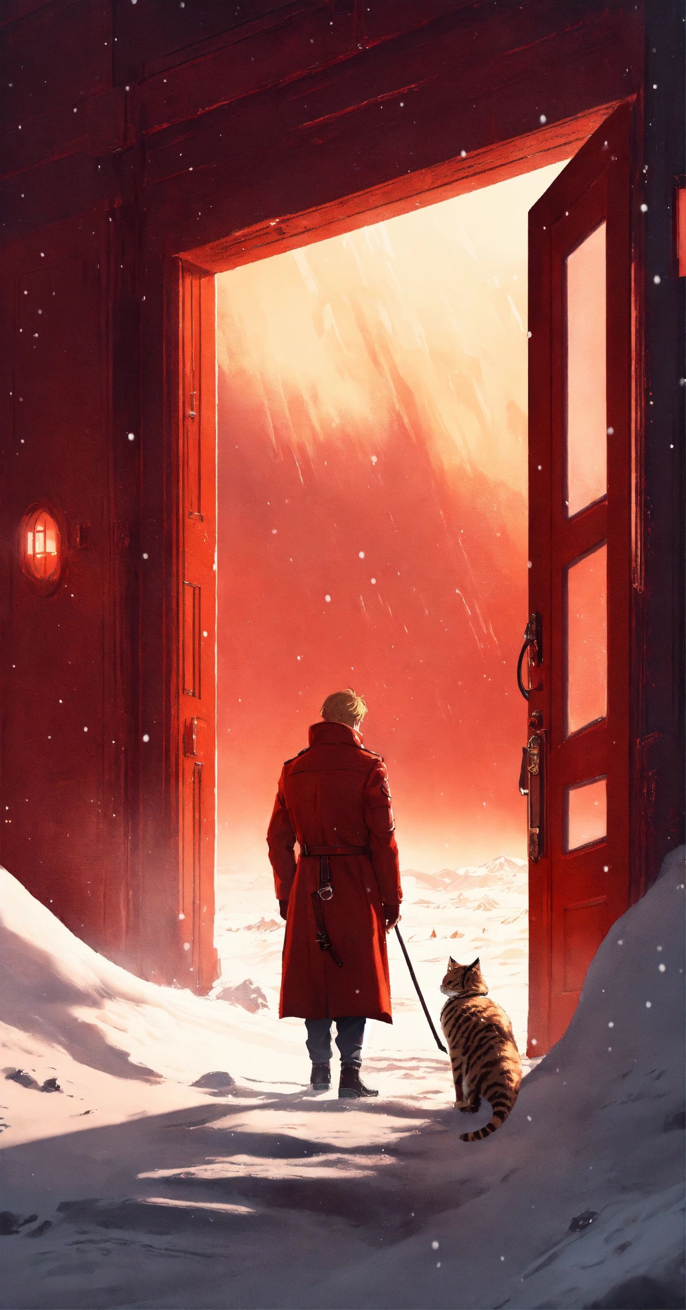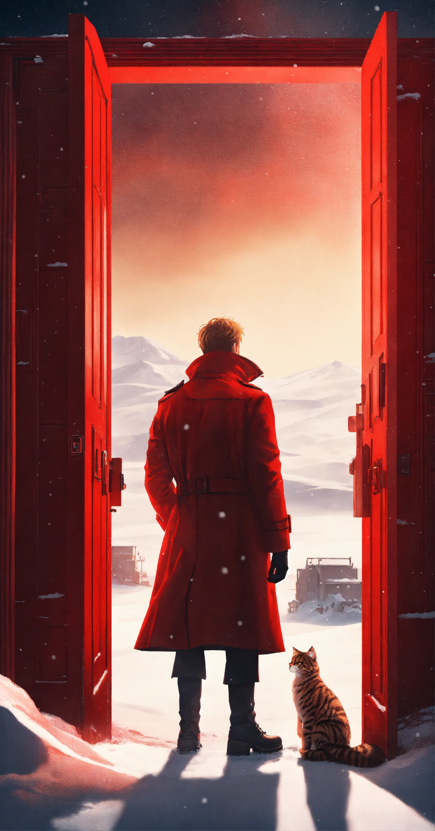 Red door in the middle of a snow desert with blonde man in trenchcoat and siberian cat, universe behind the door, average plan, frostpunk, retrowave