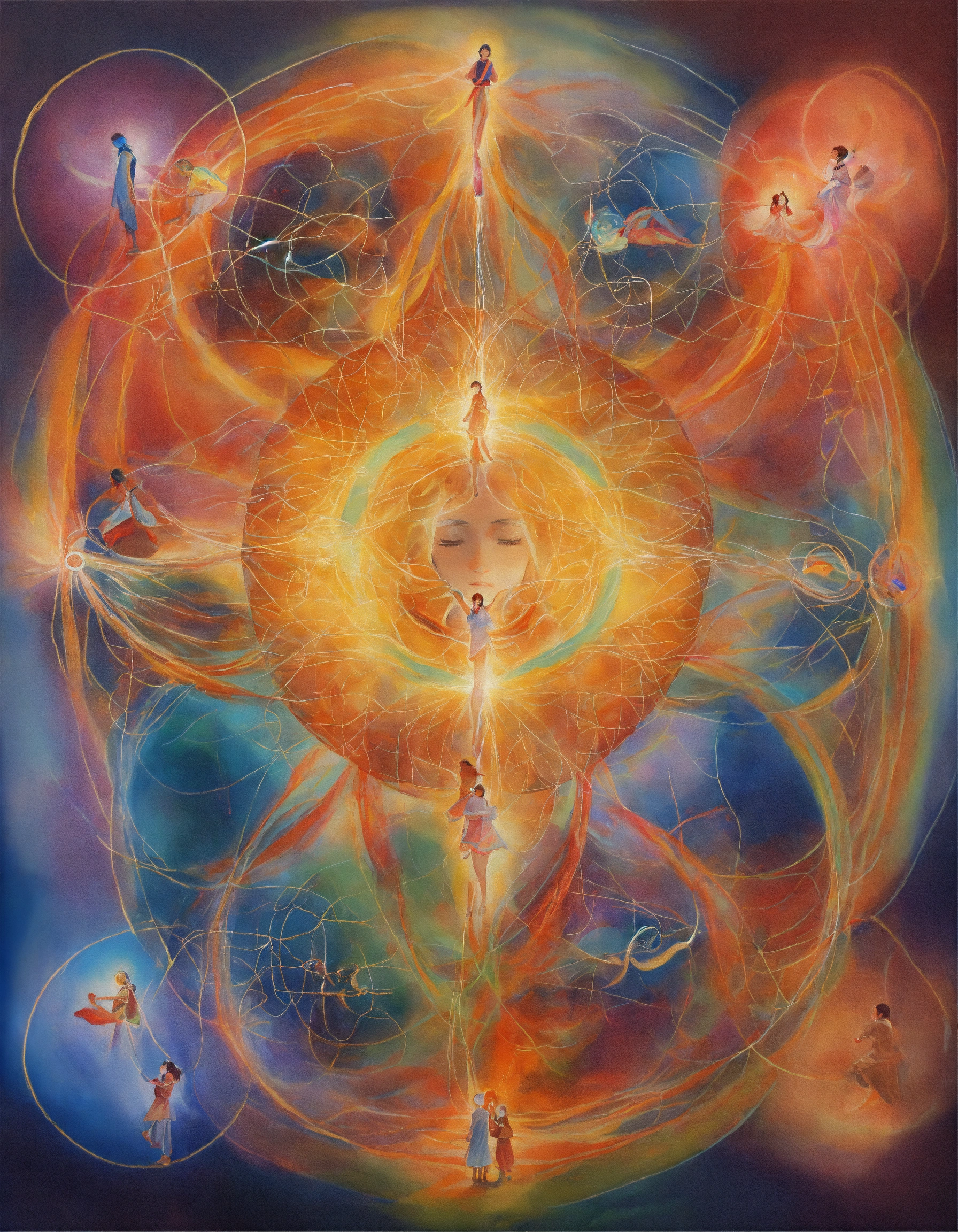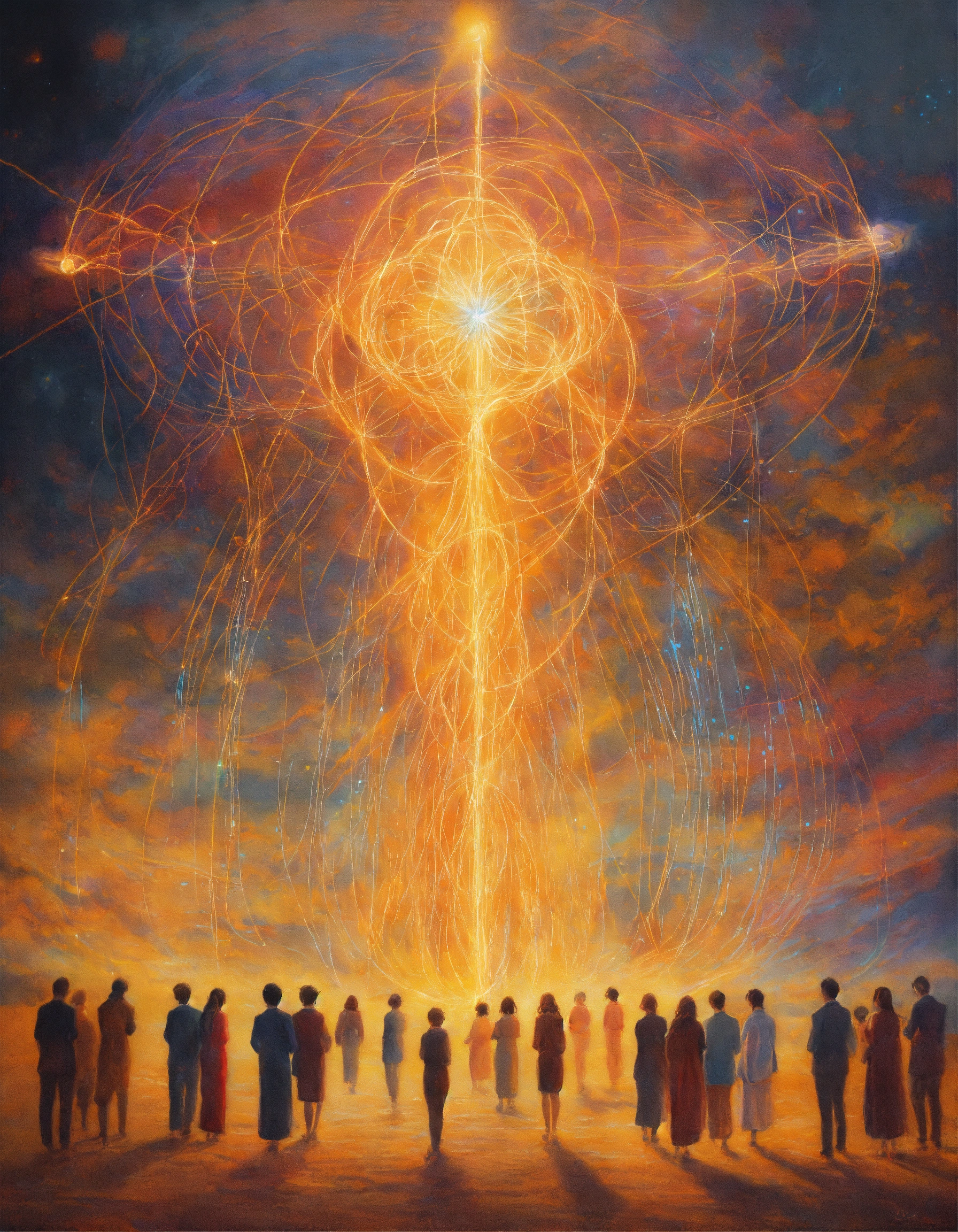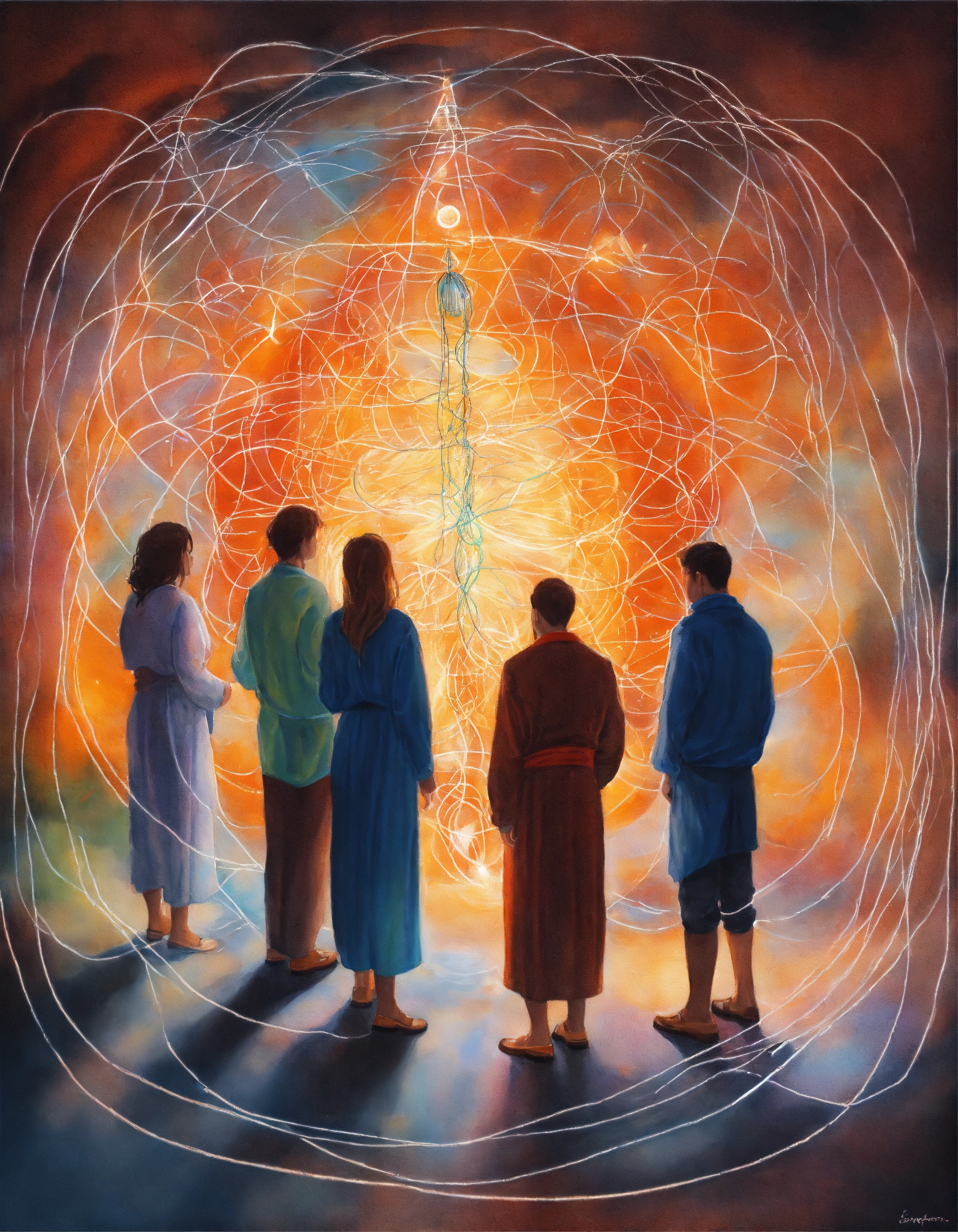 Drawing painting of a system of spiritual energetic entanglement, 8 people connected to each other by spiritual threads of light, everbody is sad, spiritual art