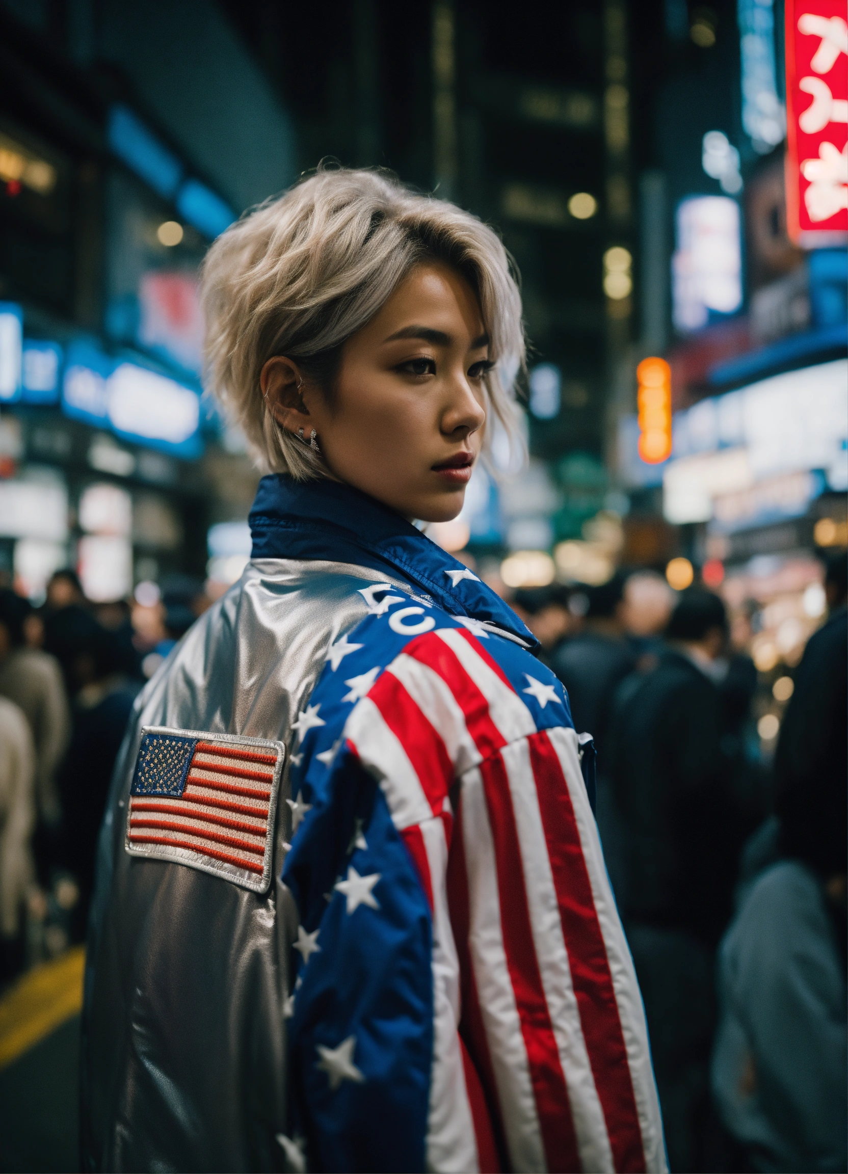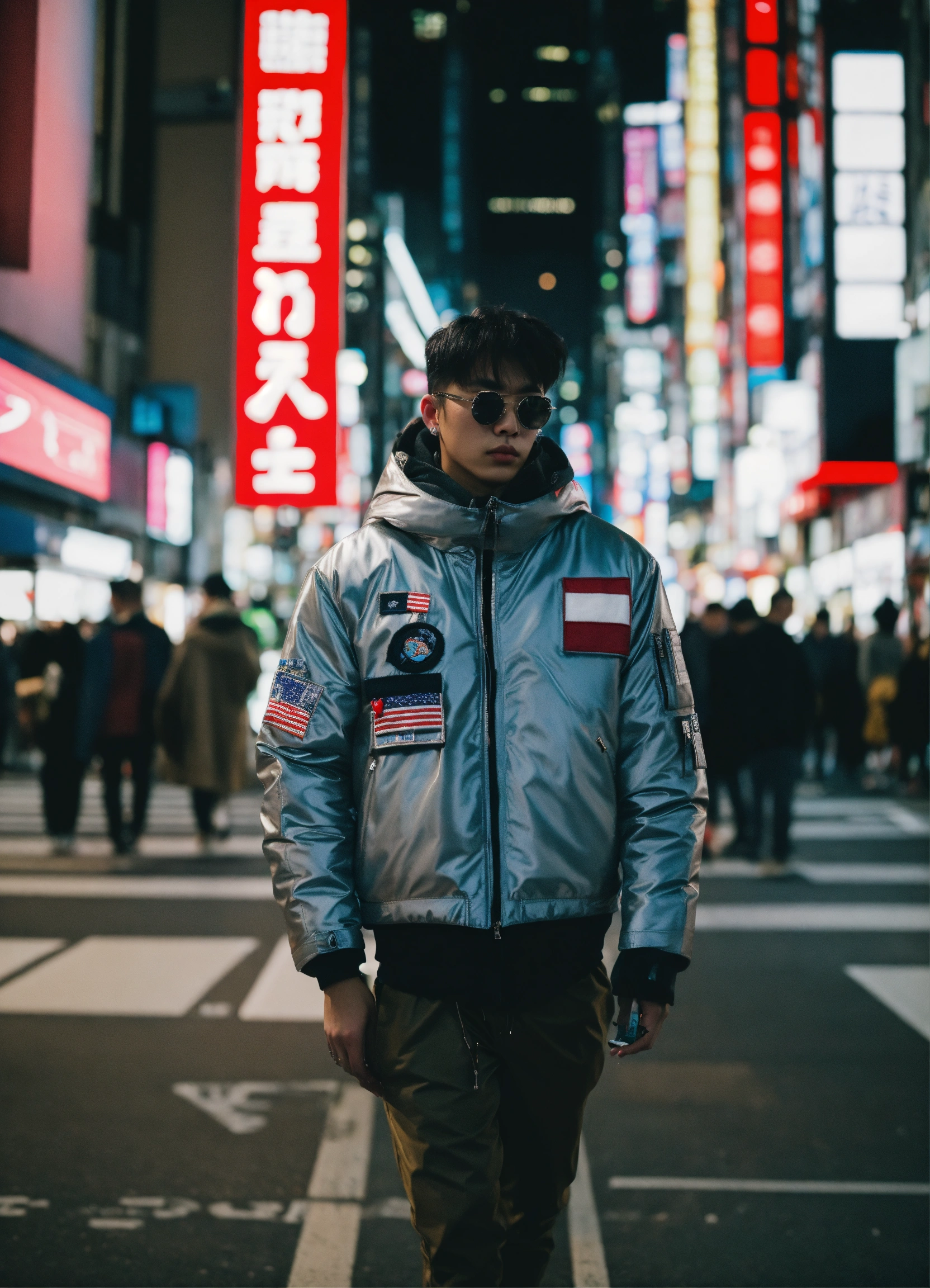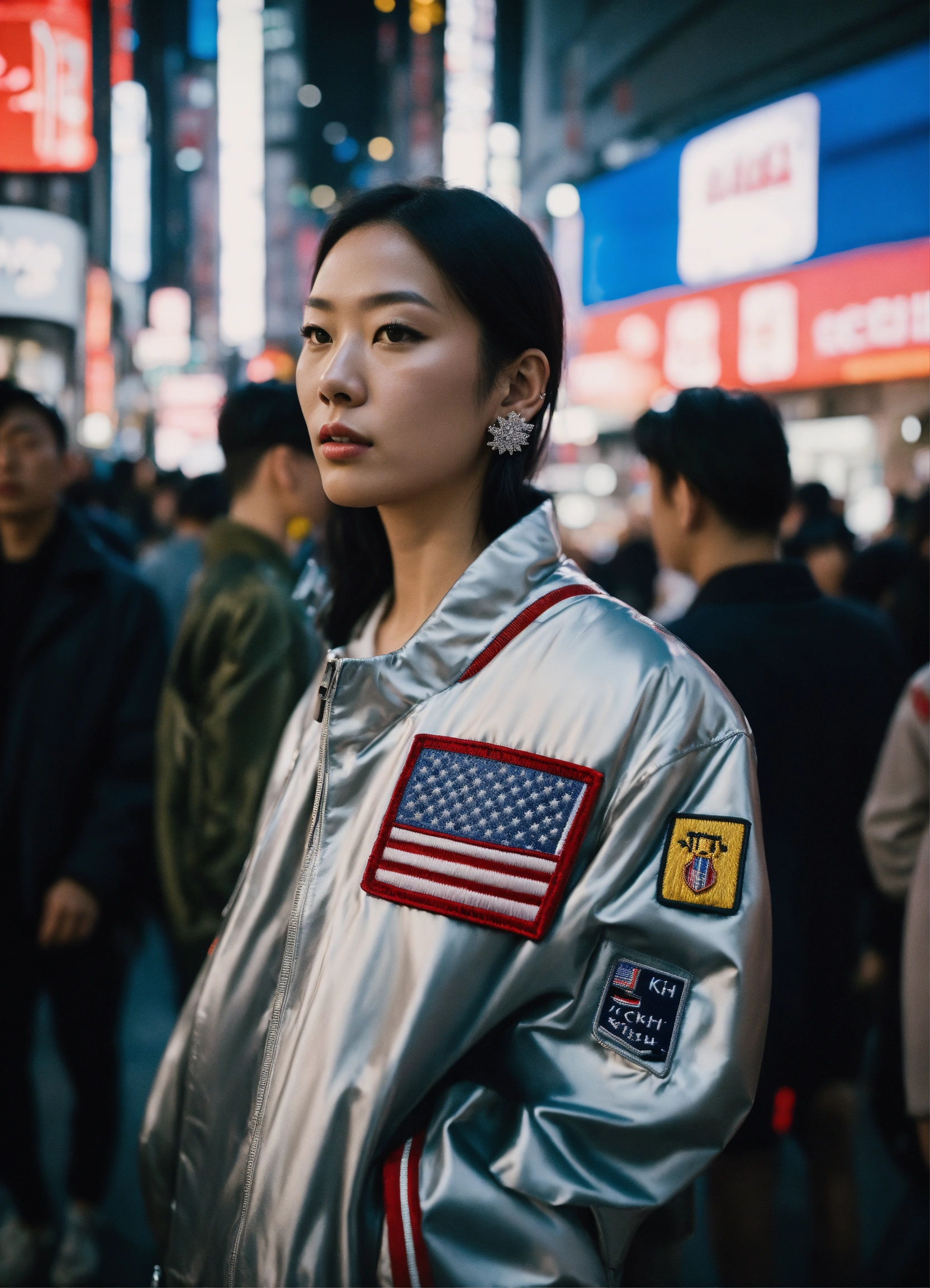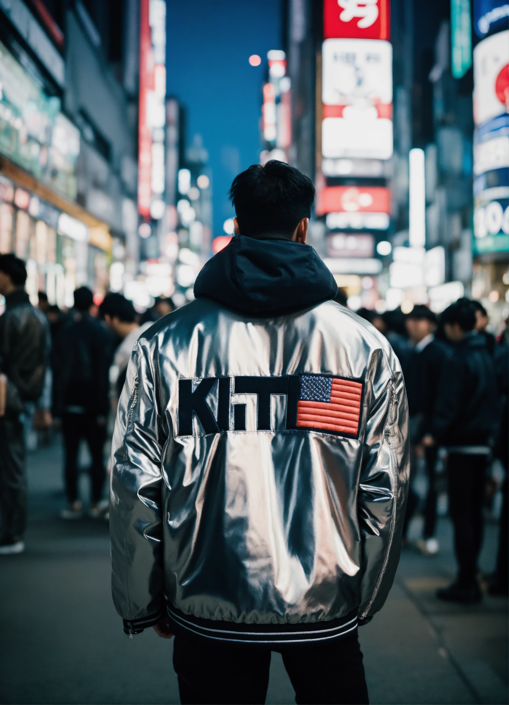 Silver kith jacket, american flag patch, futurist, shot in tokyo at night, shot on leica, fashion portrait, by kith, lots of people in the background. crowded photo, motion blur