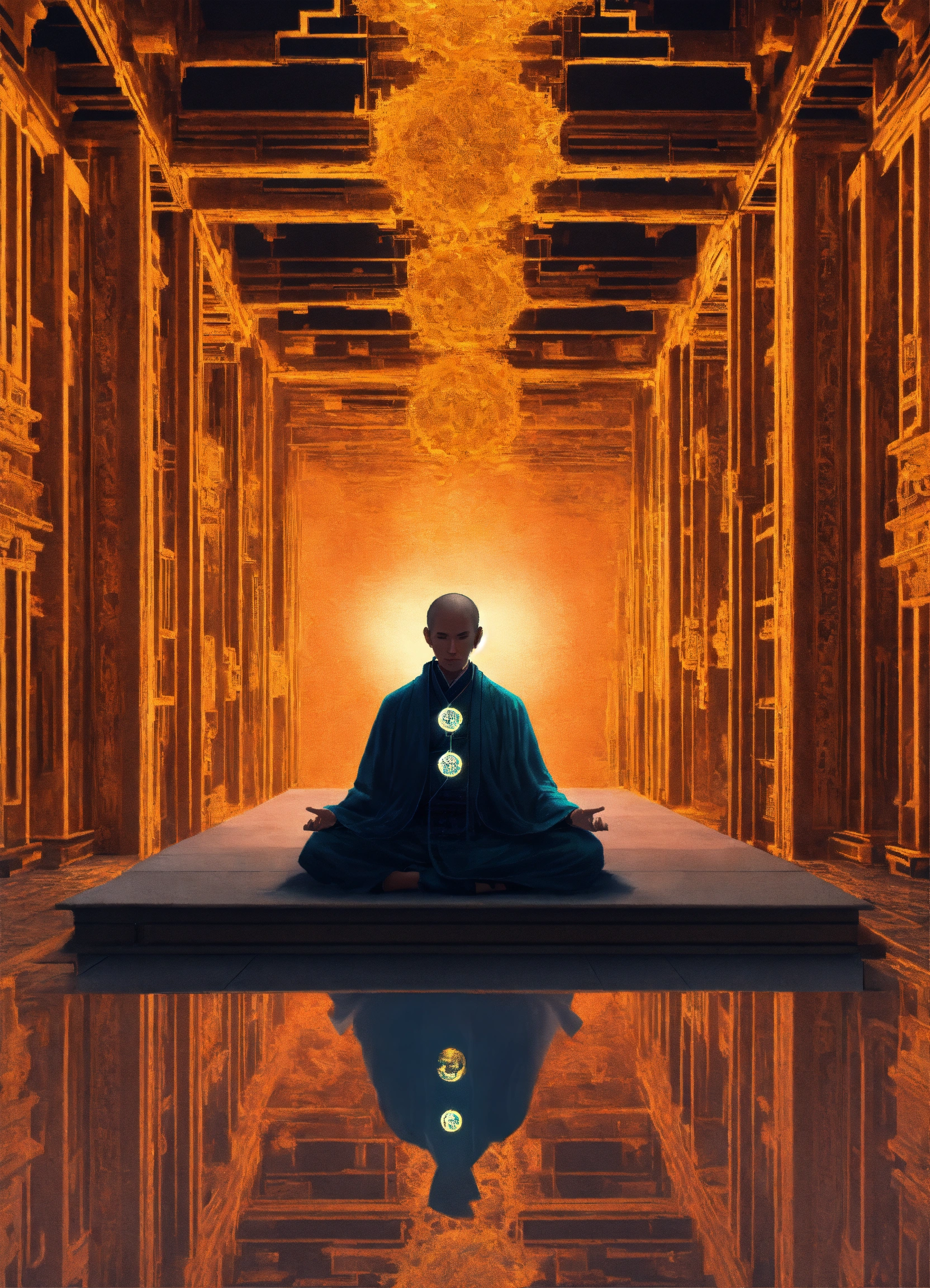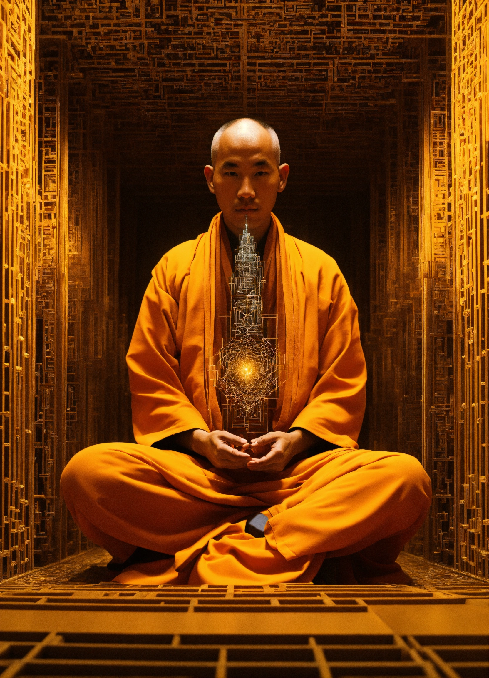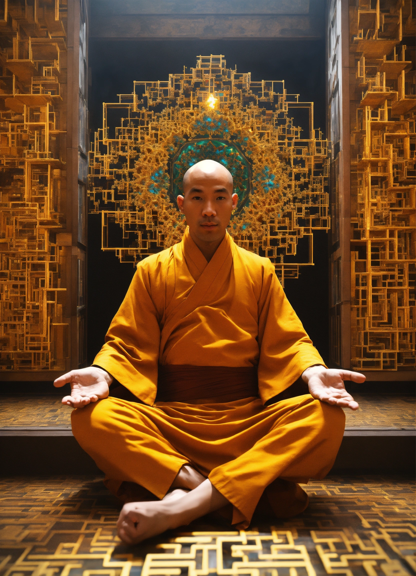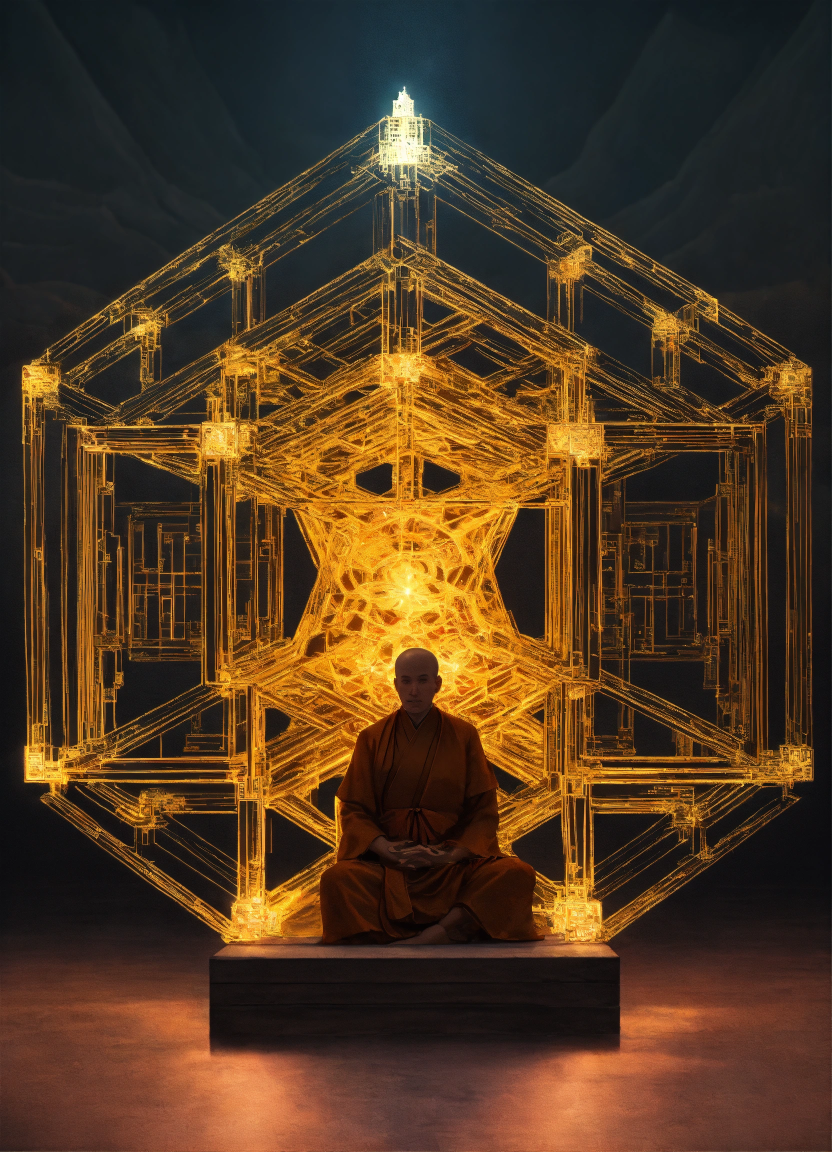 Sitting taoist monk tesseract body fractal three point perspective hypercube melting mandelbrot fingers hands