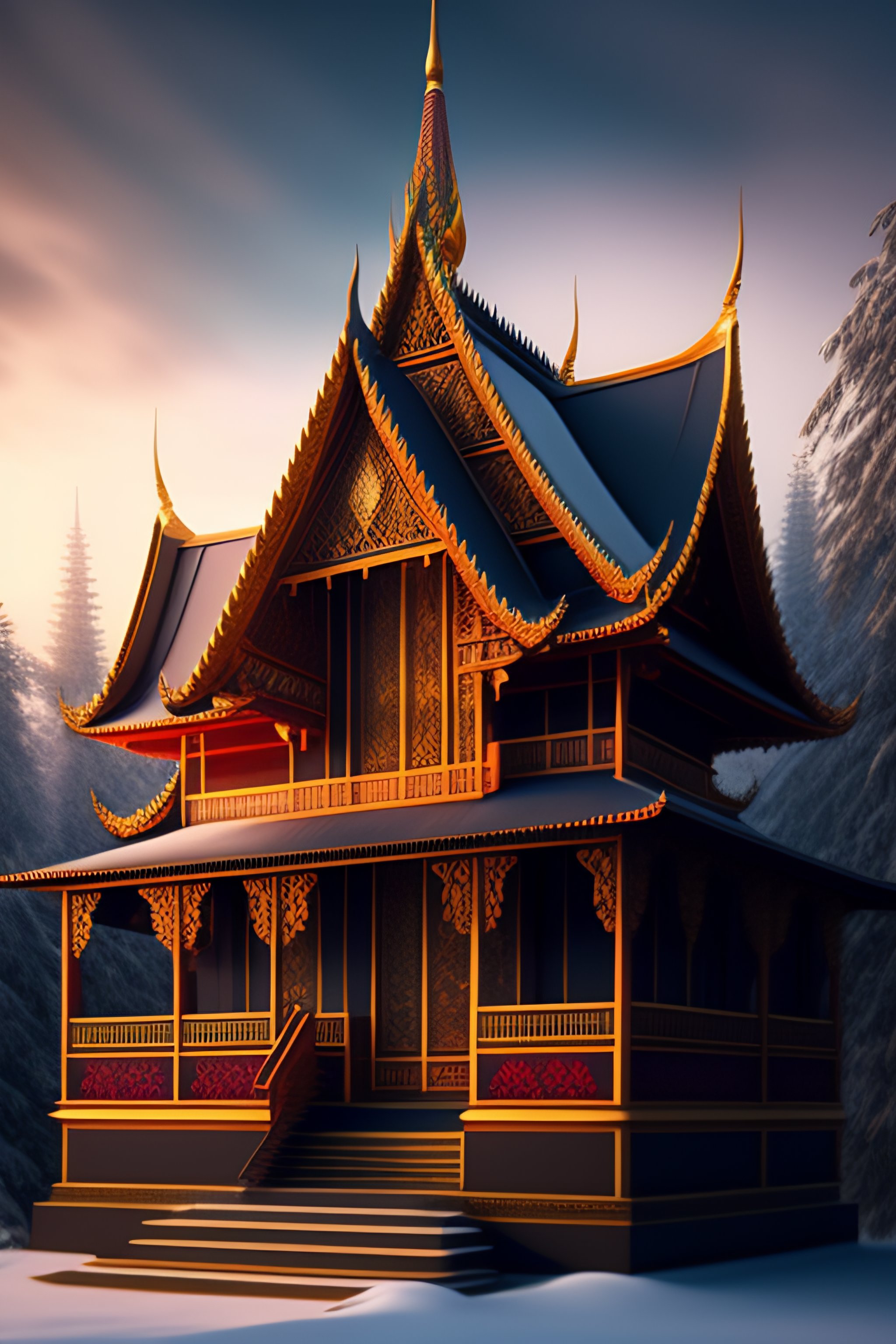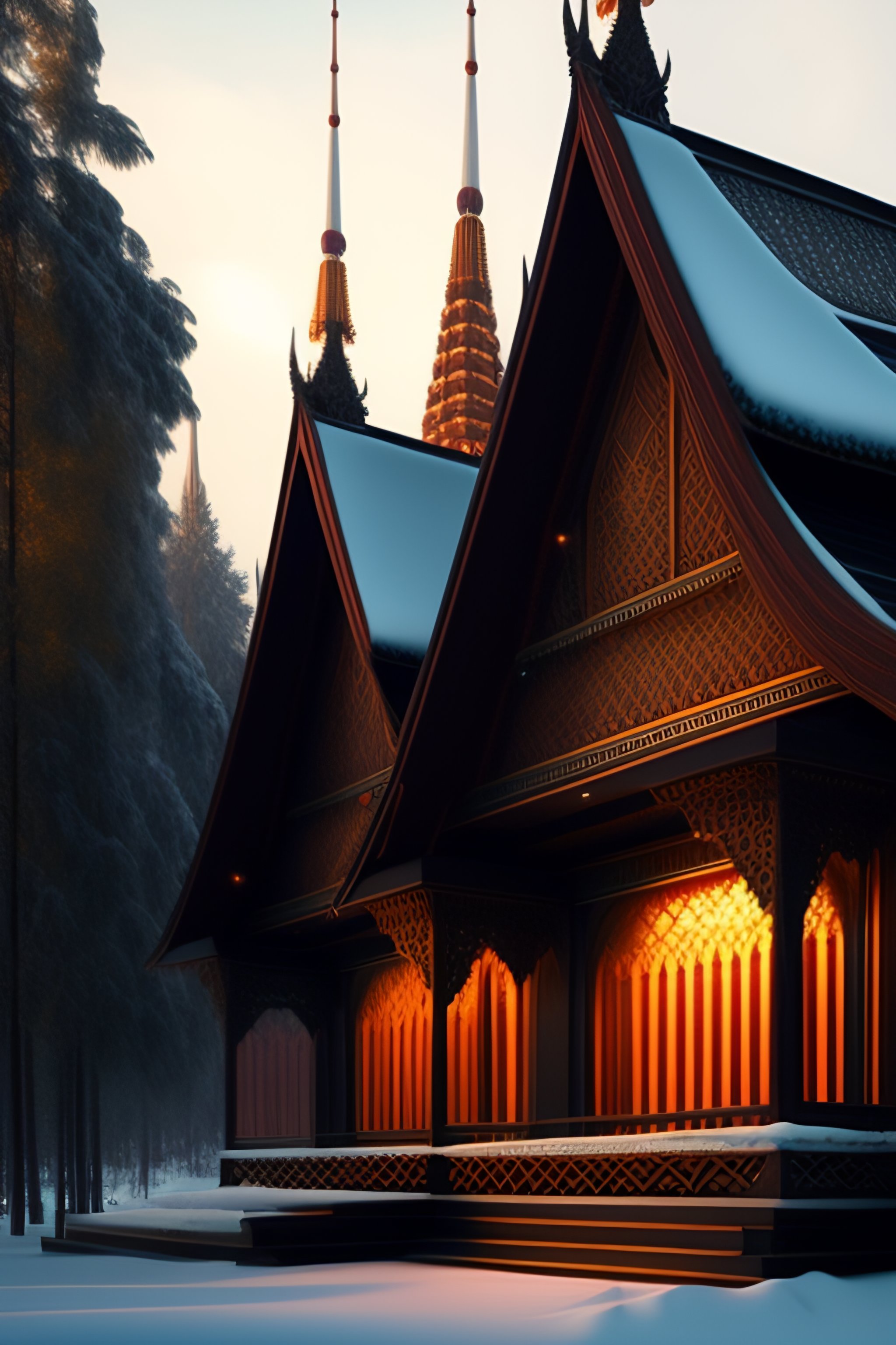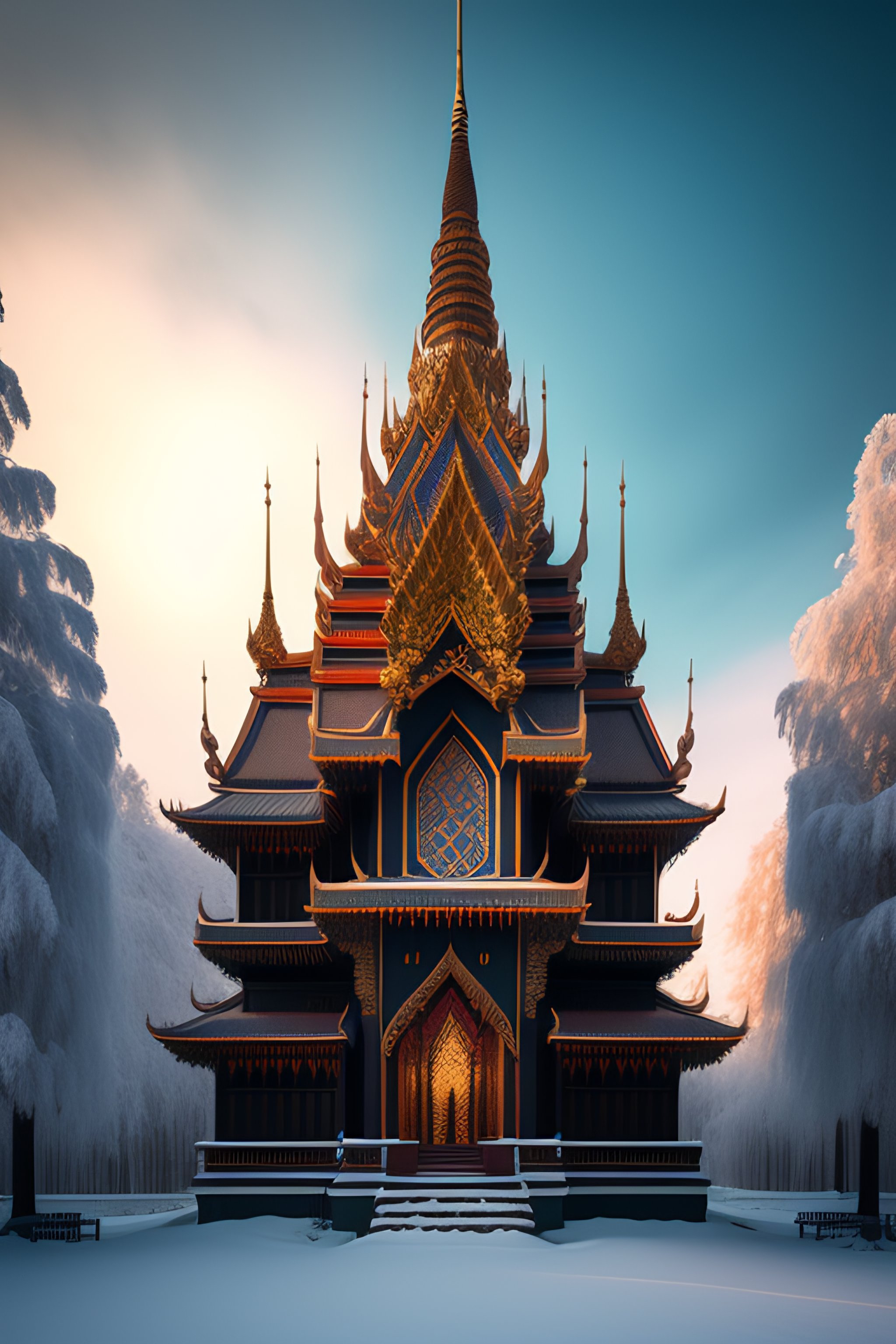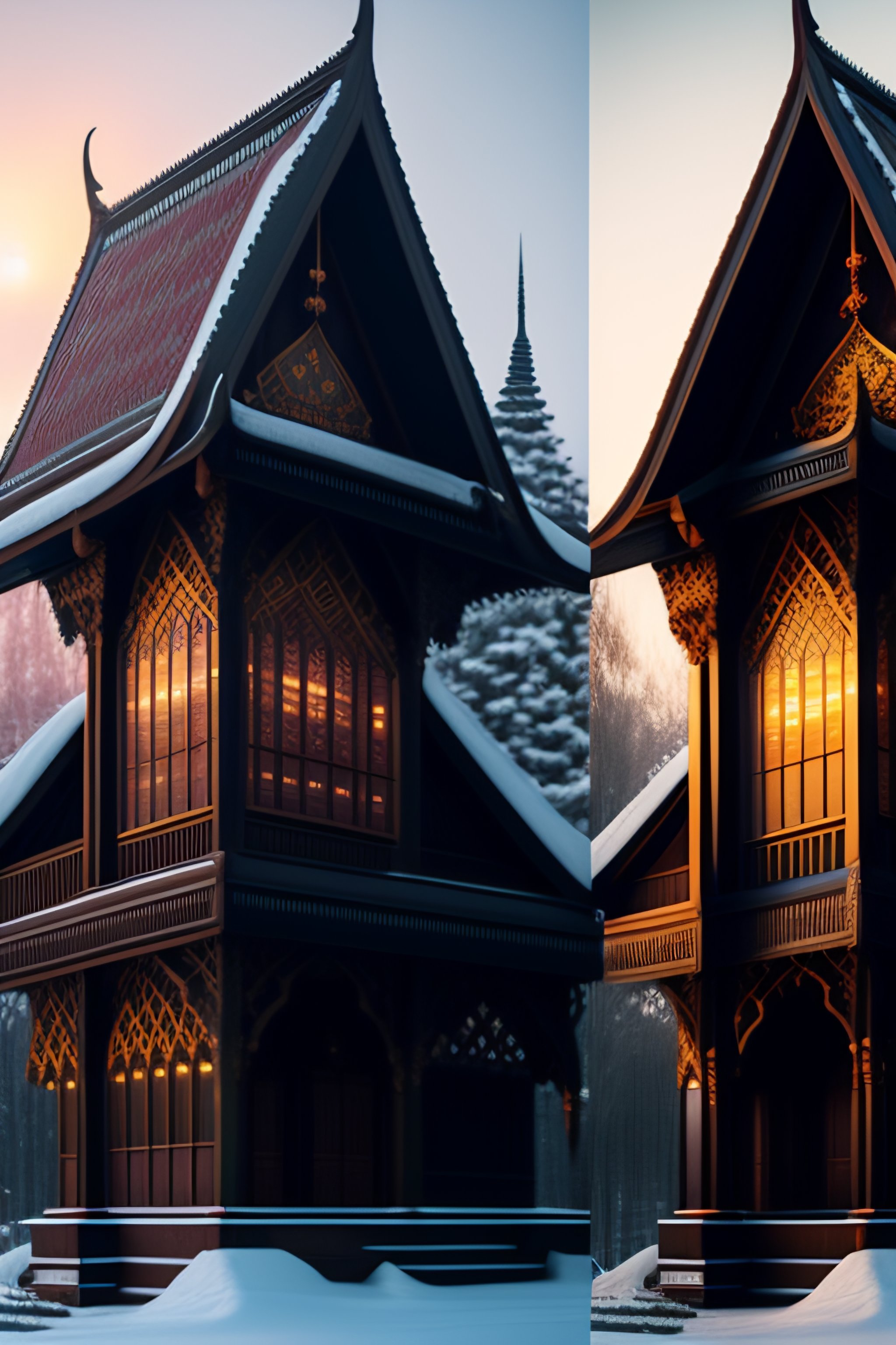Neo gothic revival thai architecture, winter taiga double exposure by marc simonetti, natural volumetric lighting, realistic 4k octane beautifully detailed render, 4k post-processing, architecture, buildings, extreme long shot, extreme wide shot, autochrome, black paper