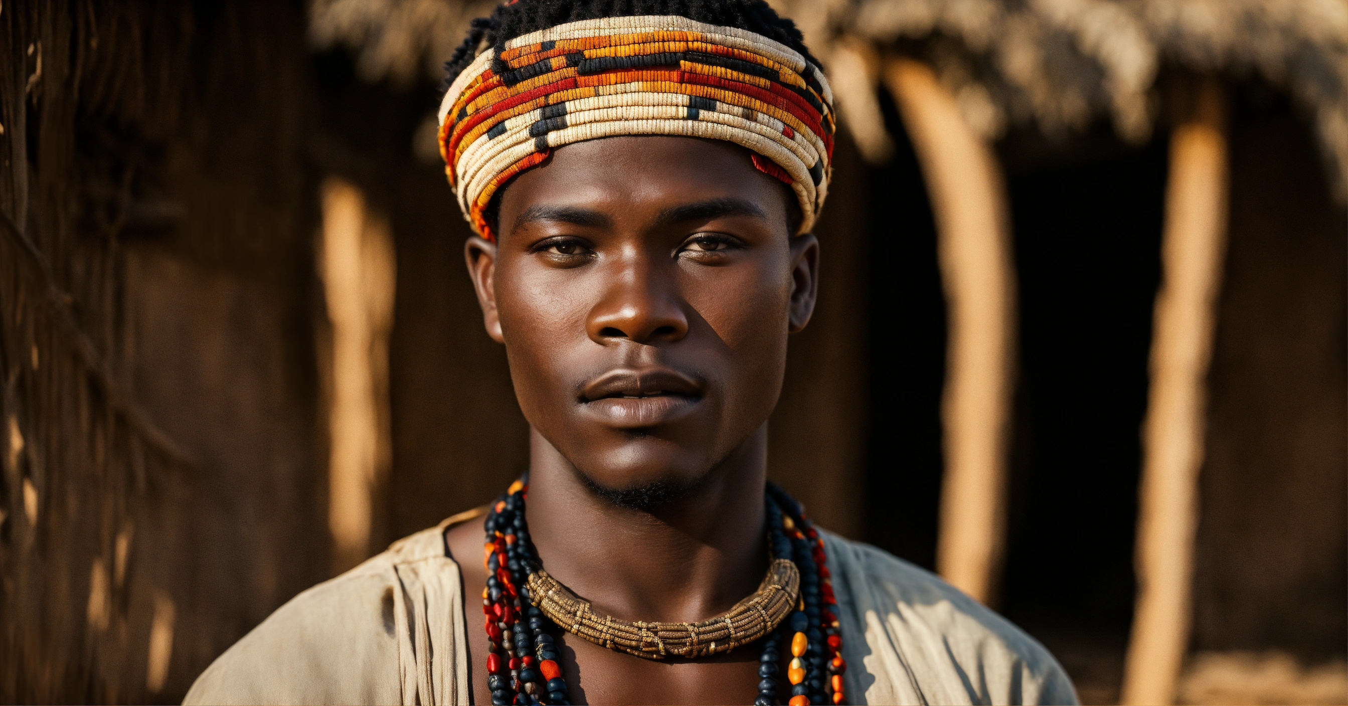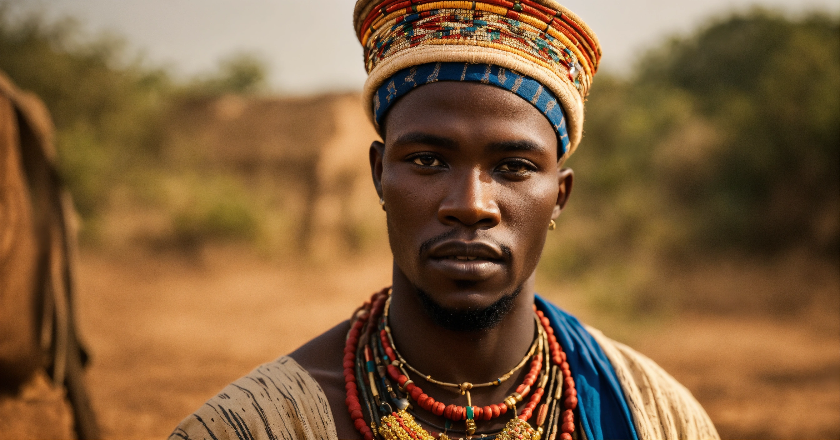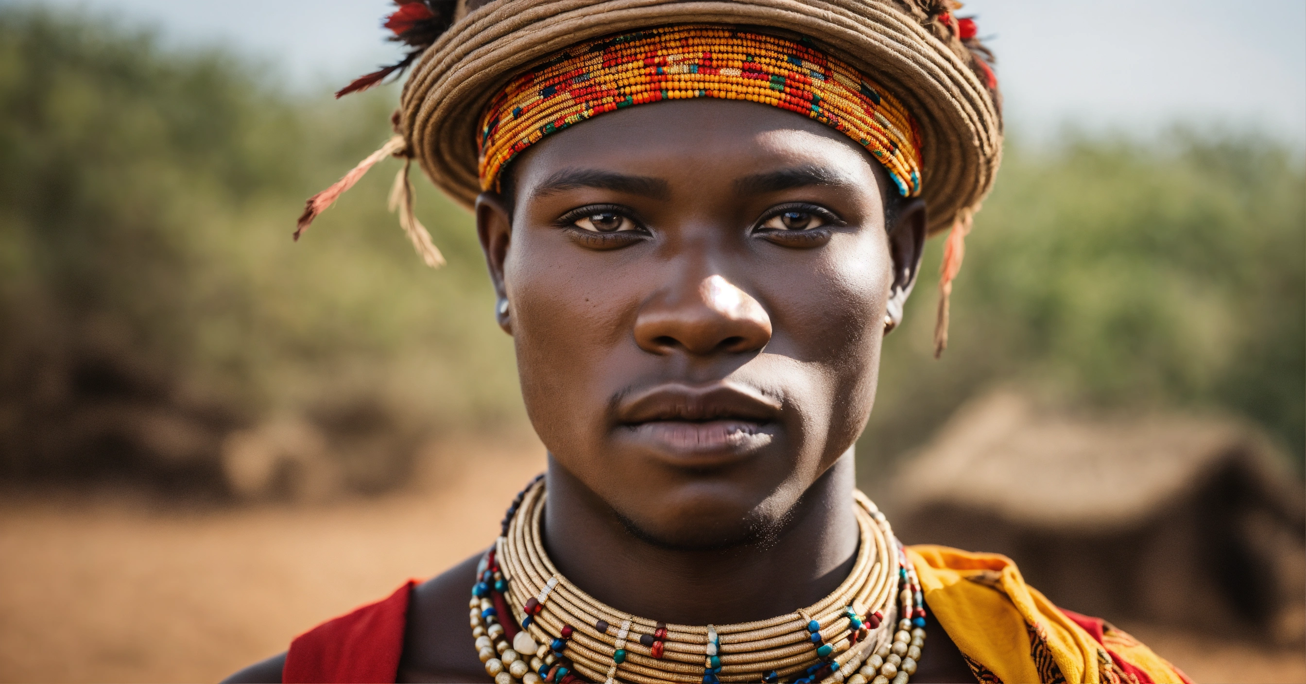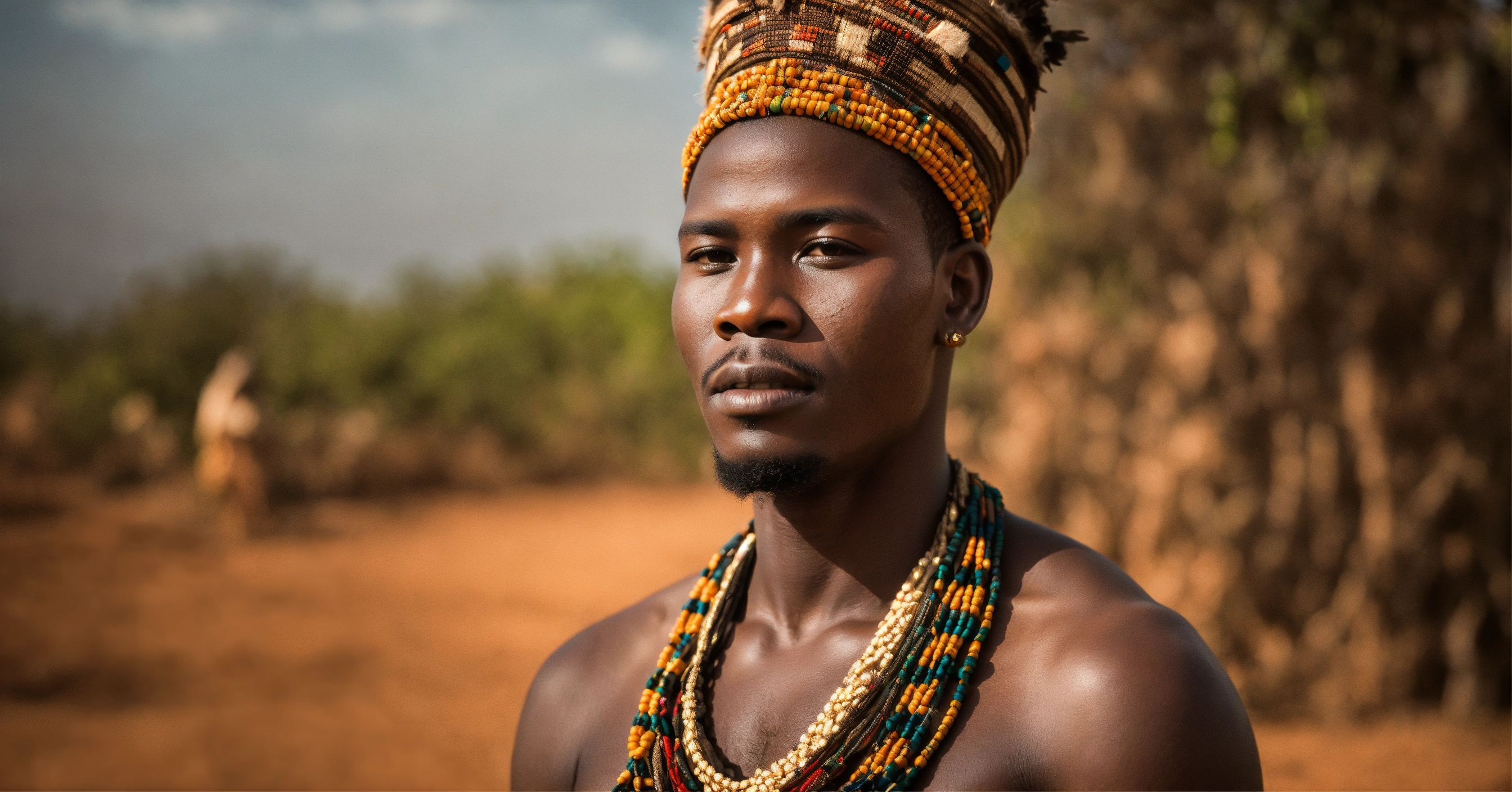 Portrait of a confident male native african in a village wearing traditional make-up, photography, epic realist, natural light, soft smooth light, photograpgy, award winning photo