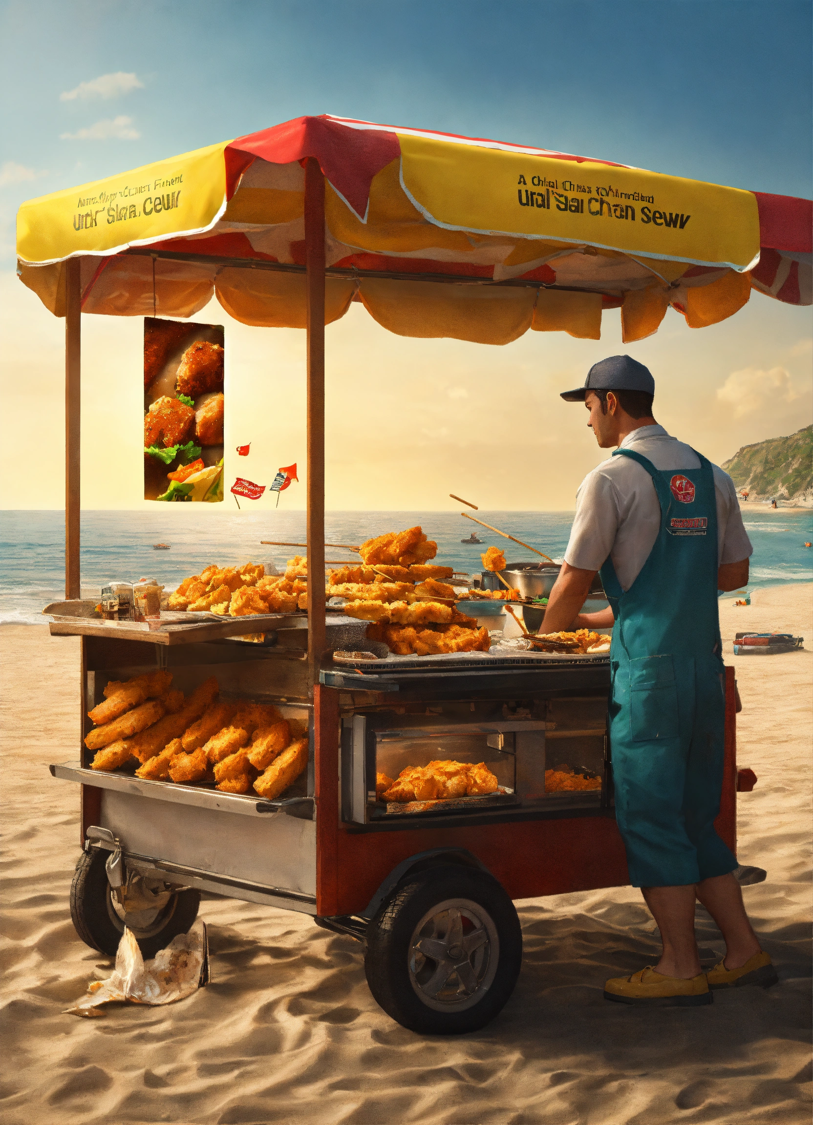 "a mechanic selling breaded chicken skewers on the beach, ultra-realistic images, high-definition 4k, photorealistic."