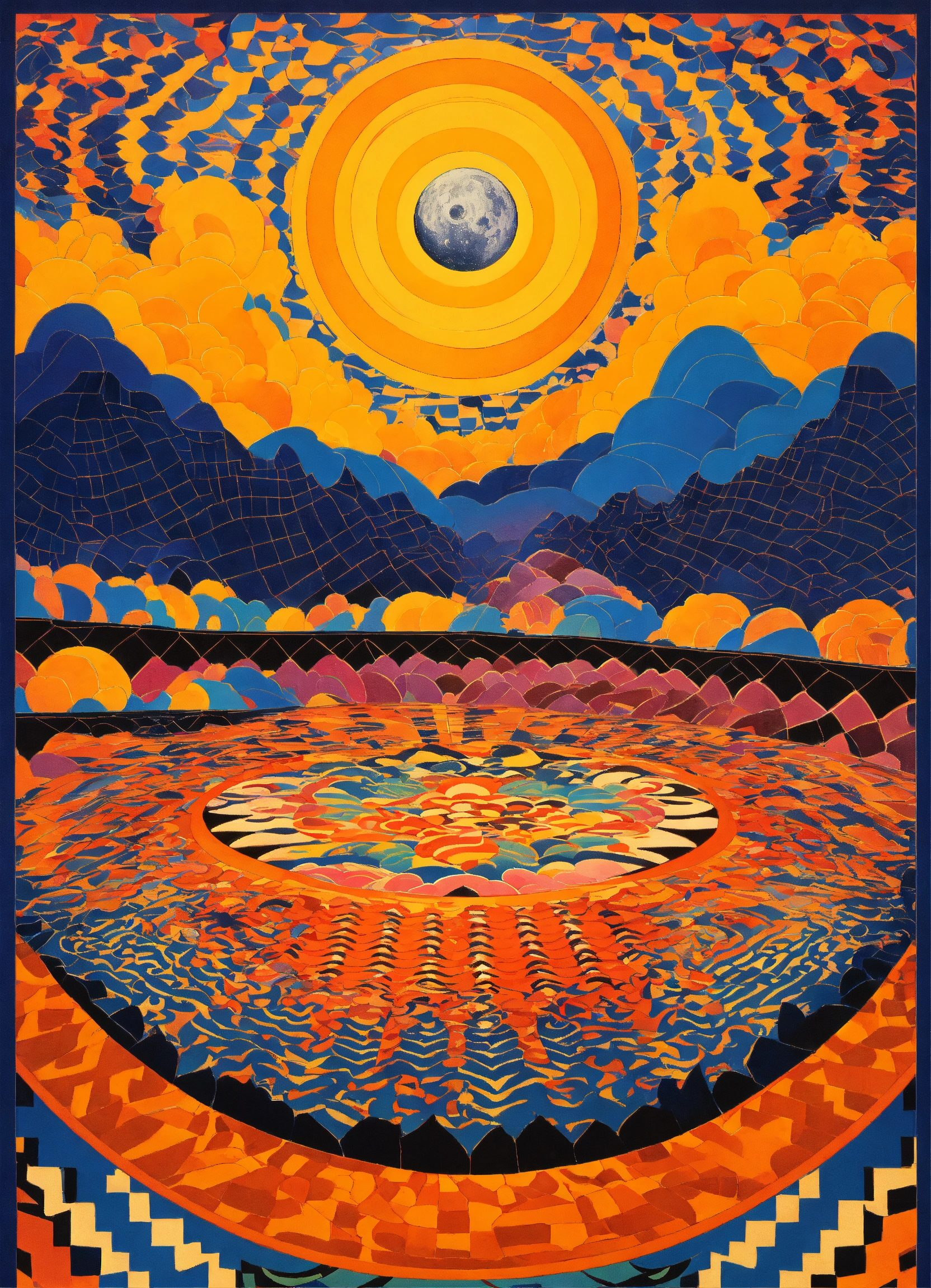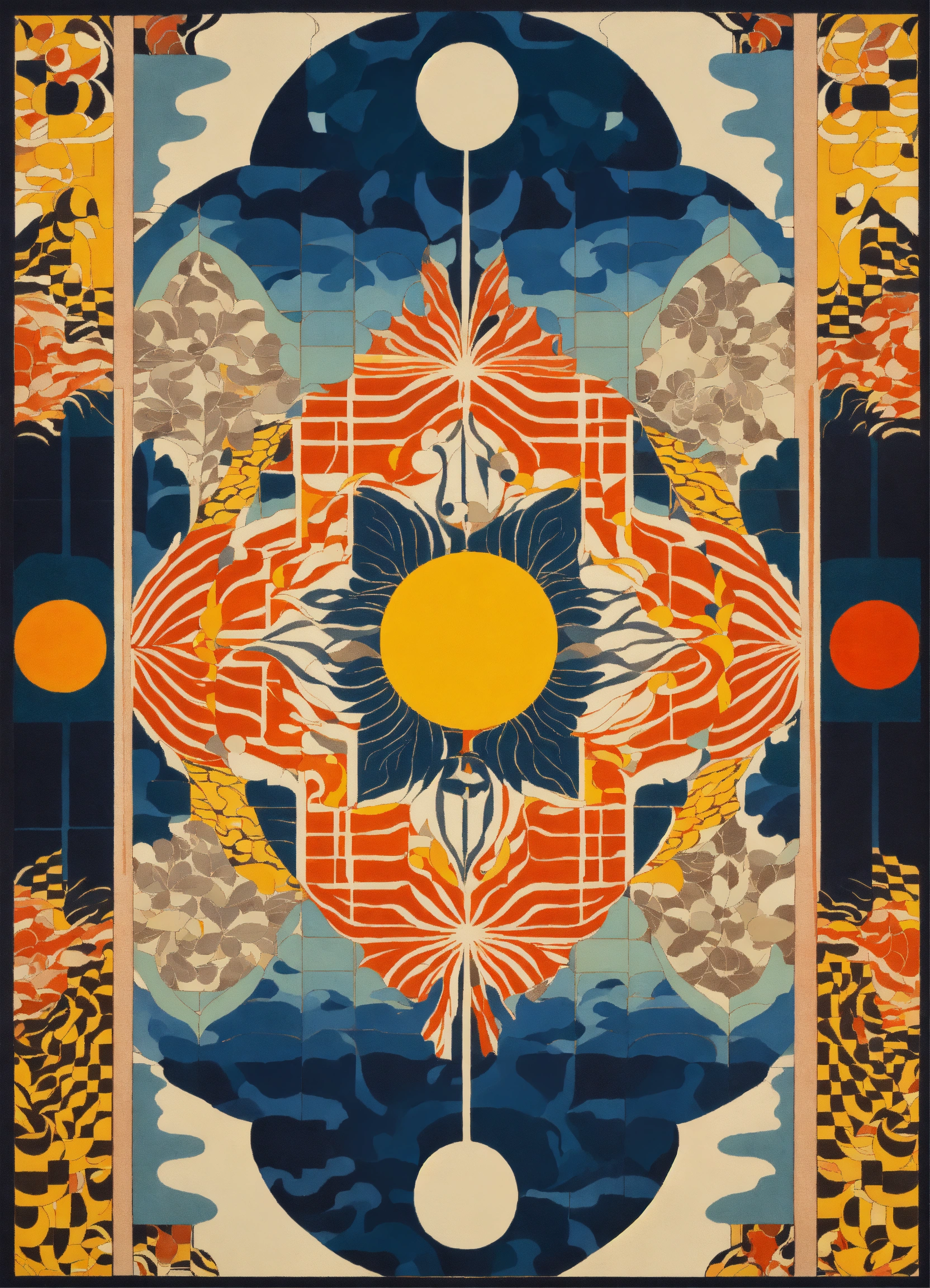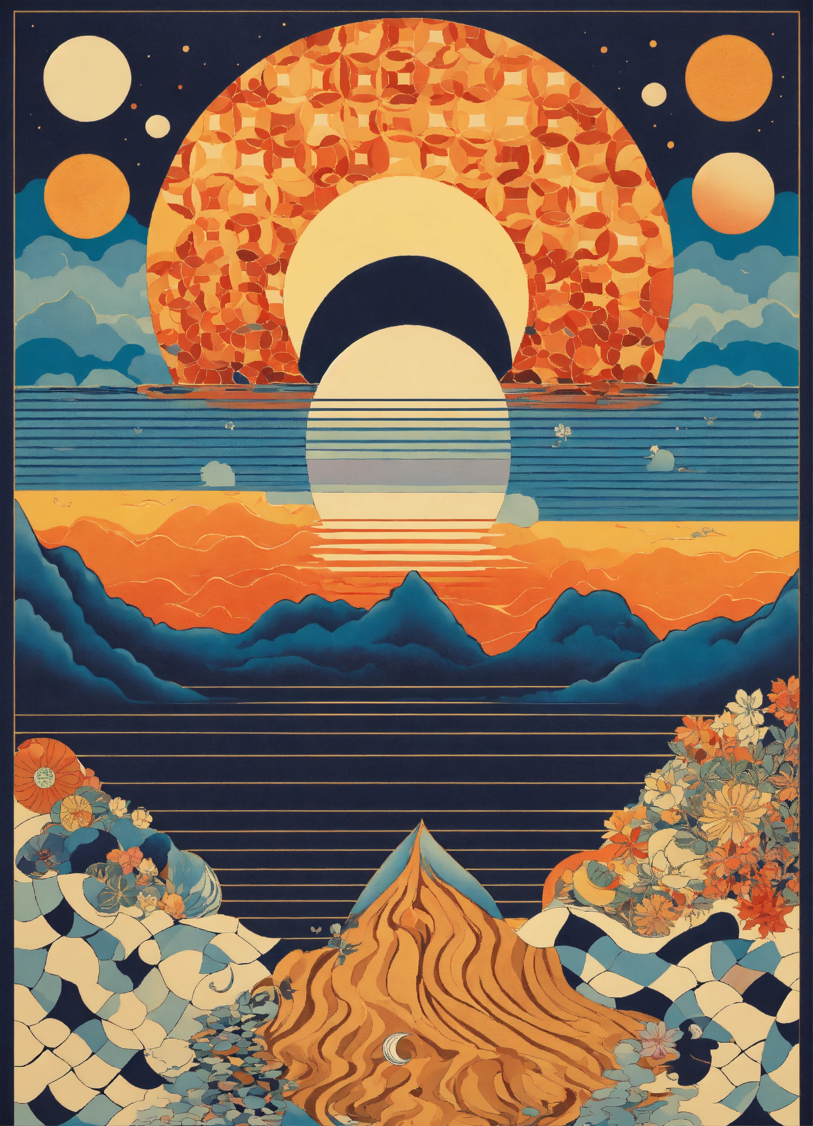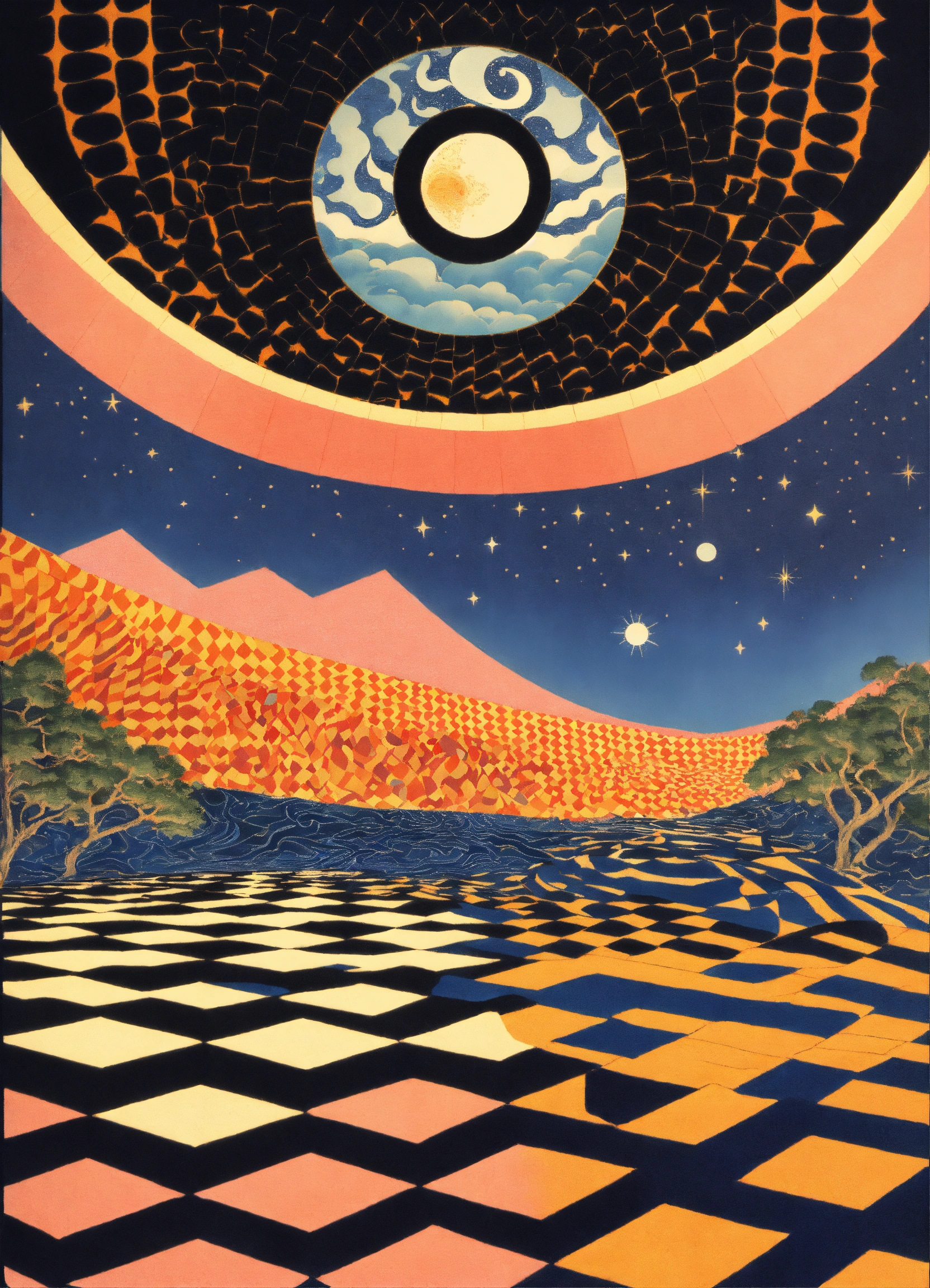 Japanese vintage poster, symmetrical chevron patterns, geometric shapes in the night sky, zig zag shapes, dripping ying yang moon merging into sun, checkerboard tiles, psychedelic abstract, dream dimension meets nubula, cosmos realm merging into zen garden, by maurits cornelis escher