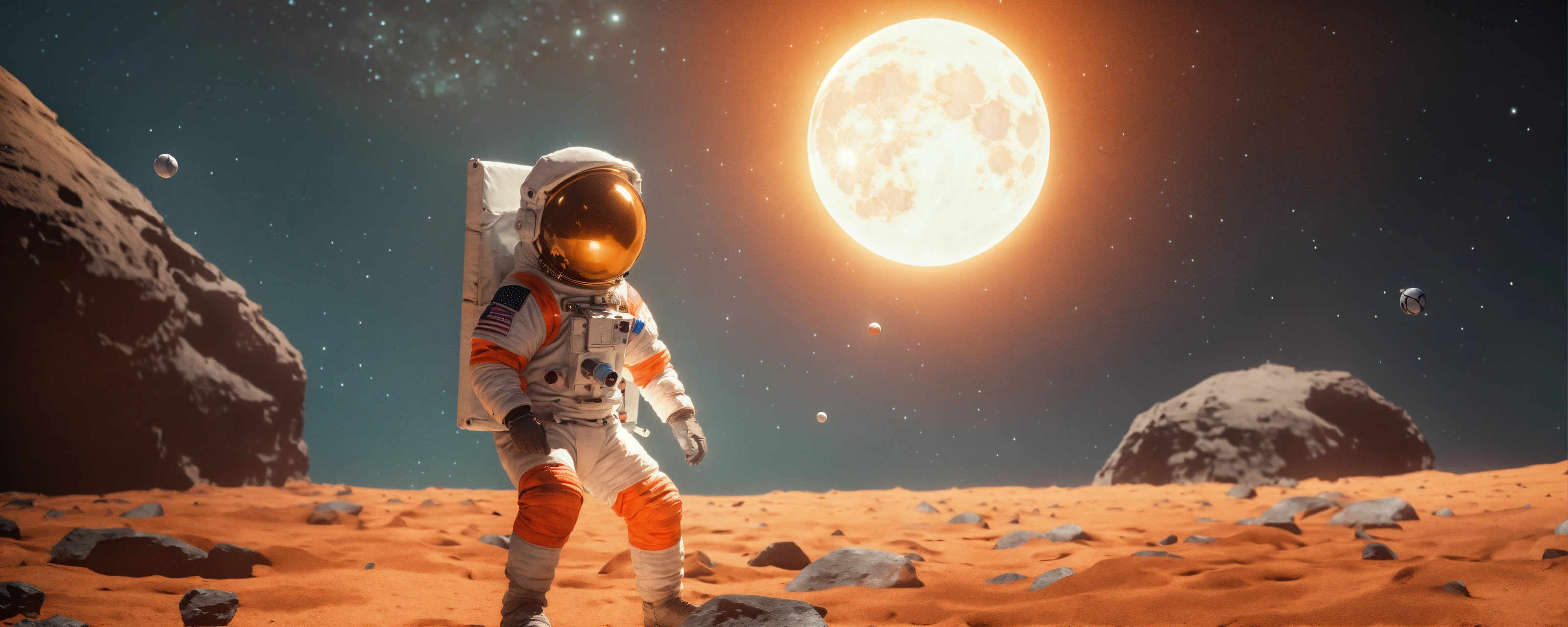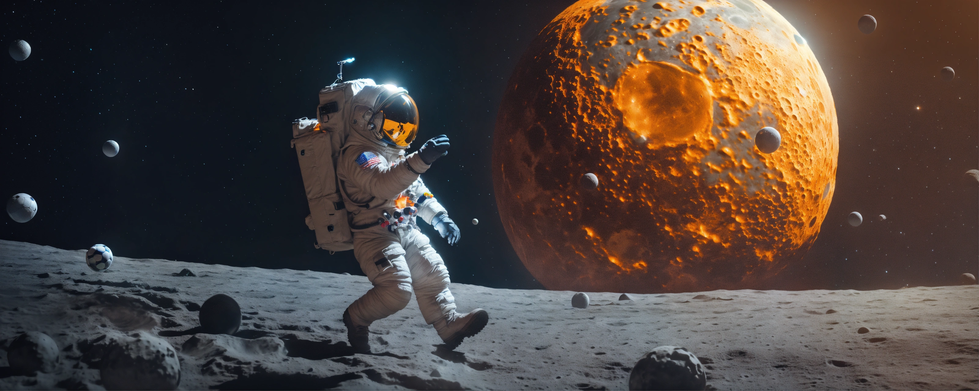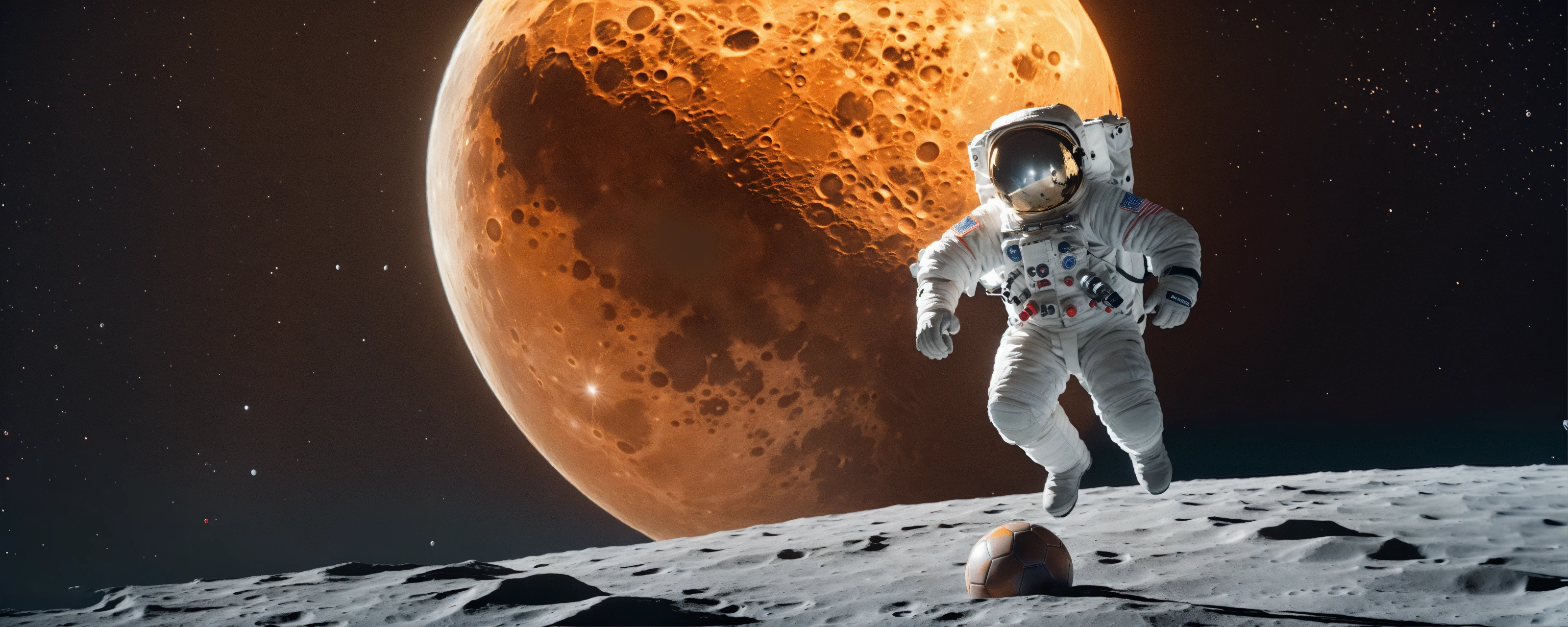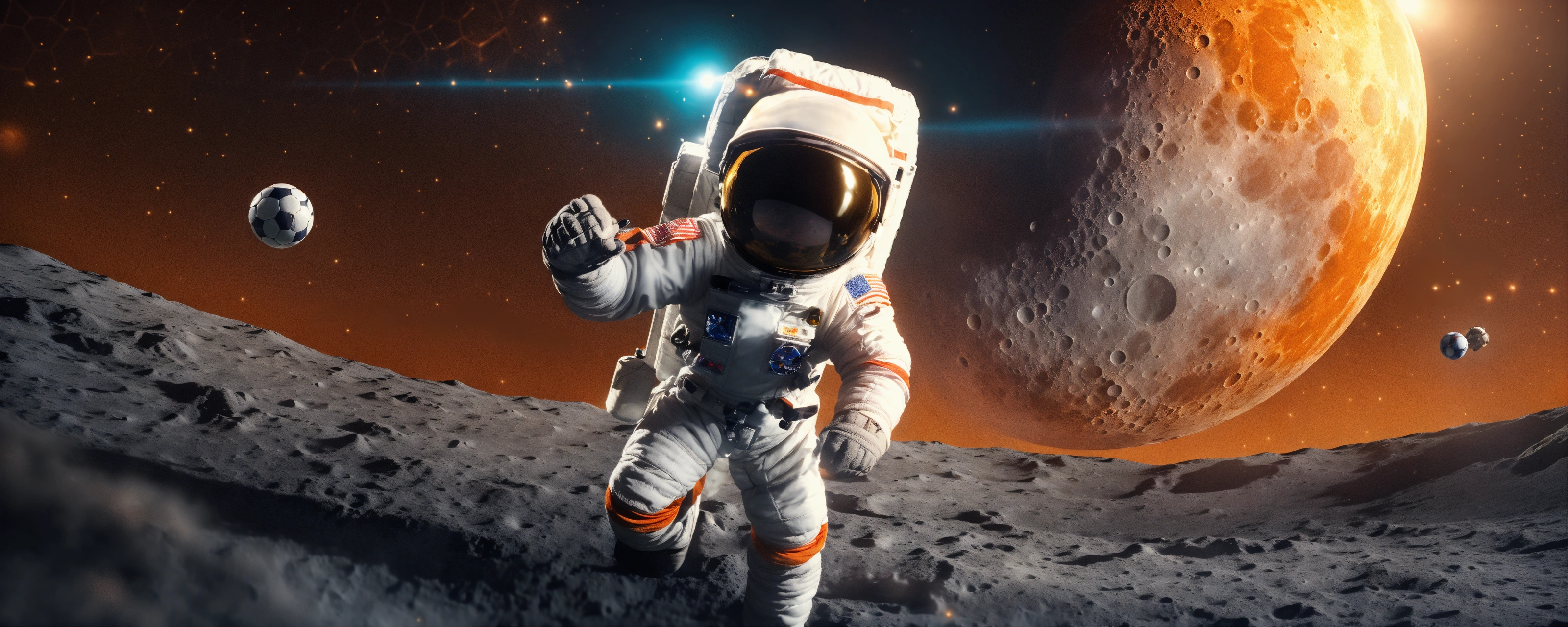 Cute astronaut flying with soccer ball do overhead kick on the moon orange and gray 8k
