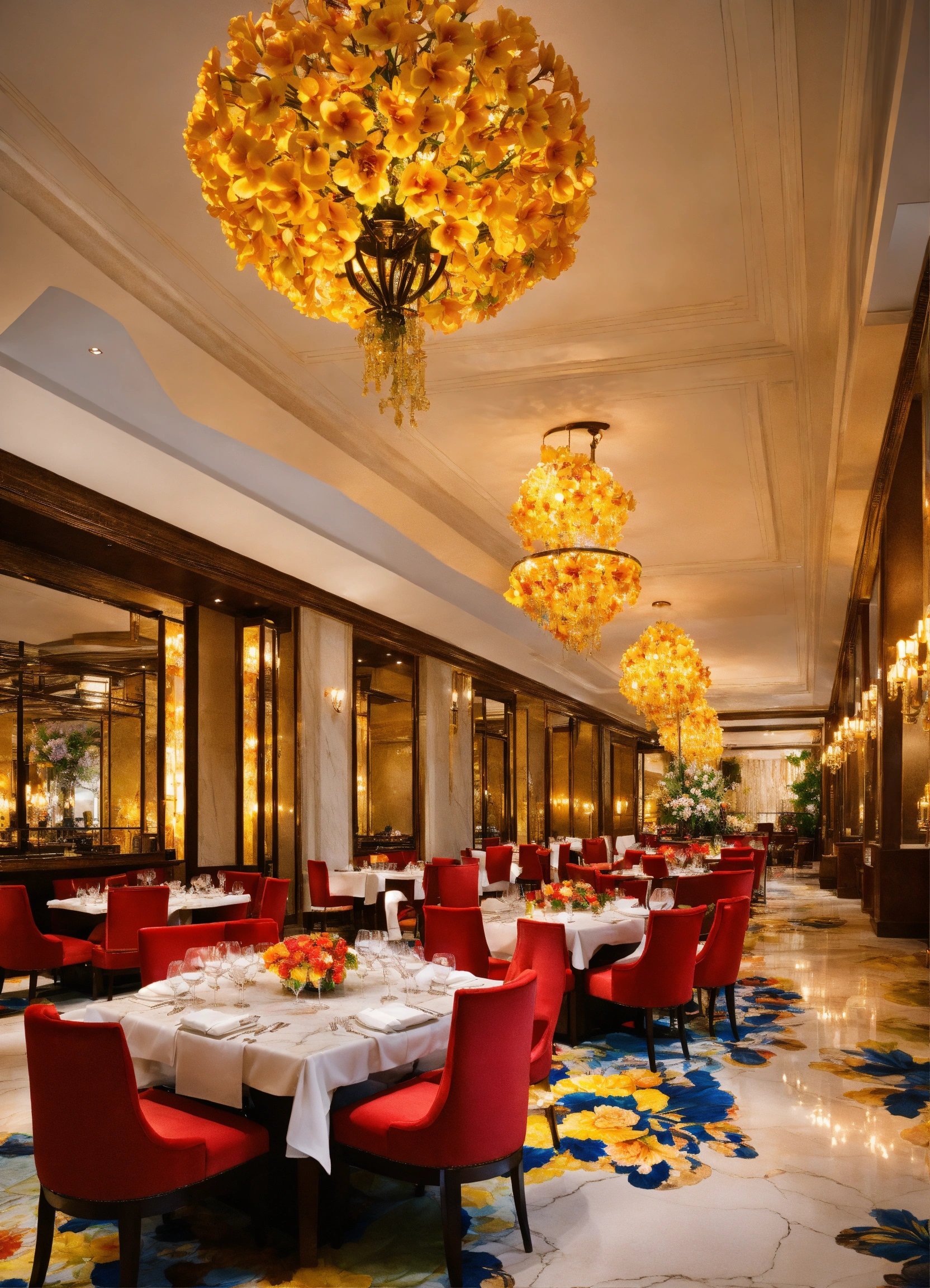 Large upscale resturant, elegant dinner tables. colorful flowers throughout. chandilers, white marble floors