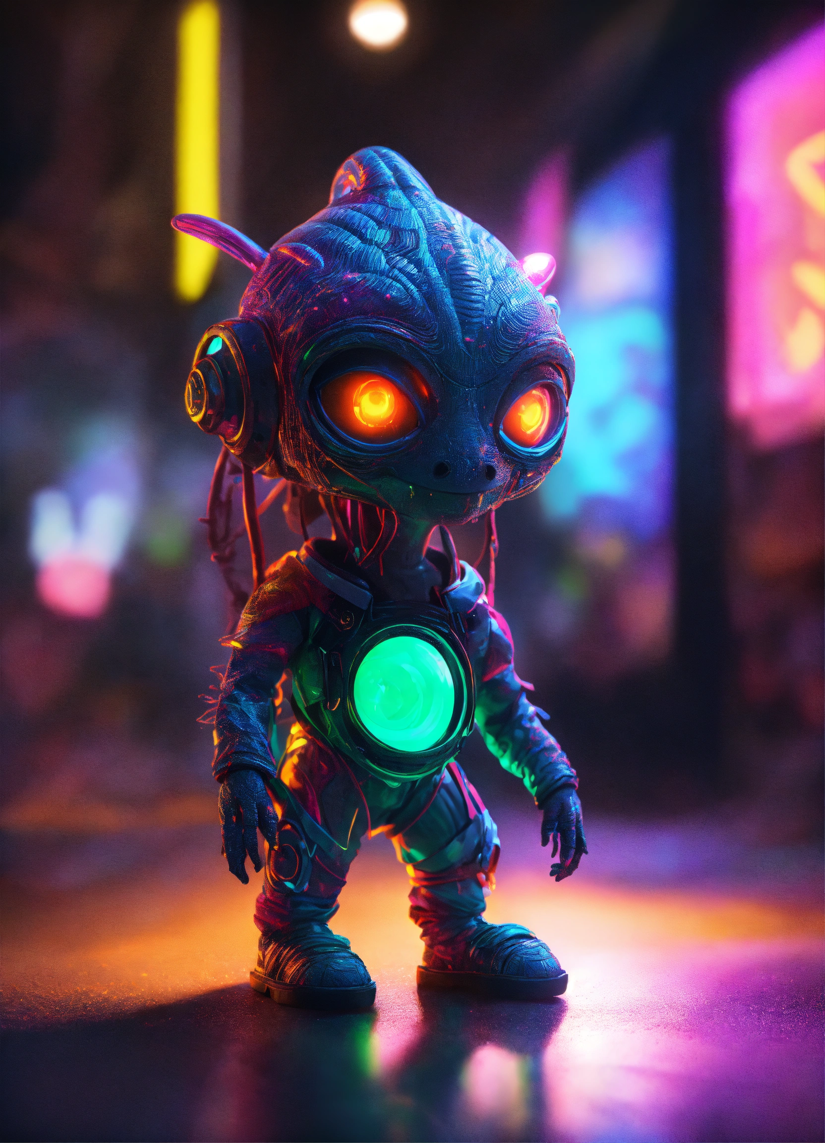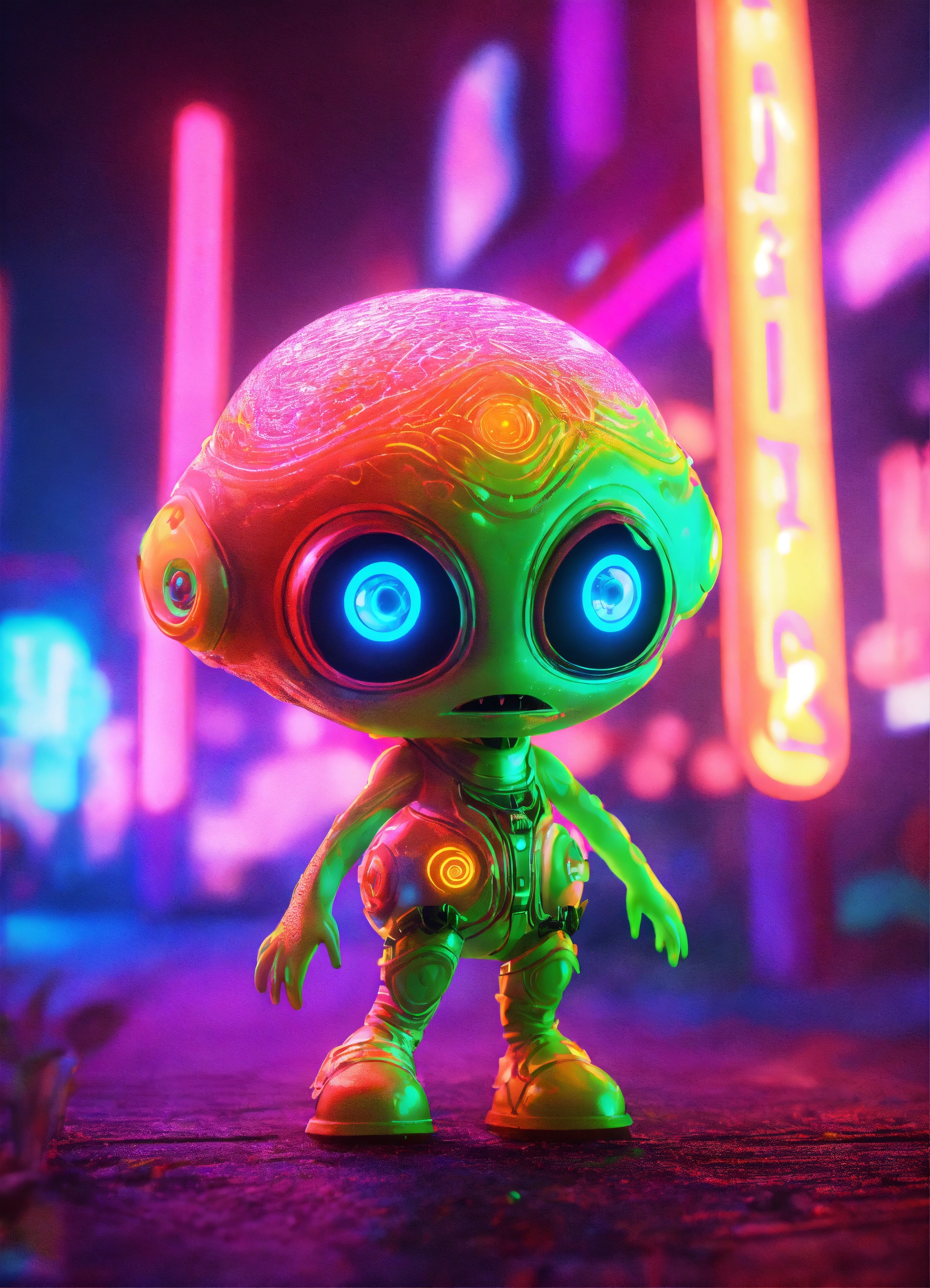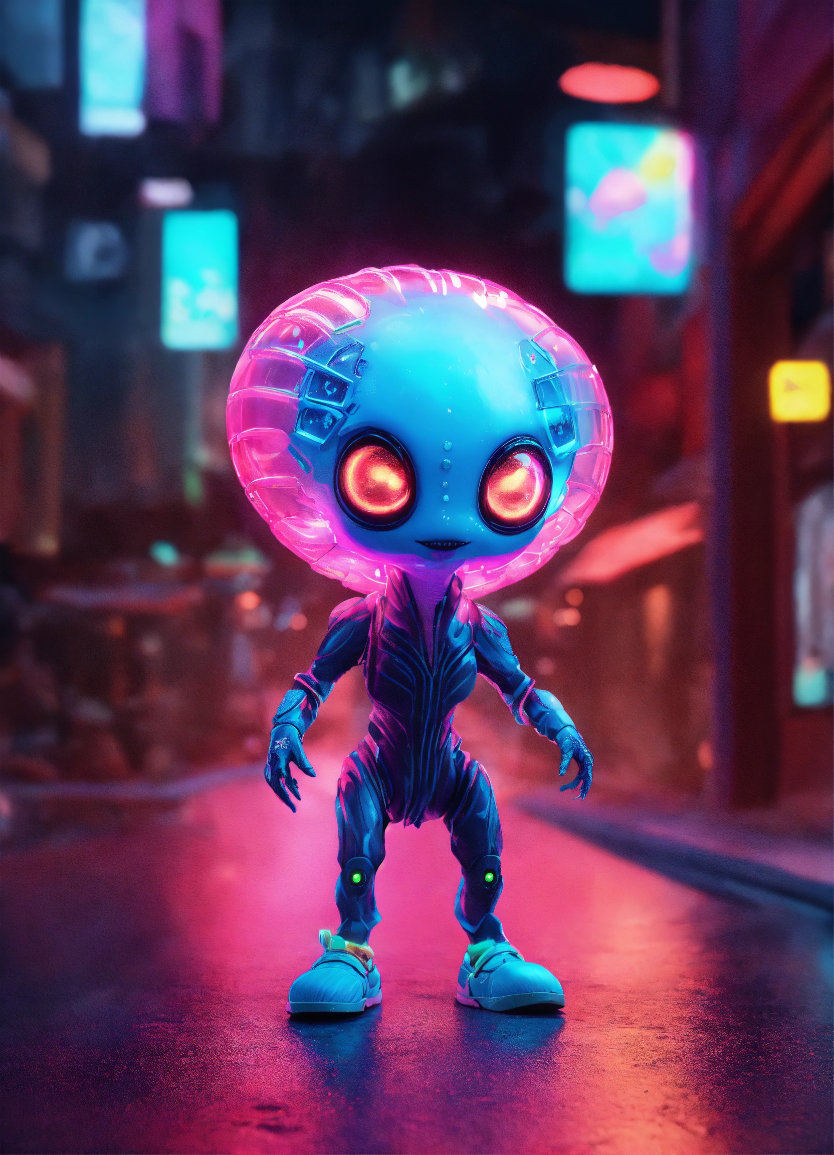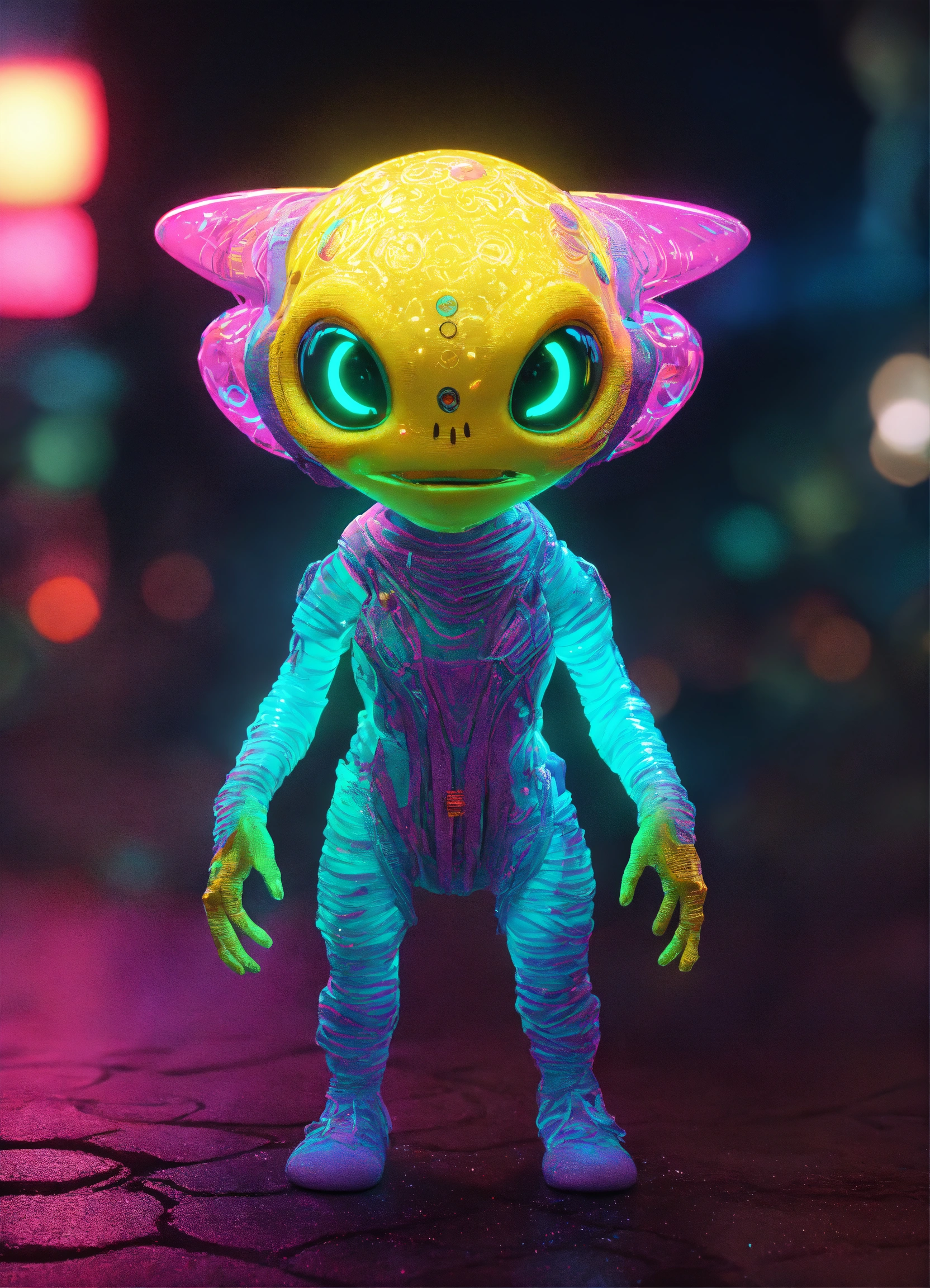 Gelly cute alien monster, full-body, neon glow colors, highly intricate details, 3d, cgi, realistic light, trending on cgsociety, glowing eyes, facing camera, neon details, ultra realistic details, portrait, sci fi atmosphere, global illumination, shadows, octane render, 8 k, ultra sharp