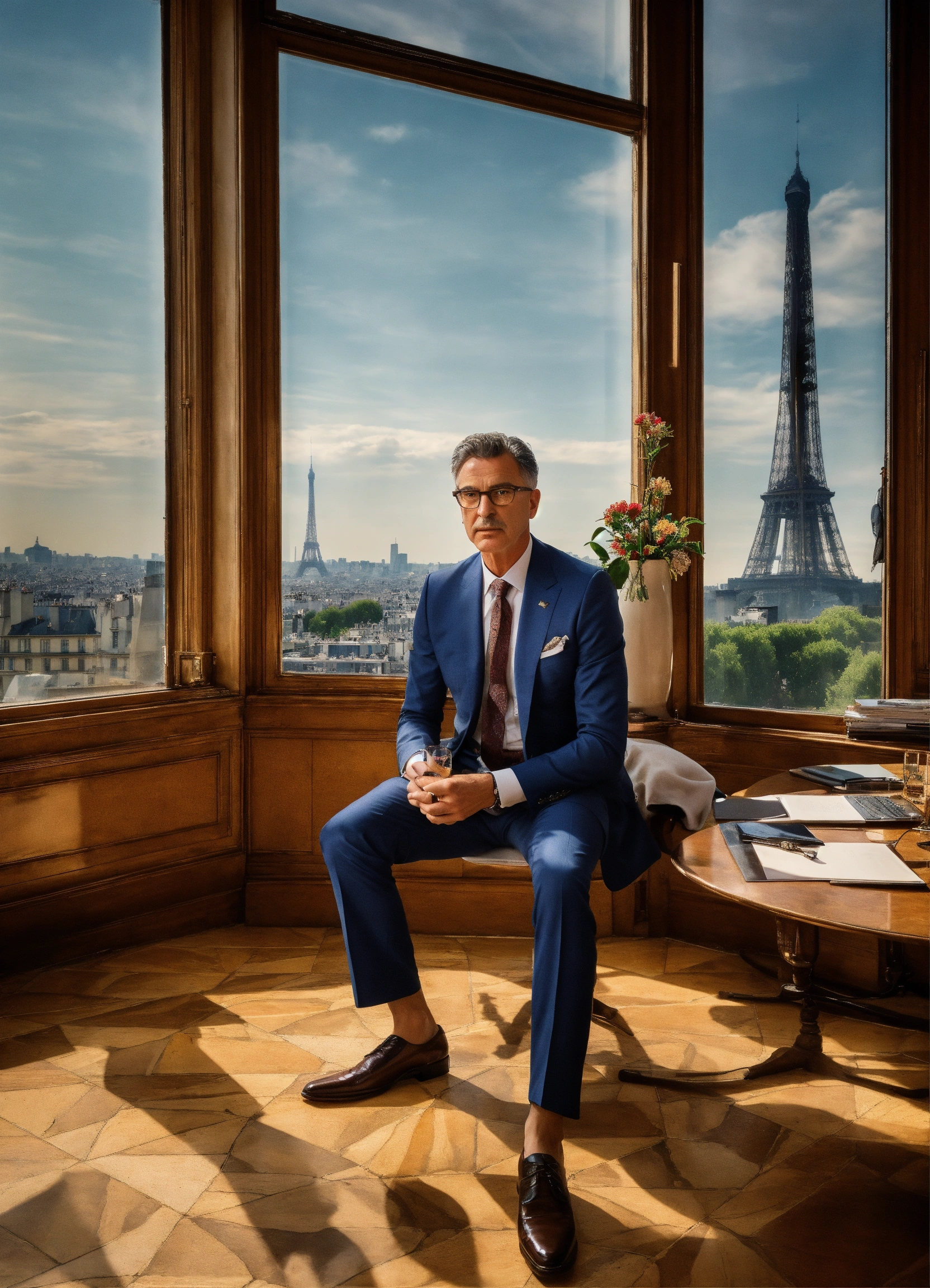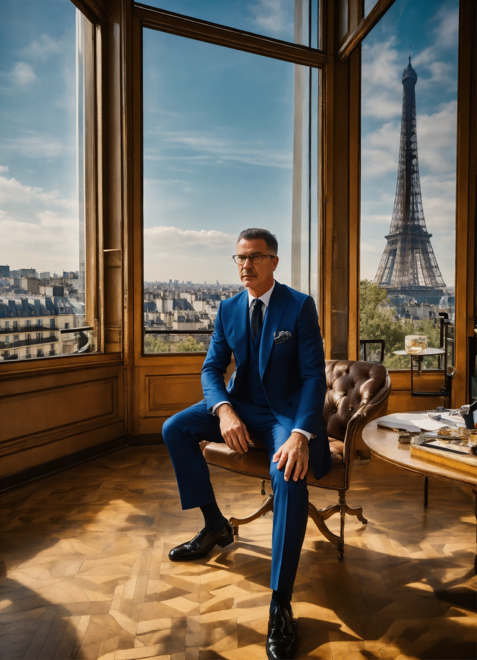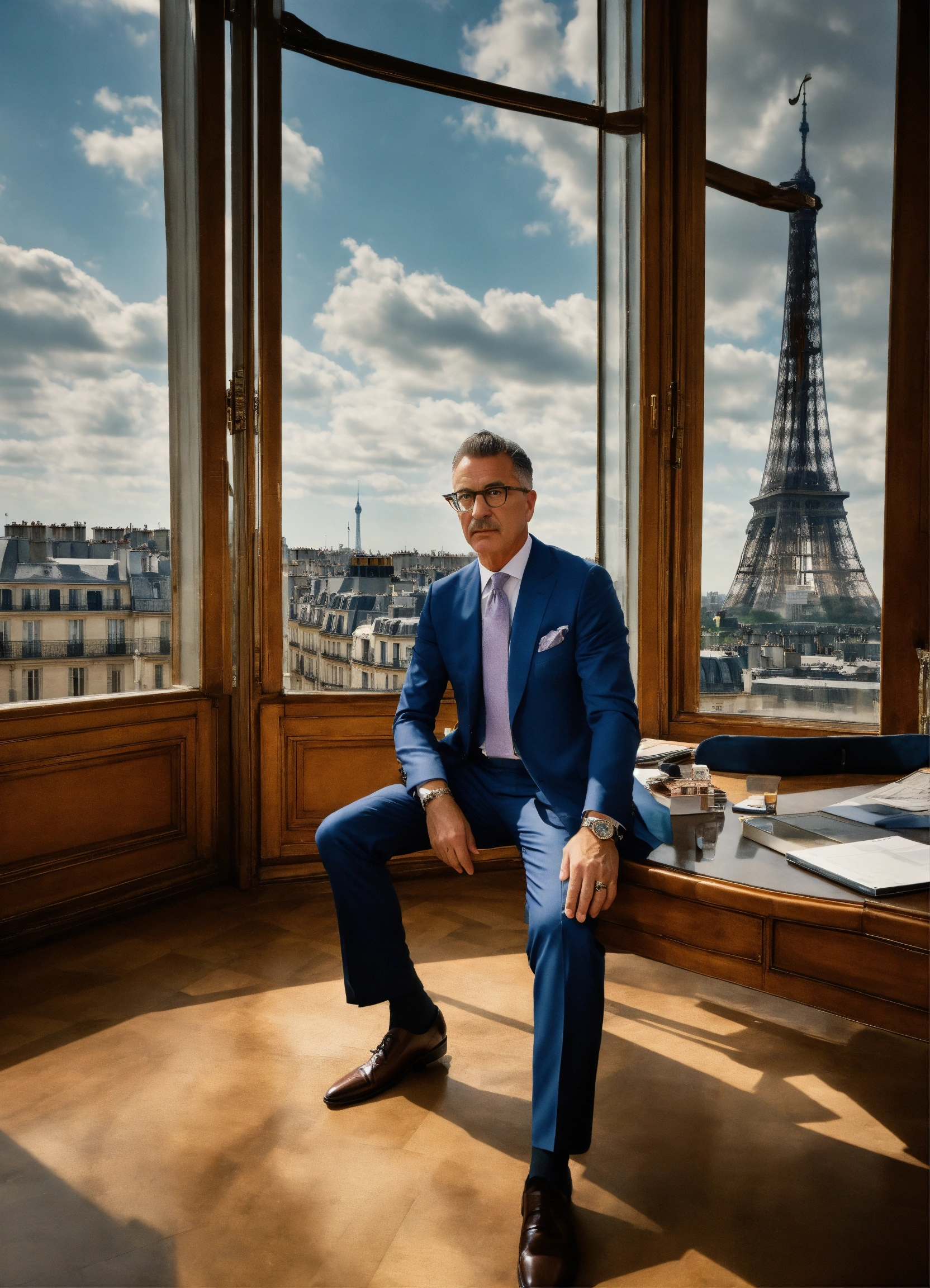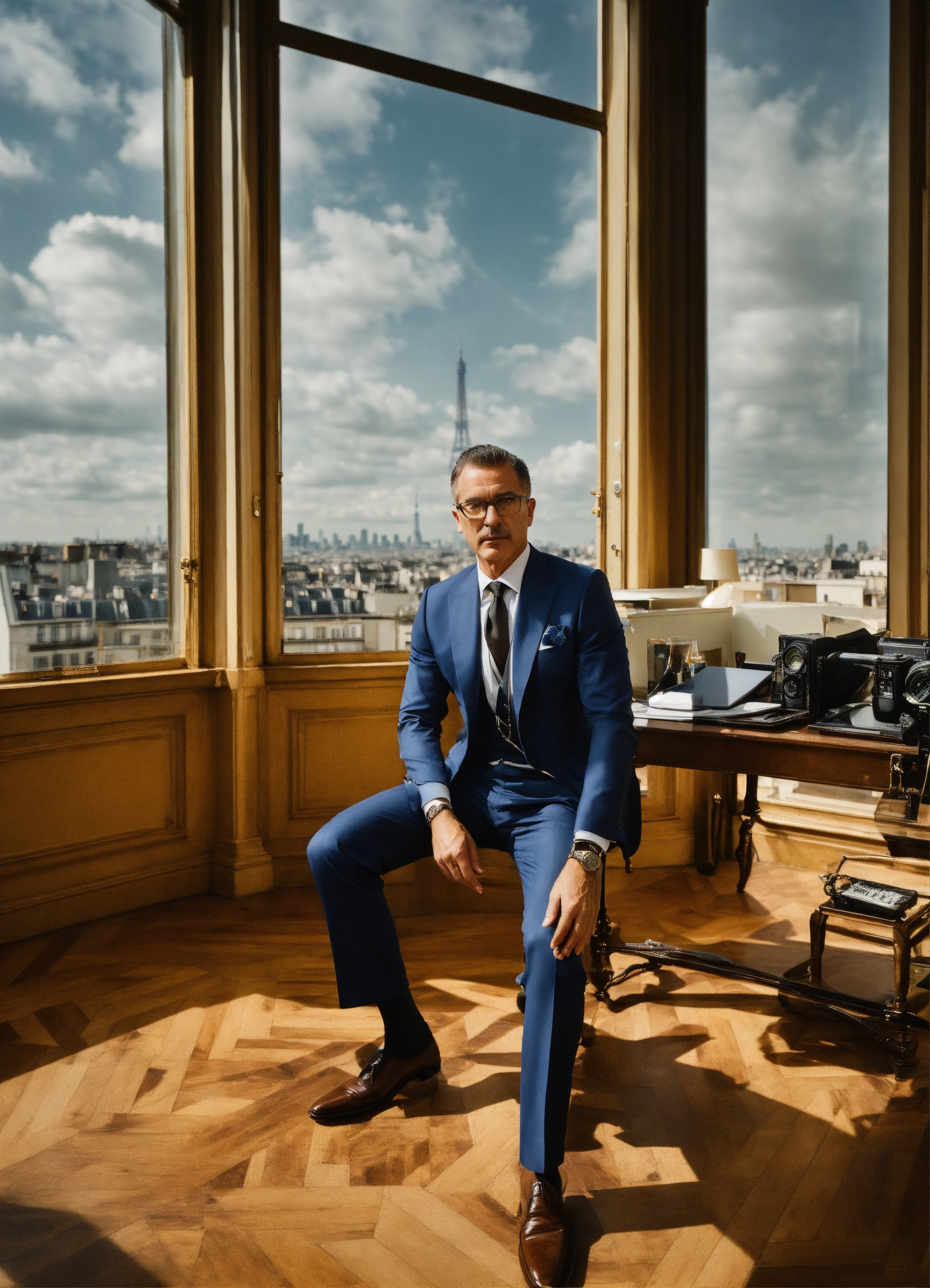 Create a 169 wide-angle, hdr, 4k resolution image that encapsulates the essence of helmut newton's photography style. the setting is a high-tech, professional office in paris with expansive windows offering a panoramic view of the city. the atmosphere should be fancy, bright, and modern. middle-aged man dressed in a formal blue dolce & gabbana suit, this serious man wears glasses. he exudes an air of wisdom and experience. styling notes character should be real person, in a mix of formal and casual italian dolce & gabbana fashion style. the gender of the character should be balanced as specified, and each should be dressed in the assigned colors. the overall tone should be both professional and warm, capturing the essence of leadership and executive decision-making. this prompt aims to capture the intricate dynamics of a director or executive, bringing his unique flair to a setting that is as sophisticated as it is cutting-edge.