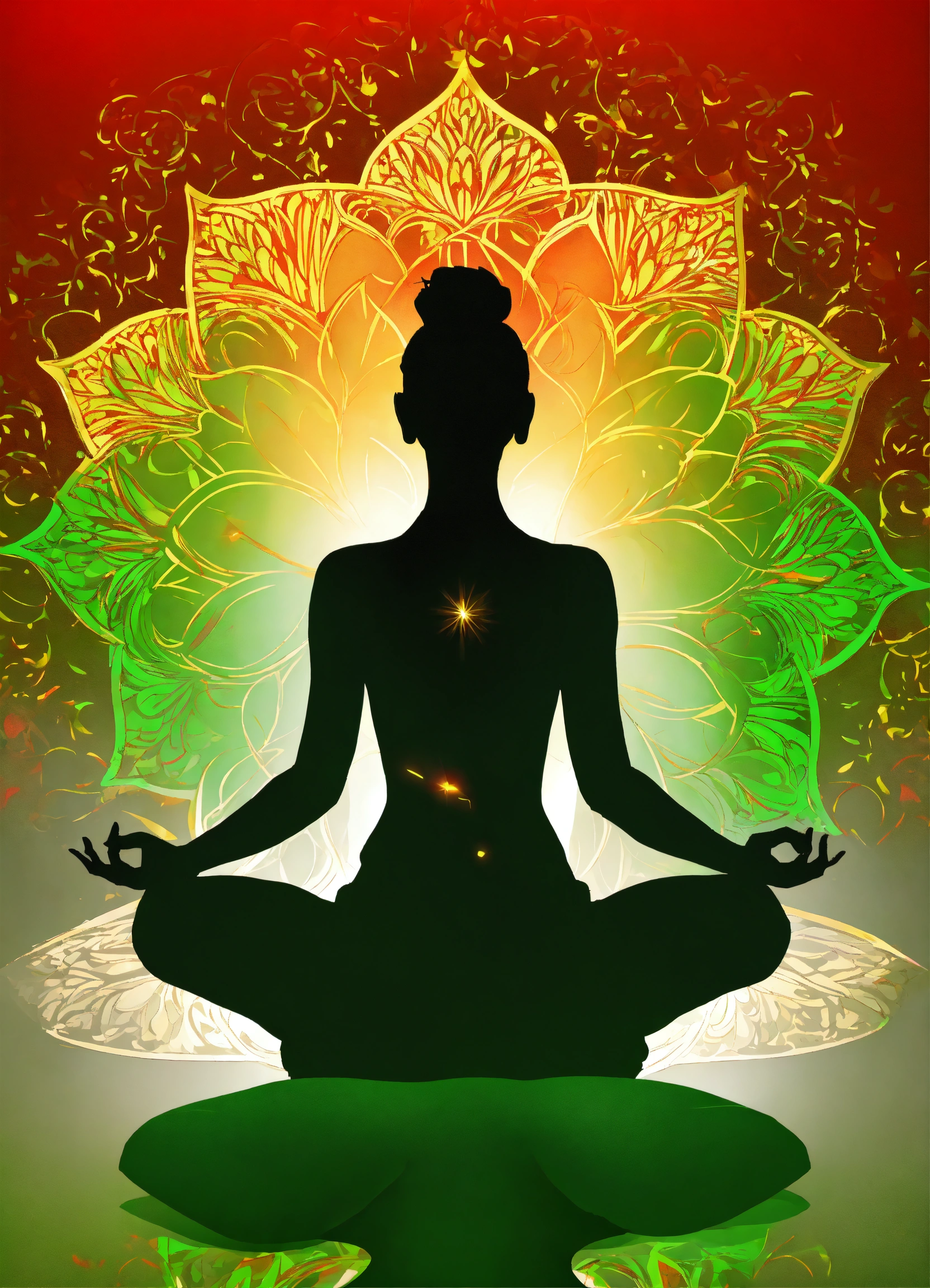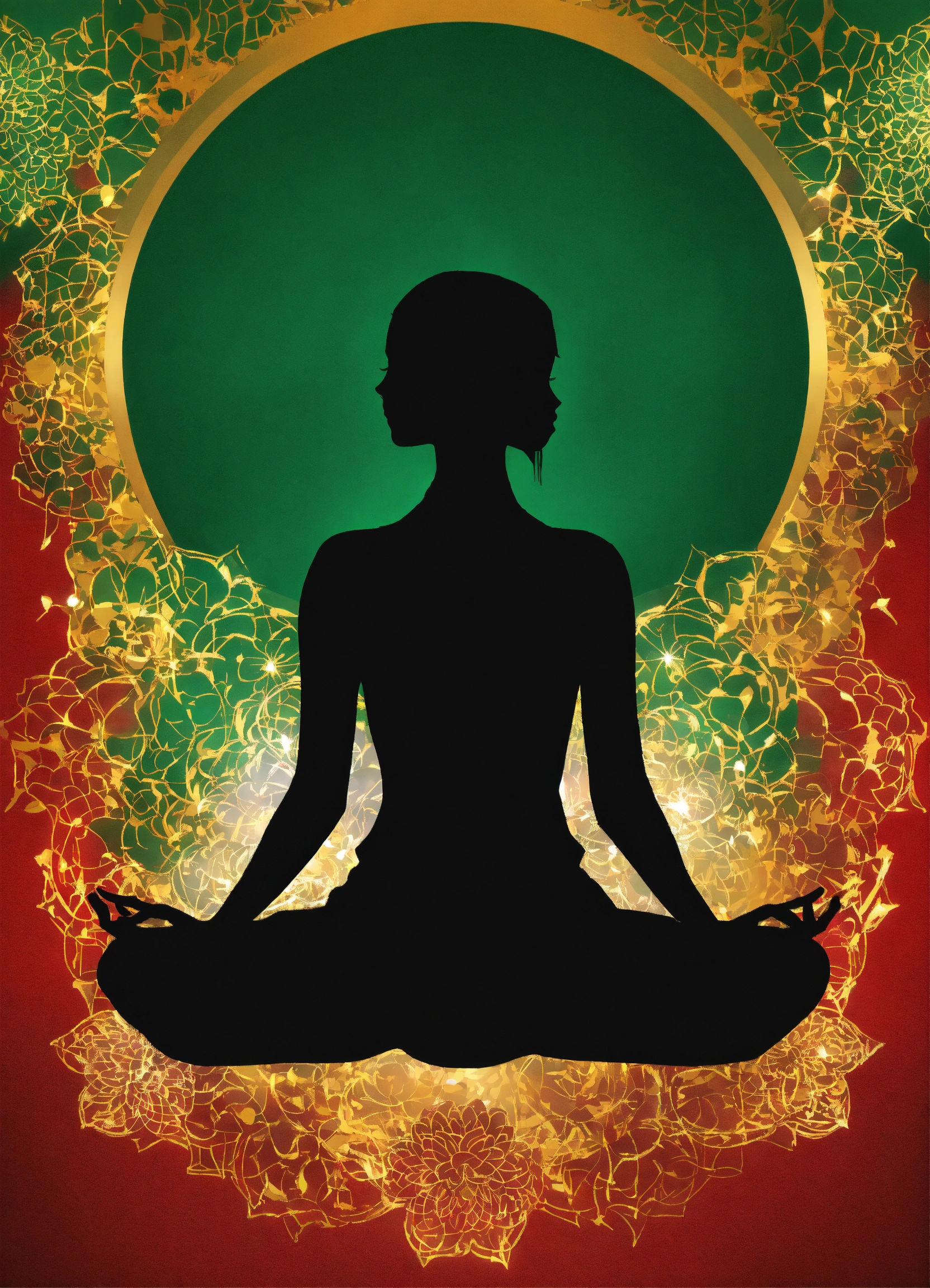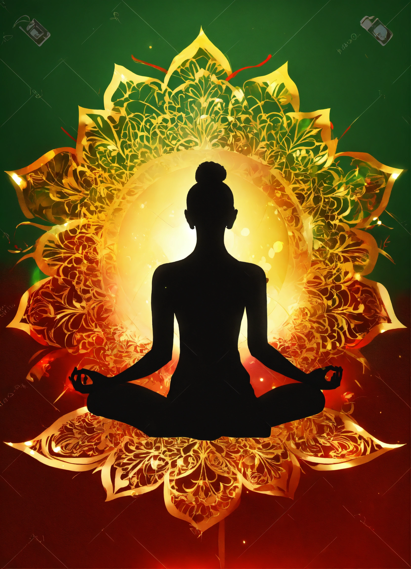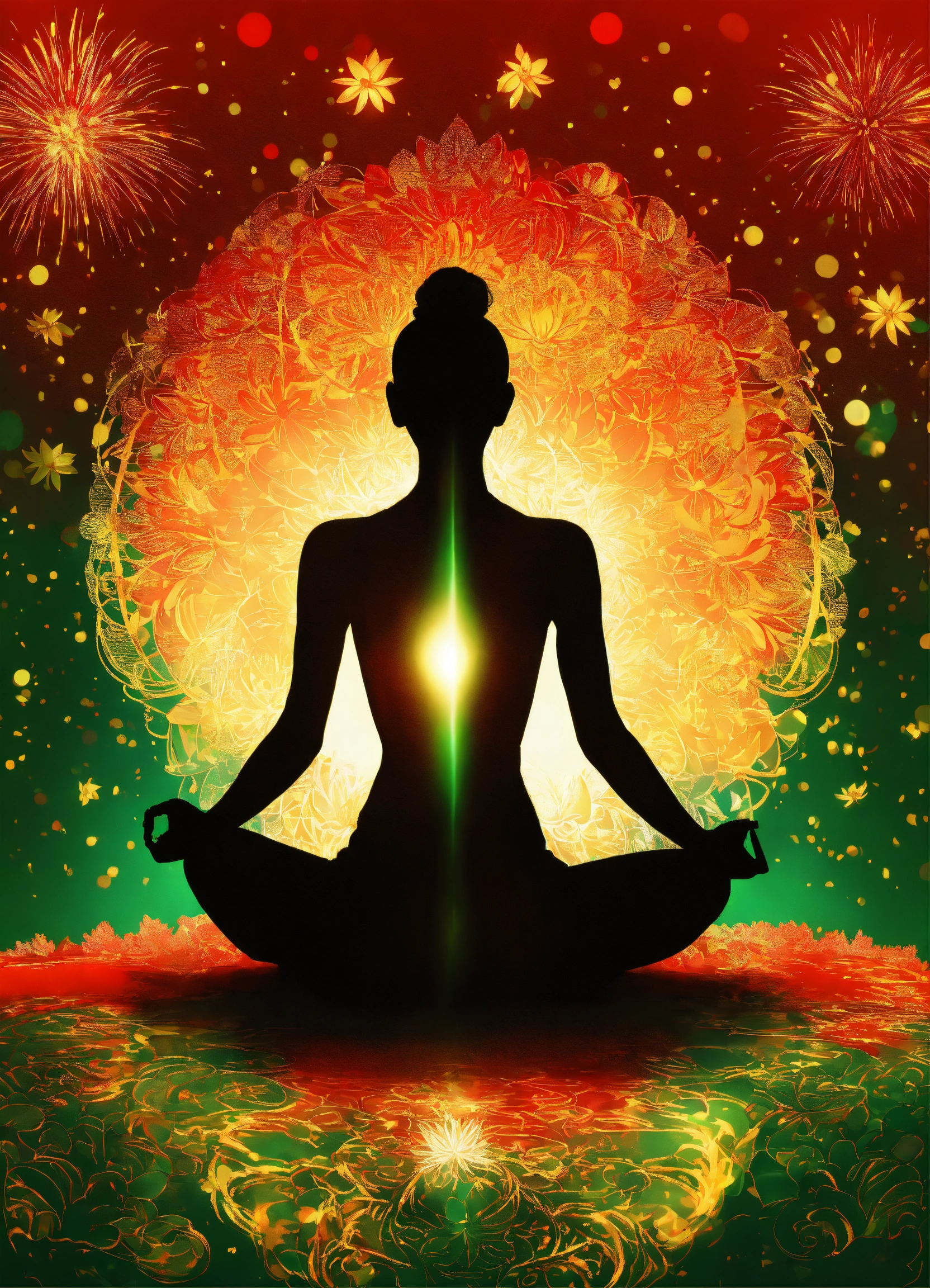 Generate a silhouette of a person in profile in a lotus pose against a new year-themed background (red, green, gold, silver)