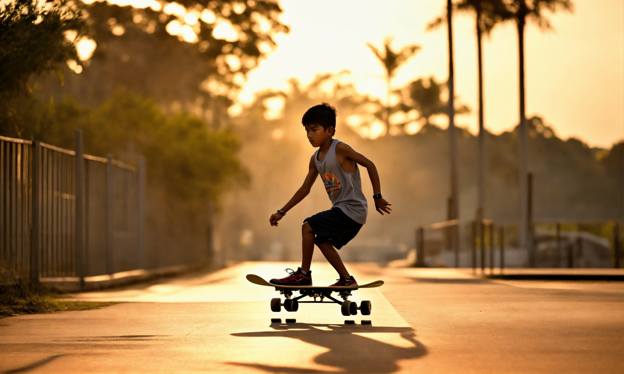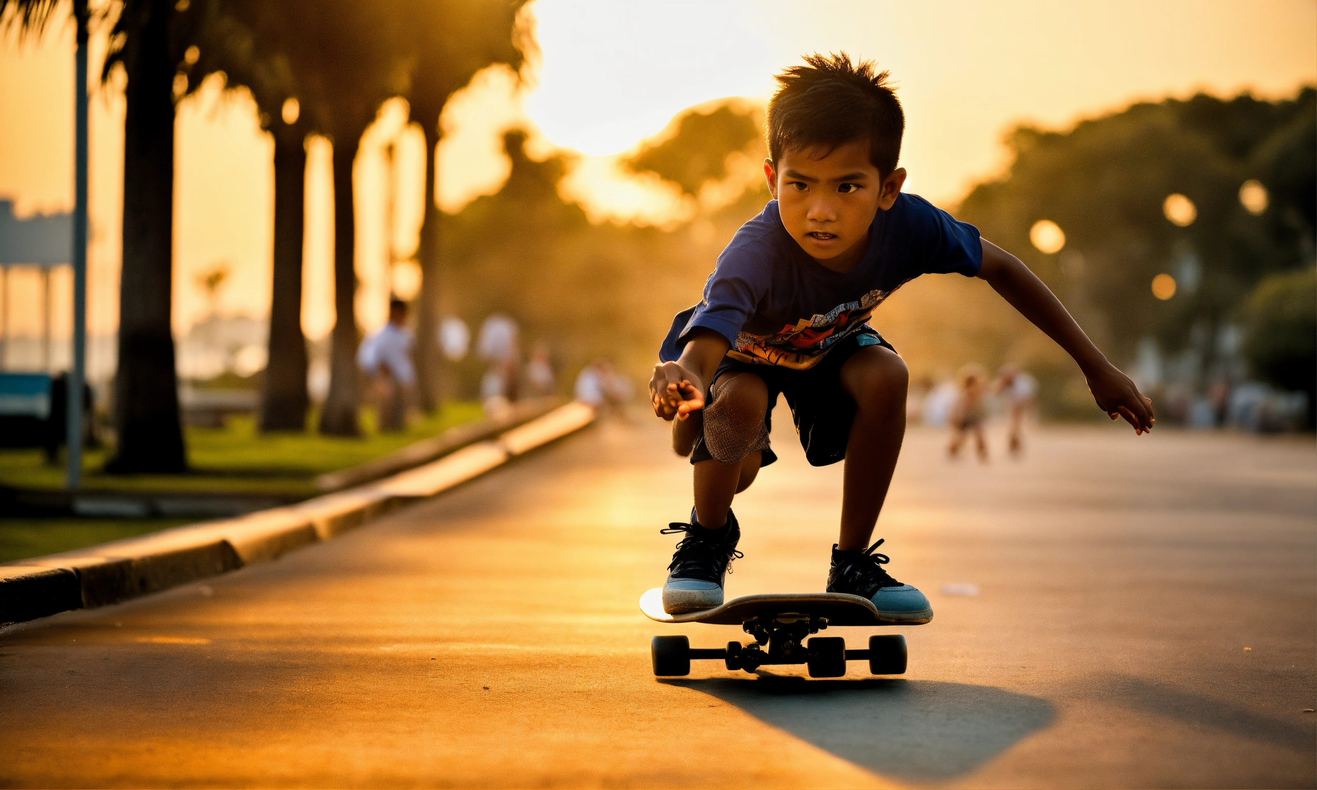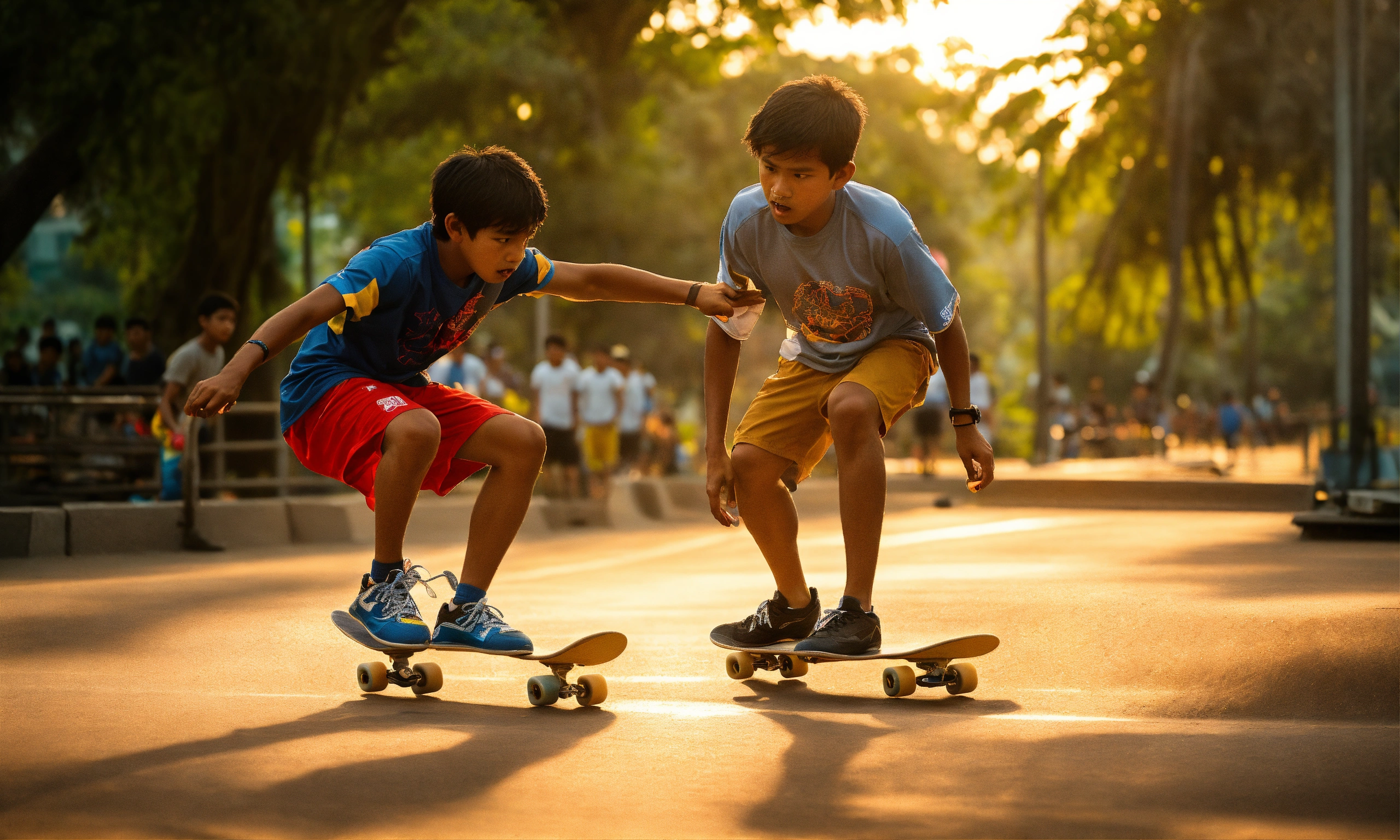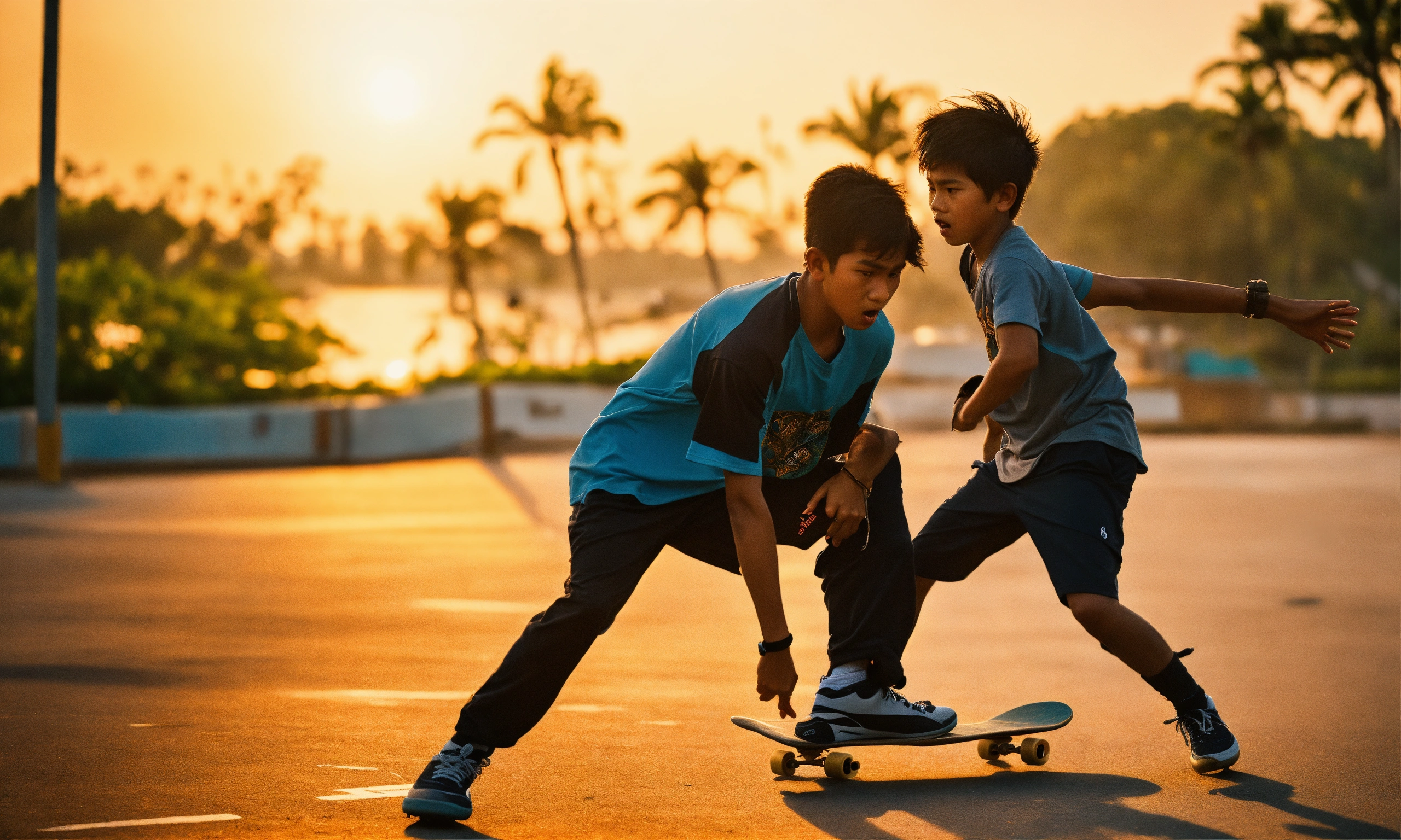 Afternoon sun, ultra-realistic photo, cinematic quality, close-up action shot, east coast park as the backdrop, main focus on two skateboarders, a malay 9 year skateboarder helping an 8-year old indian to master a trick. both are intensely focused, their eyes locked in determination, sweat on their brows, exuding raw passion and unyielding perseverance; clothing contemporary skateboarding attire with protective gear, a mix of t-shirts, shorts, and sneakers, expressions grit, intensity, a fierce show of camaraderie and never-give-up attitude, the mentor's hand gripping the arm of the novice themes modern nostalgia, overcoming adversity, brotherhood, dynamic lighting emphasizing the contours of their faces, deep shadows and highlighted features, captured in the heat of the moment, 50mm camera lens for sharpness and bokeh background, portra 400 film for capturing the warmth of the setting sun and rich contrasts, slight film grain to accentuate the raw energy and emotion of the scene.