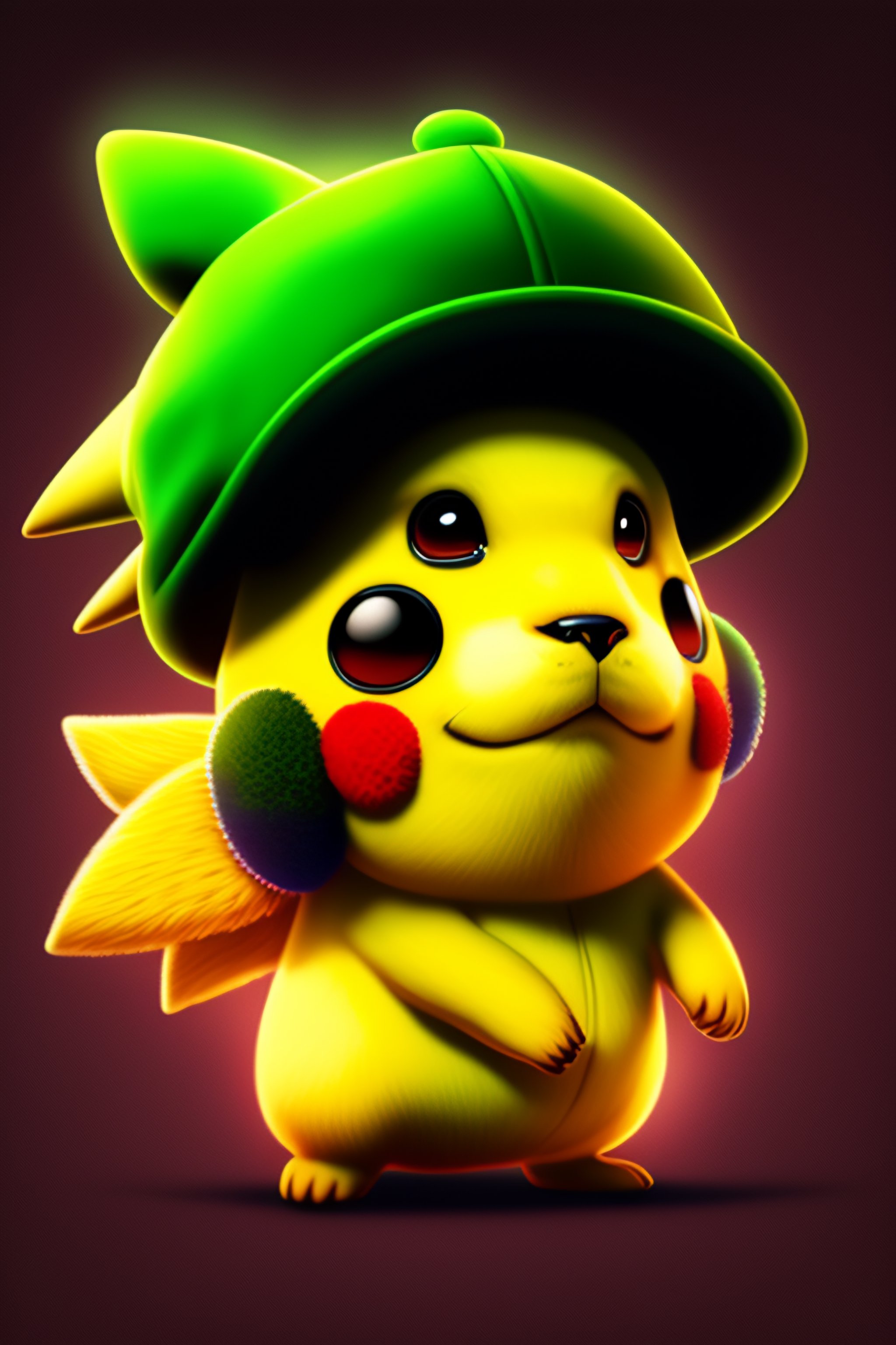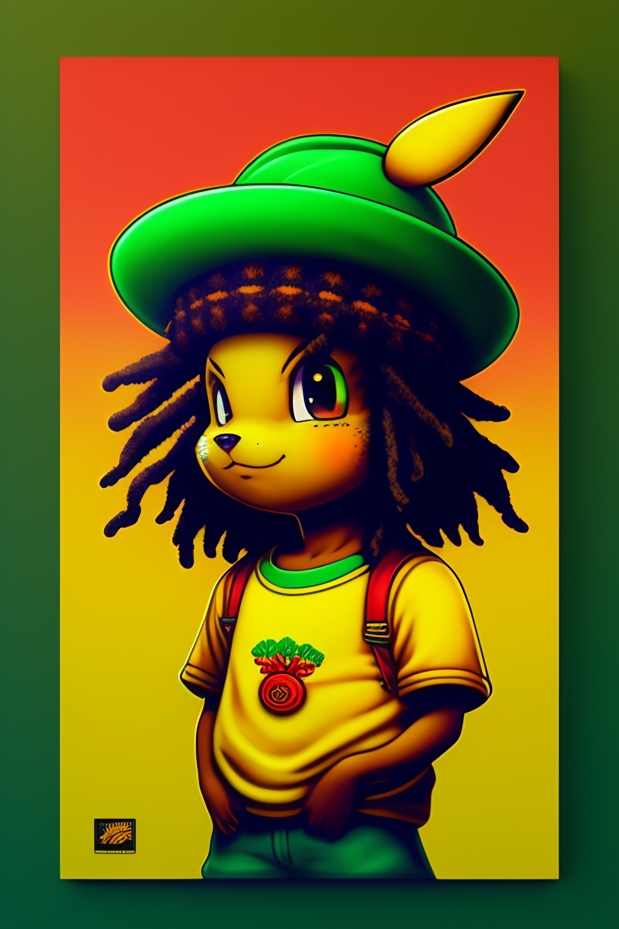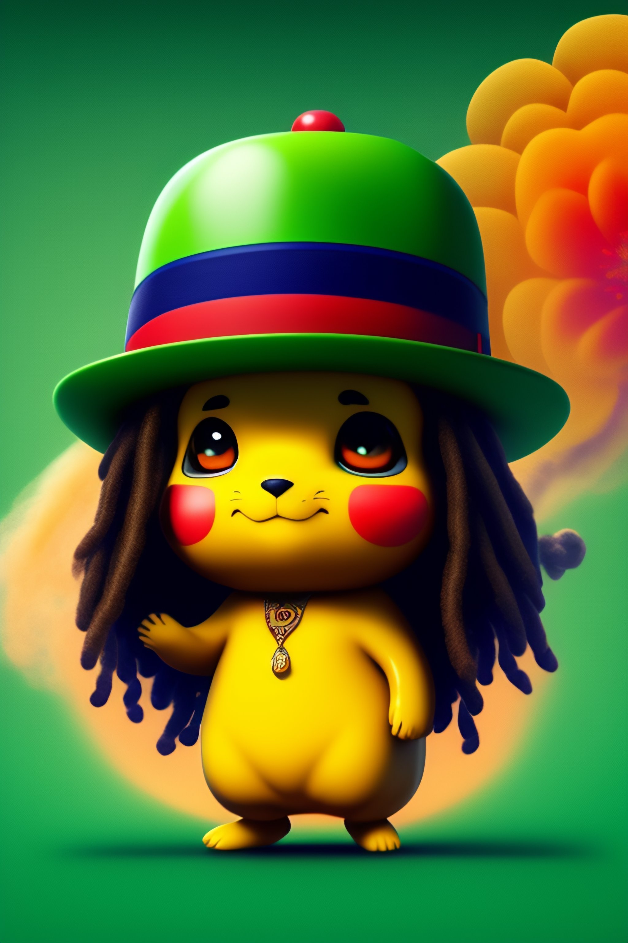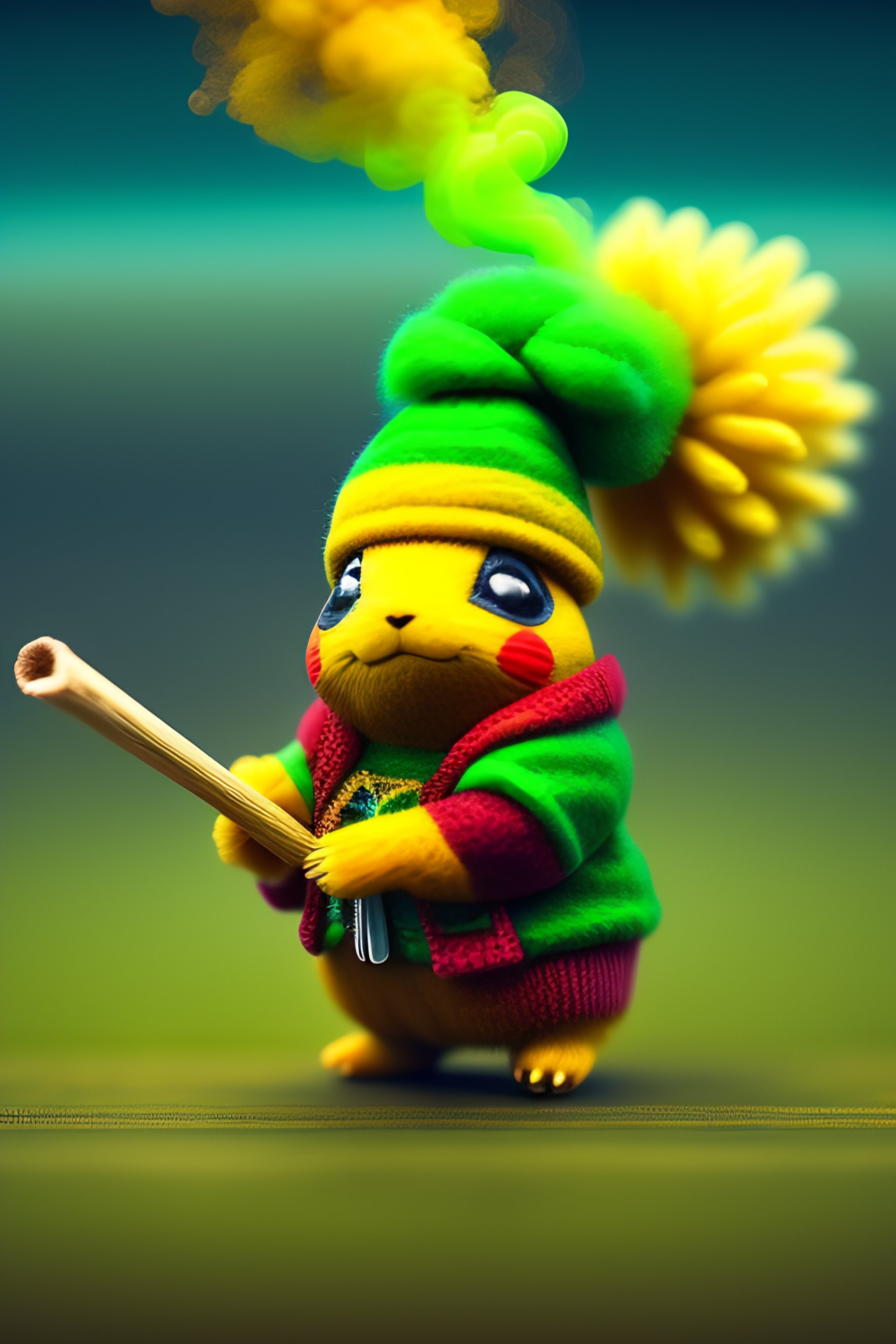 A stoner version of pikachu with dreadlocks and a rasta hat, he is smoking on a big blunt, a thick green smoke is coming out of the blunt and creating a fog, background is a little field full of flowers and little birds