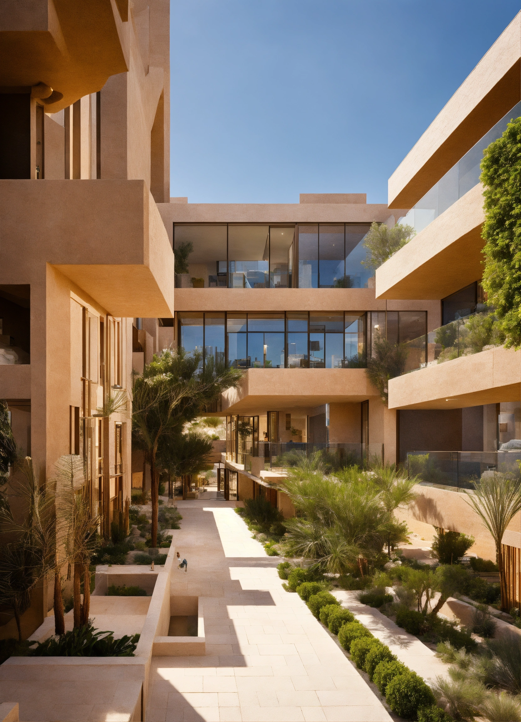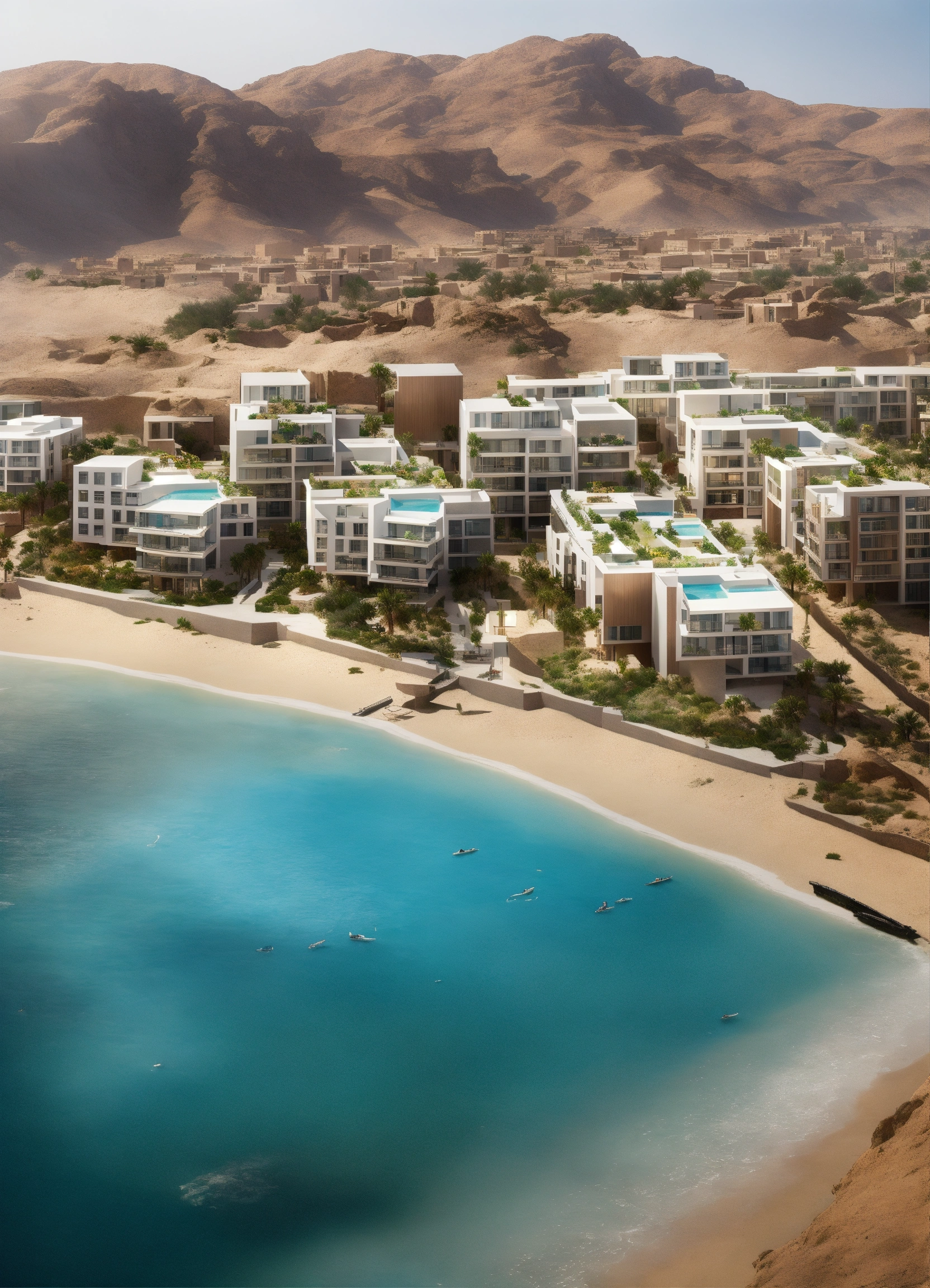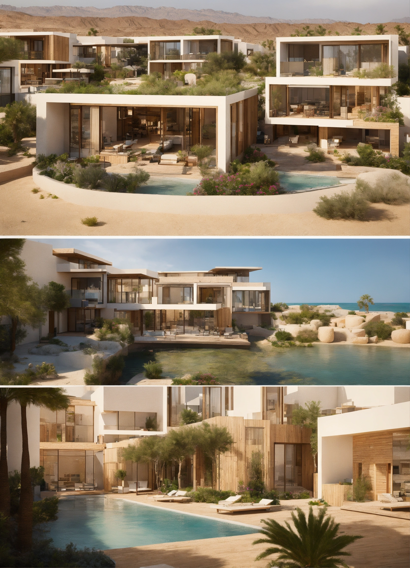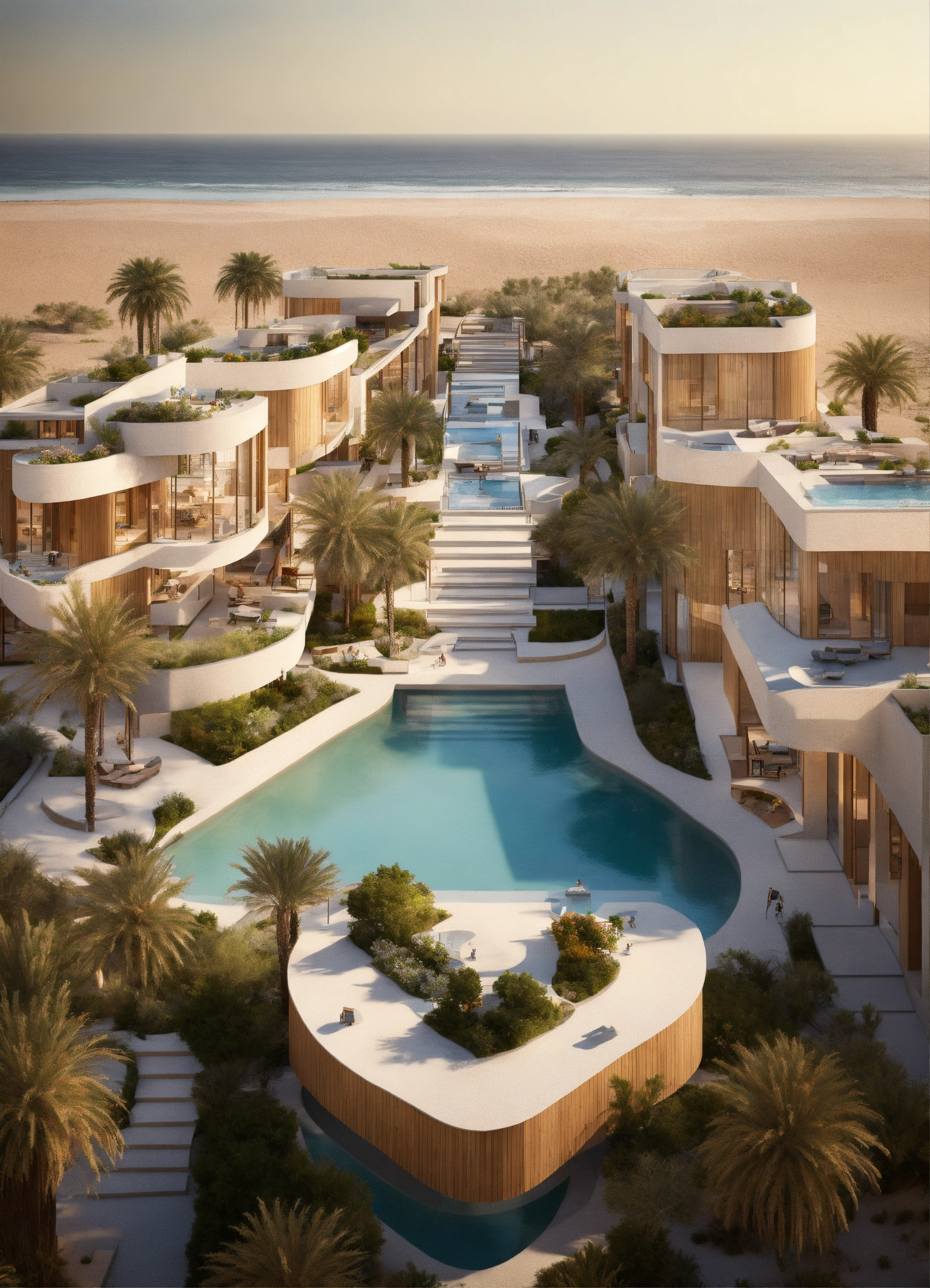A group of seven mixed-use developments, with town houses, with moats, with indoor atriums, each building made by famous architects, by the sea, in the desert.