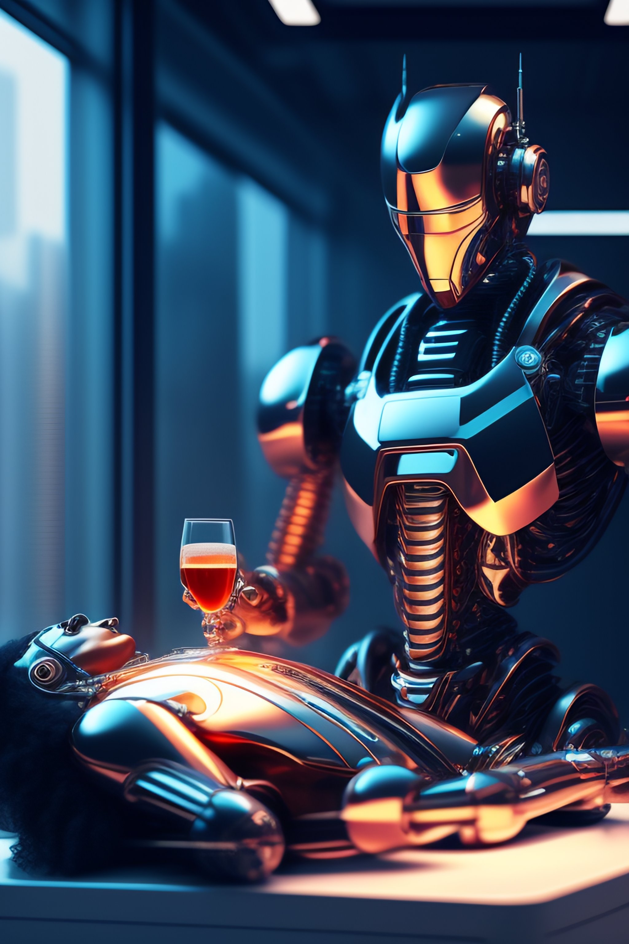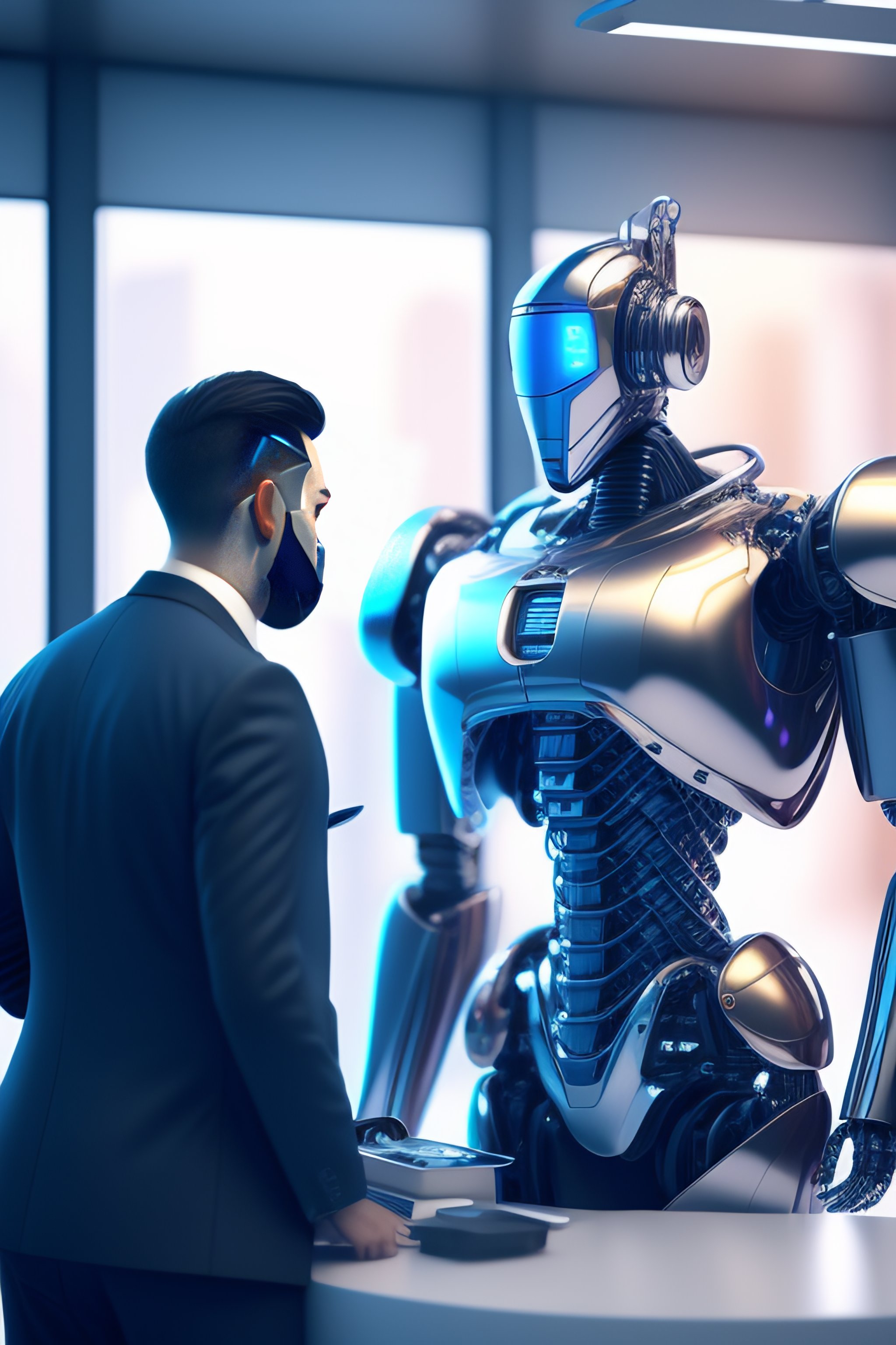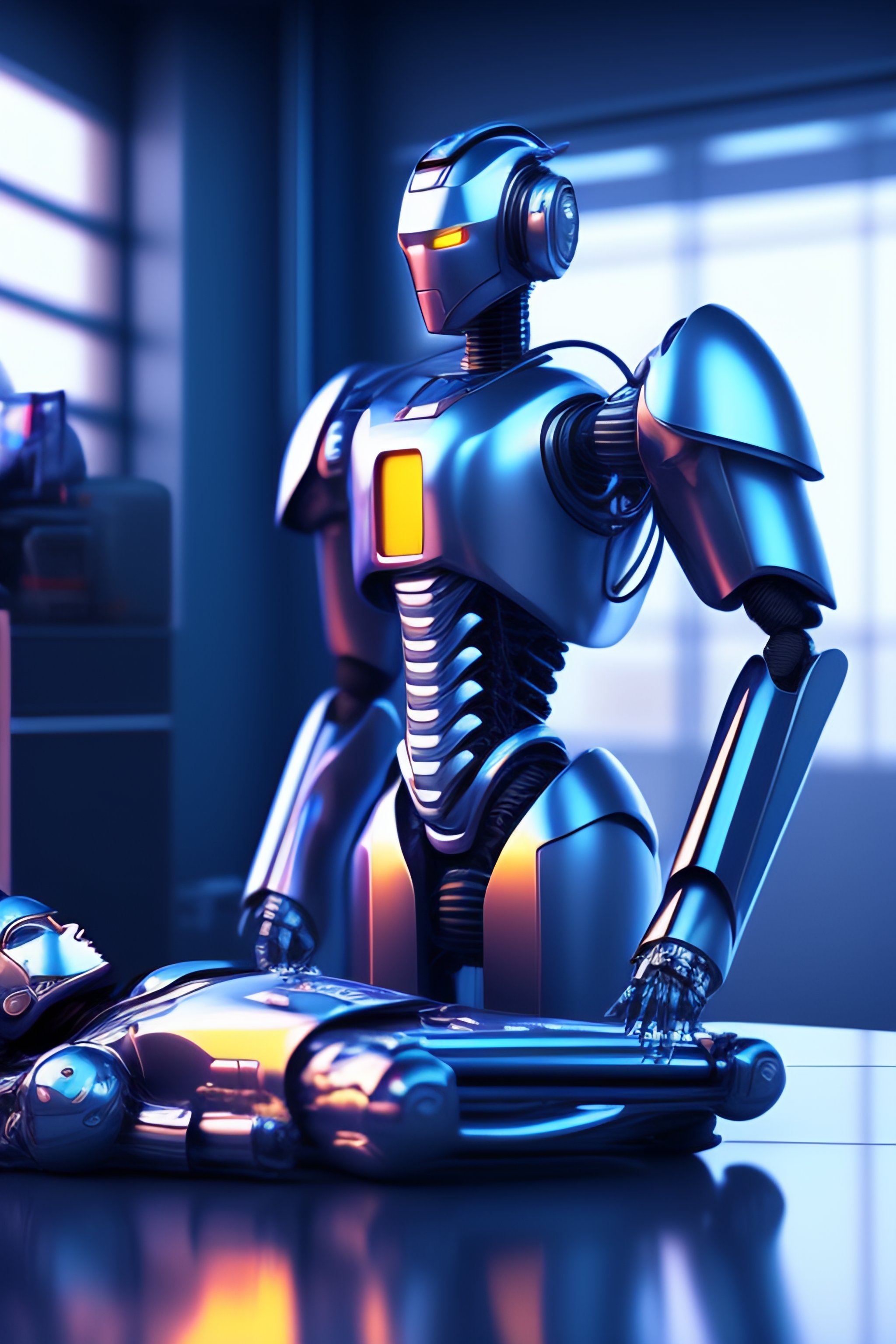 Robot doctor metallic and sophisticated in modern office consultation with patient sick on stretcher and analysis equipment in background, robot center, highly detailed, photorealistic, artstation, sharp focus, detailed painterly digital art style, 8k octane beautifully detailed render, blue tones