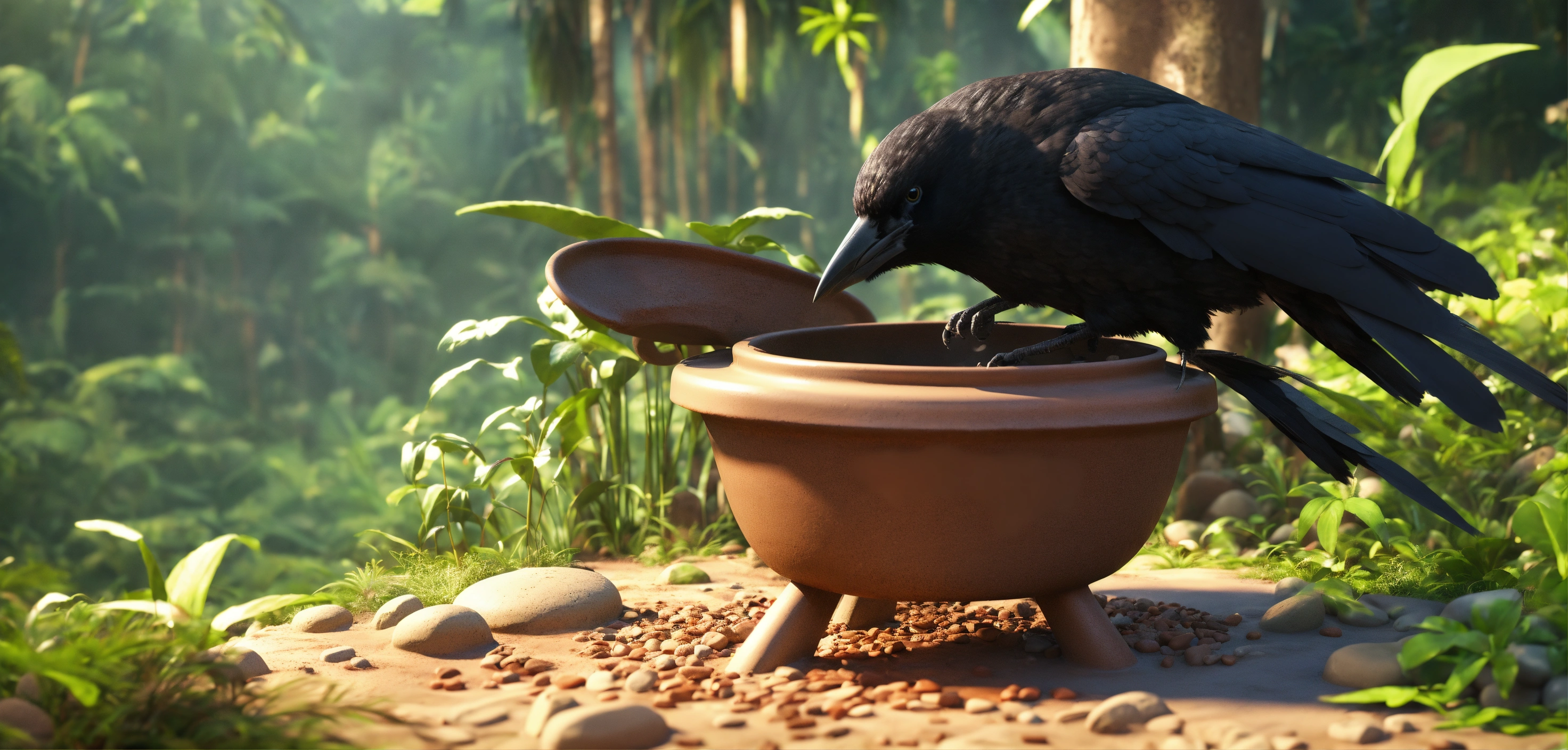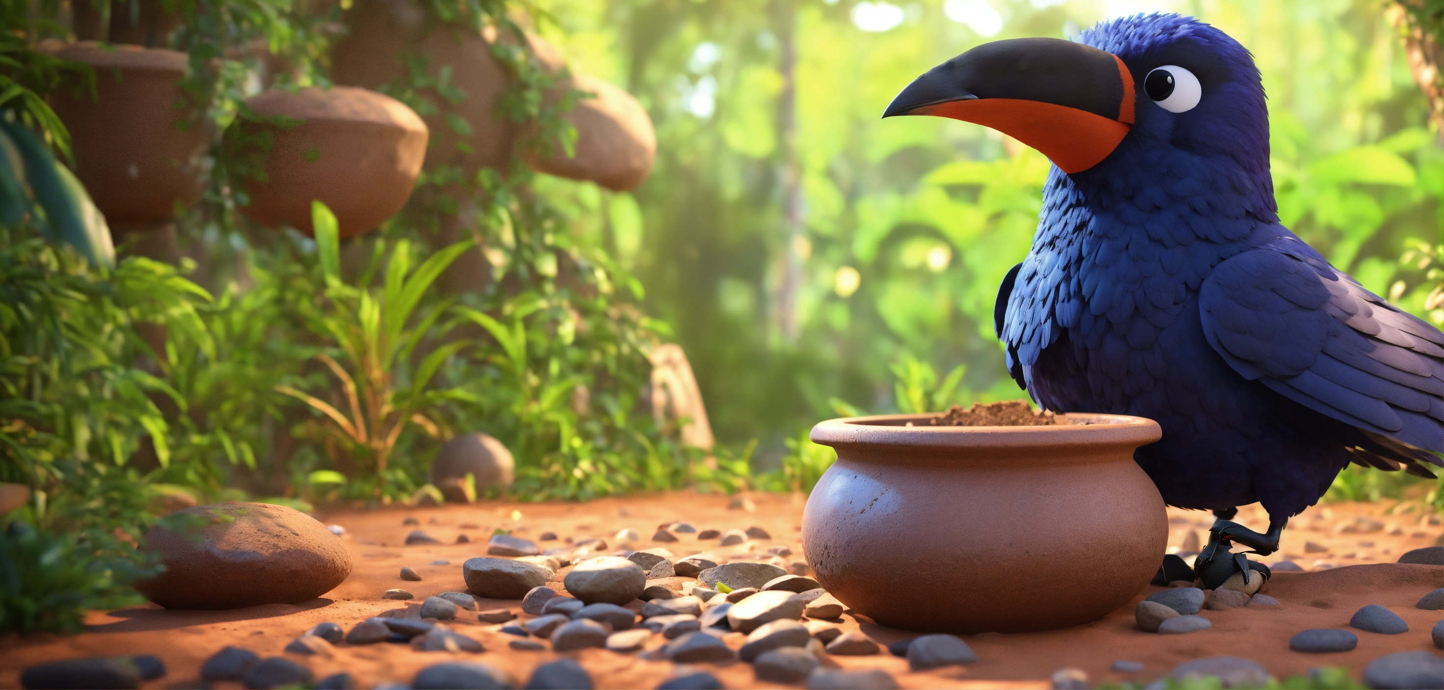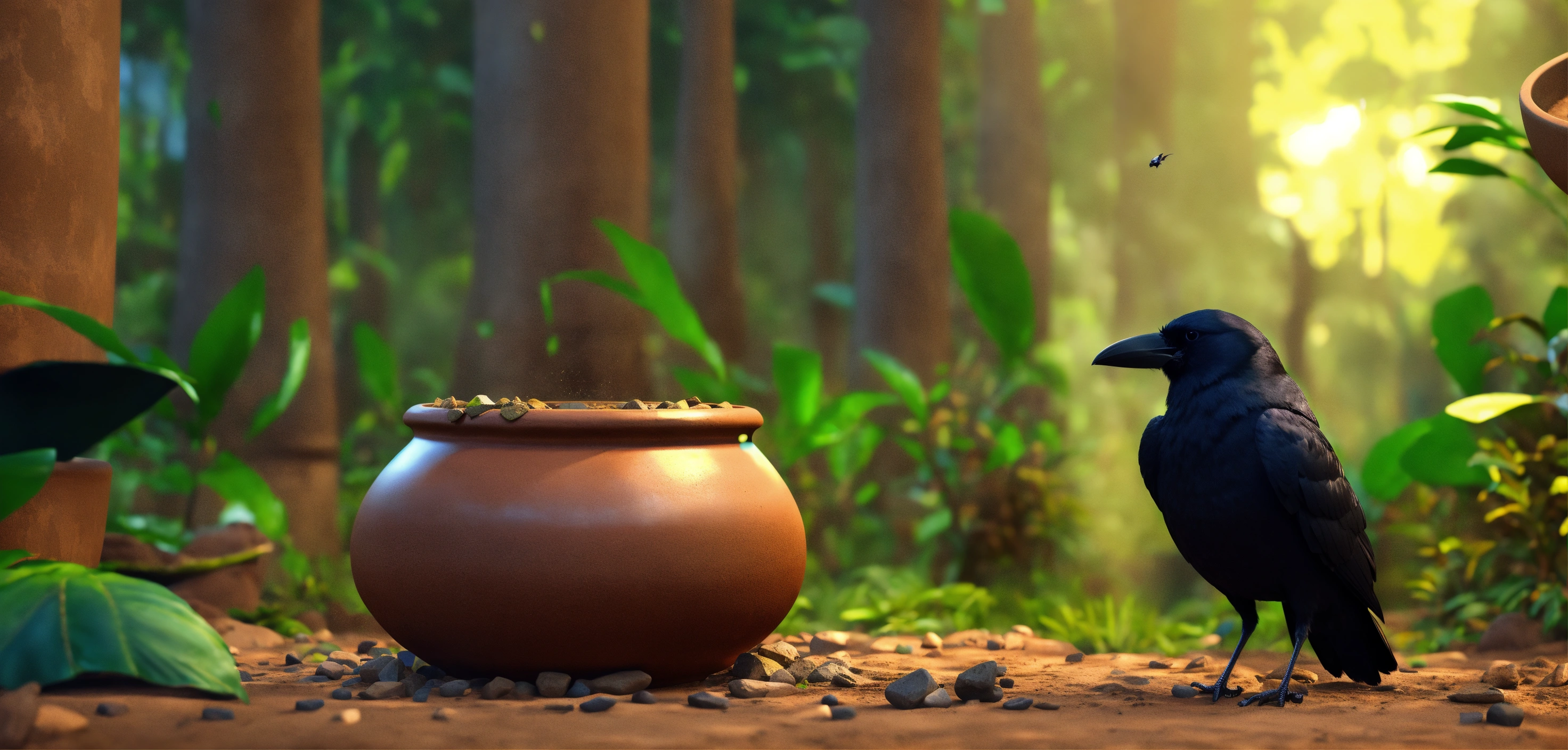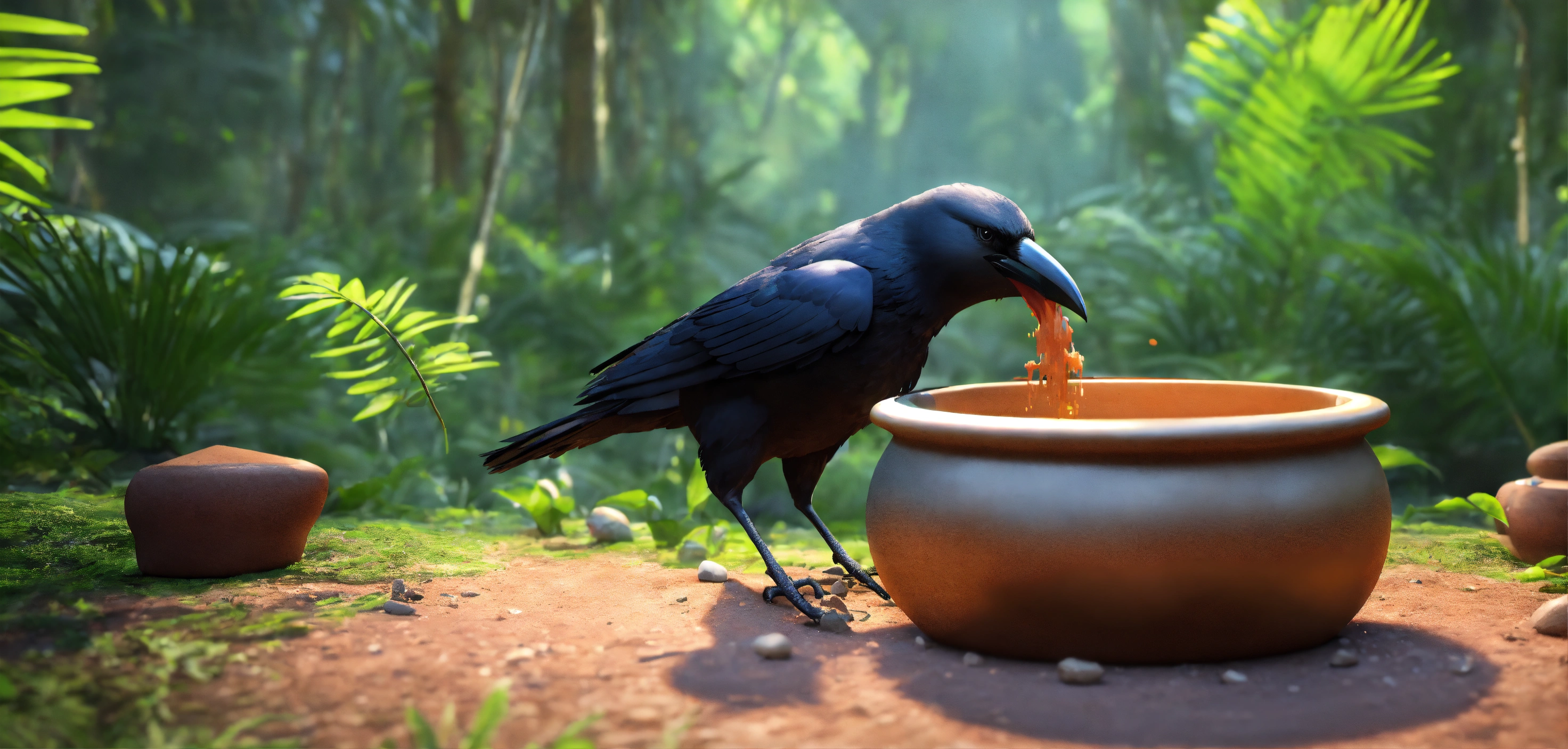 3d animation style crow is putting stone in big clay pot in jungle