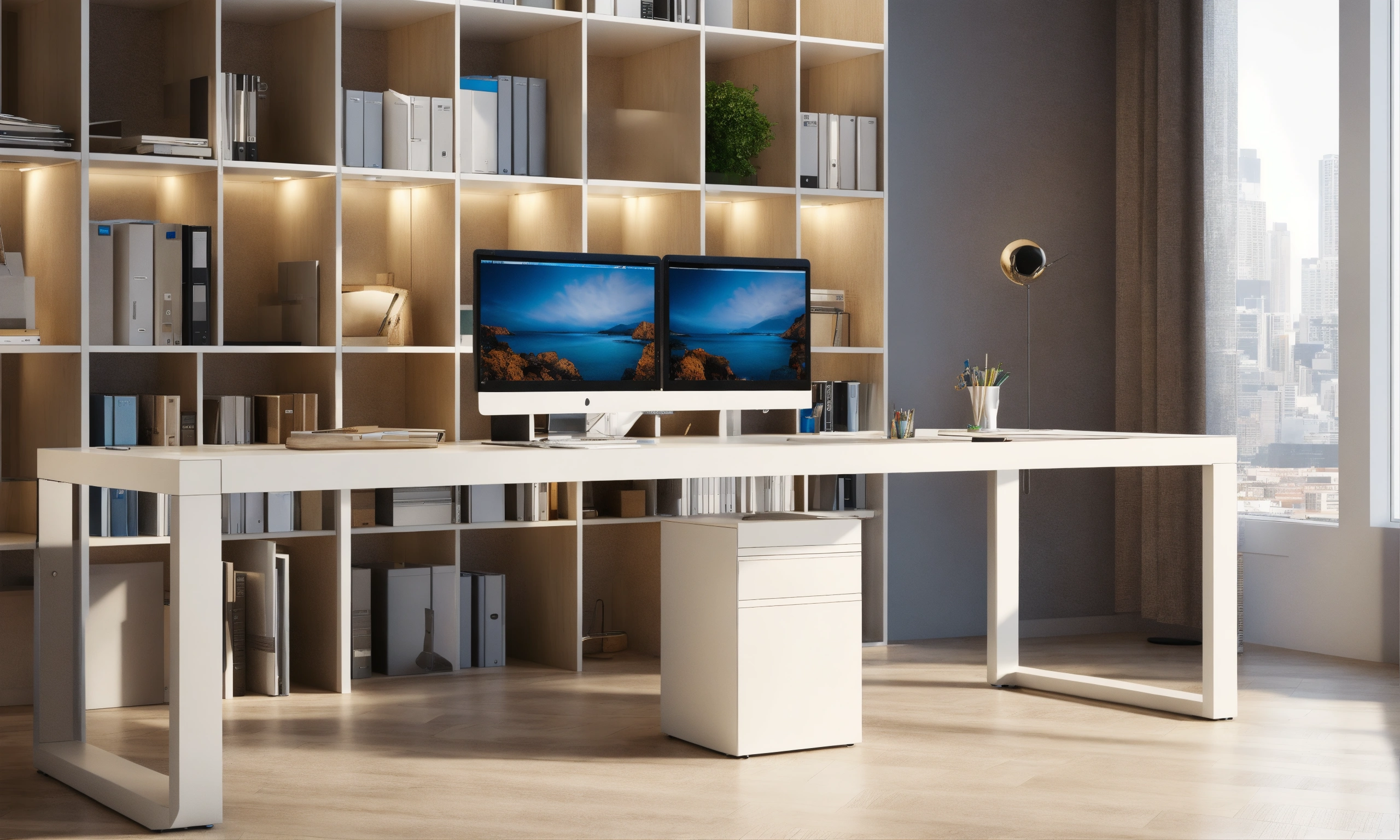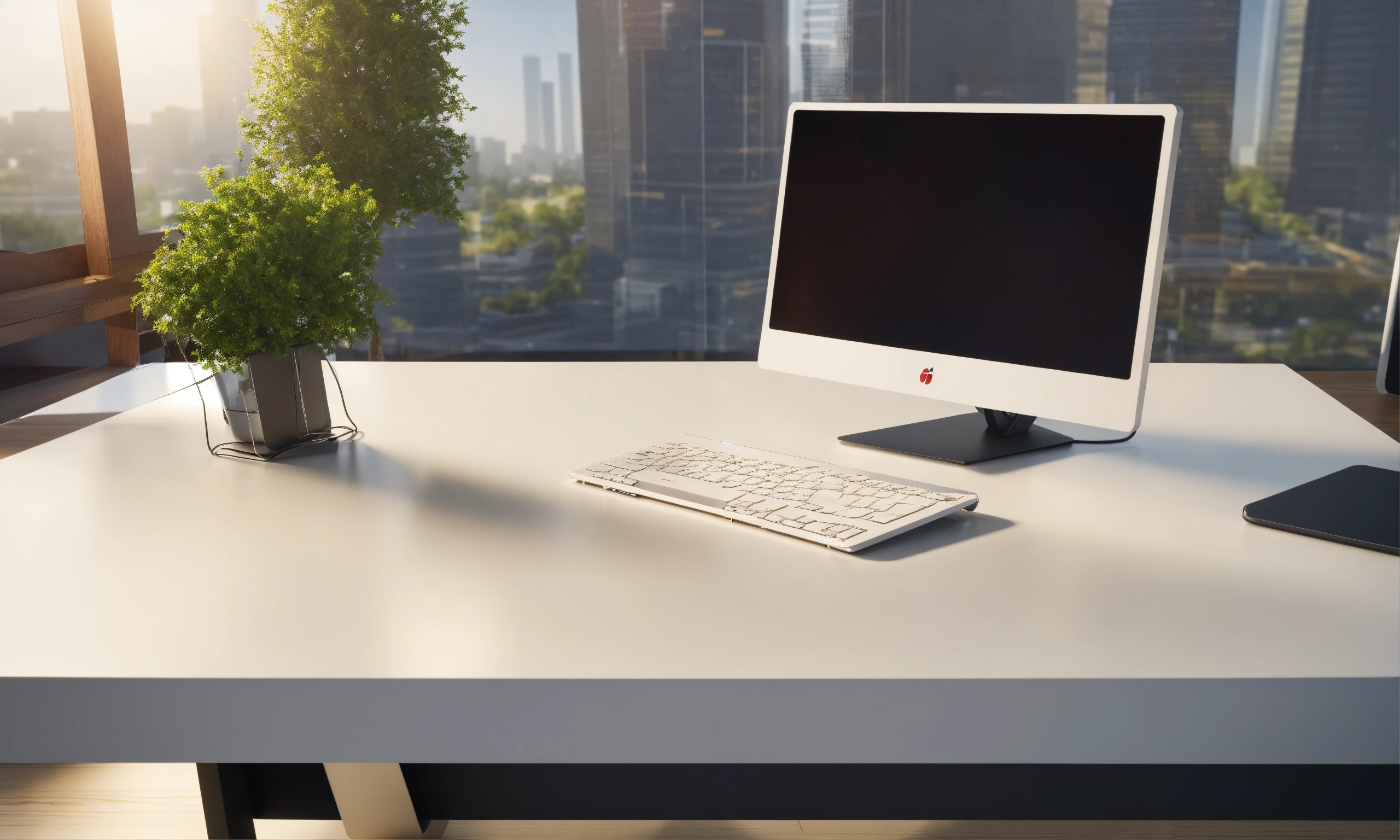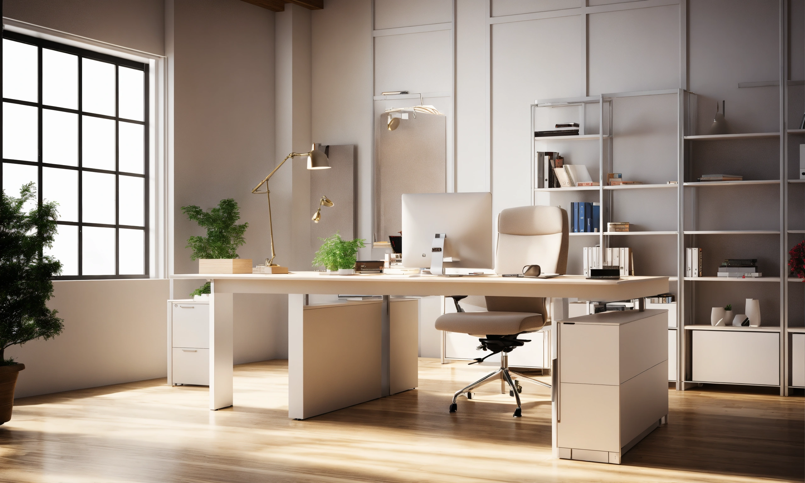 White wood office desk, cubic office, computer, close up, modern, simple, photo-realistic, 8k, high-definition