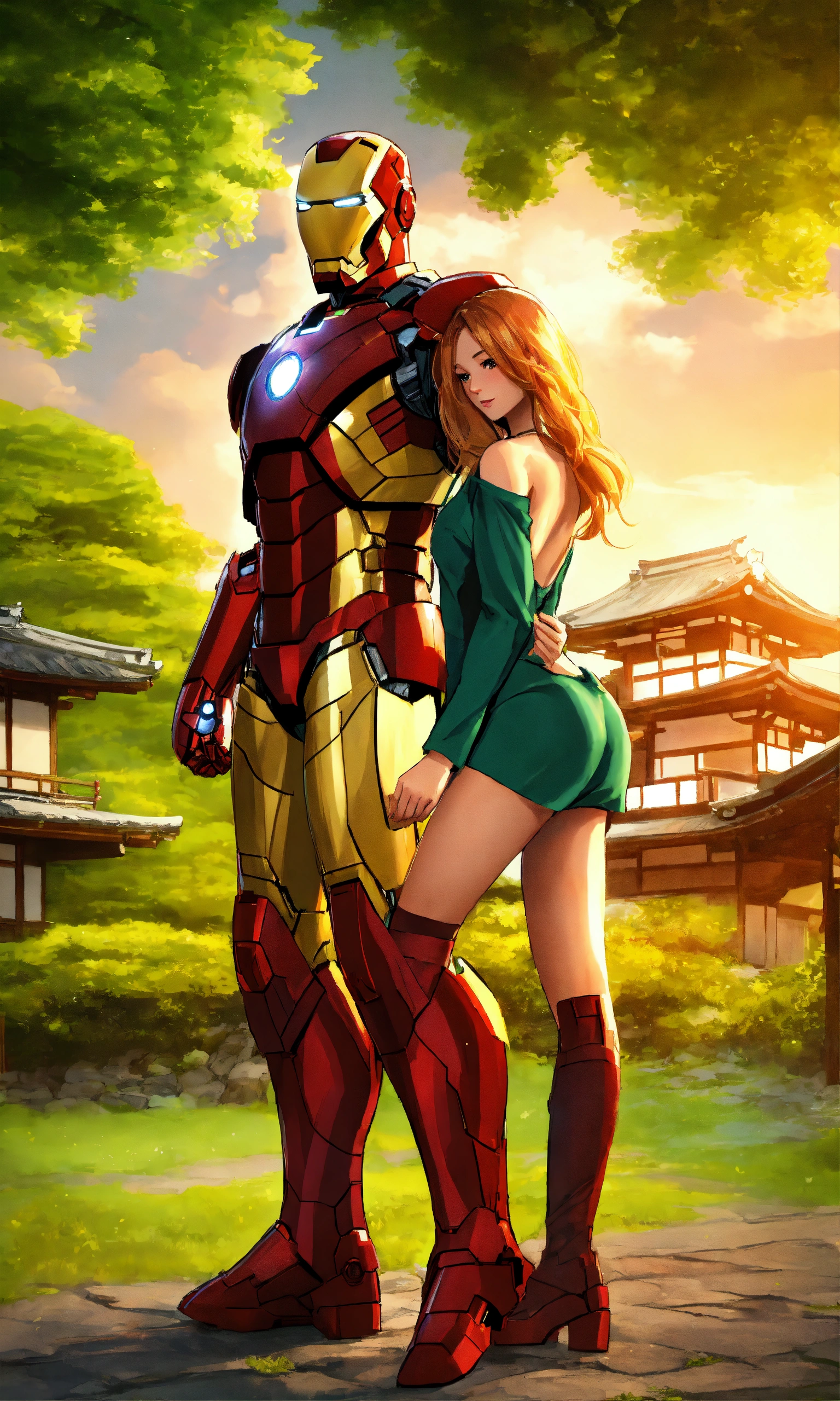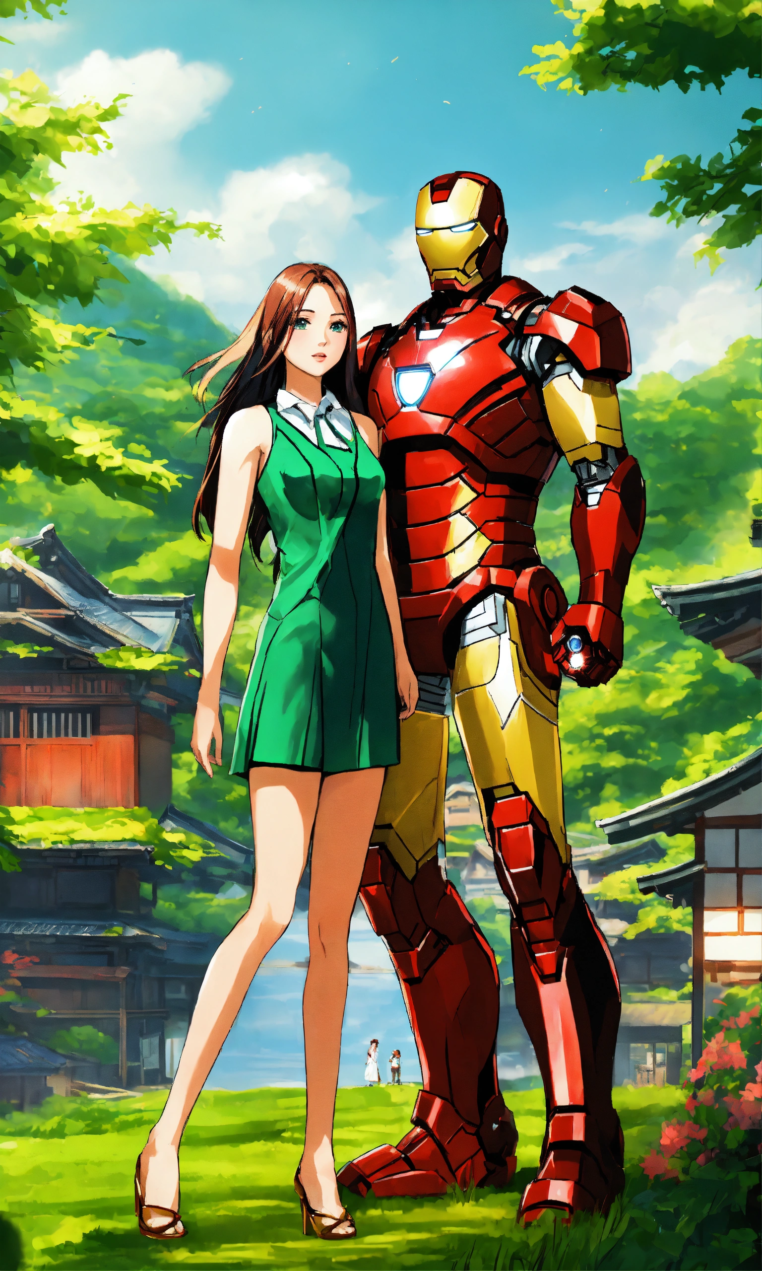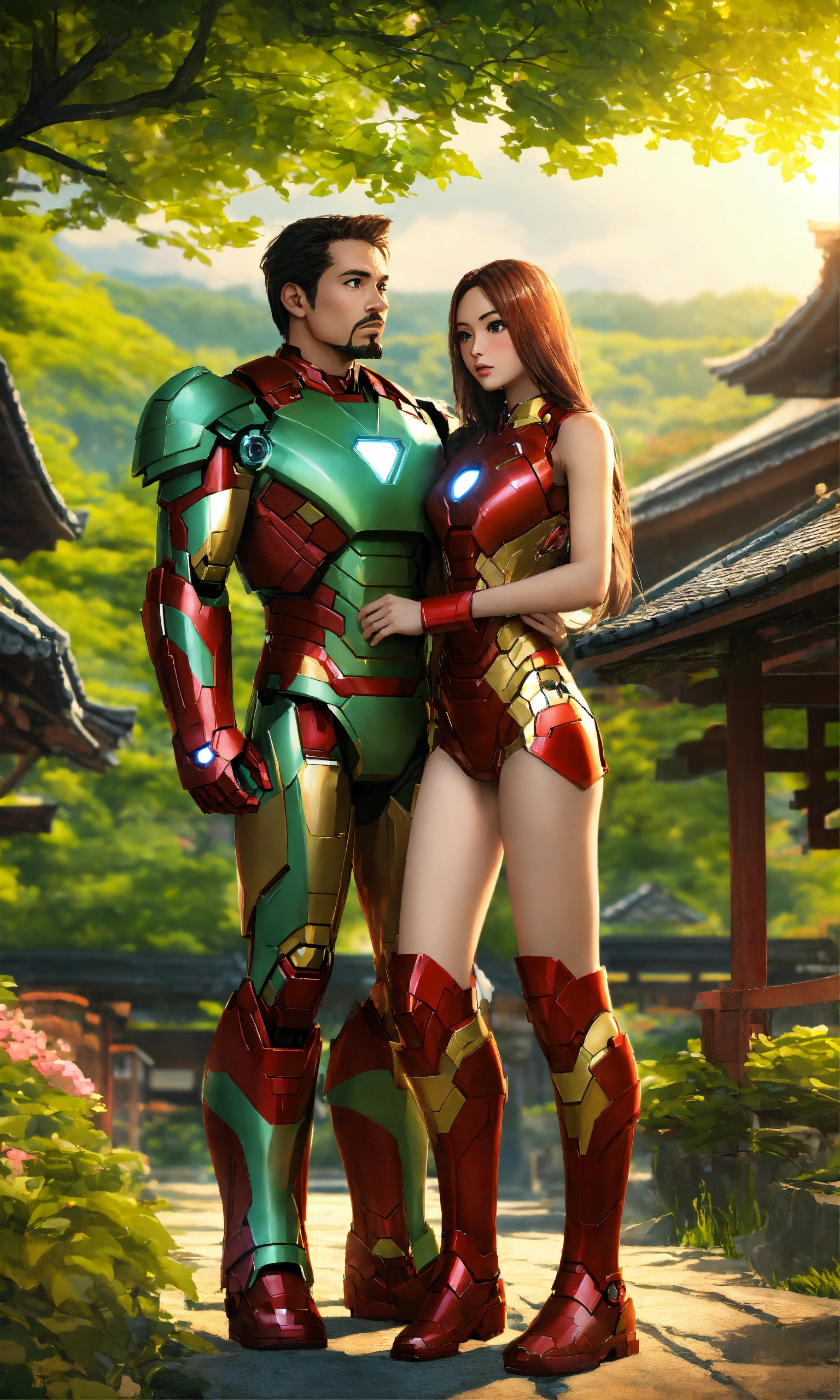 Iron man with his hot girlfriend with long hair in japan beautiful village, 2d render, green nature background, standing, full-body view, both doing romance
