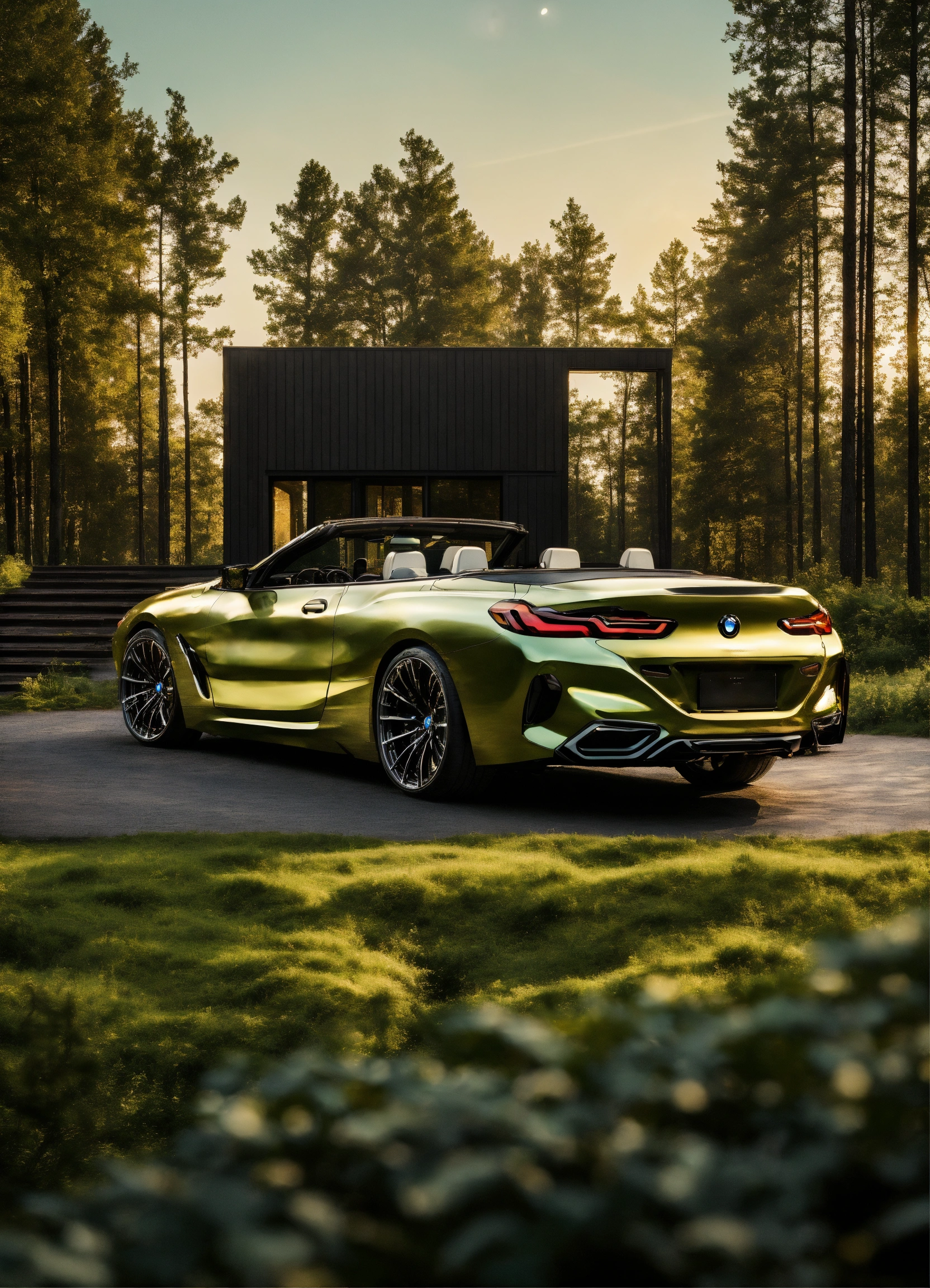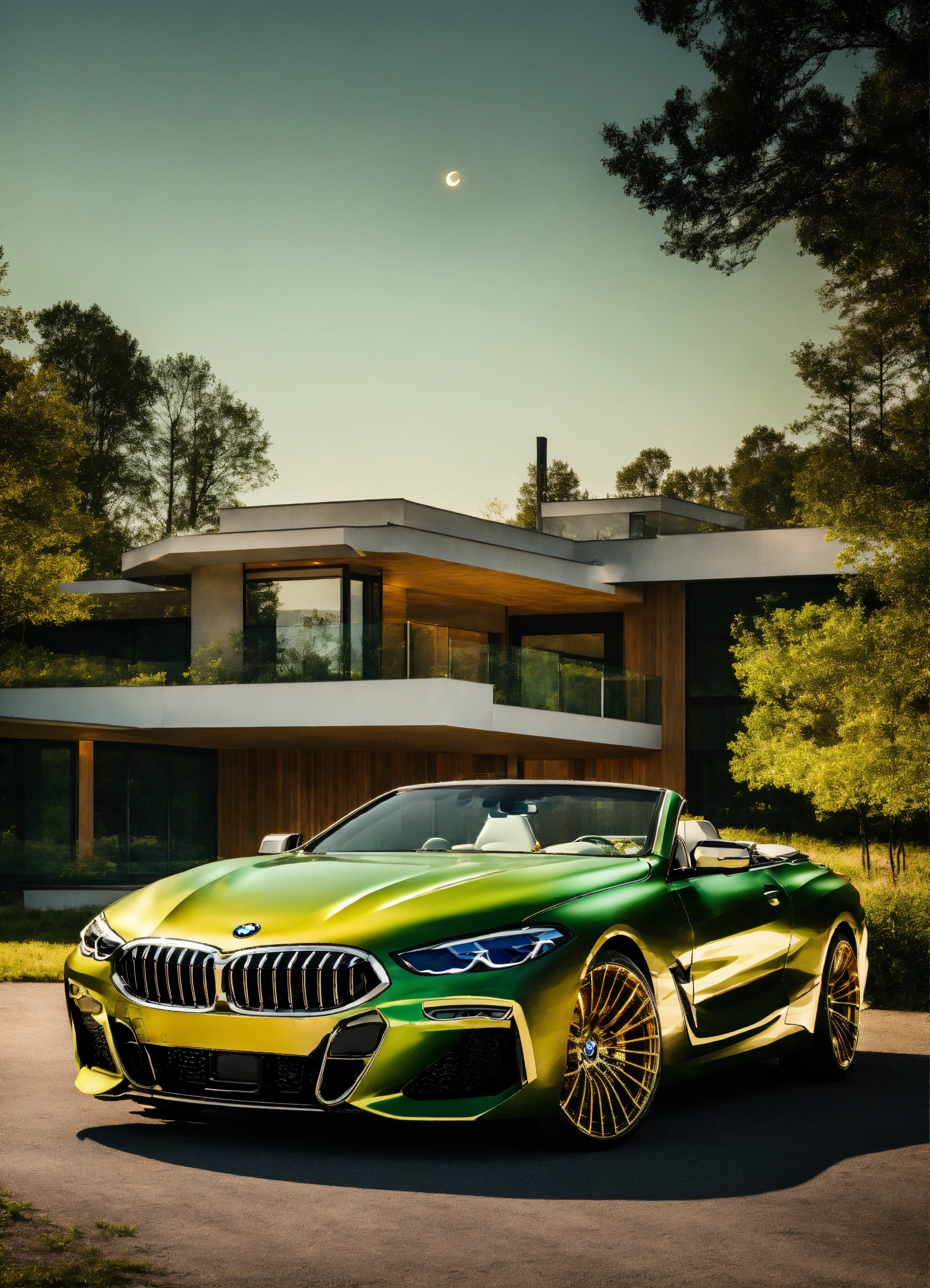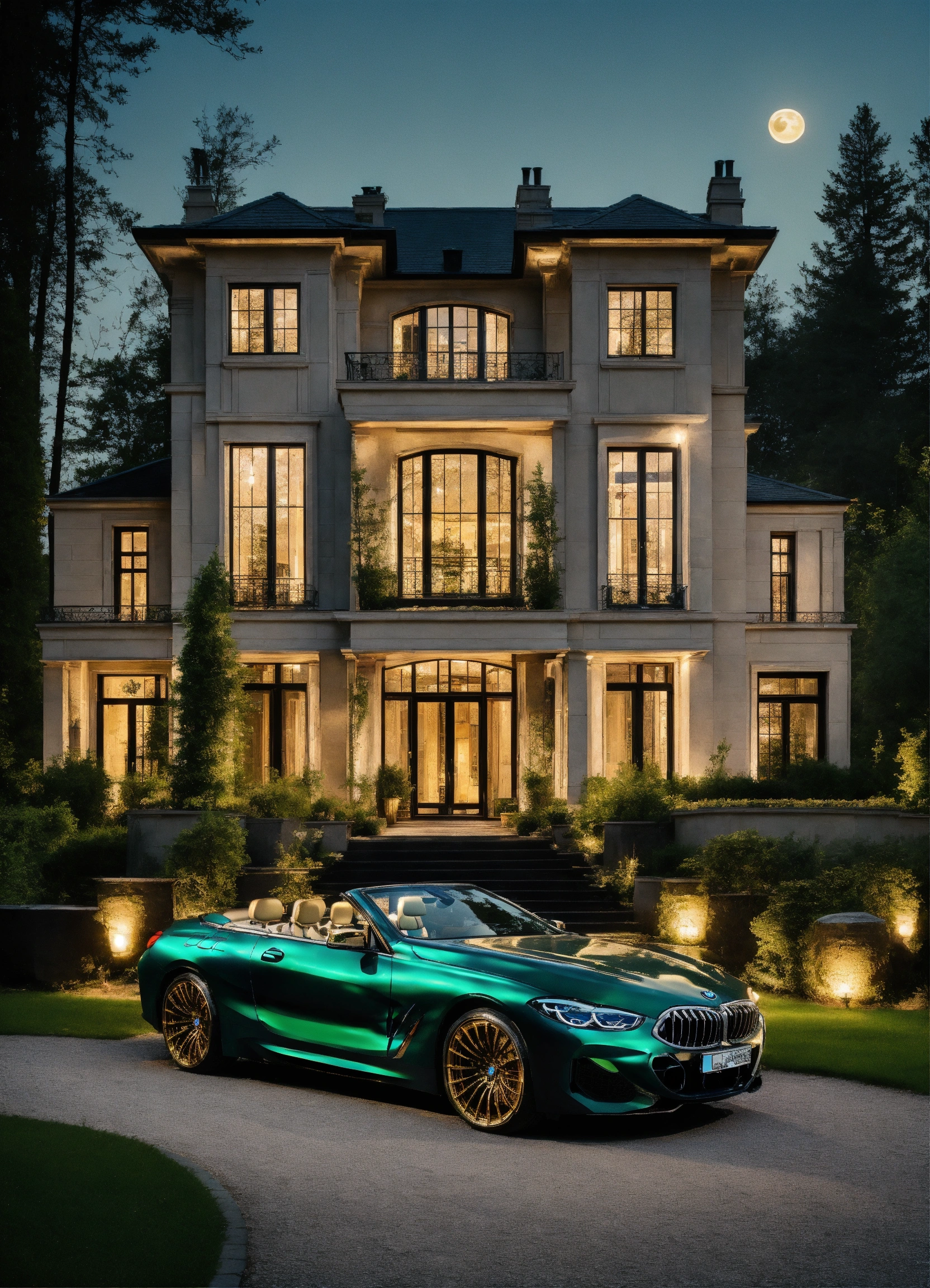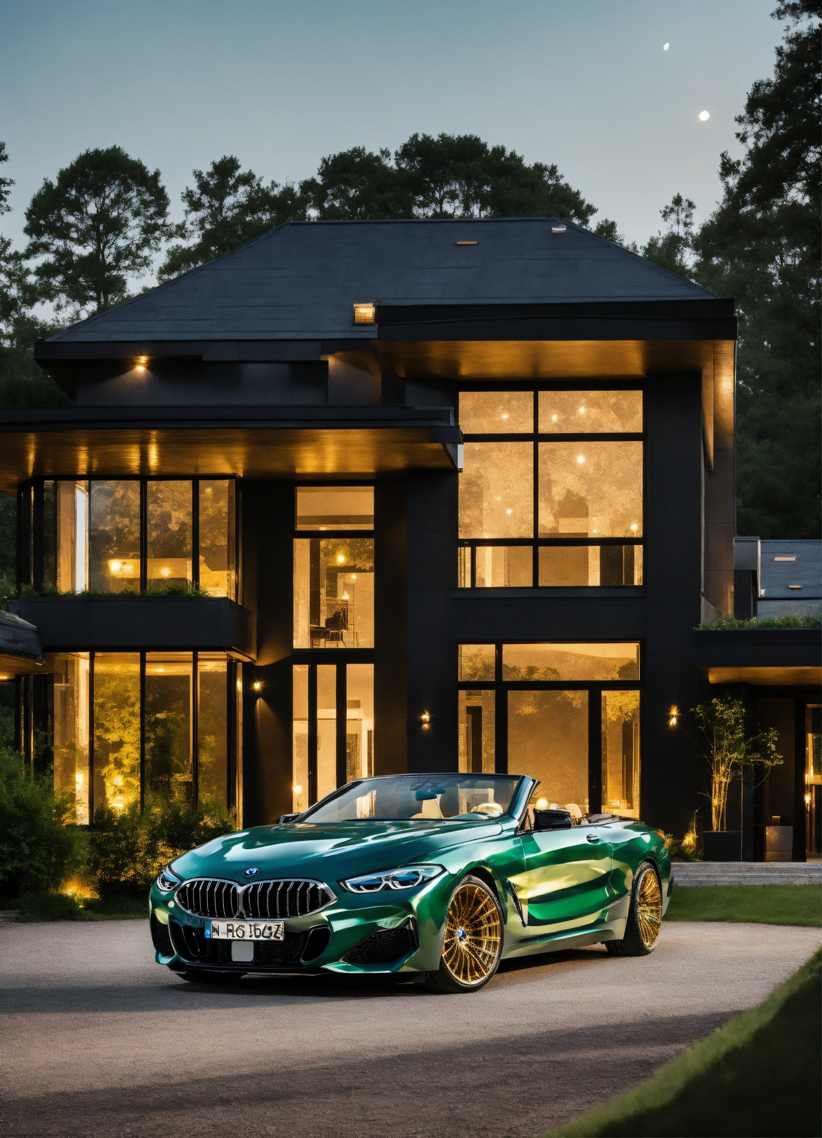Contemporary mansion with woodland background and golden moonlight with bmw 850i convertible with custom wheels black and gold and green landscape