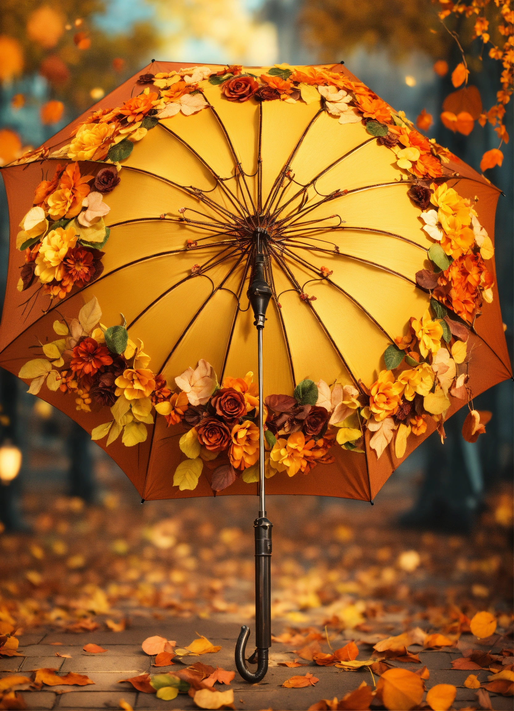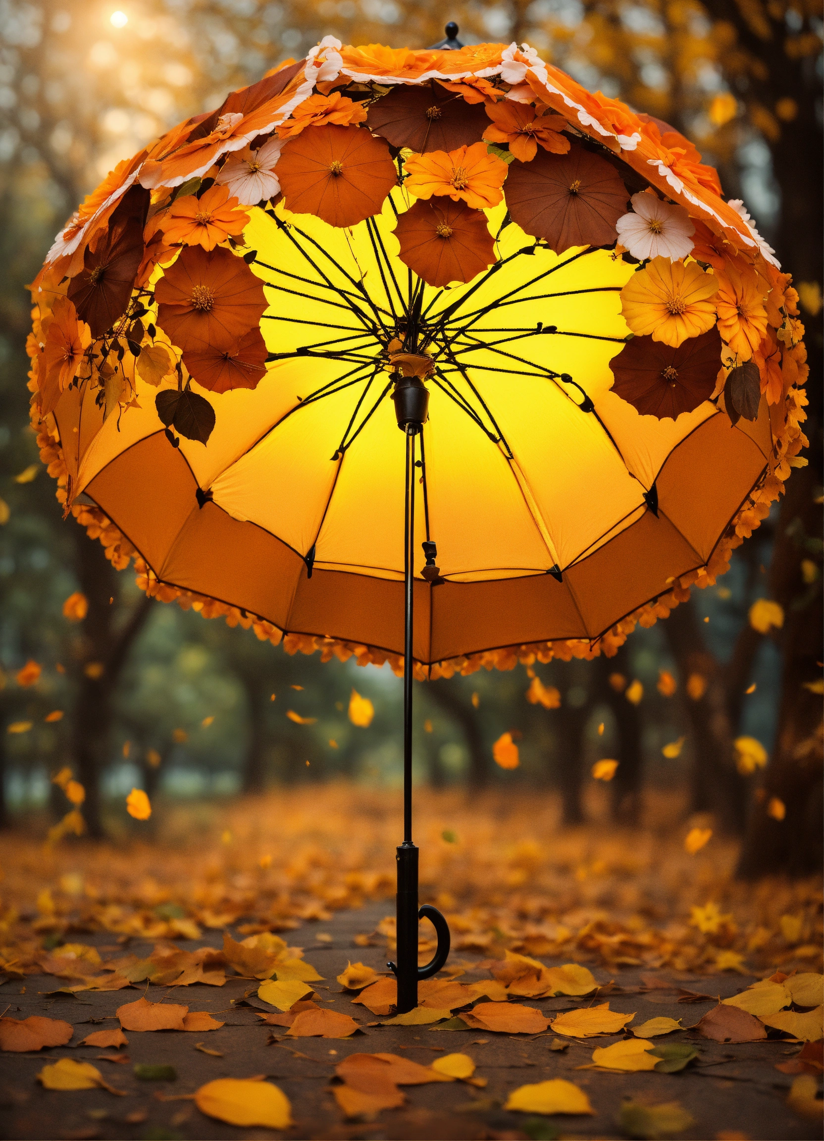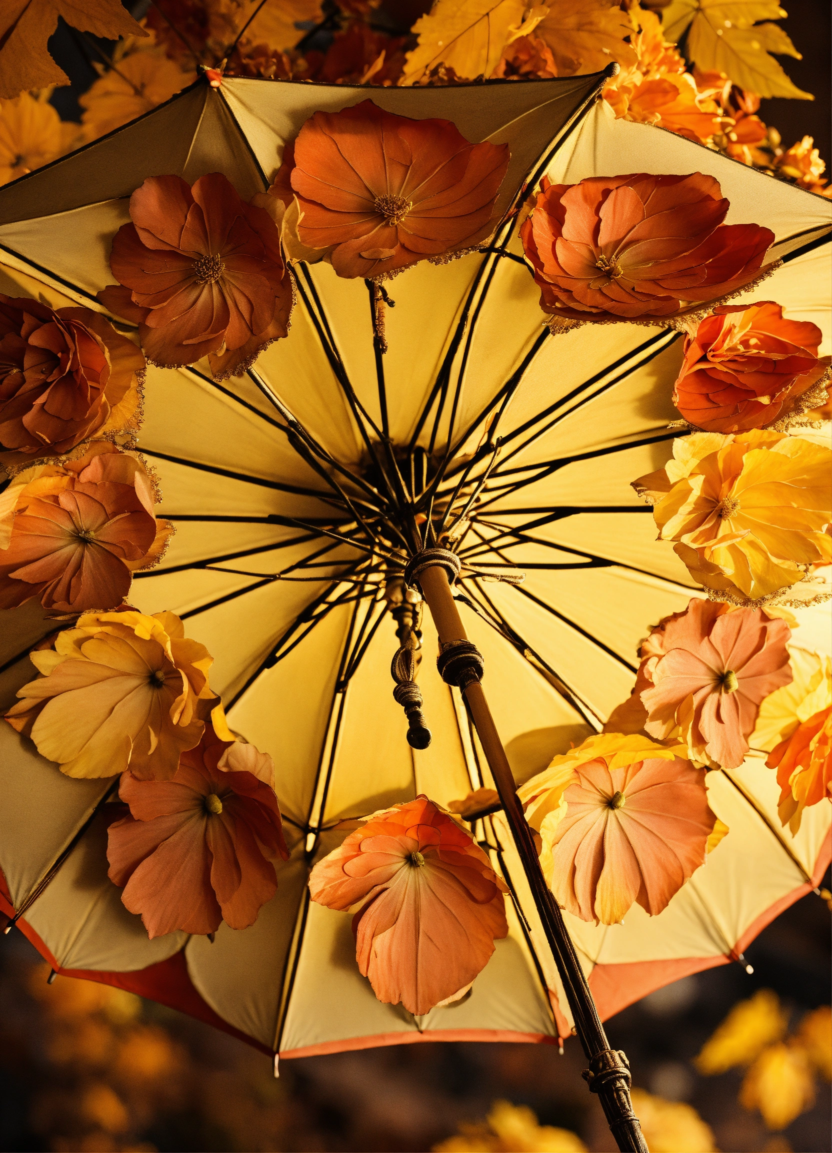 Vintage umbrella decorated all around with three-dimensional flowers and leaves in orange, brown and yellow colors, beautiful and pleasant lighting. autumn