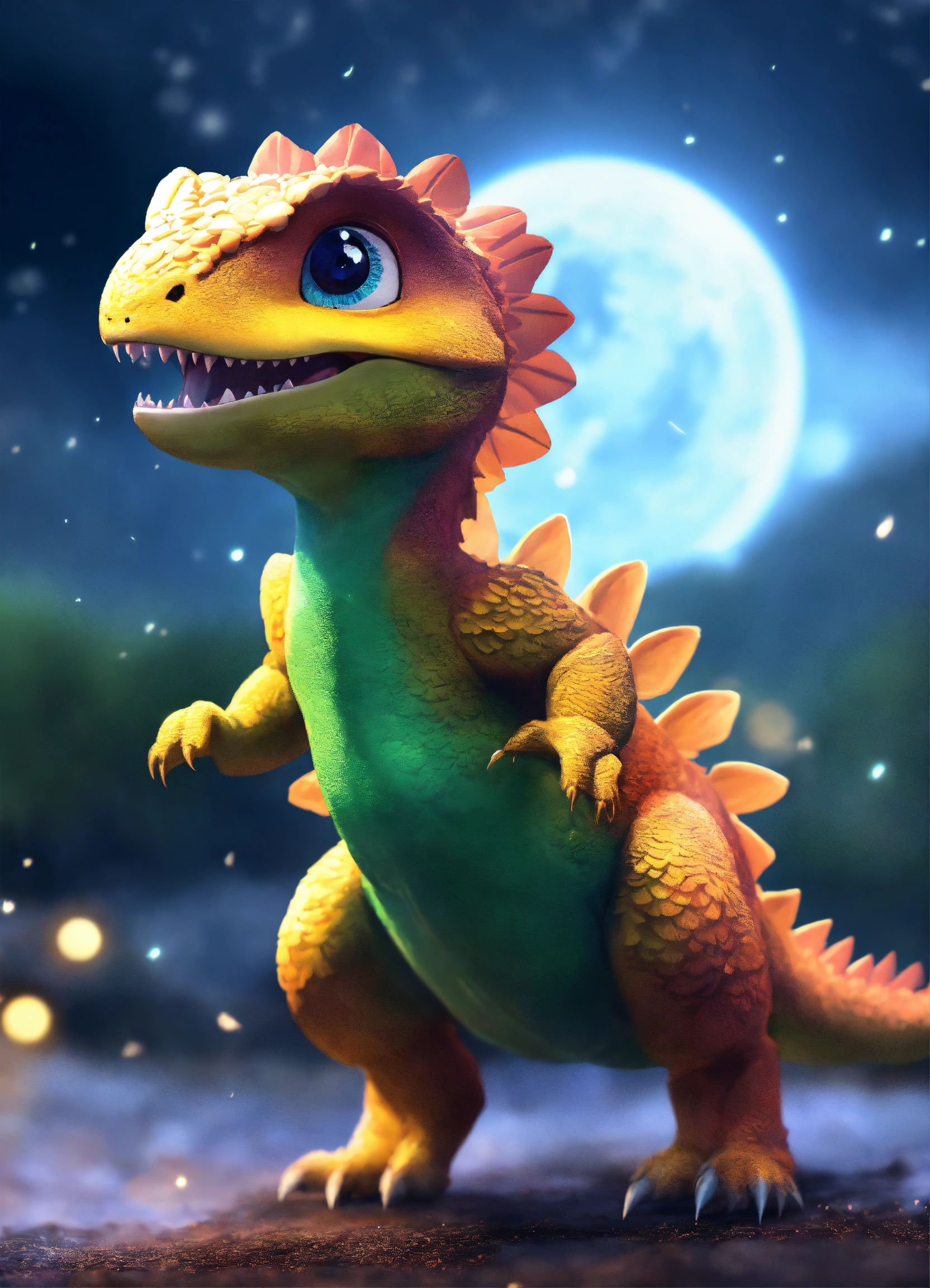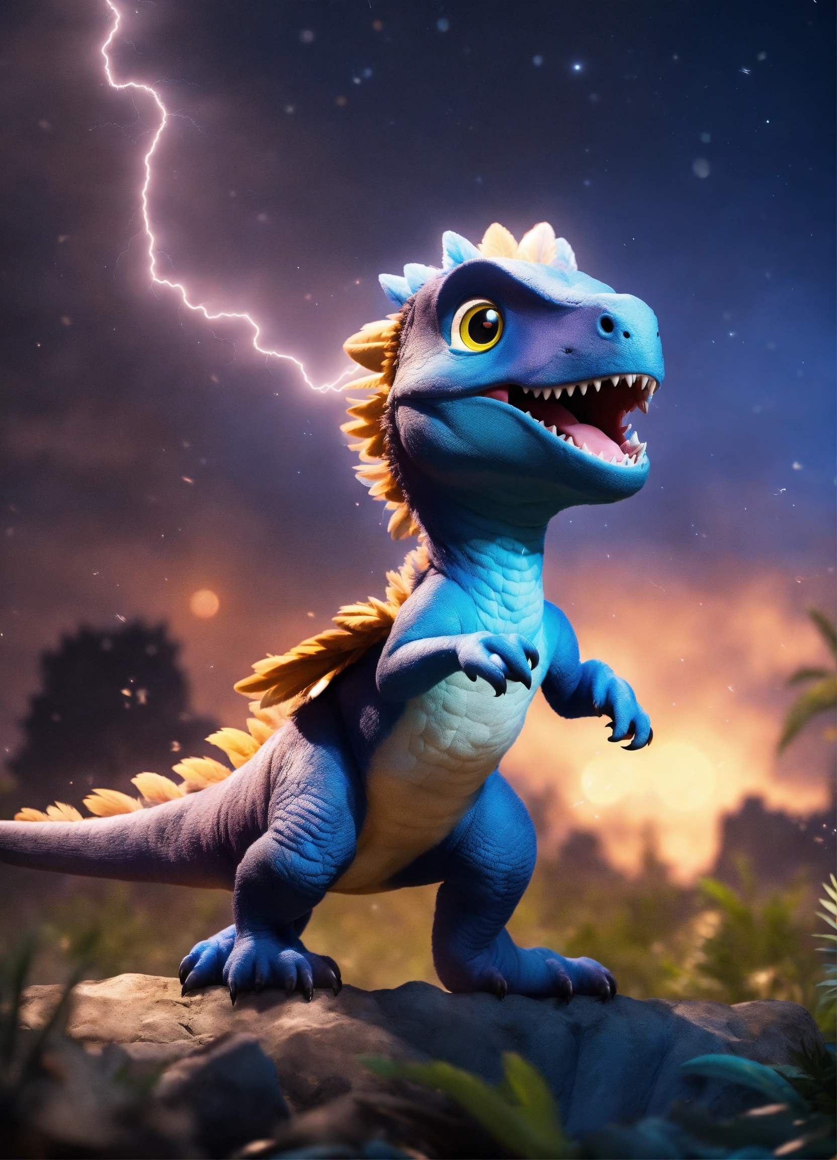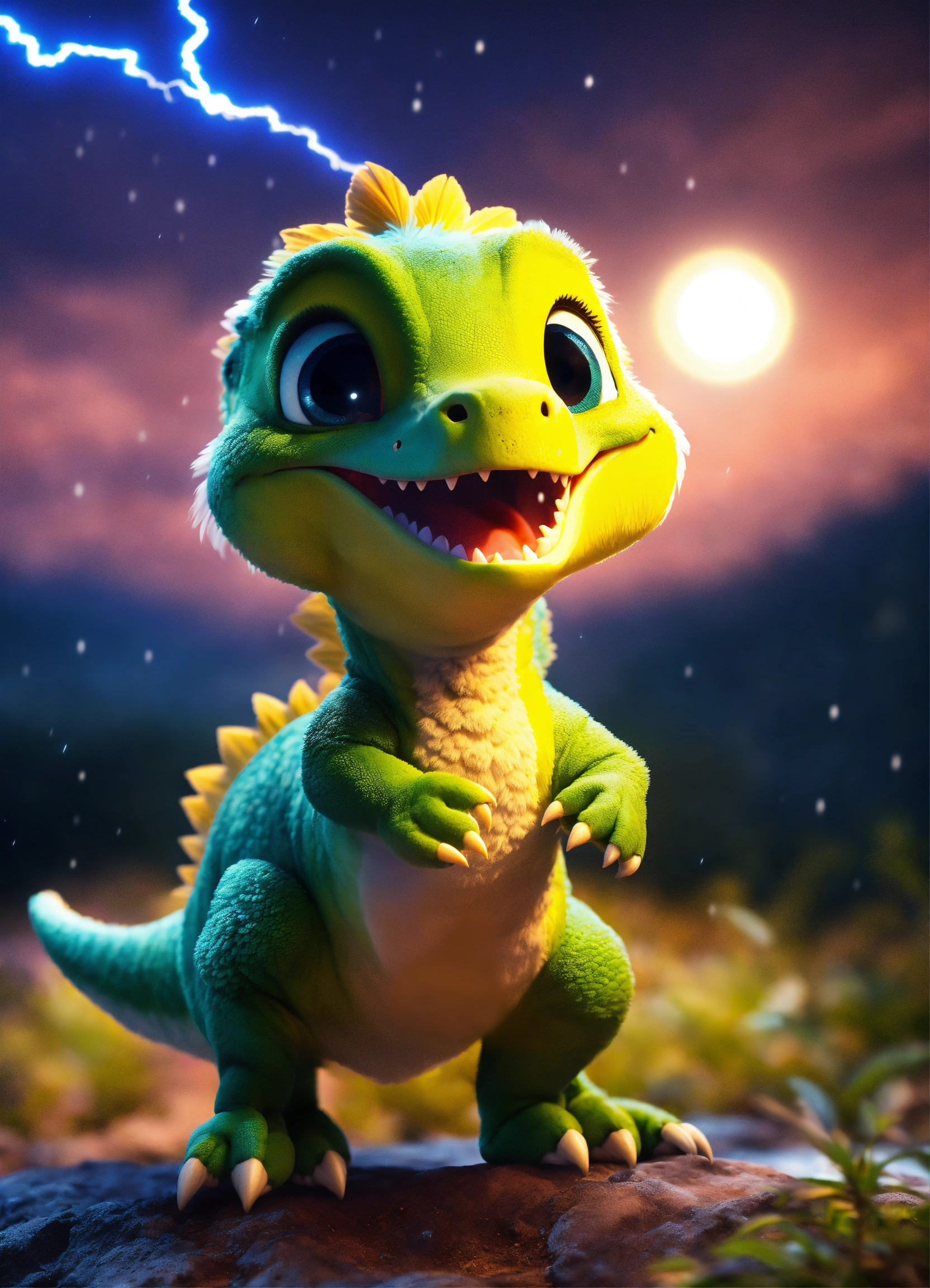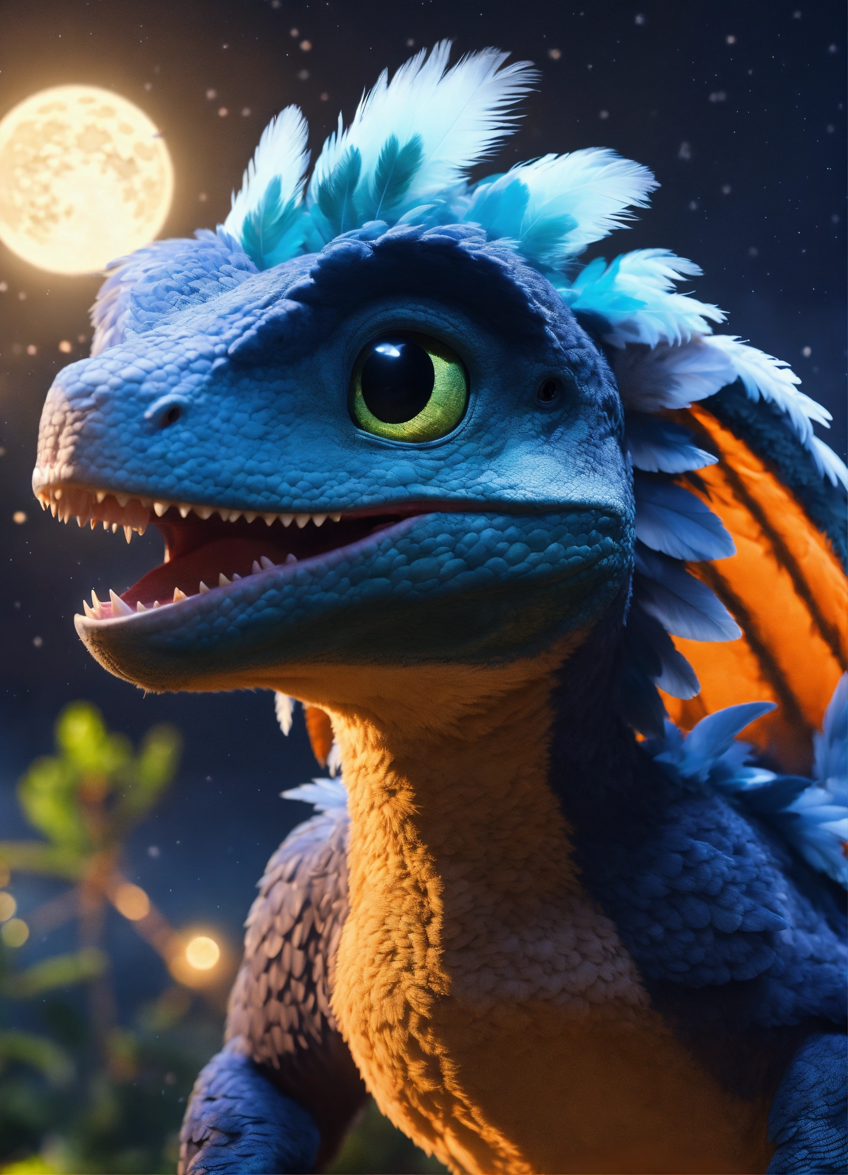 An adorable and fluffy baby dinosaur with big color eyes, roaring, with soft feathers and wings flying, by night, thunder lightning, full moon background, with blur background, high quality, 8k
