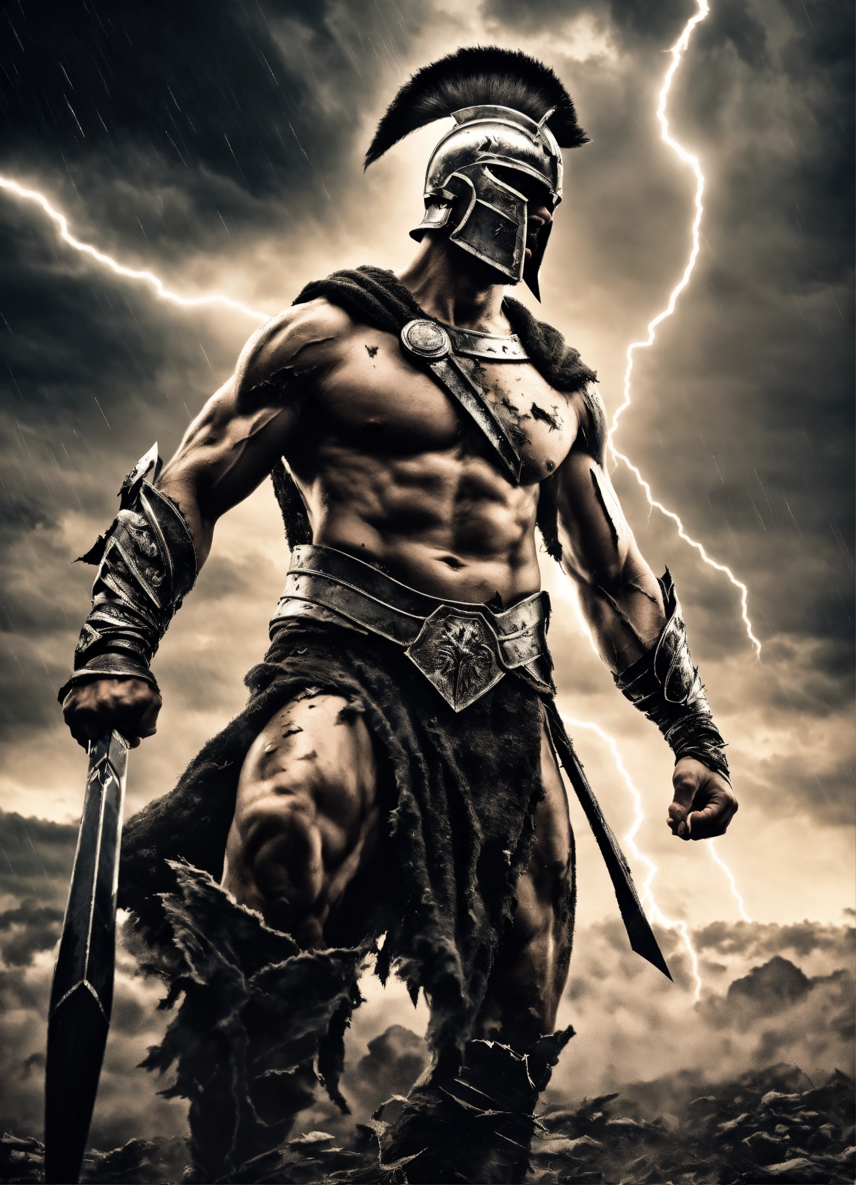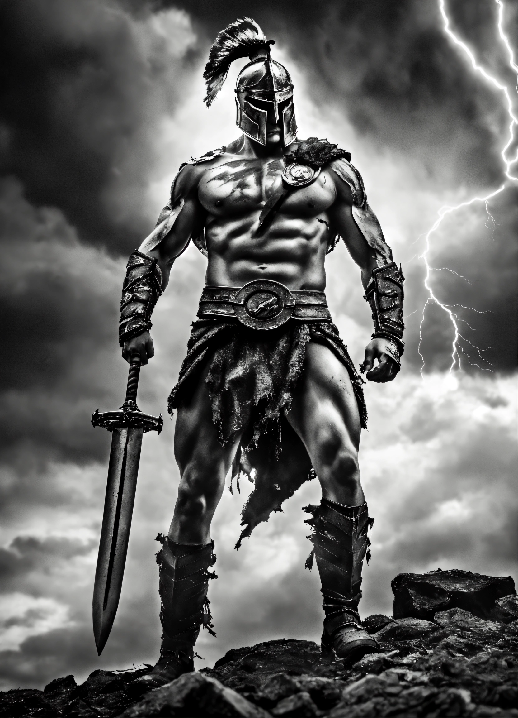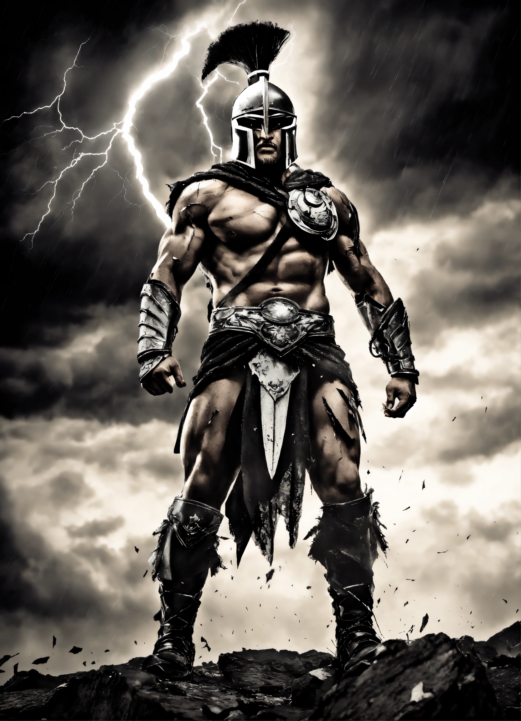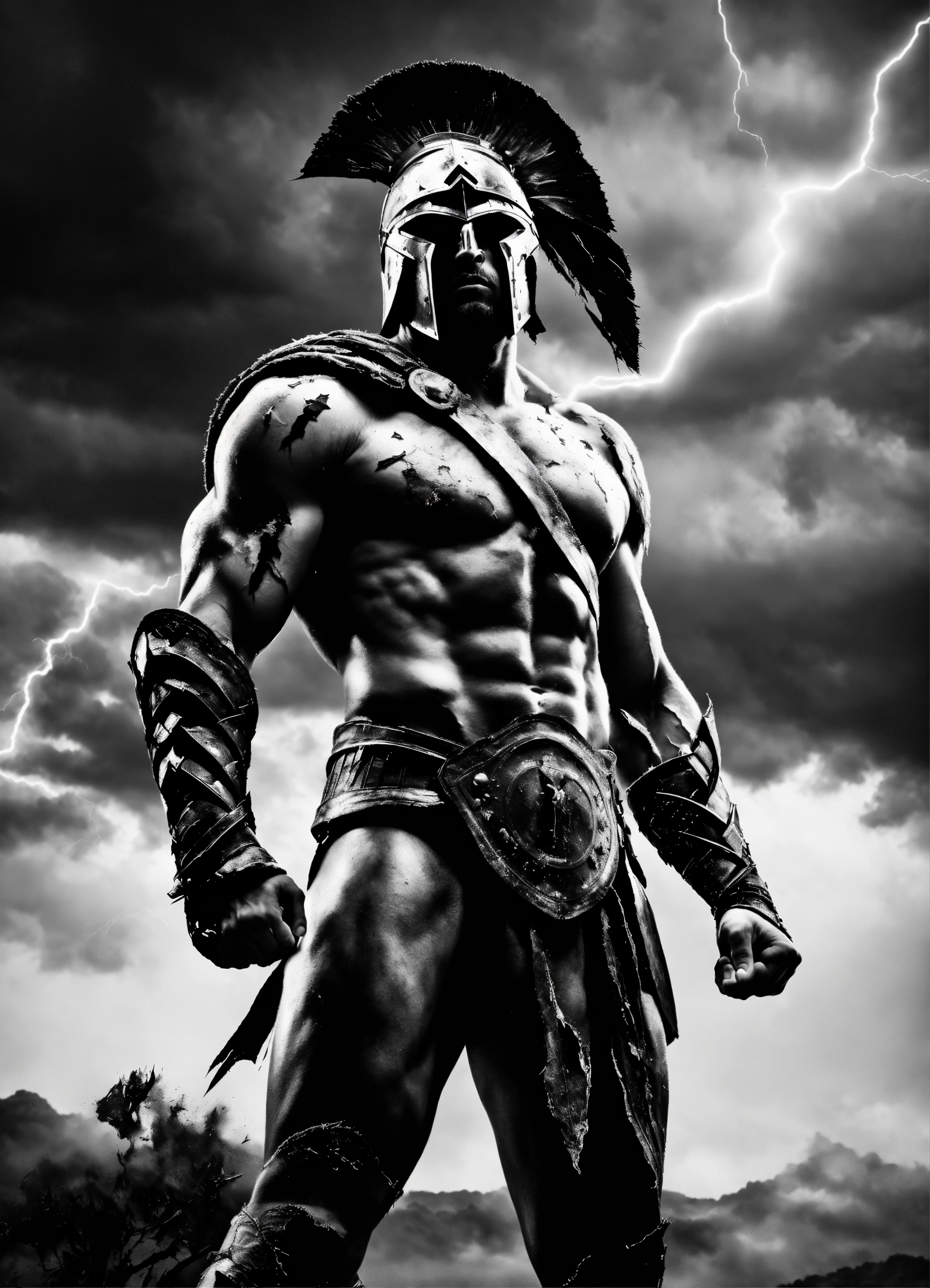 Black and white illustration, wide angle environmental full body shot of spartan warrior, standing firmly, dangerous, with lightning and clouds swirling around him, action shot, tattered torn shirt, porcelain cracked skin, (vibrant, photo realistic, realistic, dramatic, dark, sharp focus, 8k).