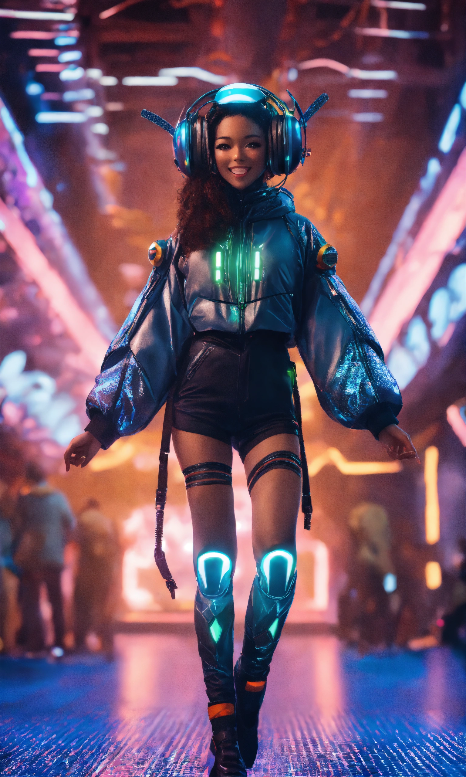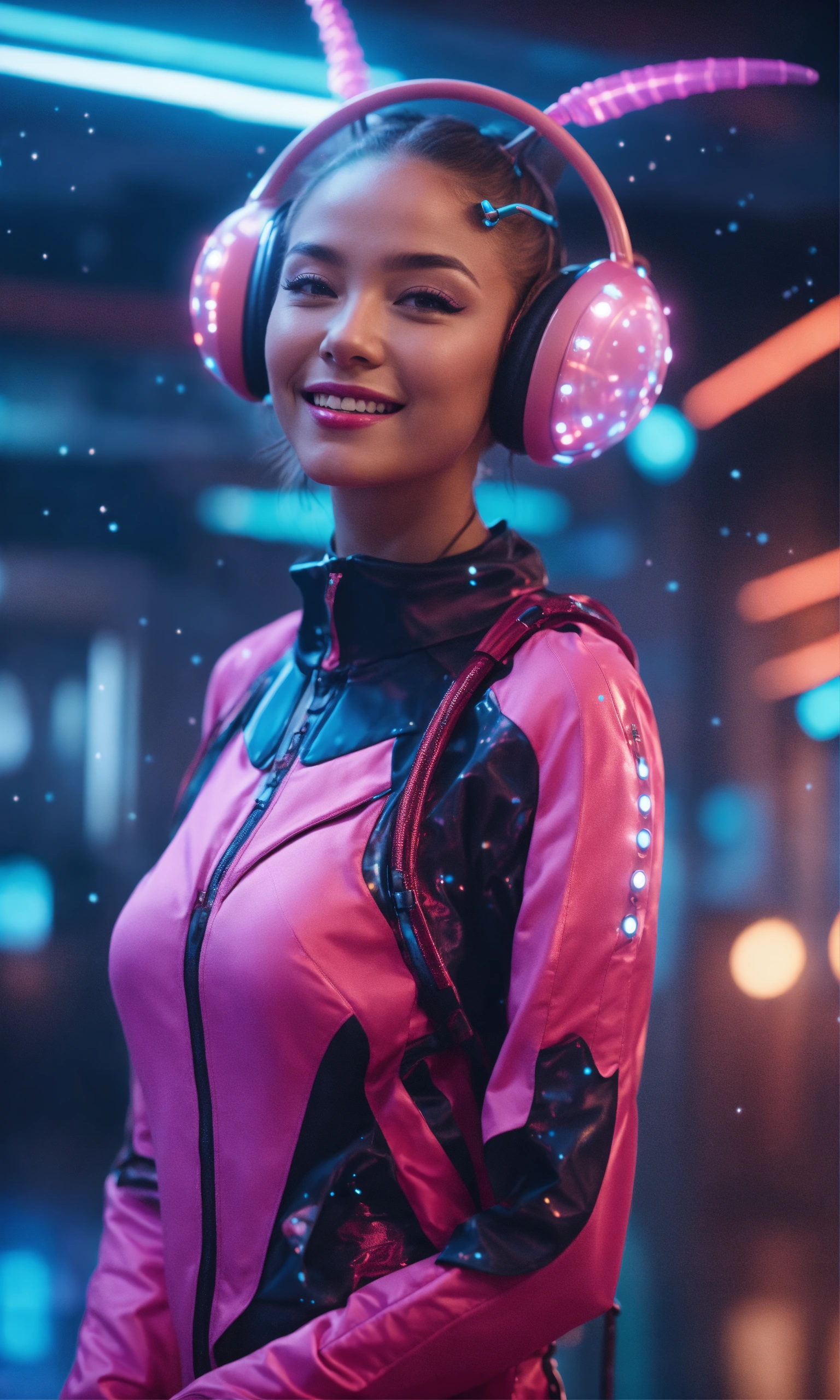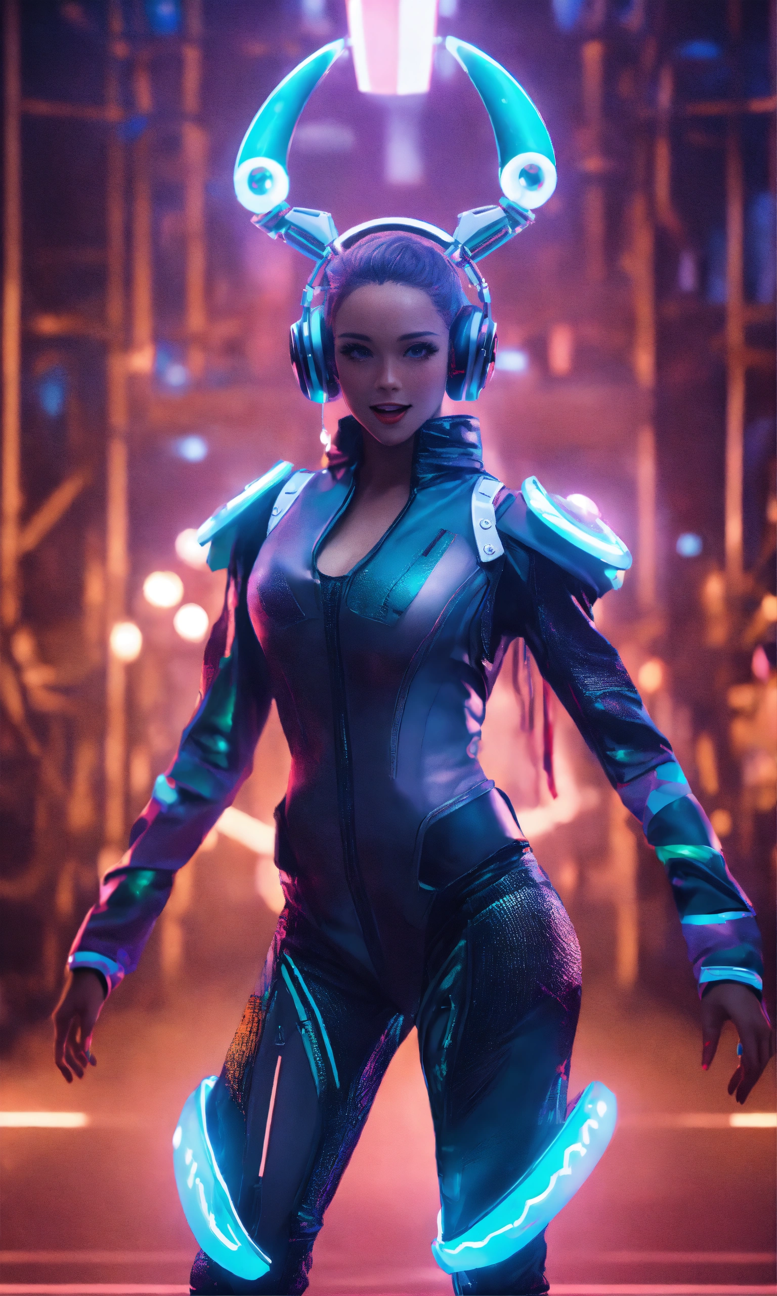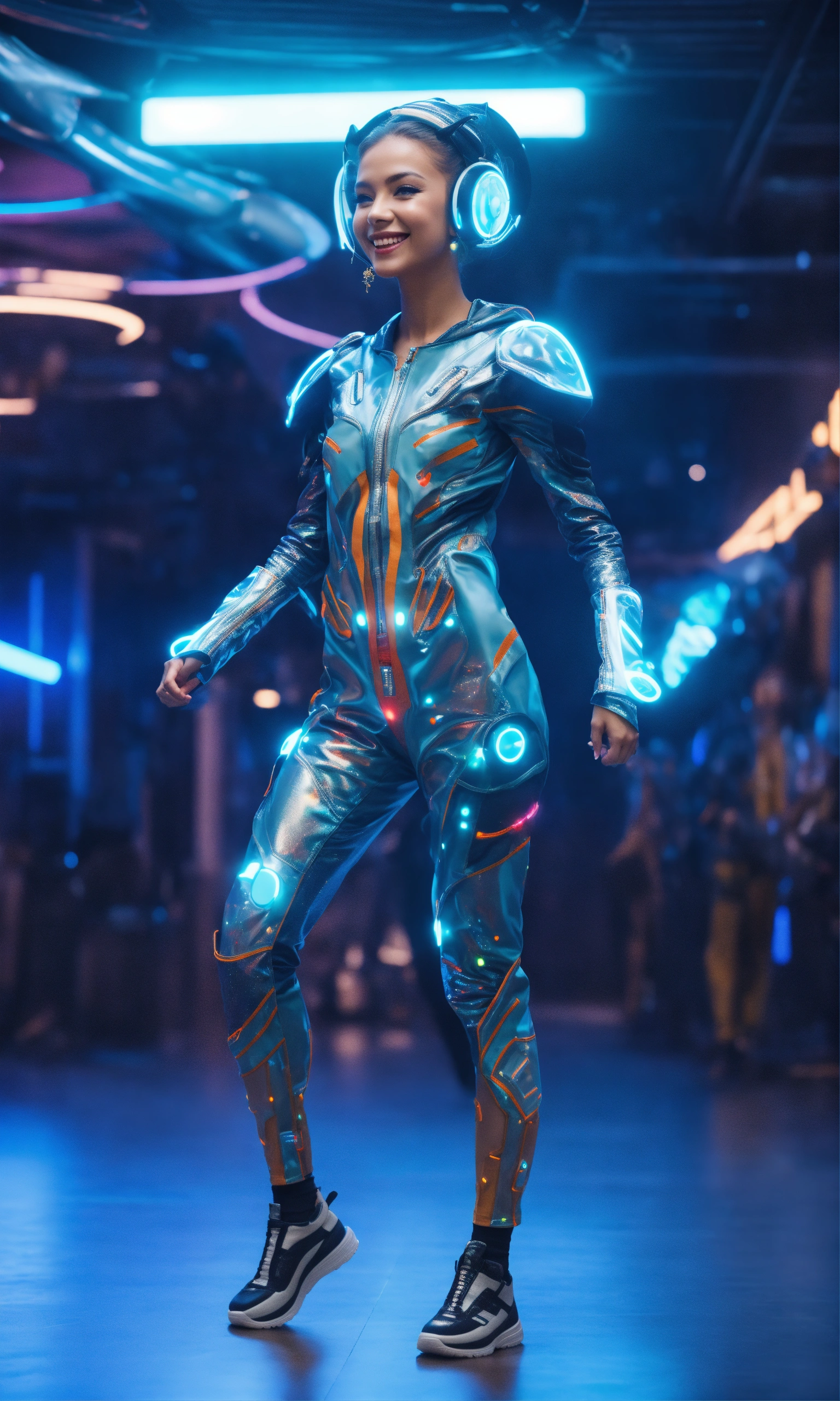 Full body of a beautiful happy girl dancing wearing detailed alien ear antennas with futuristic clothing, futuristic, sci-fi, realistic, 8k