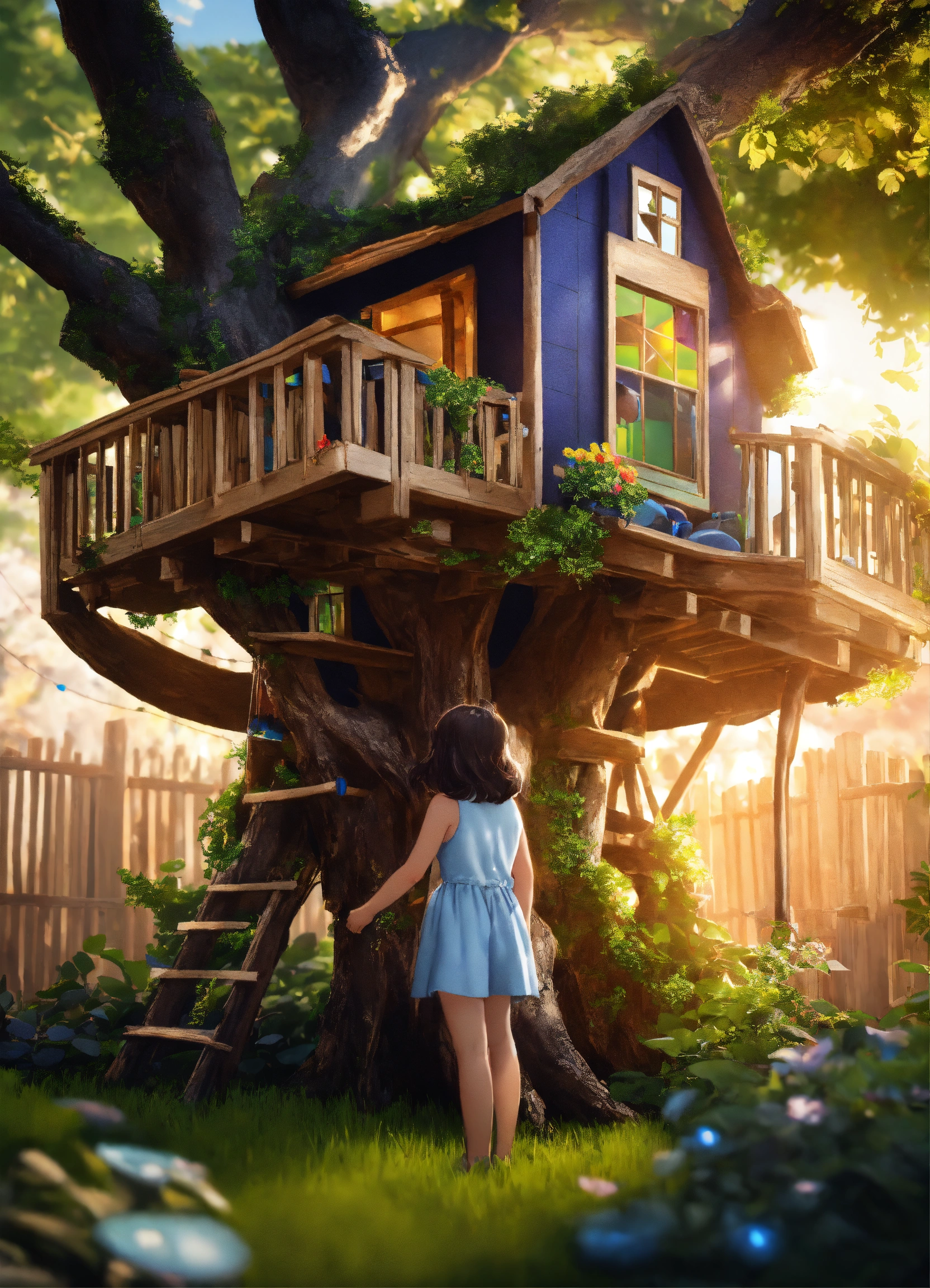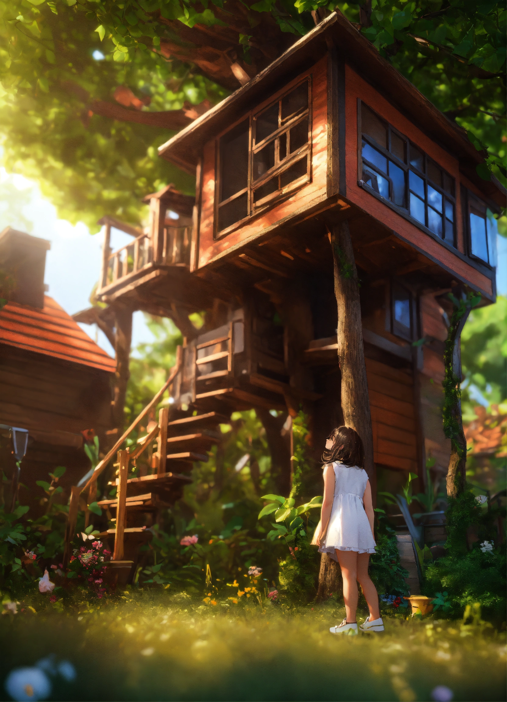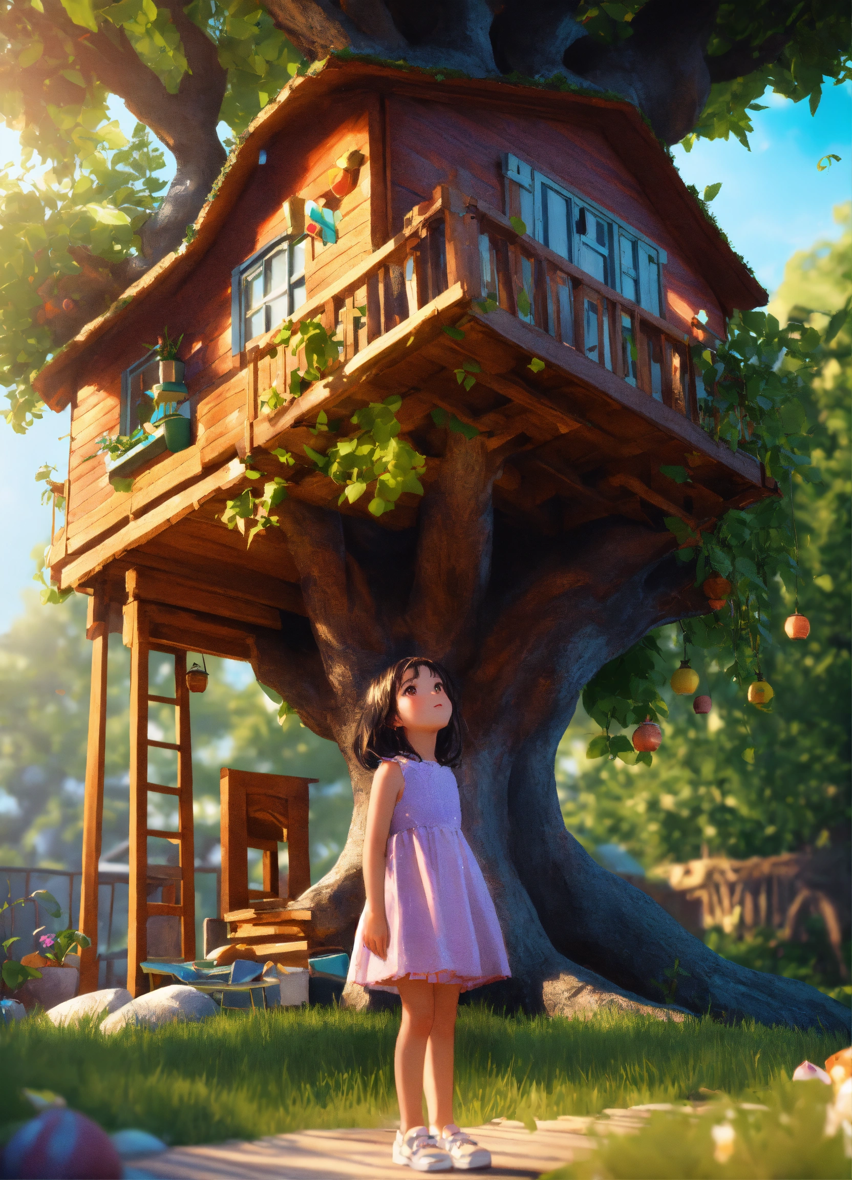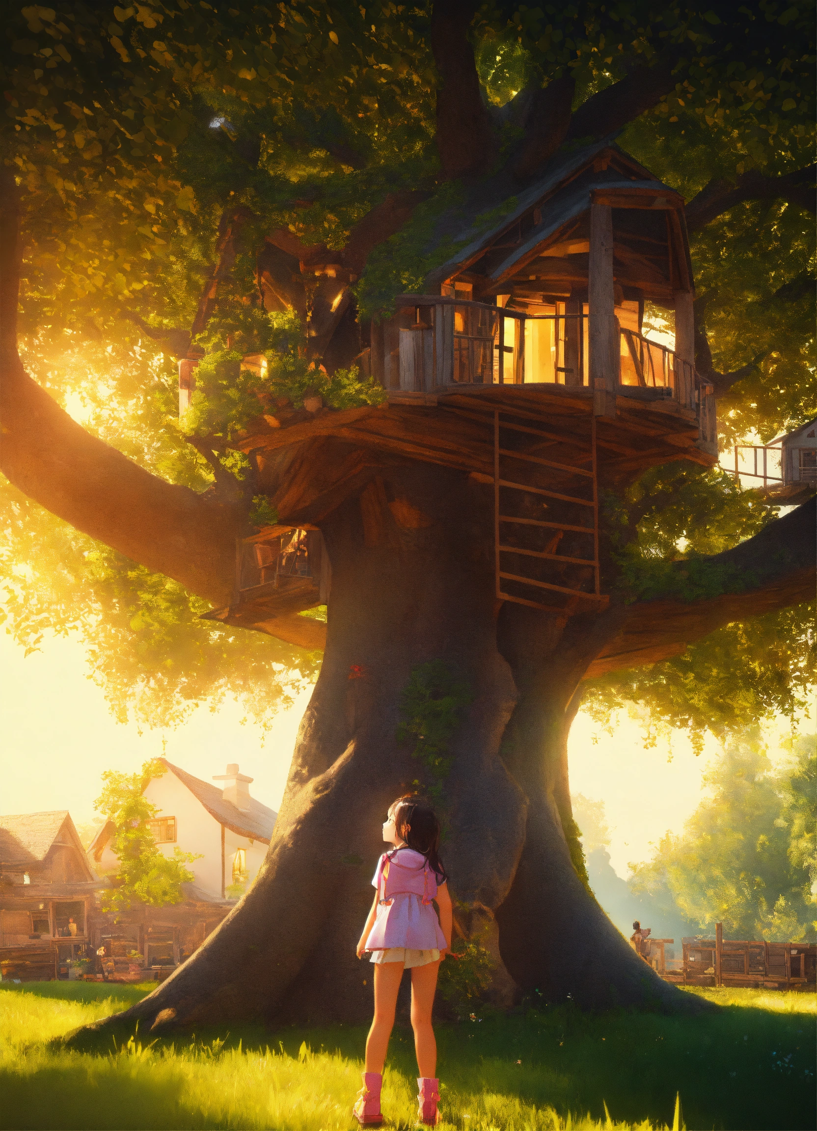 4d photographic image of full body image of a cute little dark haired girl in her backyard looking up at a treehouse that is semi hidden by the tree realistic, vivid colors octane render trending on artstation, artistic photography, photorealistic concept art, soft natural volumetric cinematic perfect light, uhd no background