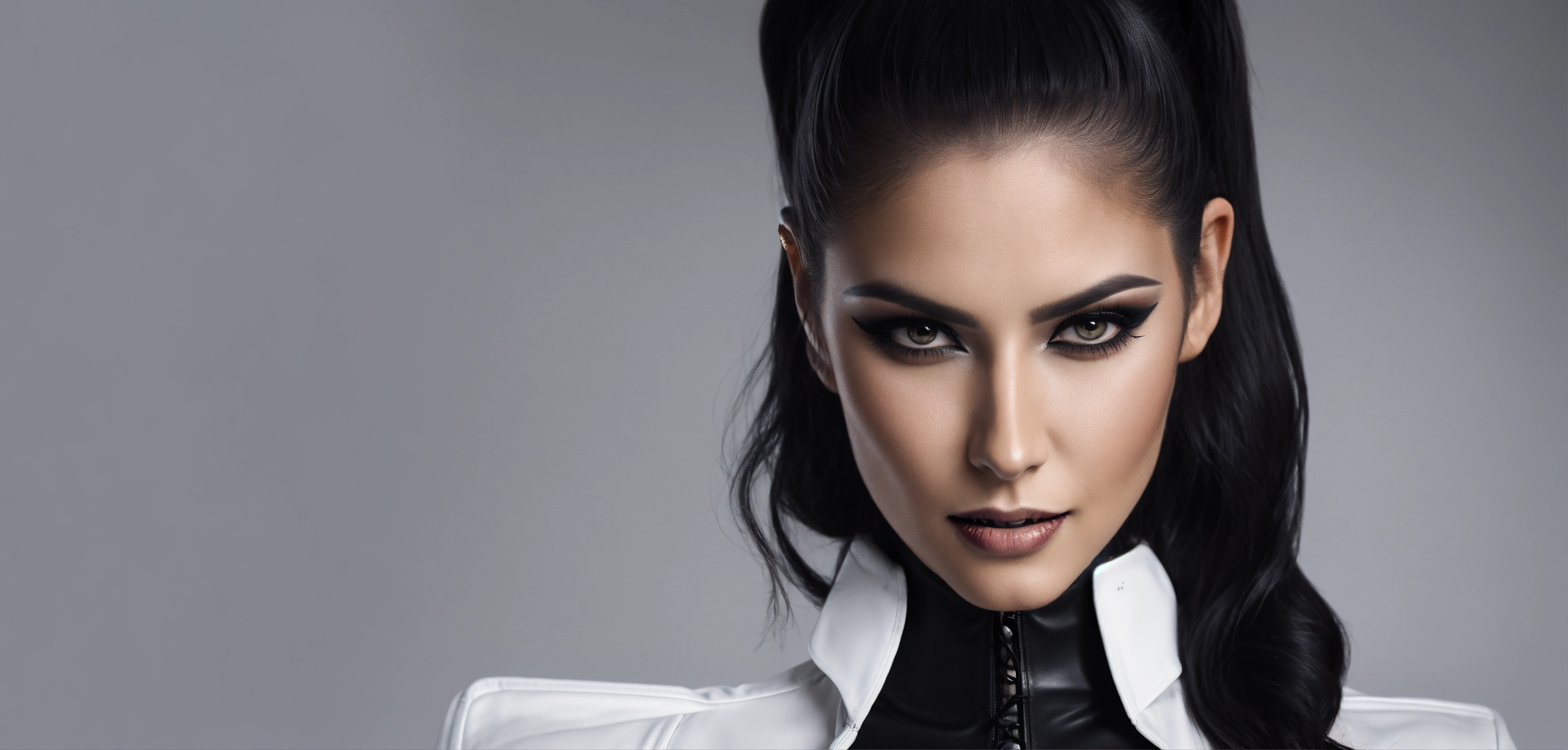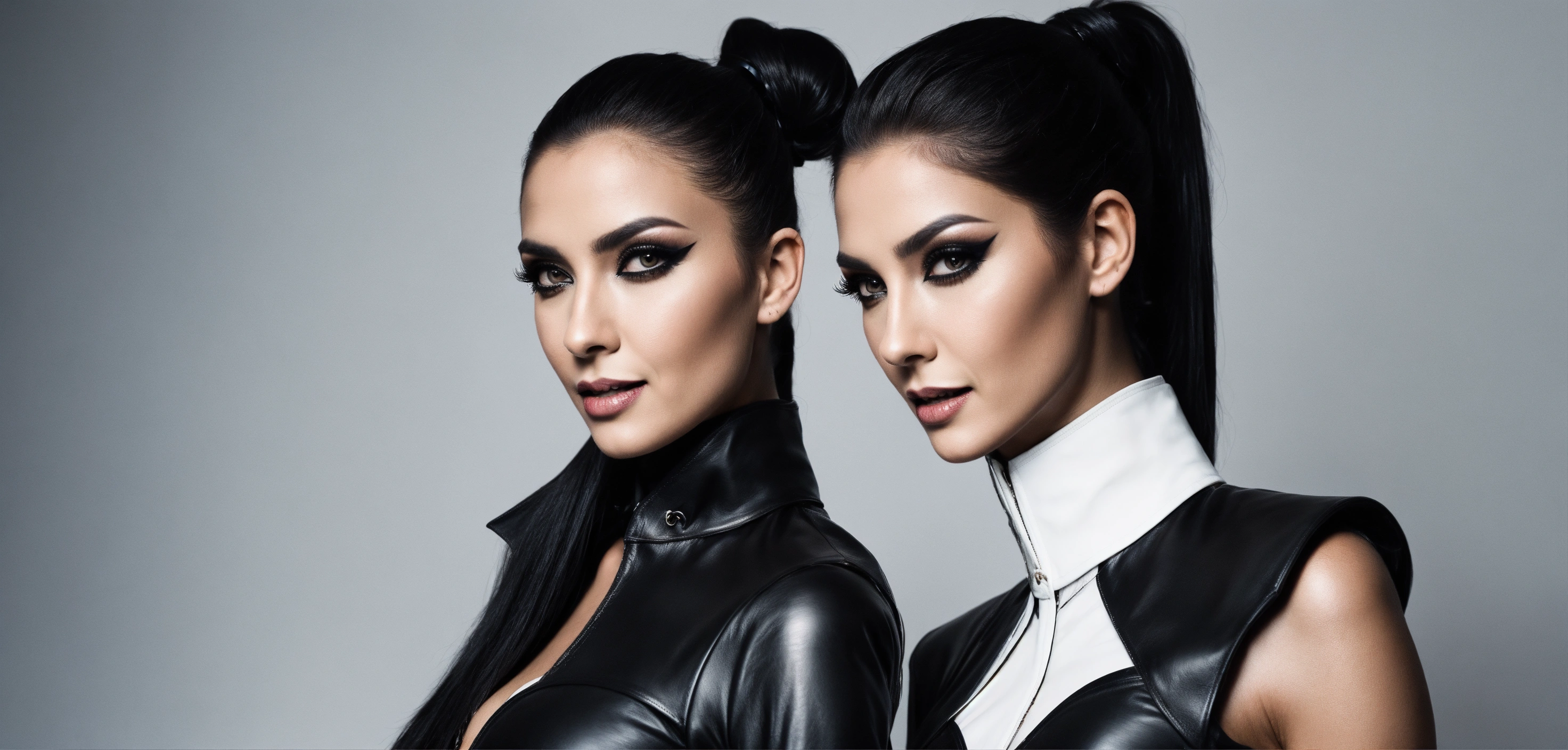 Cinematic look, two stunning arab seductress women equestrian fashion model, arrogant evil smile from above, black straight hair very high ponytail, white office shirt, black leather corset, eyeliner makeup, underworld vampire movie style, ultra-realistic; solid white background; no background