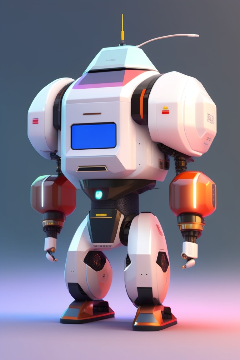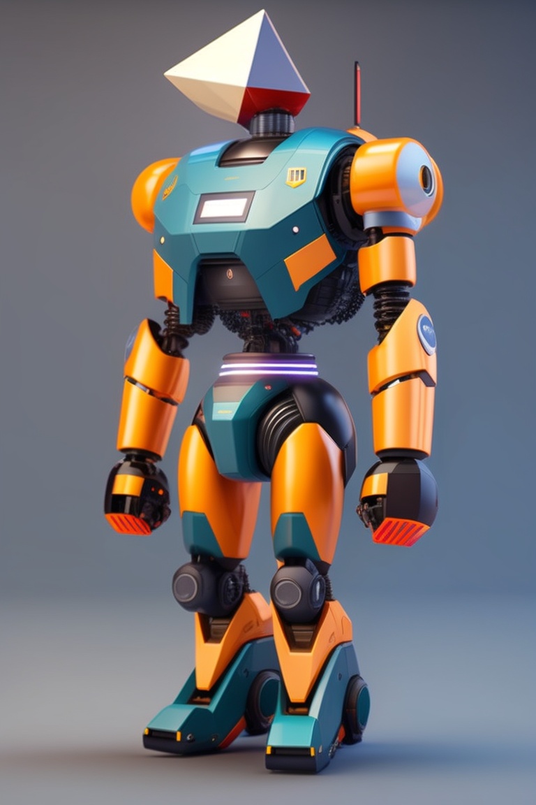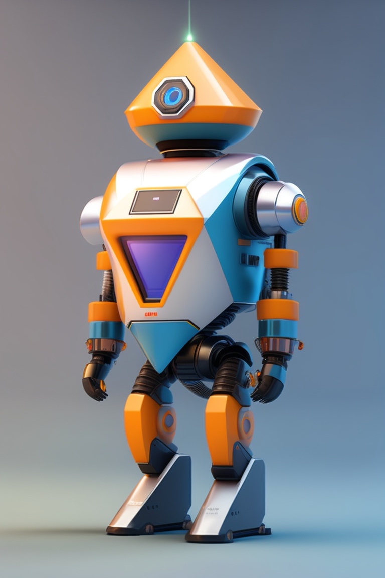 A robot with a triangular face with white eyes, eyebrows, and a mouth, whose lower body is a vacuum cleaner, whose belly is a microwave, and whose face is a big drill, and one of his hands is fat and the other is female