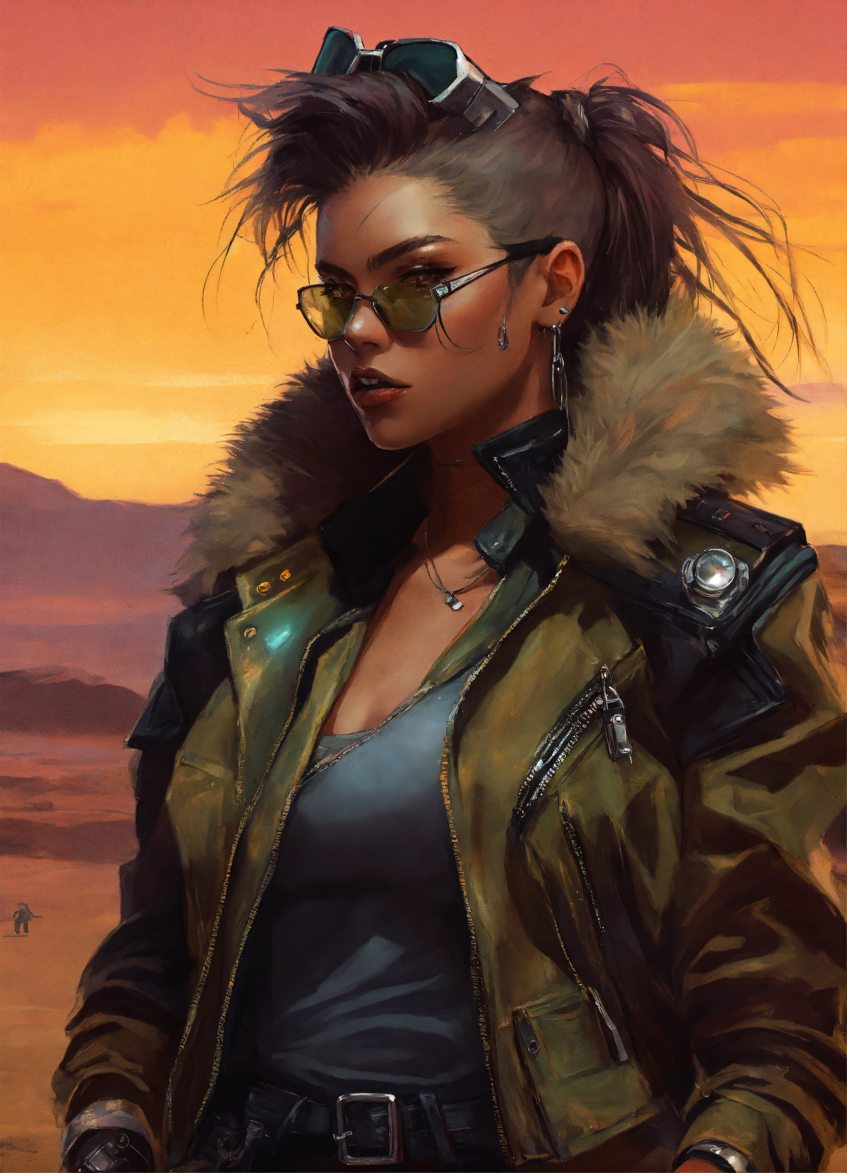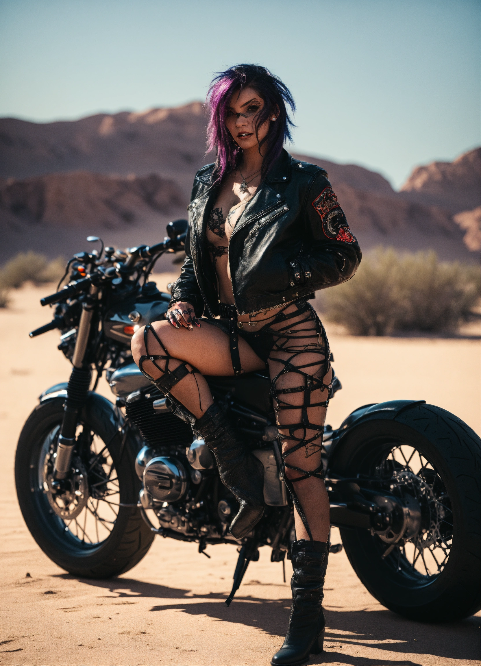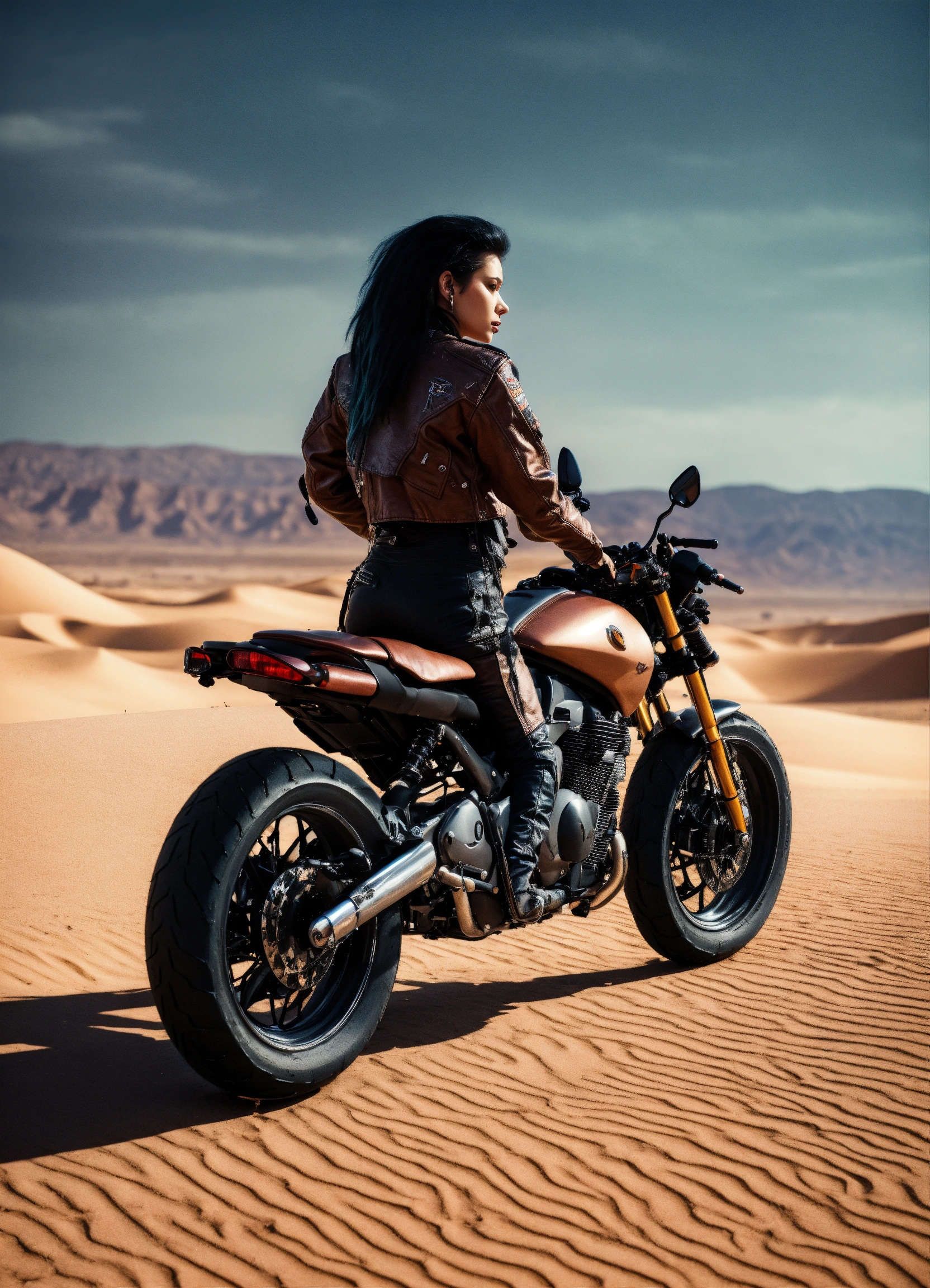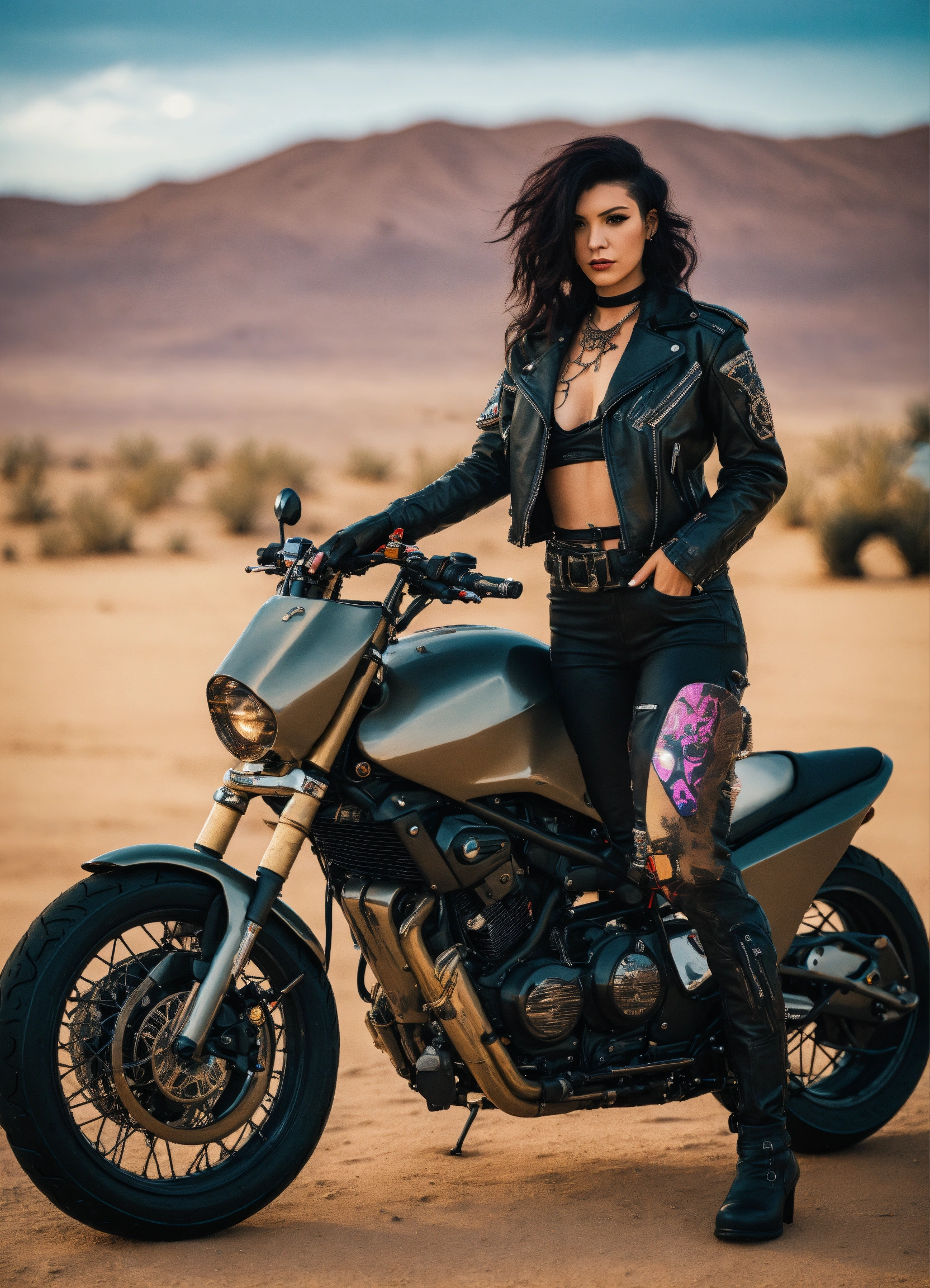 Female cyberpunk werewolf motorcycle gang member in a jacket in a desert