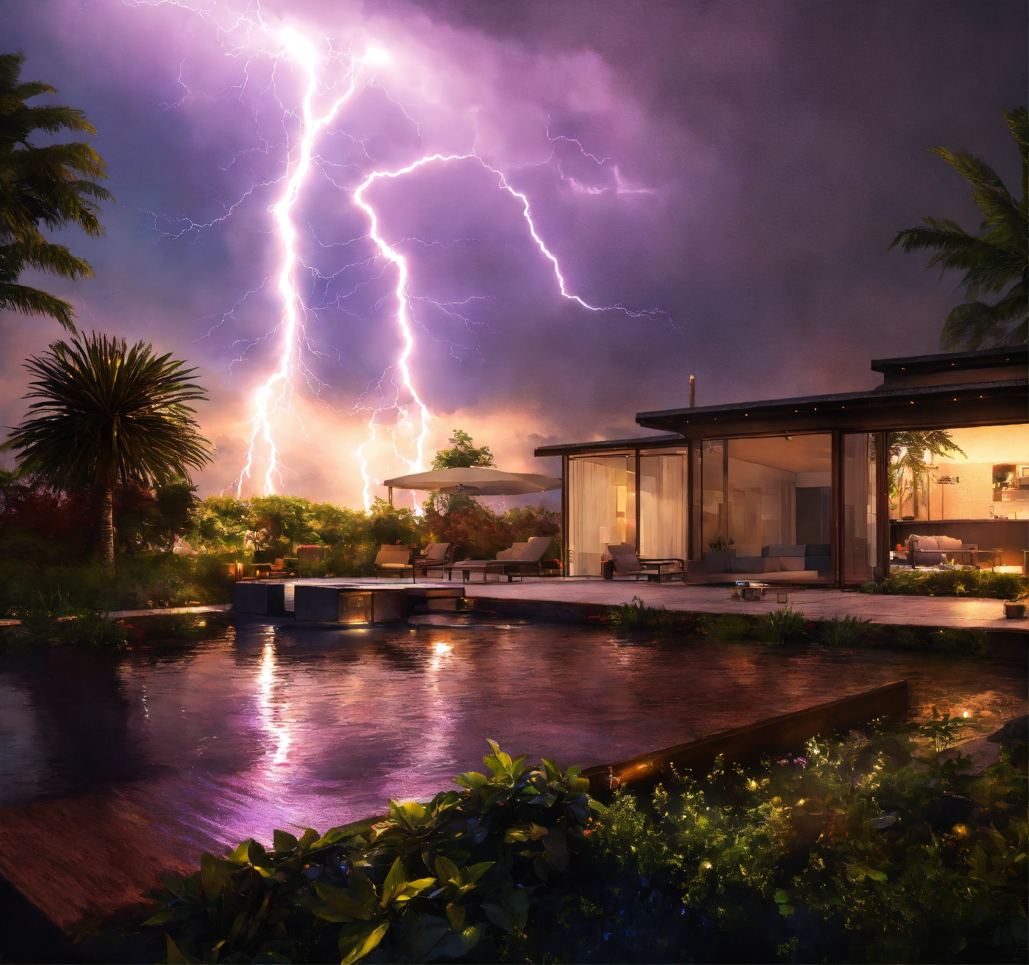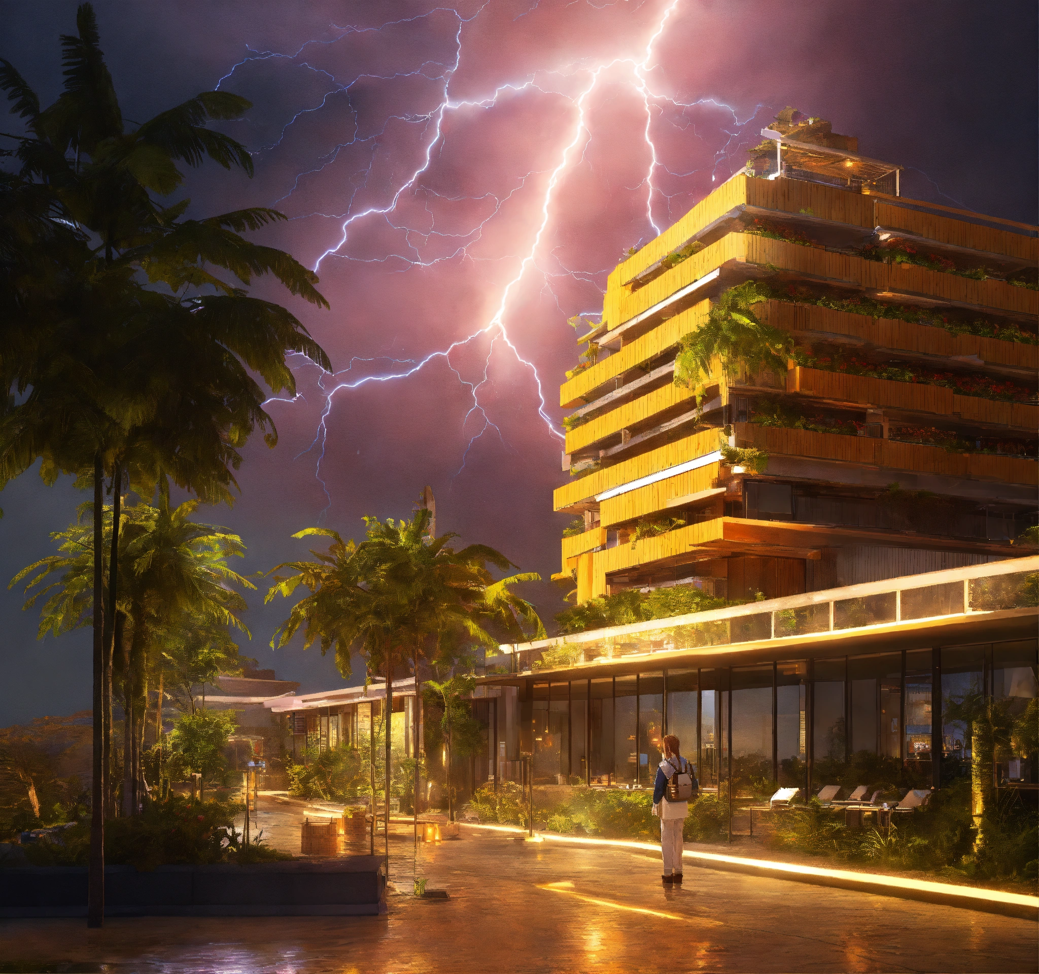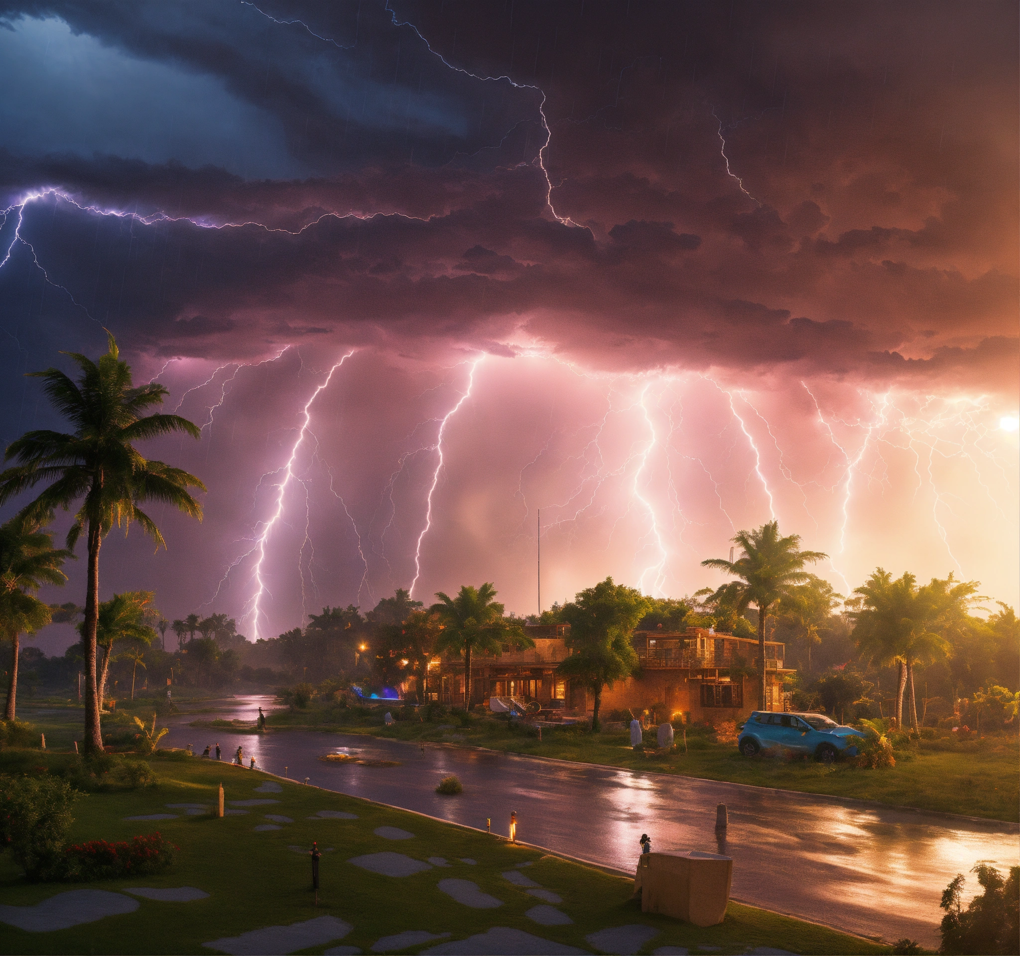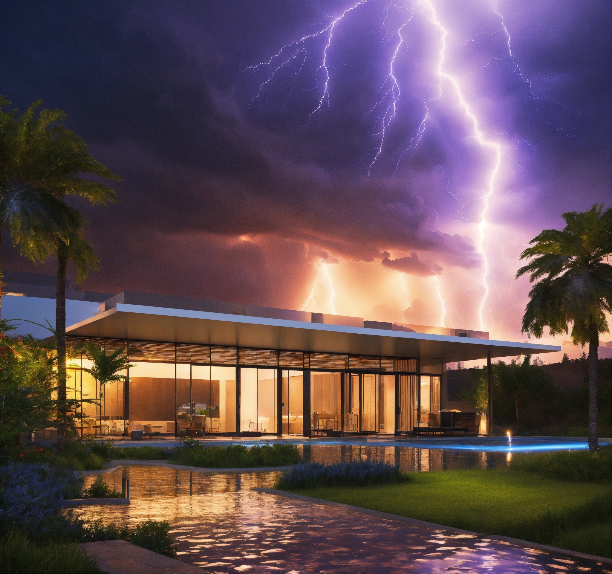 Please generate a lively picture of a high-tech oasis with a lightning storm and sun