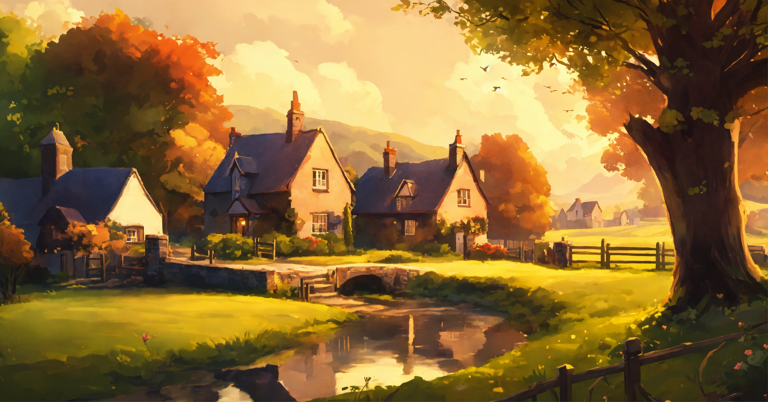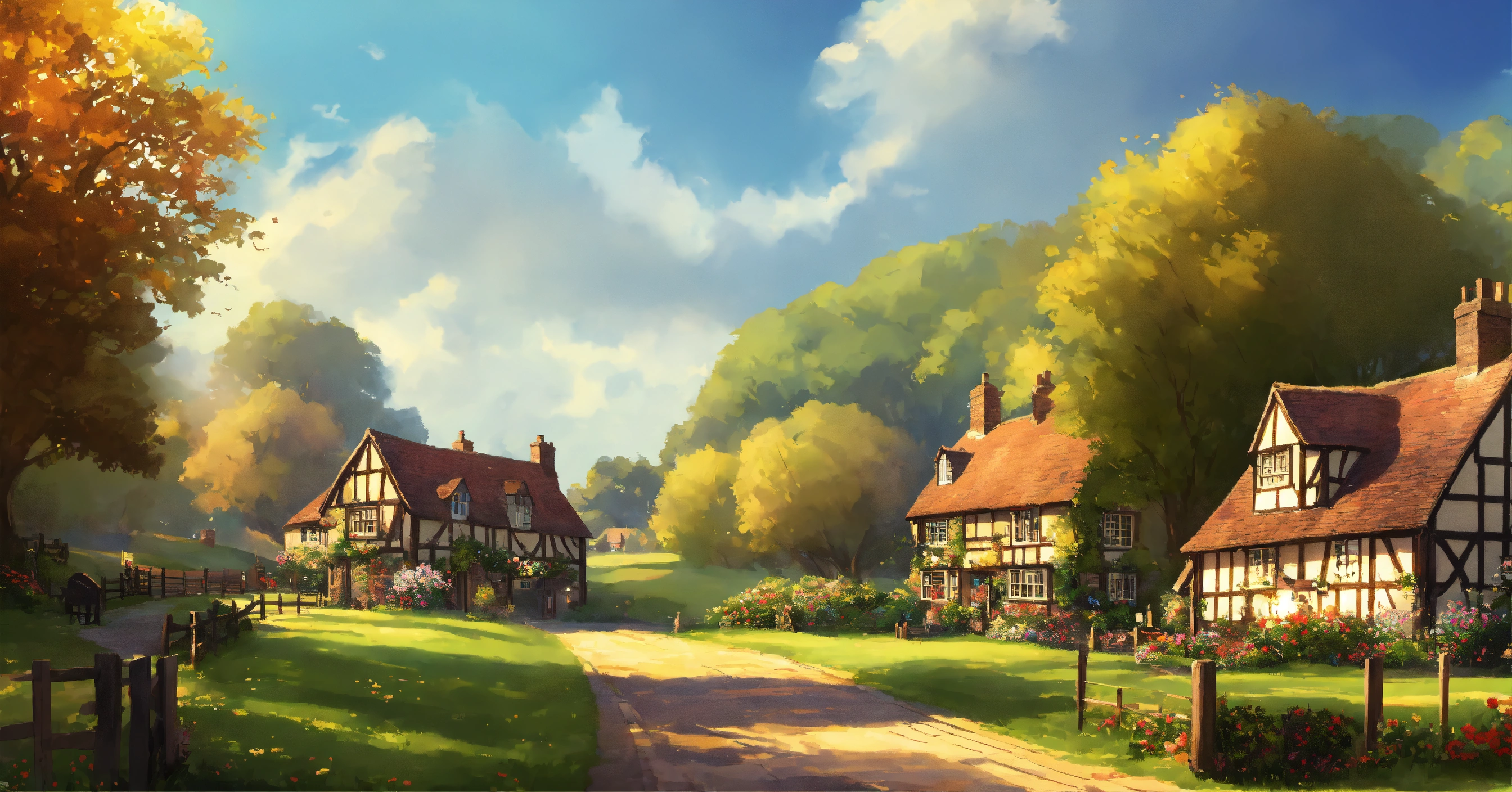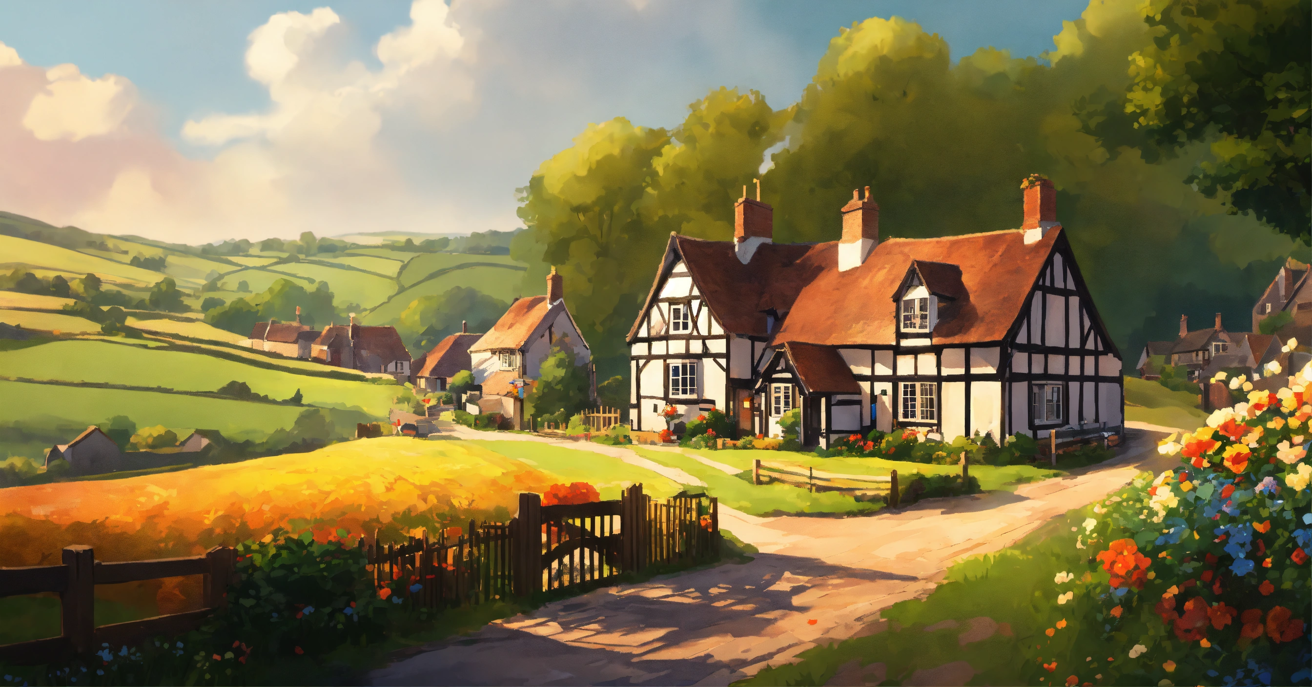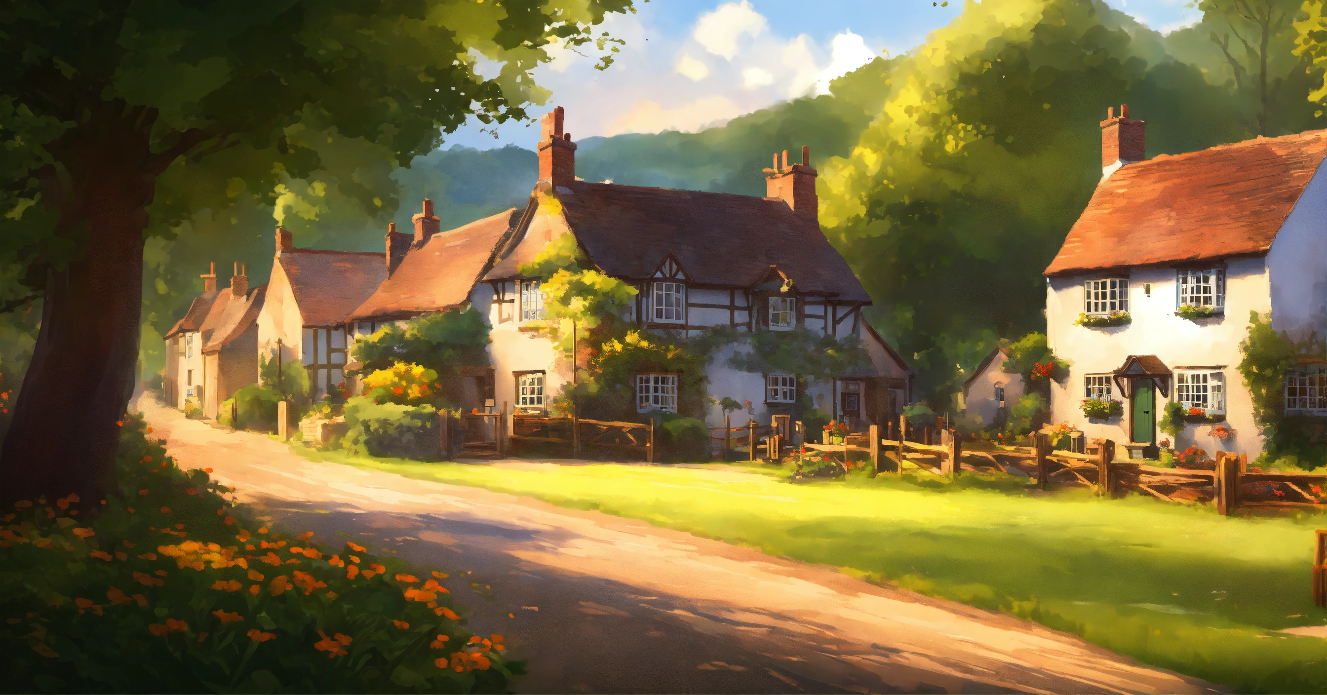 Landscape desktop wallpaper of a beautiful english country village in the style of illustrator donald zolan, 8k