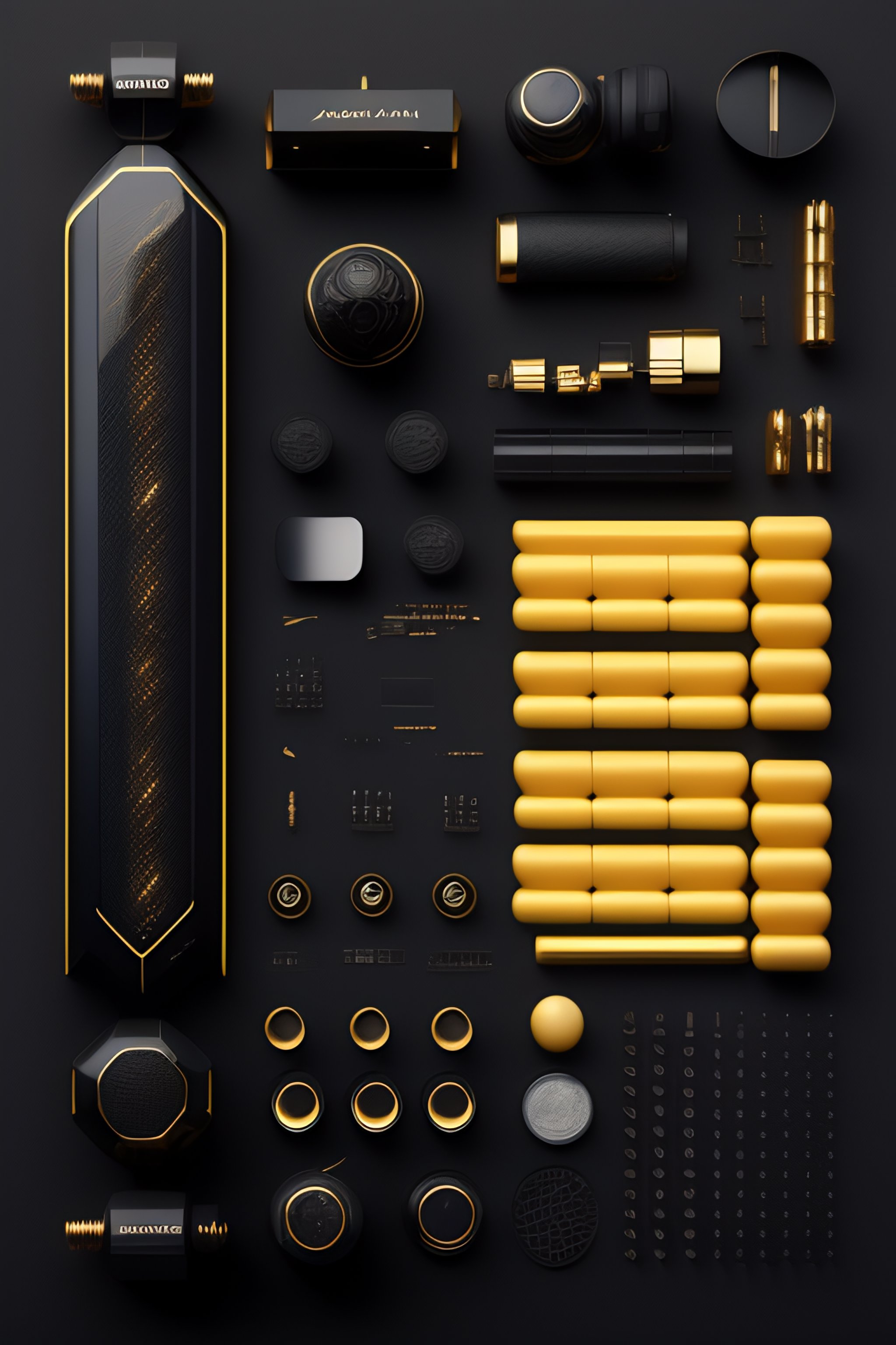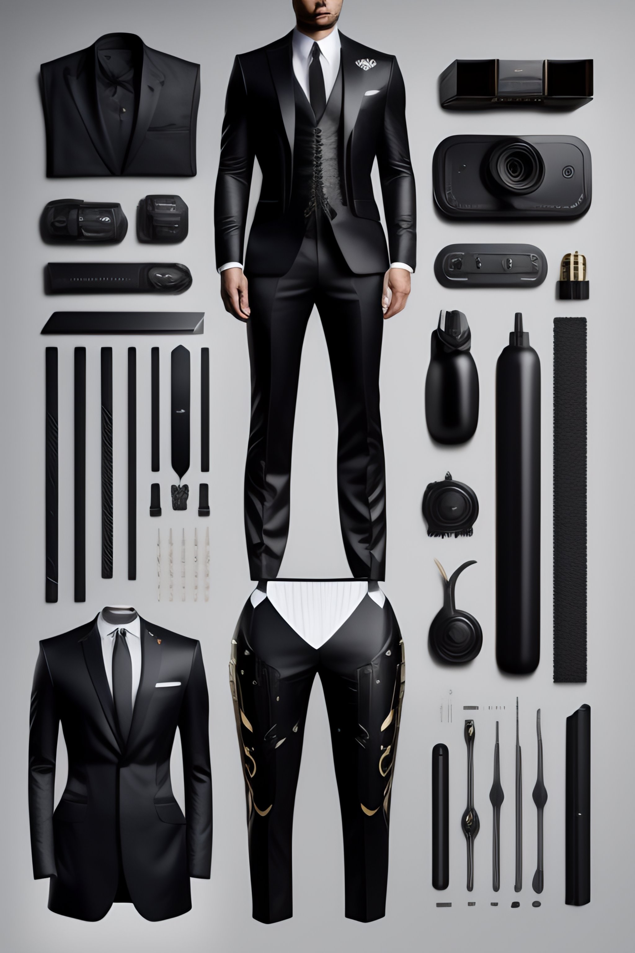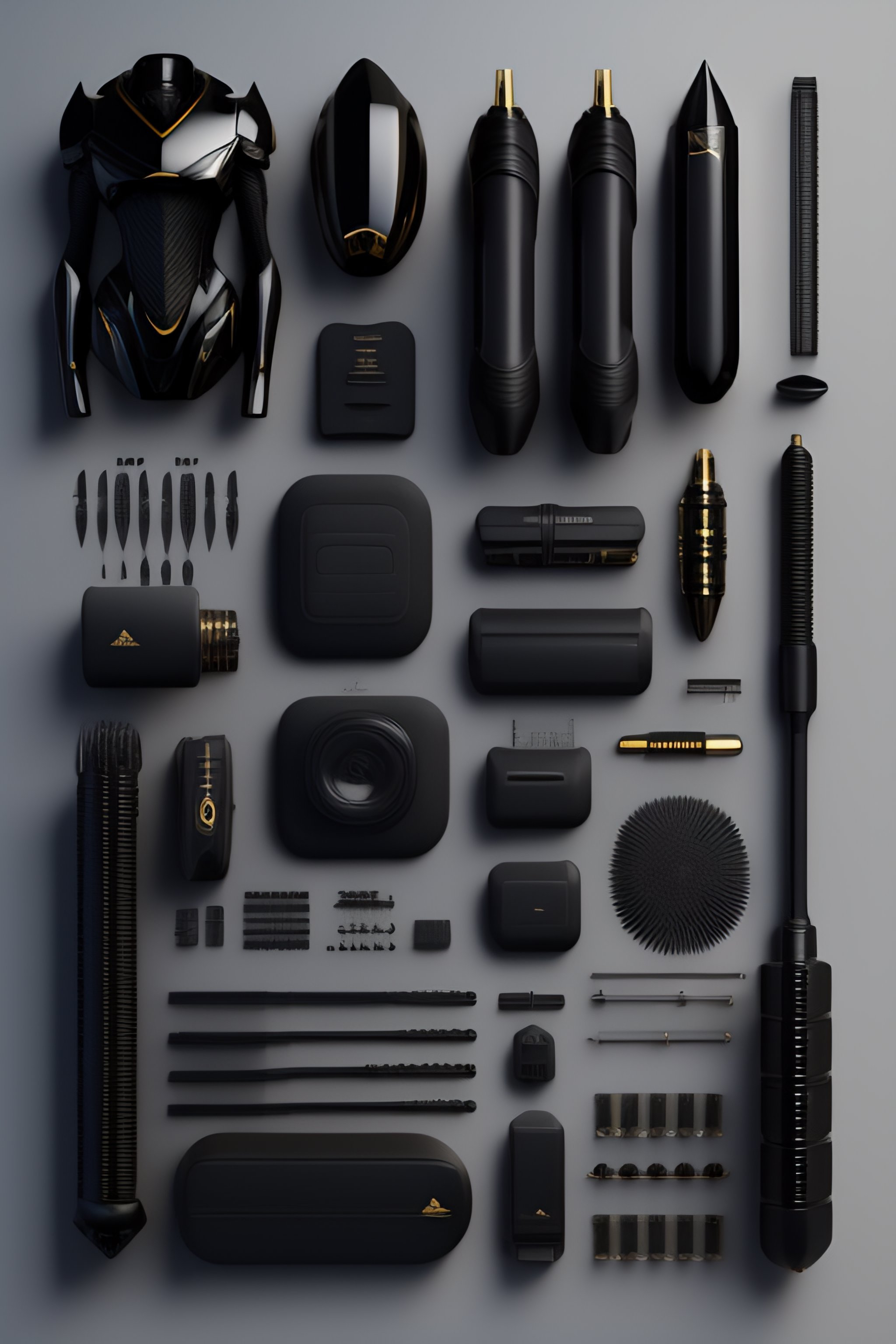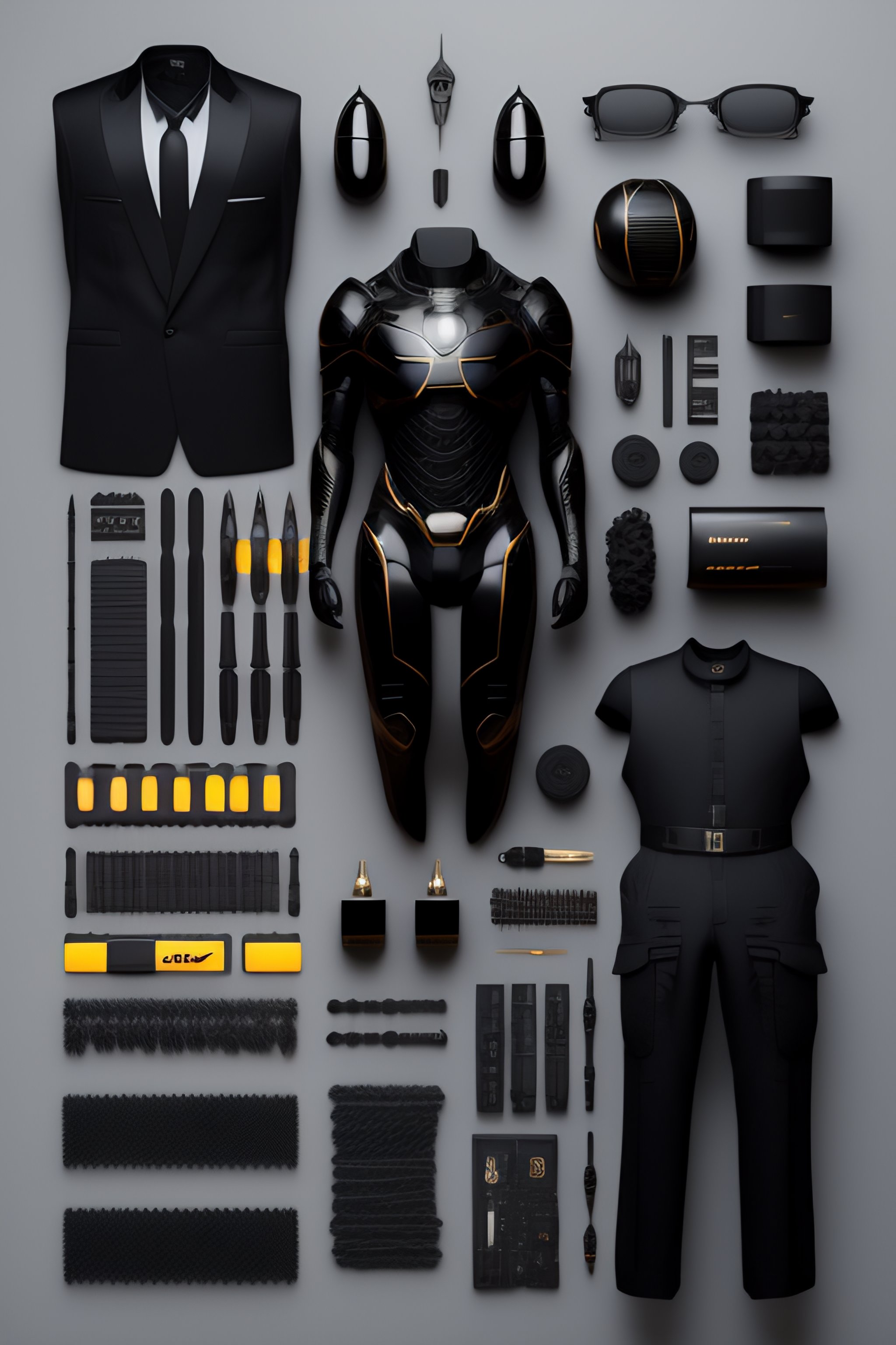 Adam dc black color suit, costumes and mechanical parts, knolling, knolling layout, deconstruction, highly detailed, depth, many parts, lumen rendering, 8k