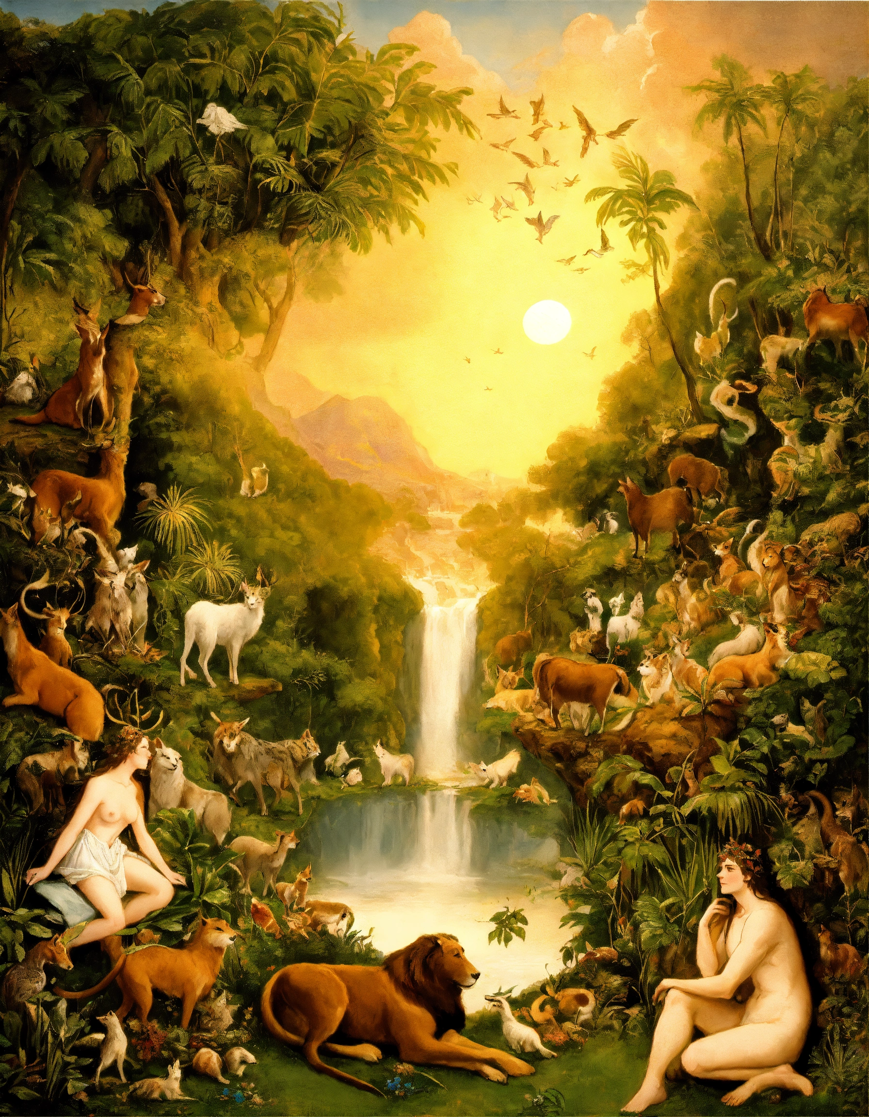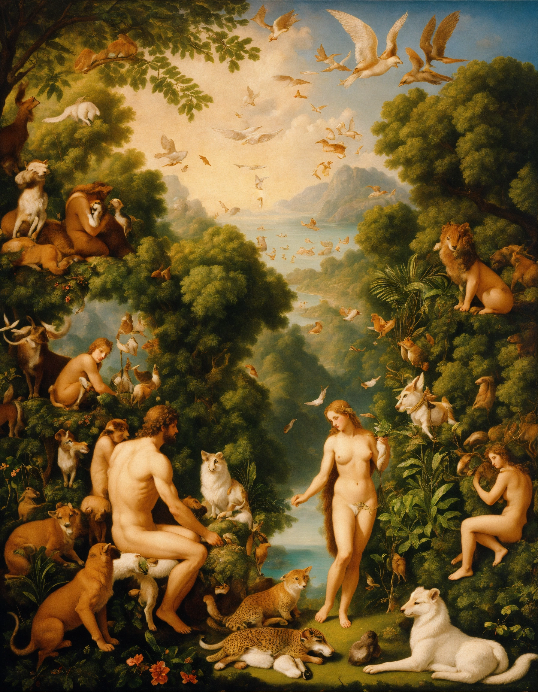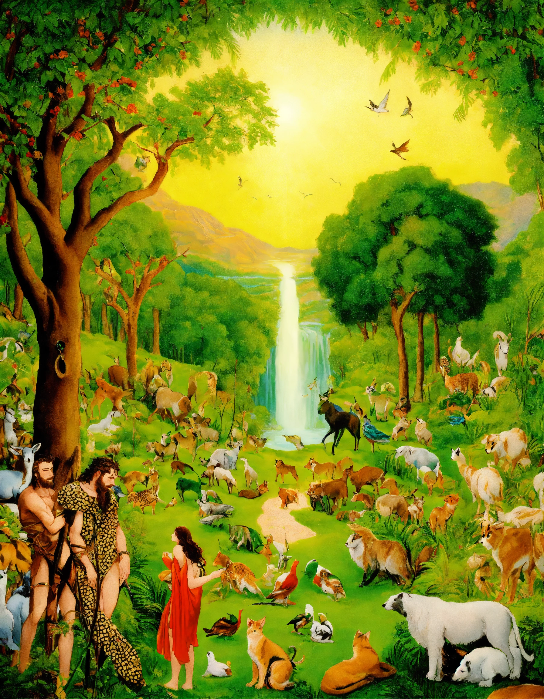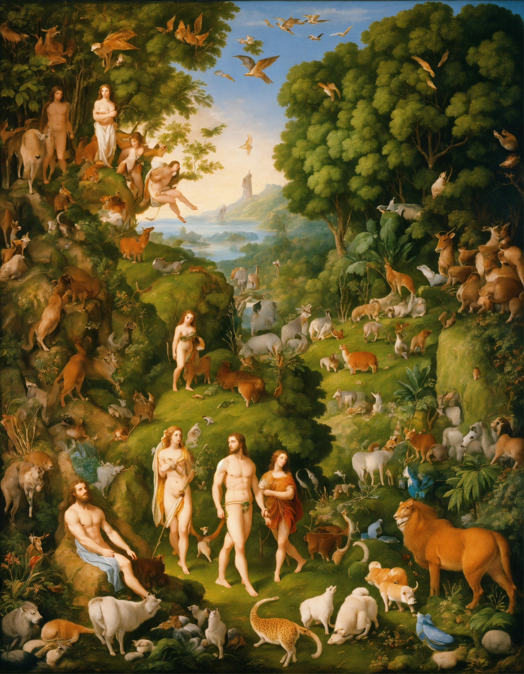 Adam and eve in paradise with animals and all nature present in creation according to the bible
