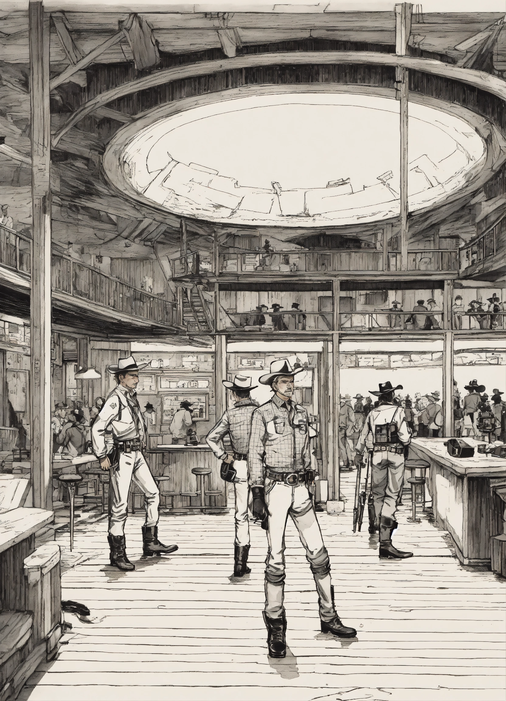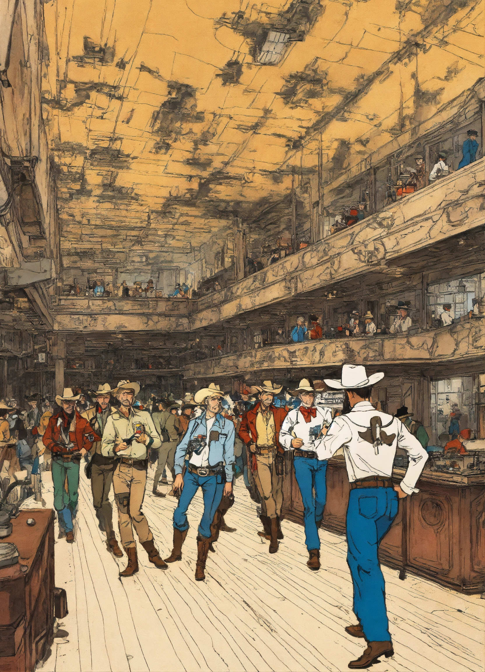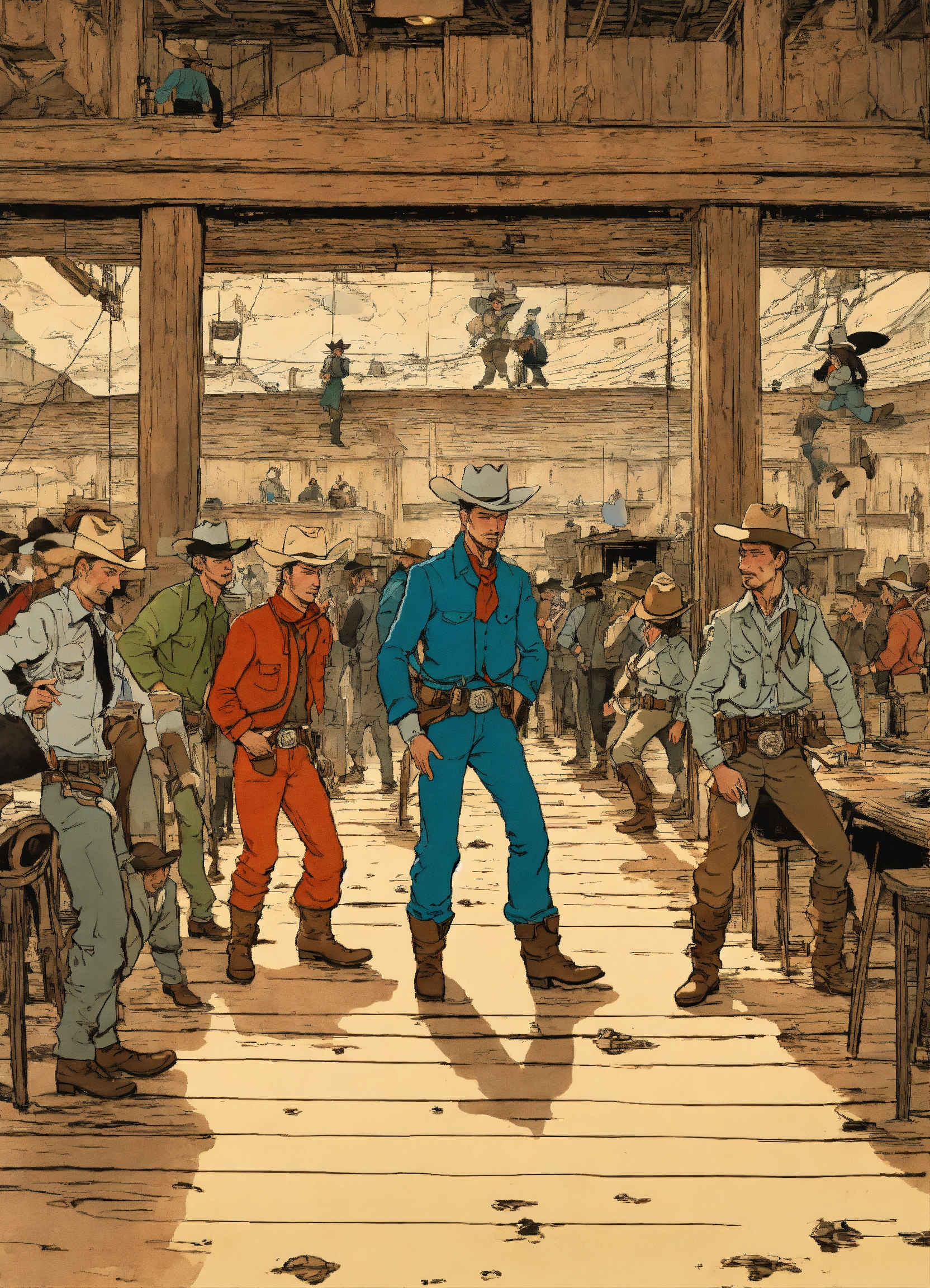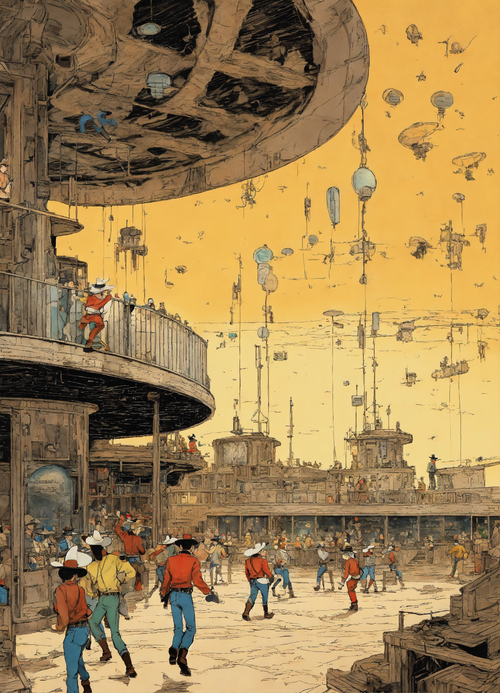 Pen and ink, illustrated by hergé, cowboys line dancing in a futuristic post-apocalyptic saloon, masterpiece