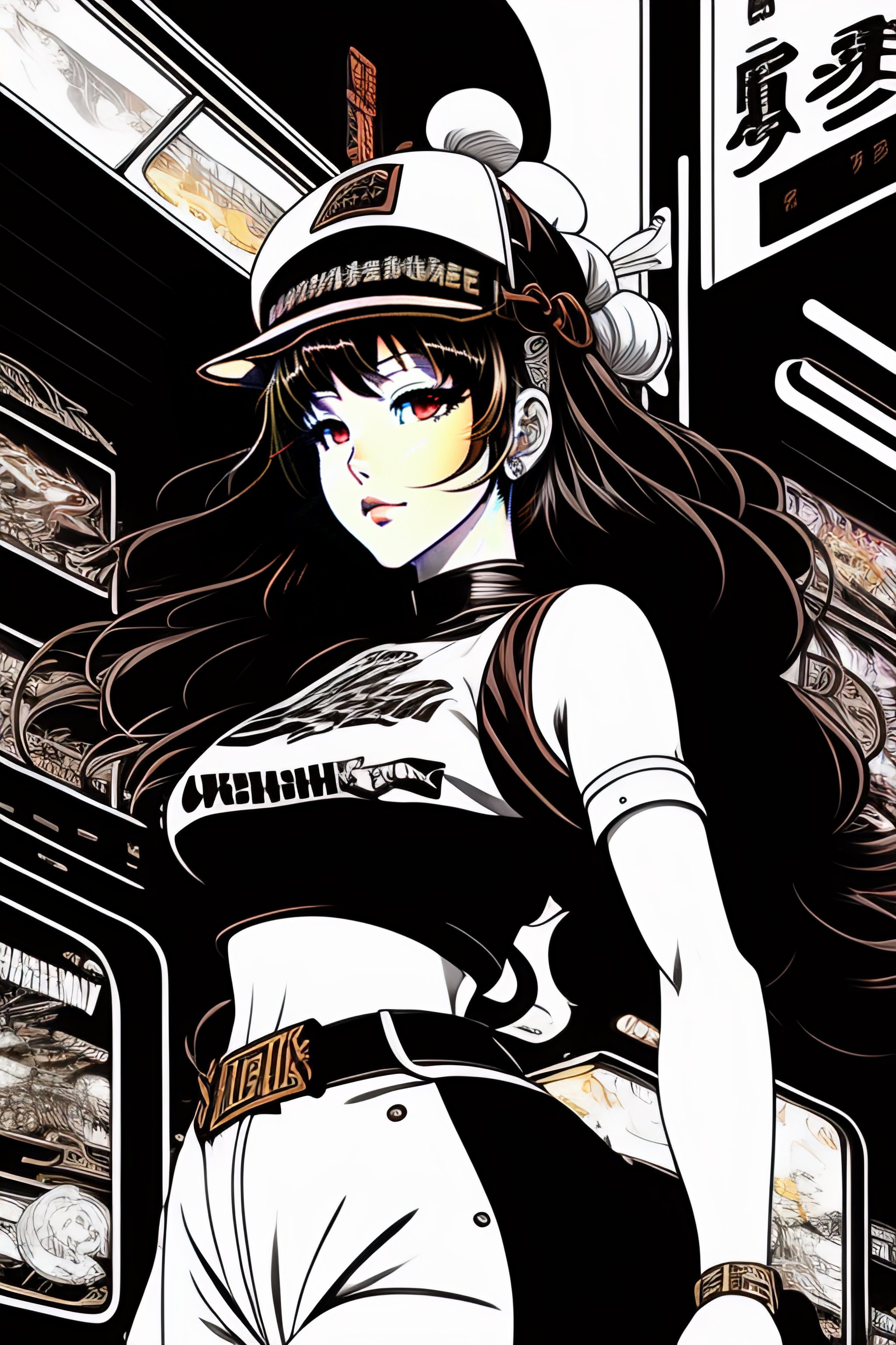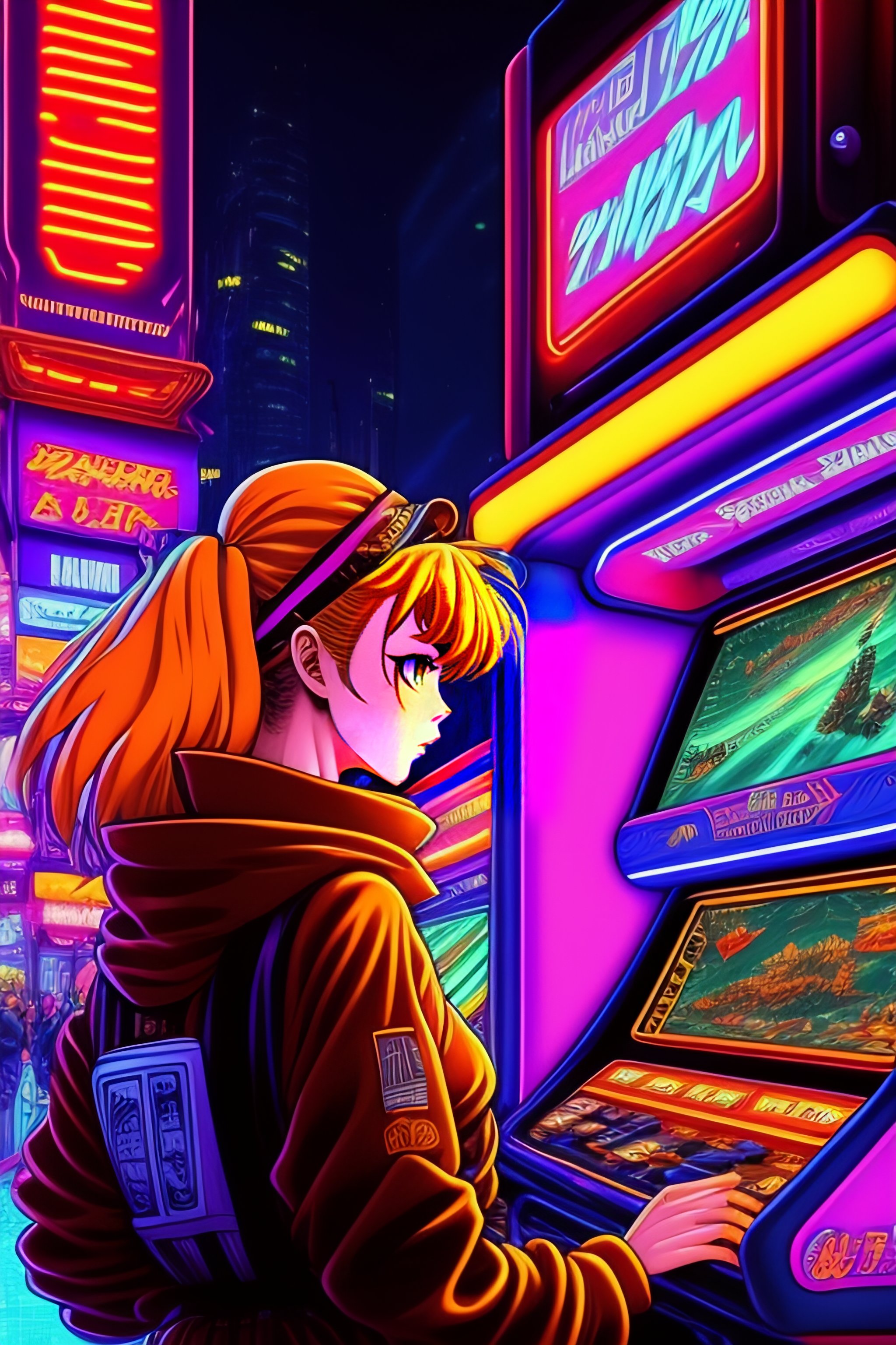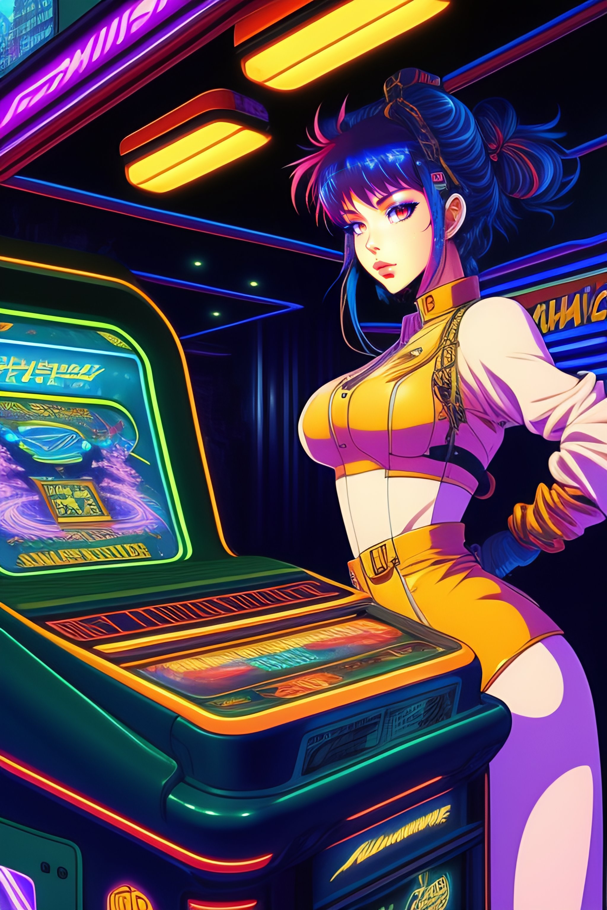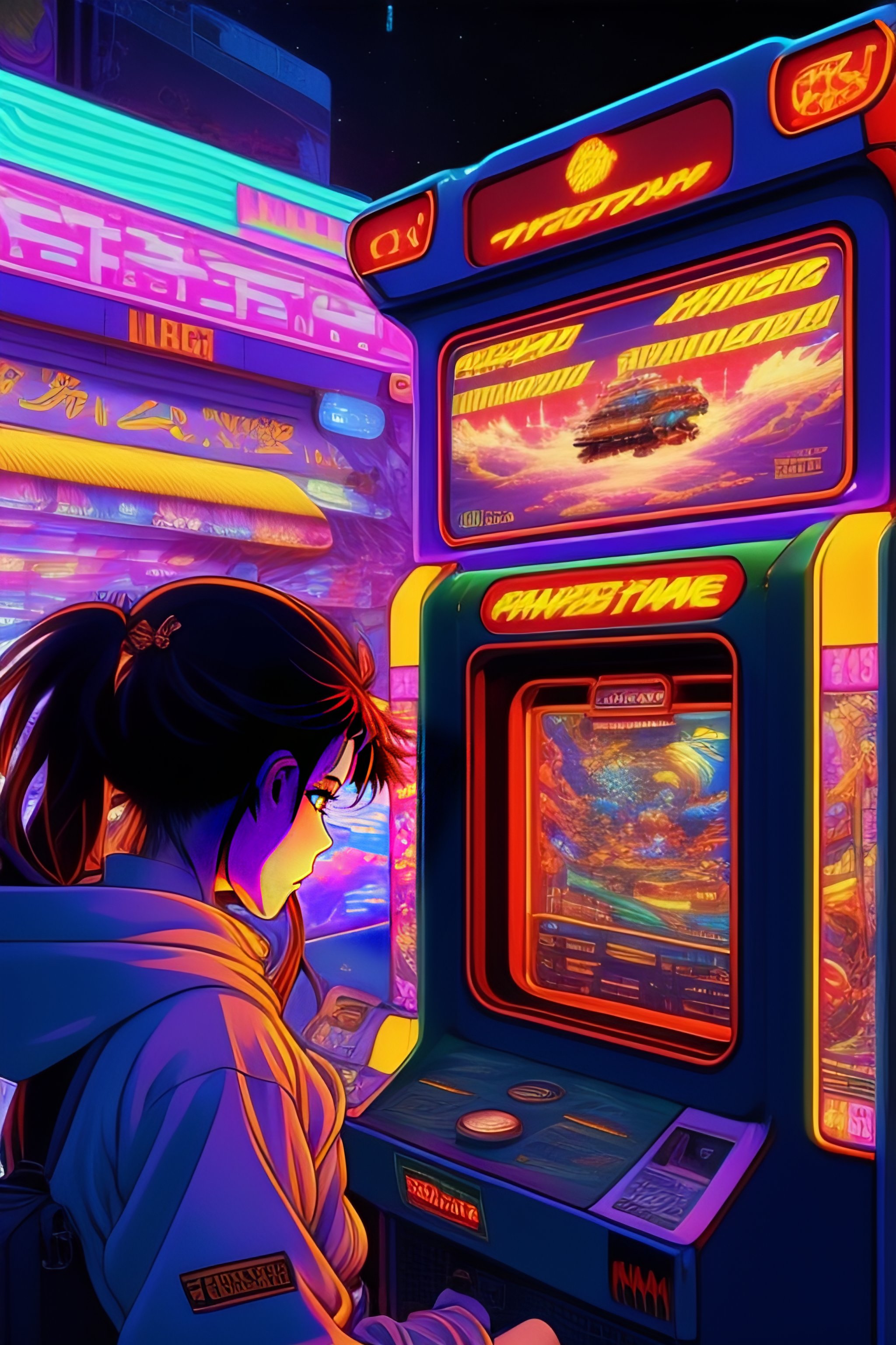 Vintage 90's anime style environmental wide shot of a chaotic arcade at night; a woman wearing streetwear playing an arcade game; by hajime sorayama, greg tocchini, virgil finlay, sci-fi. line art. environmental arcade art.