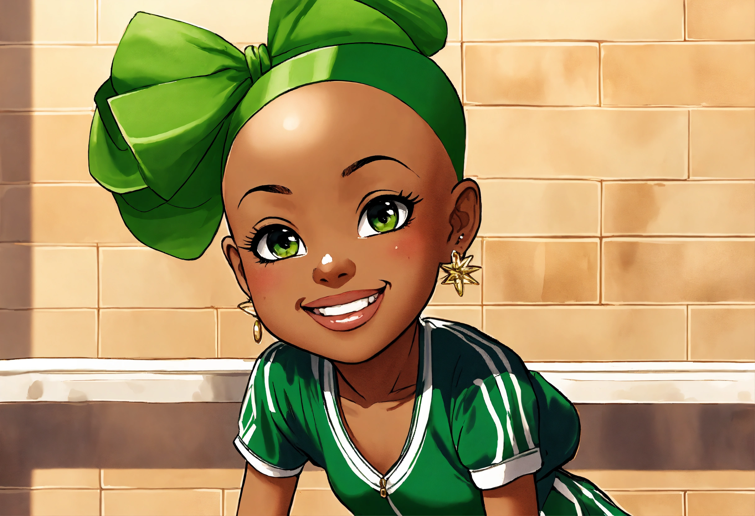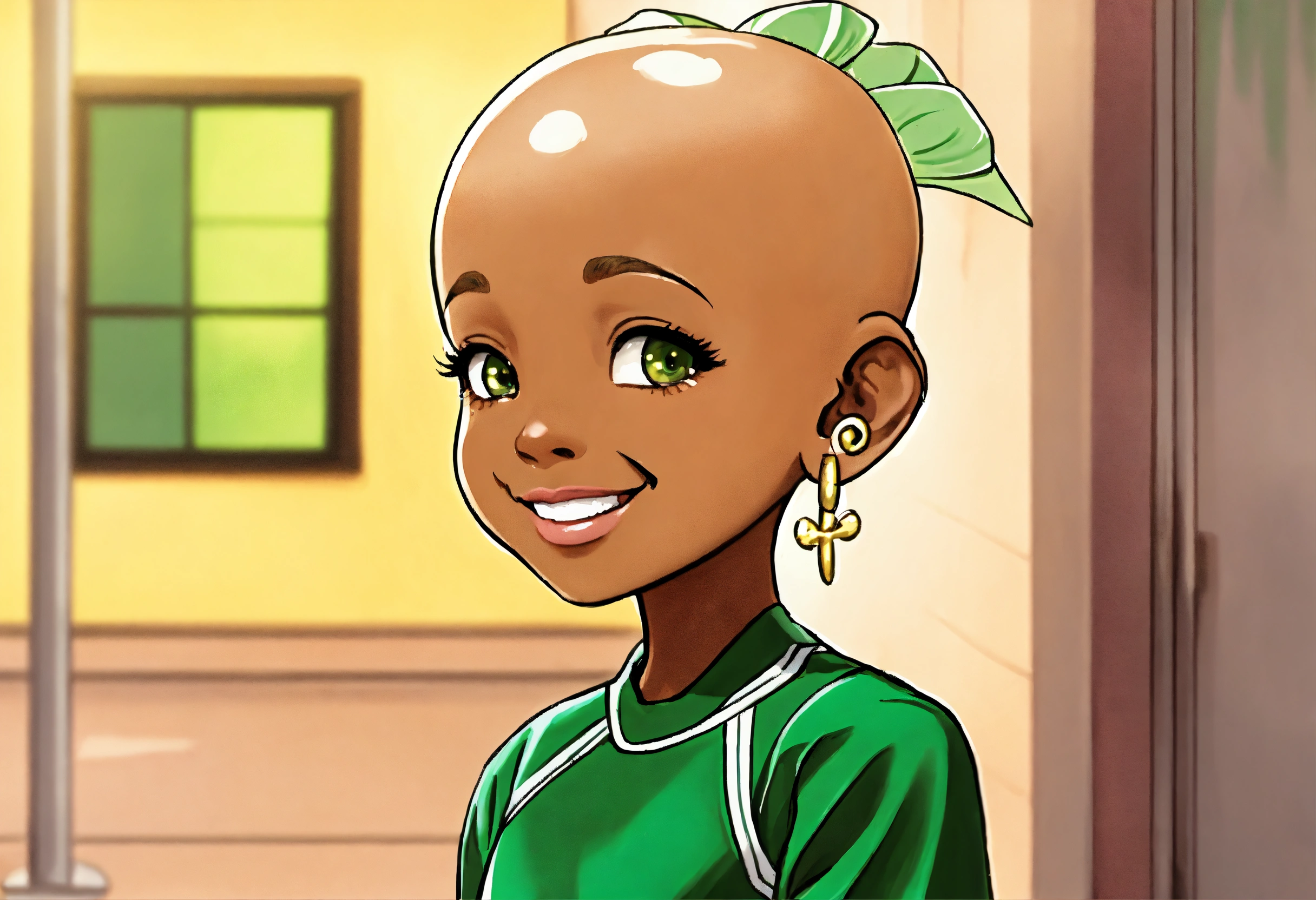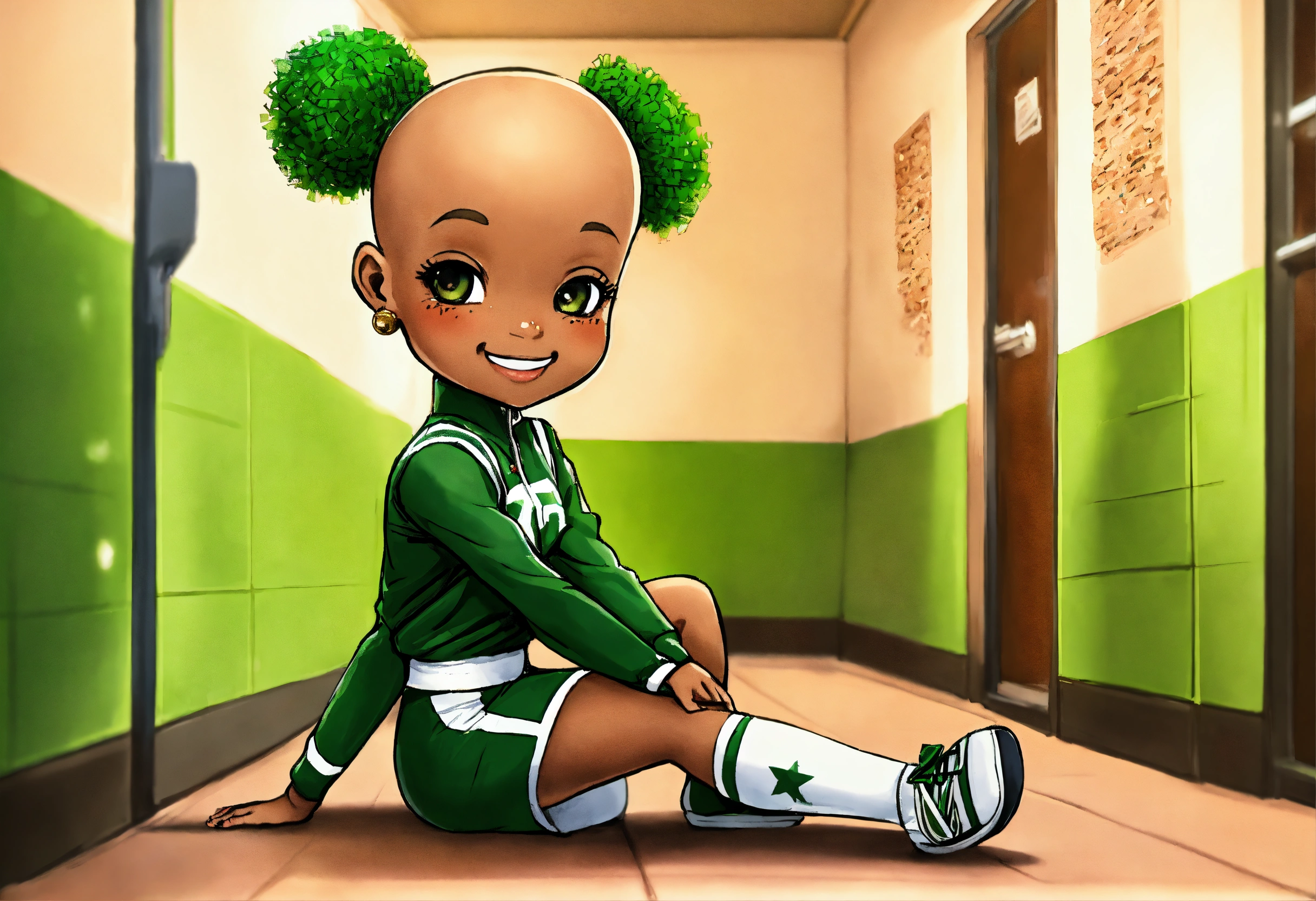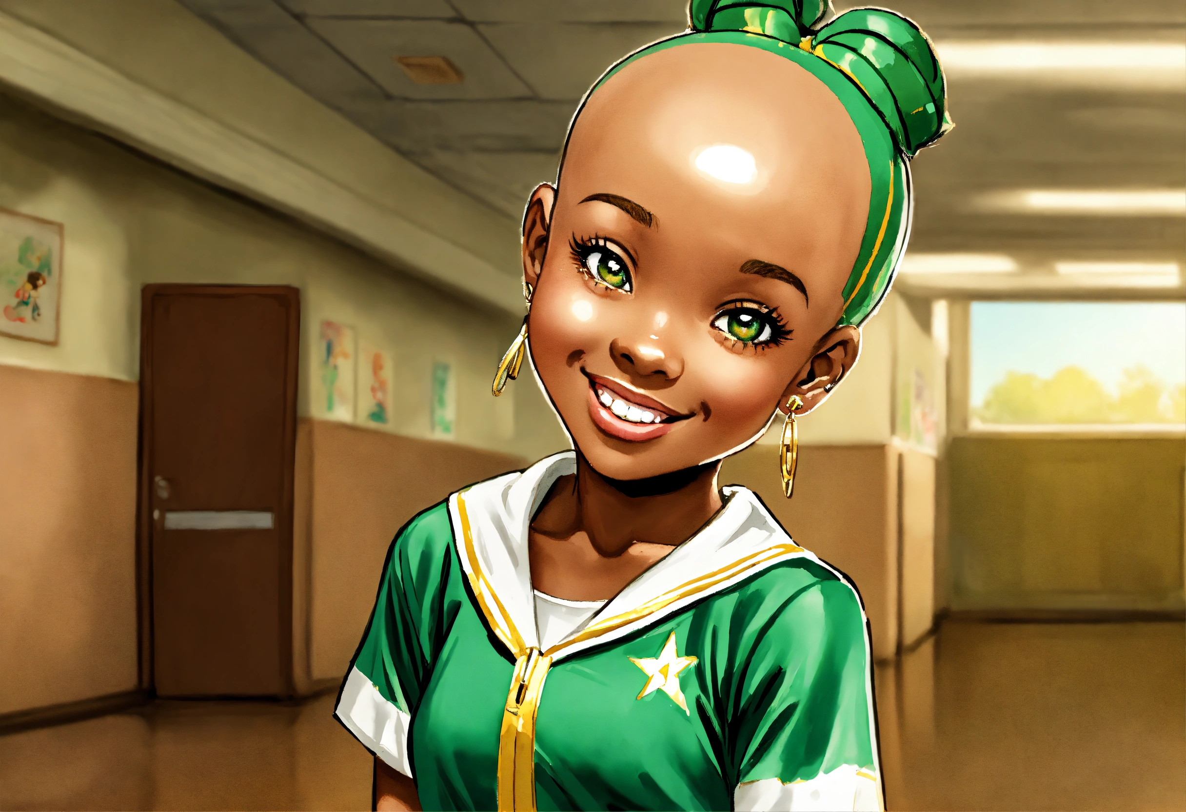 Hd manga kewpie anime dark brown complexion african american 12 year old smiling bald girl with full alopecia, small gold stud earrings, wearing green and white cheerleading outfit standing and leaning her leg against a plaster wall in a school hallway, alopecia awareness, bald head and no eyebrows, airbrushed watercolor art style
